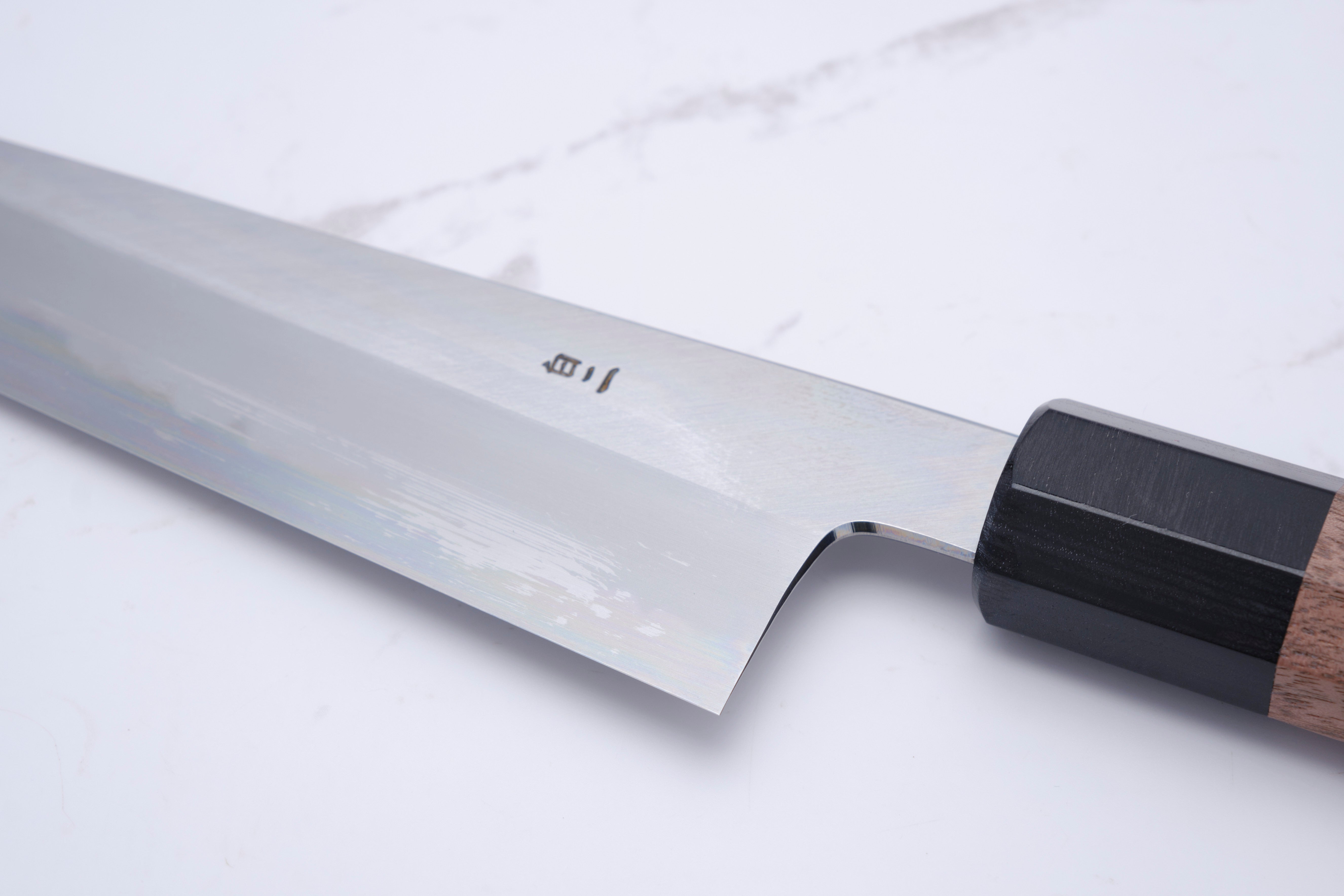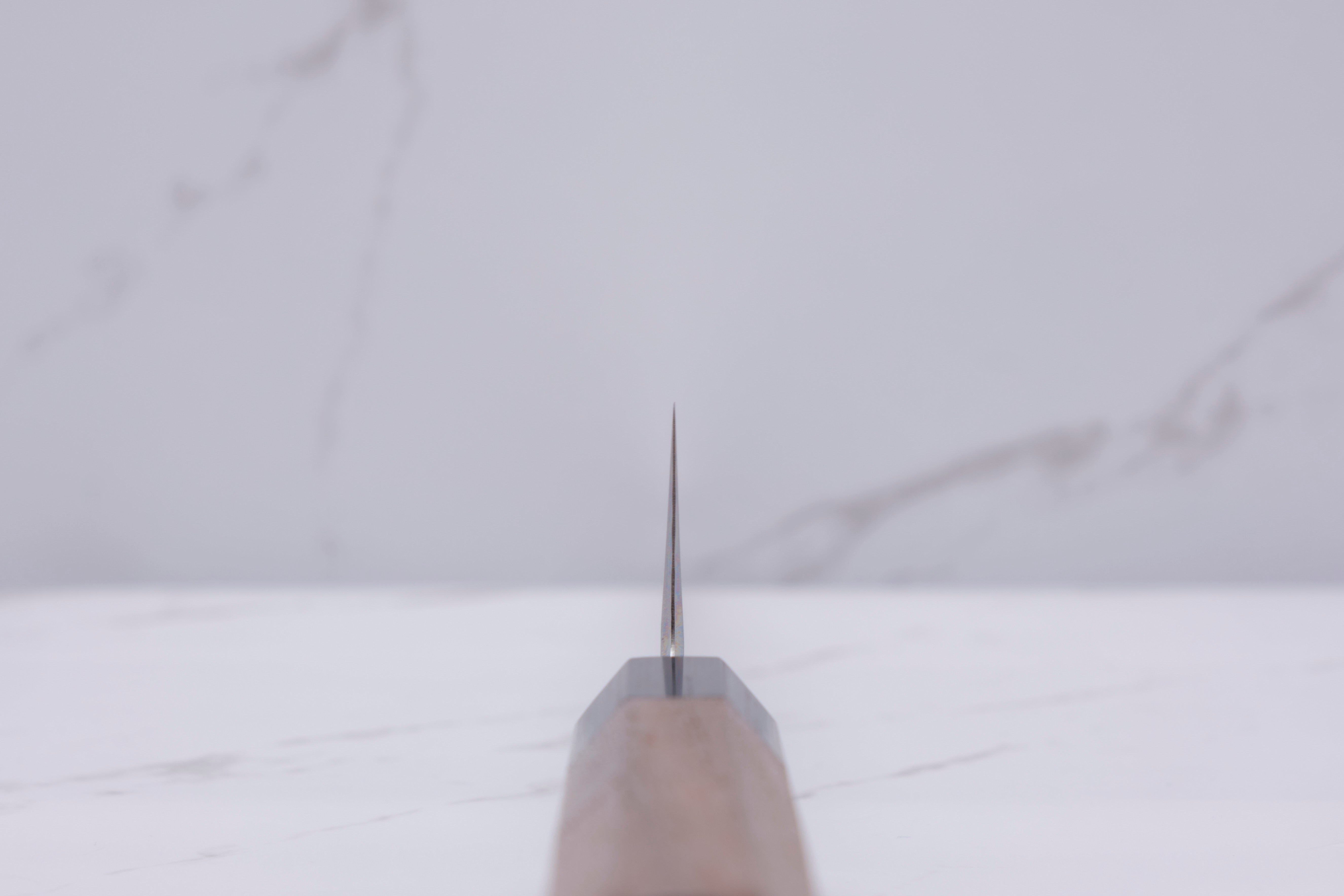 Tadataka-san's work here is truly world class. A true Sakai laser profile, with a thin blade and fantastic sharpening. A wide-bevel grind that exposes a lot of core steel, and a formidable kasumi finish.