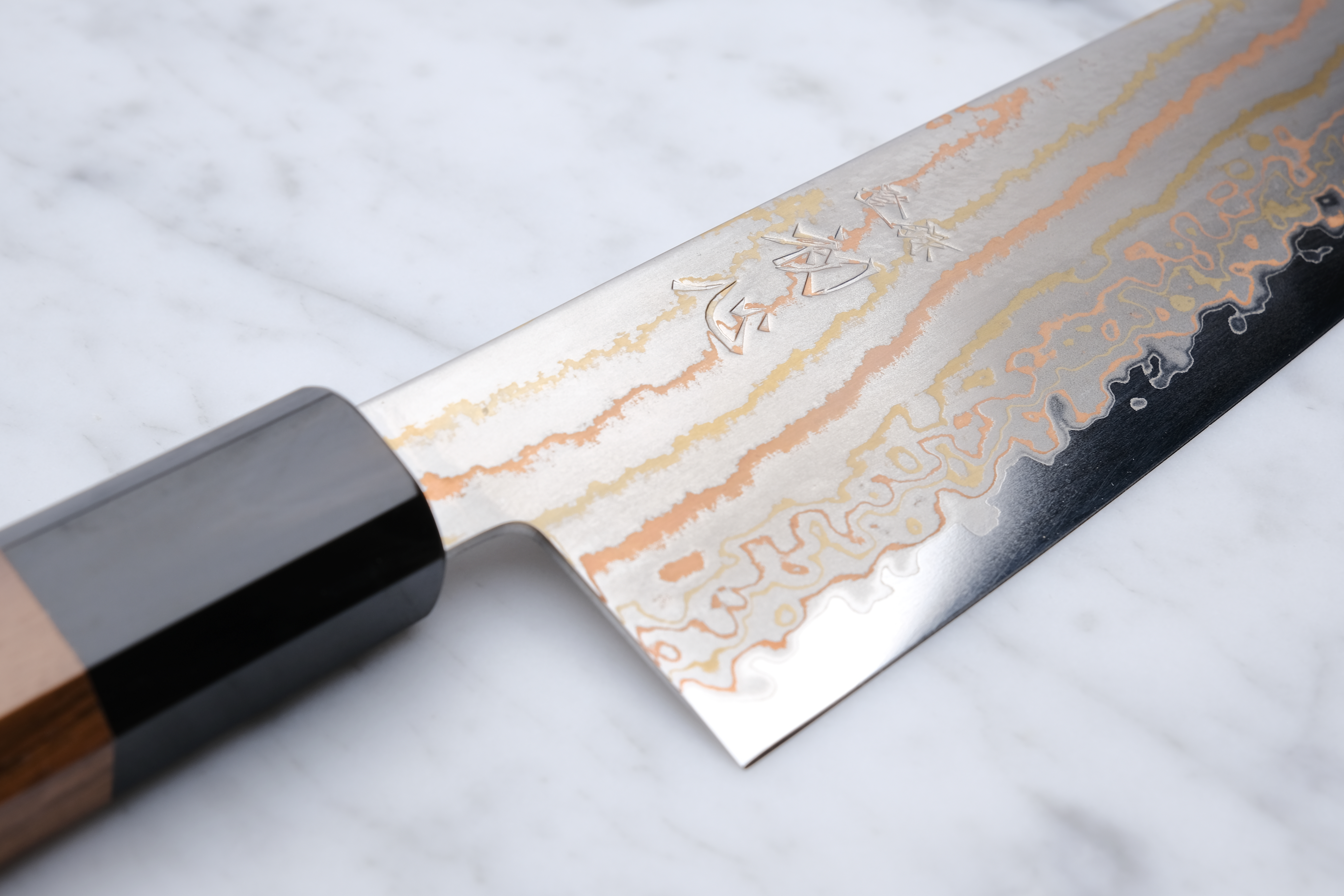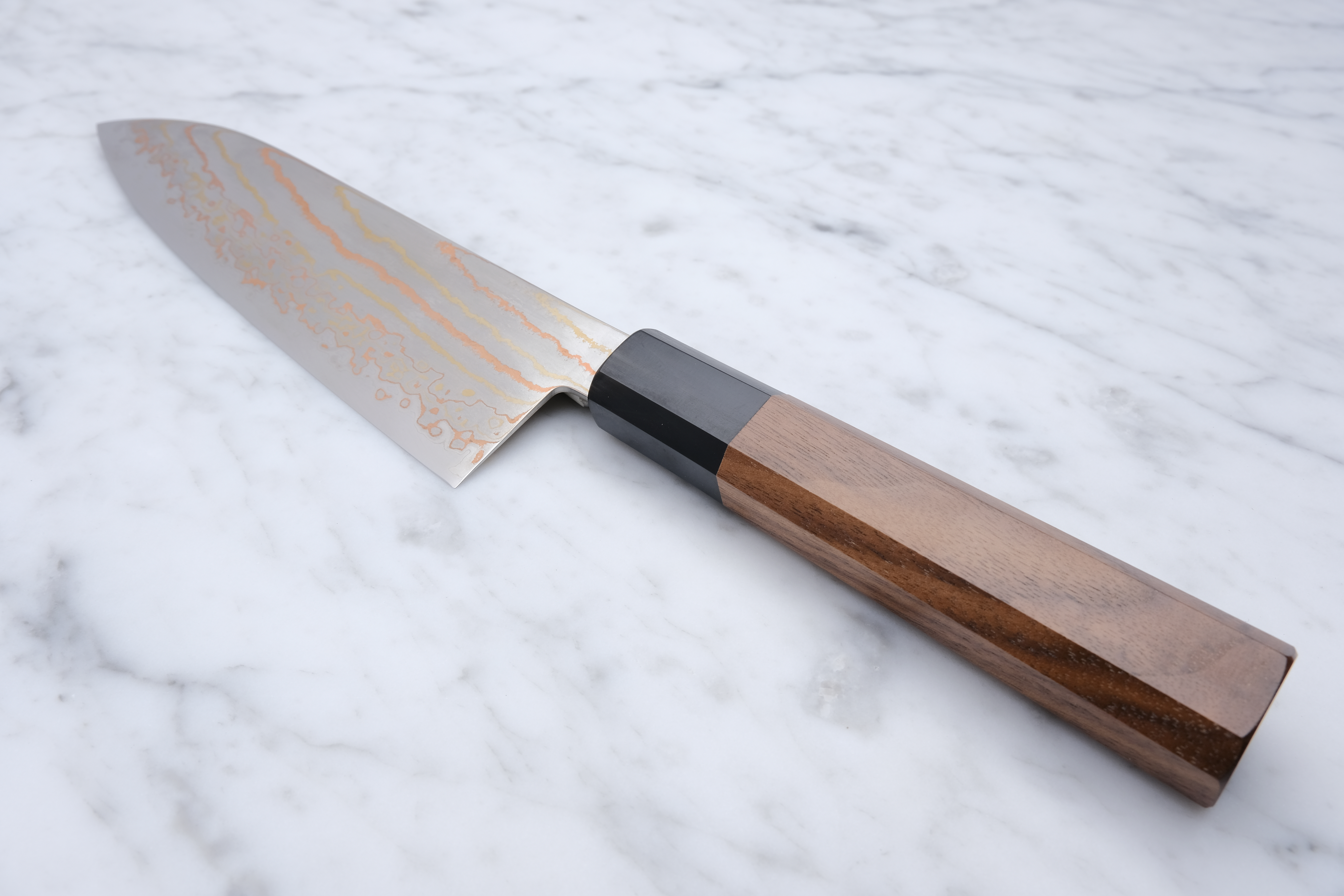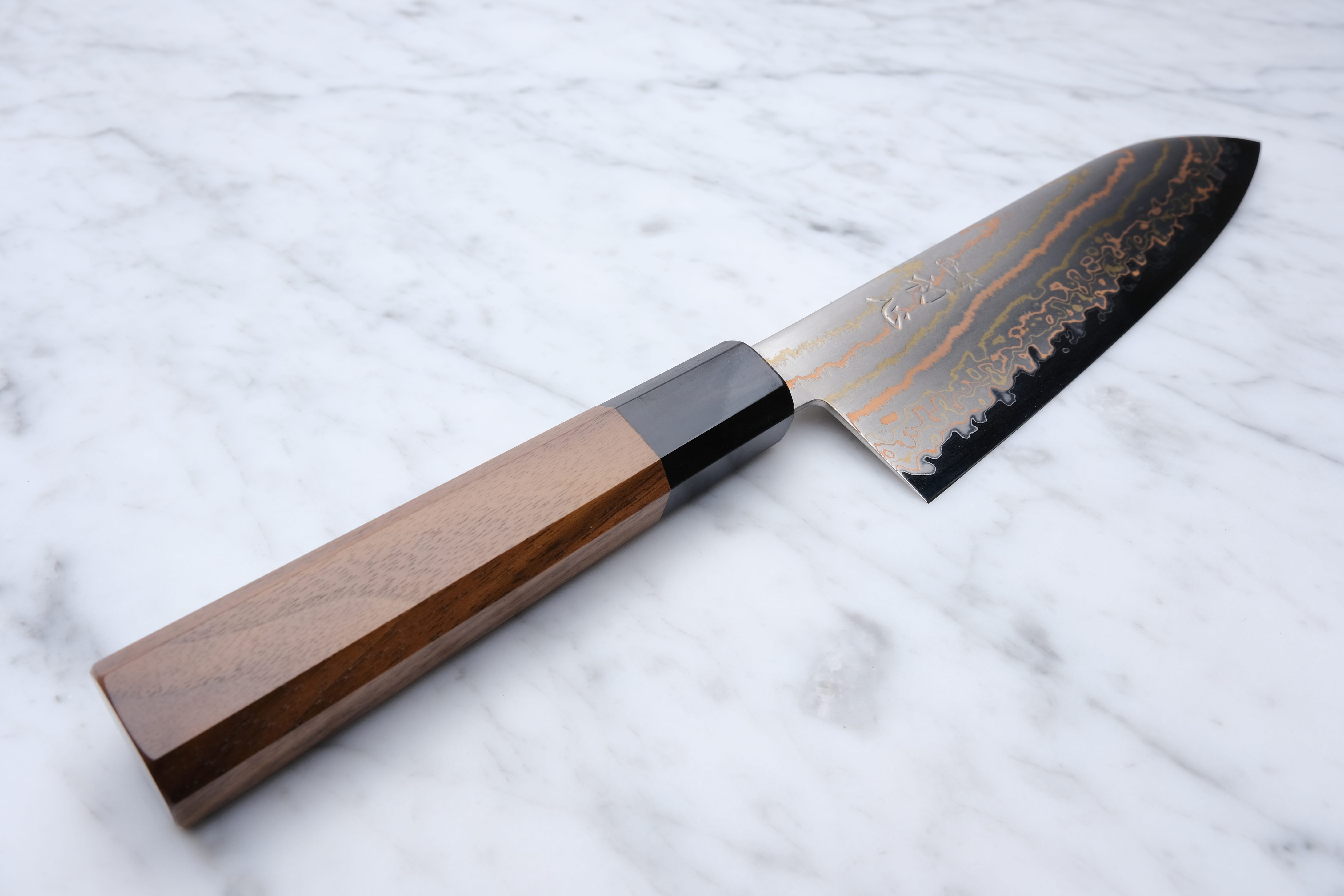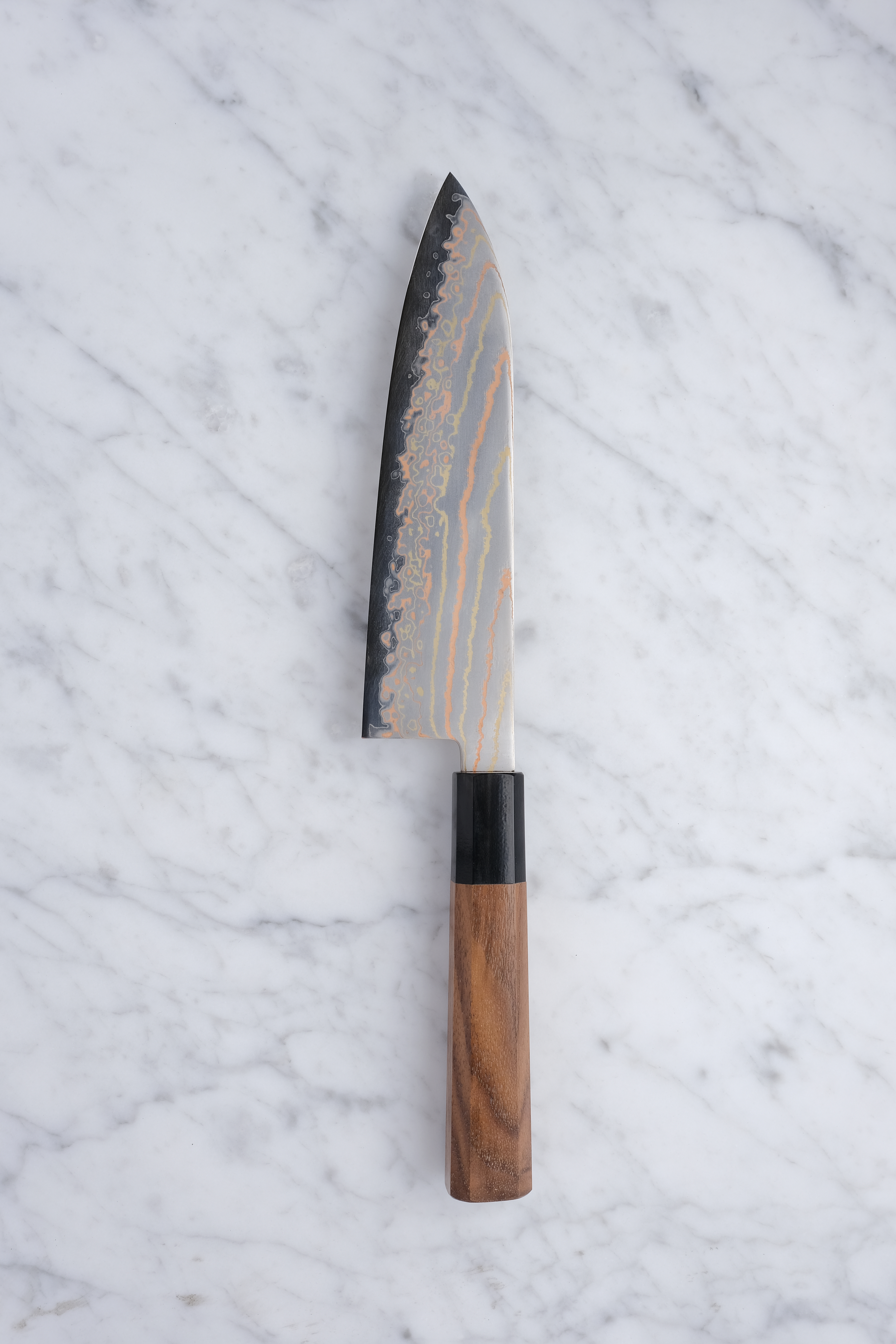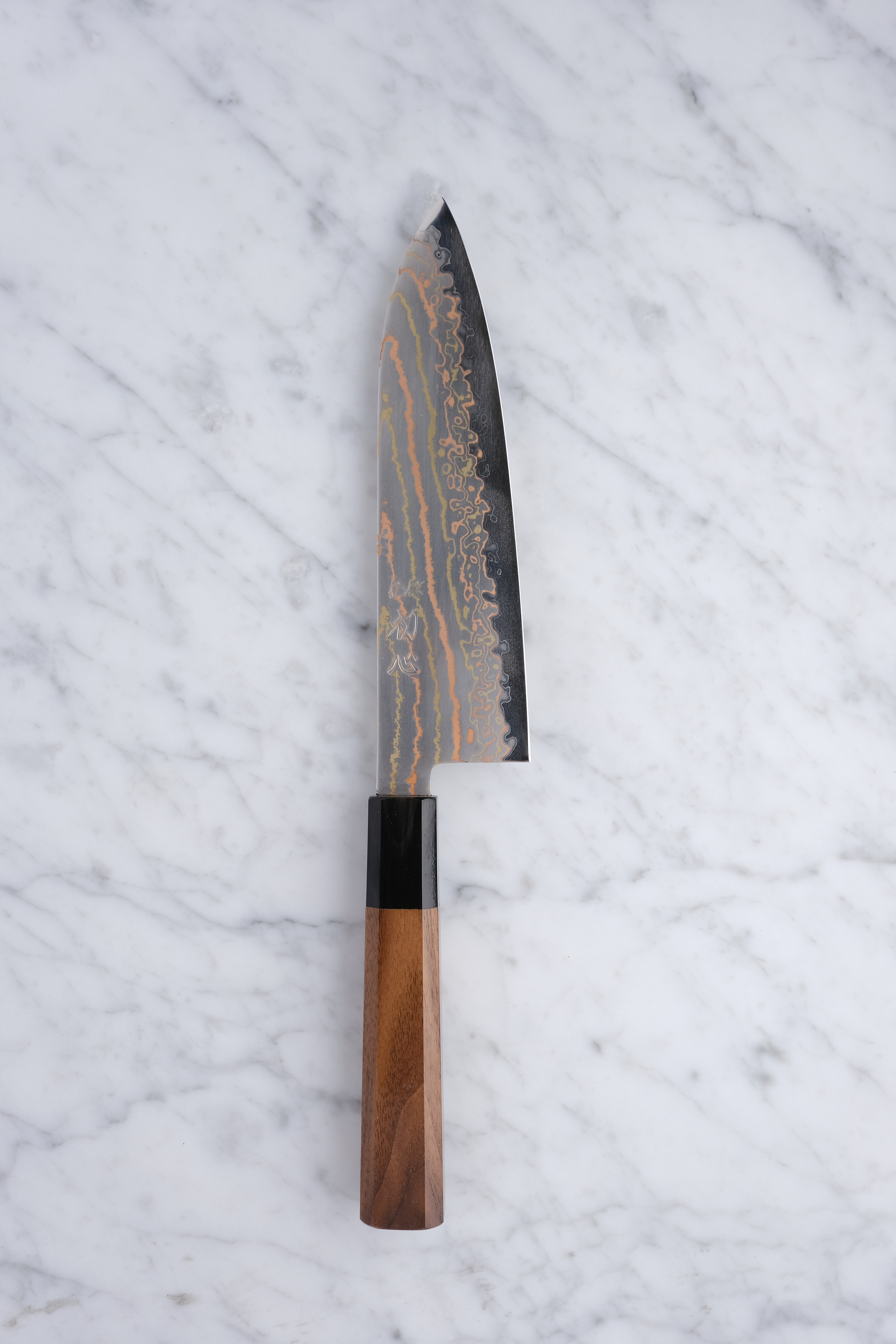 Hatsukokoro Hayabusa Rainbow Damascus 180mm. Santoku