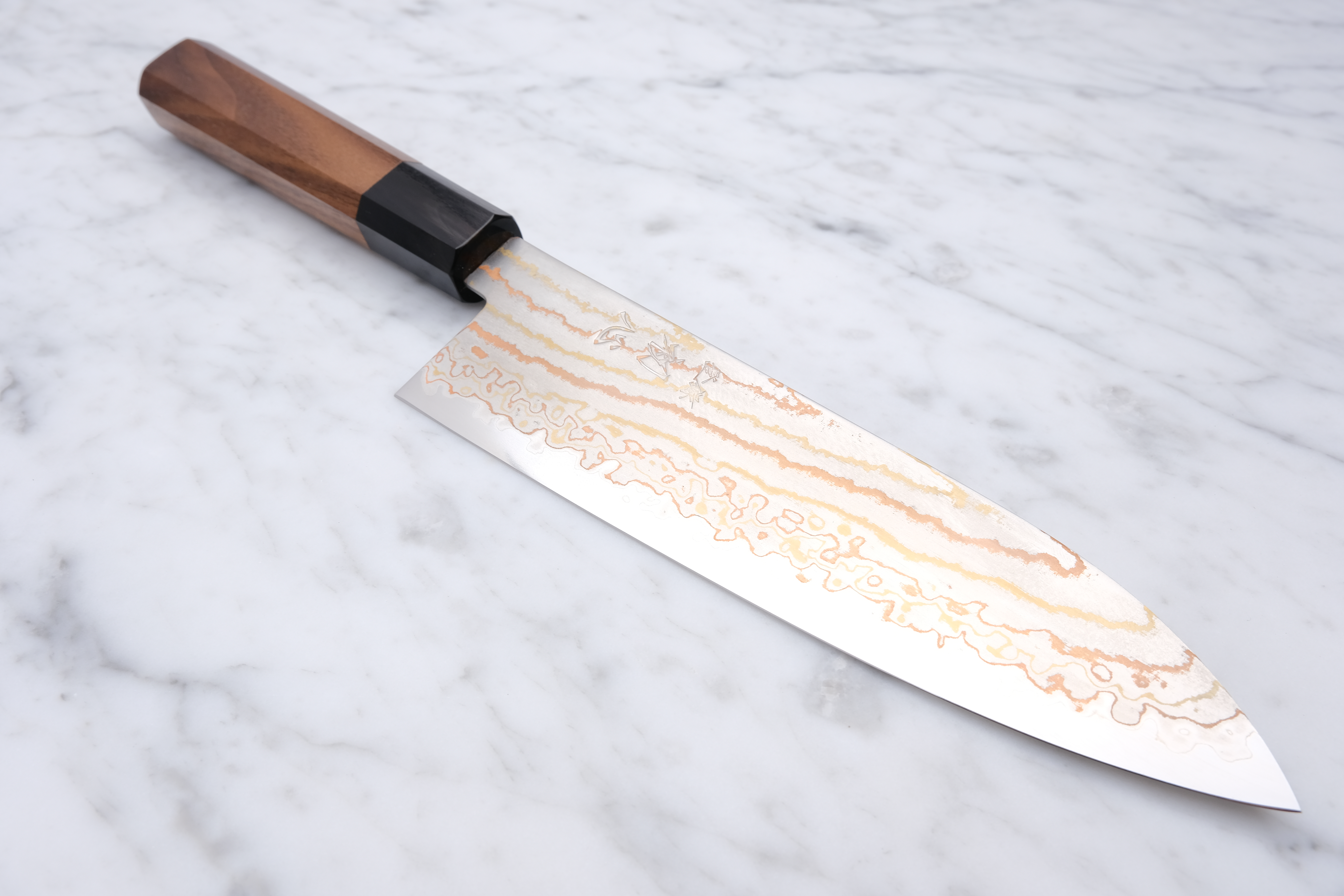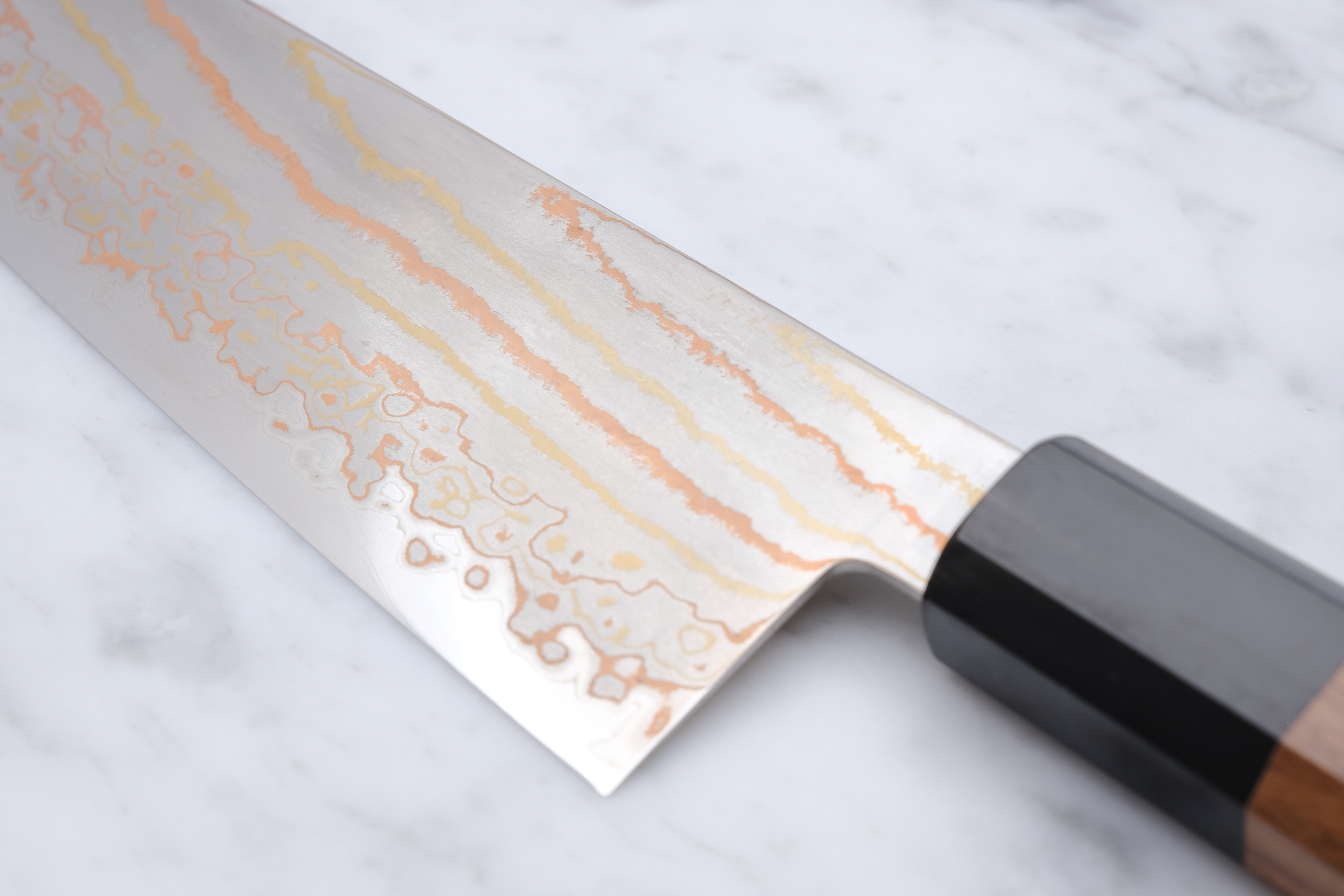The name of this knife comes from the stainless damascus cladding which is composed of a combination of brass and copper that gives a beautiful play of colors.