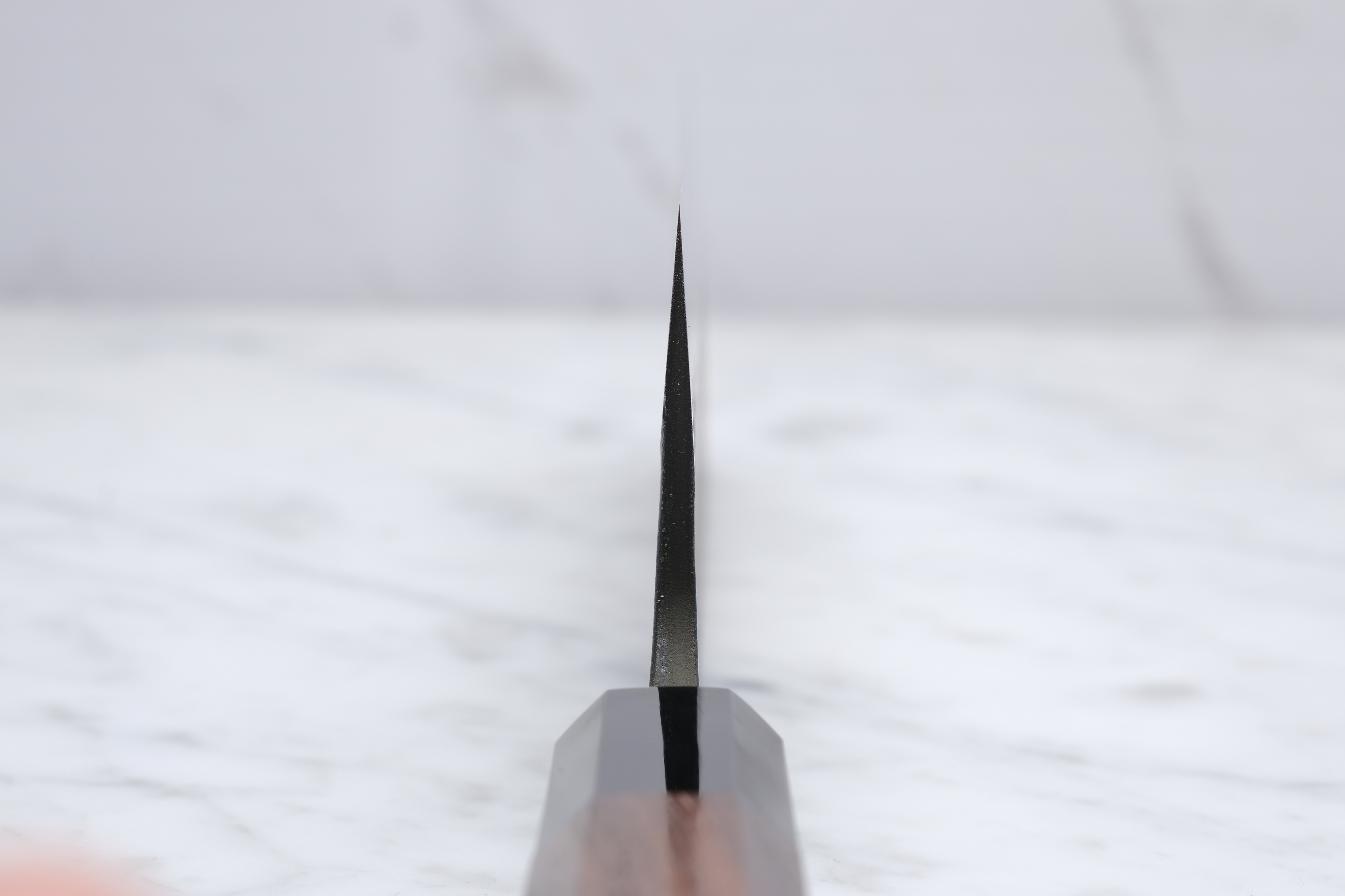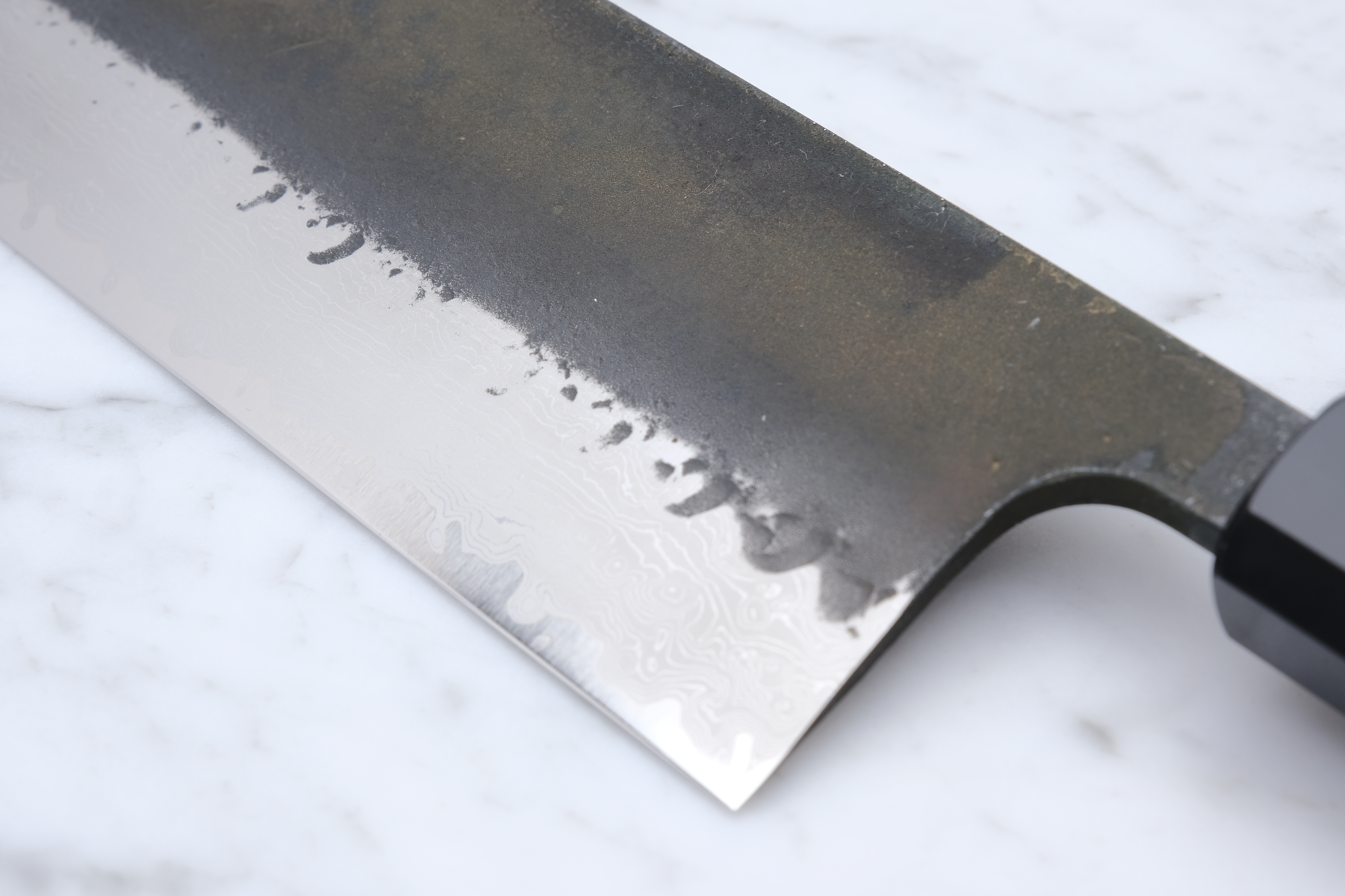 Aogami Super is a carbon steel, and is in the category of so-called blue steel, and "Super" is the hardest of these alloys. Aogami Super is one of the carbon steels that can be hardened the hardest, and for this reason it keeps its sharpness for a really long time. However, it is also relatively easy to sharpen, compared to stainless knives.