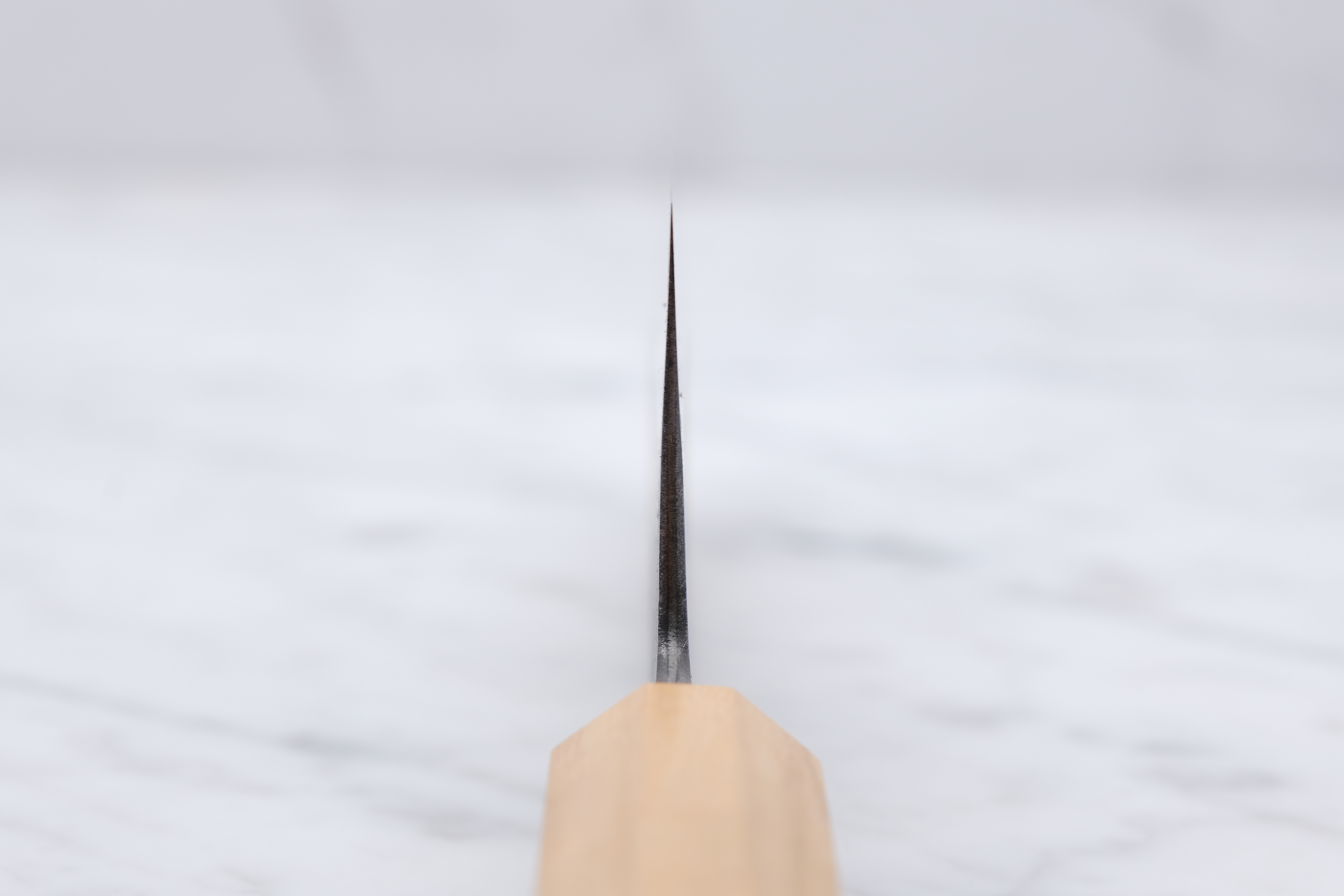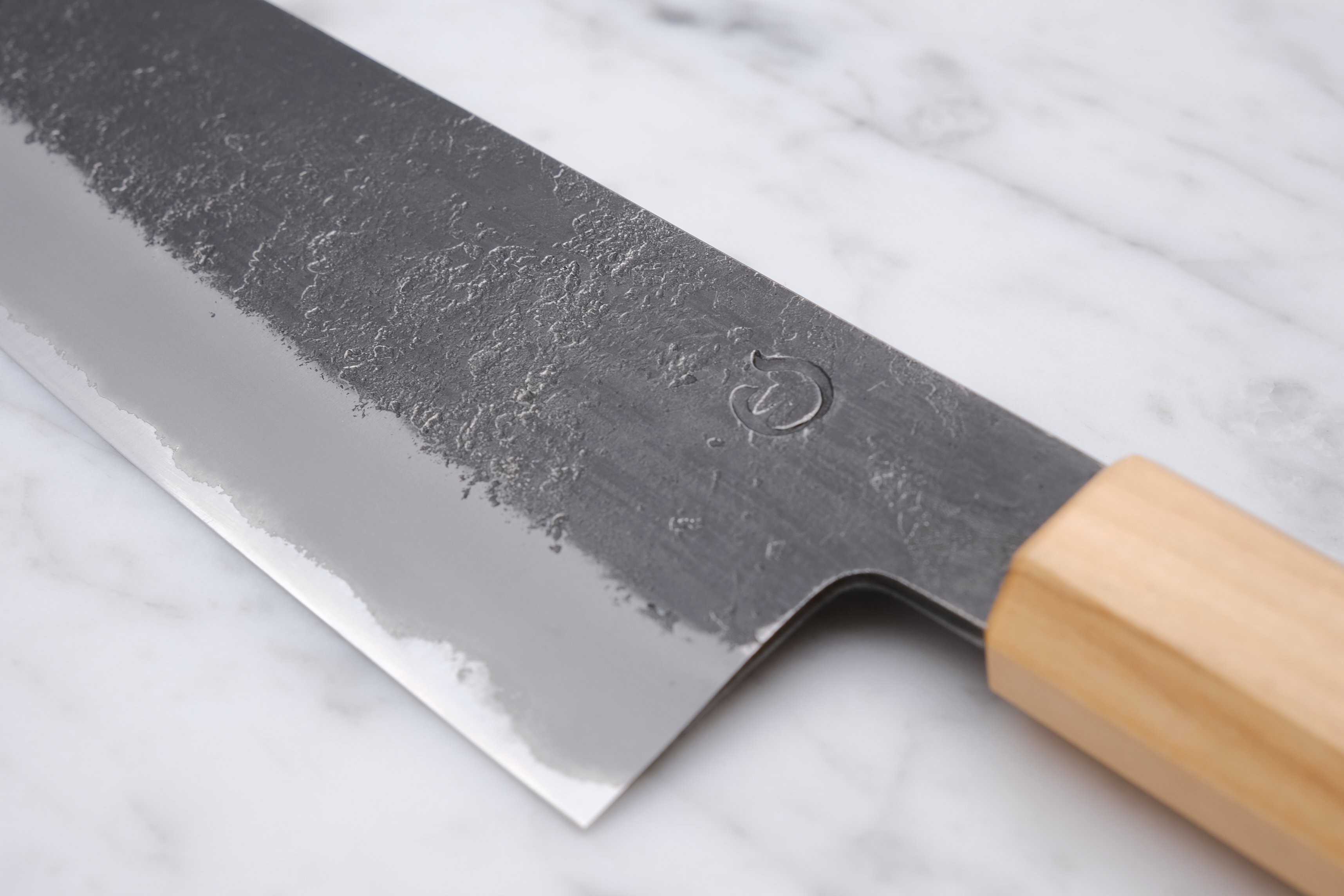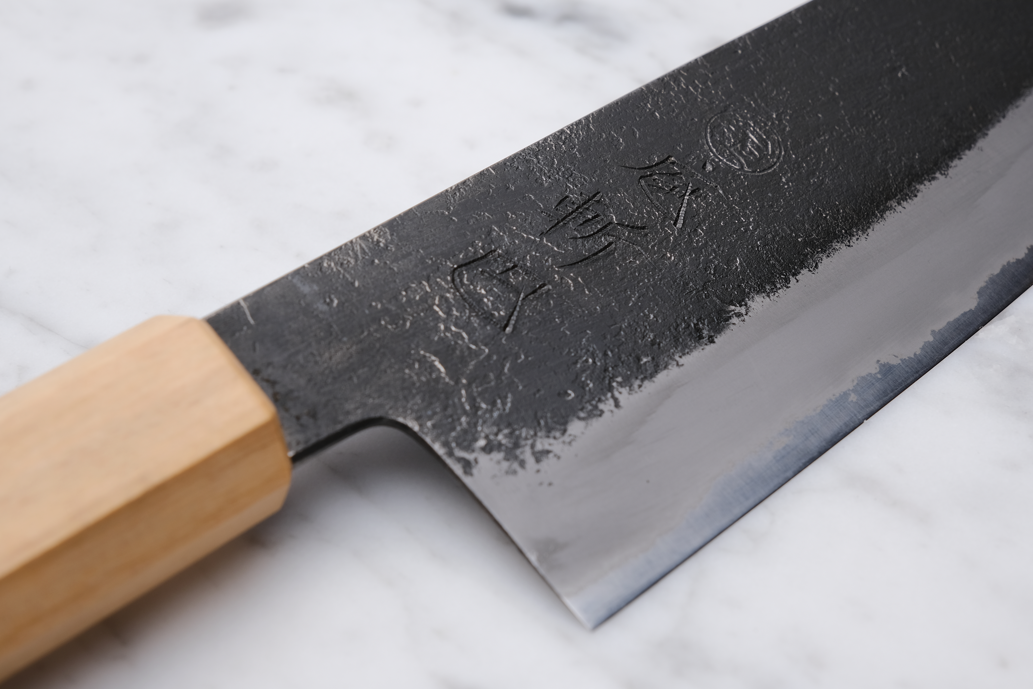 The knives are made of shirogami (white steel) 2 in the core, surrounded by soft iron. The knives are finished with a rustic kurouchi finish, as well as a kasumi finish from the shinogi. Fit & Finish is also well executed, with rounded spine and choil.