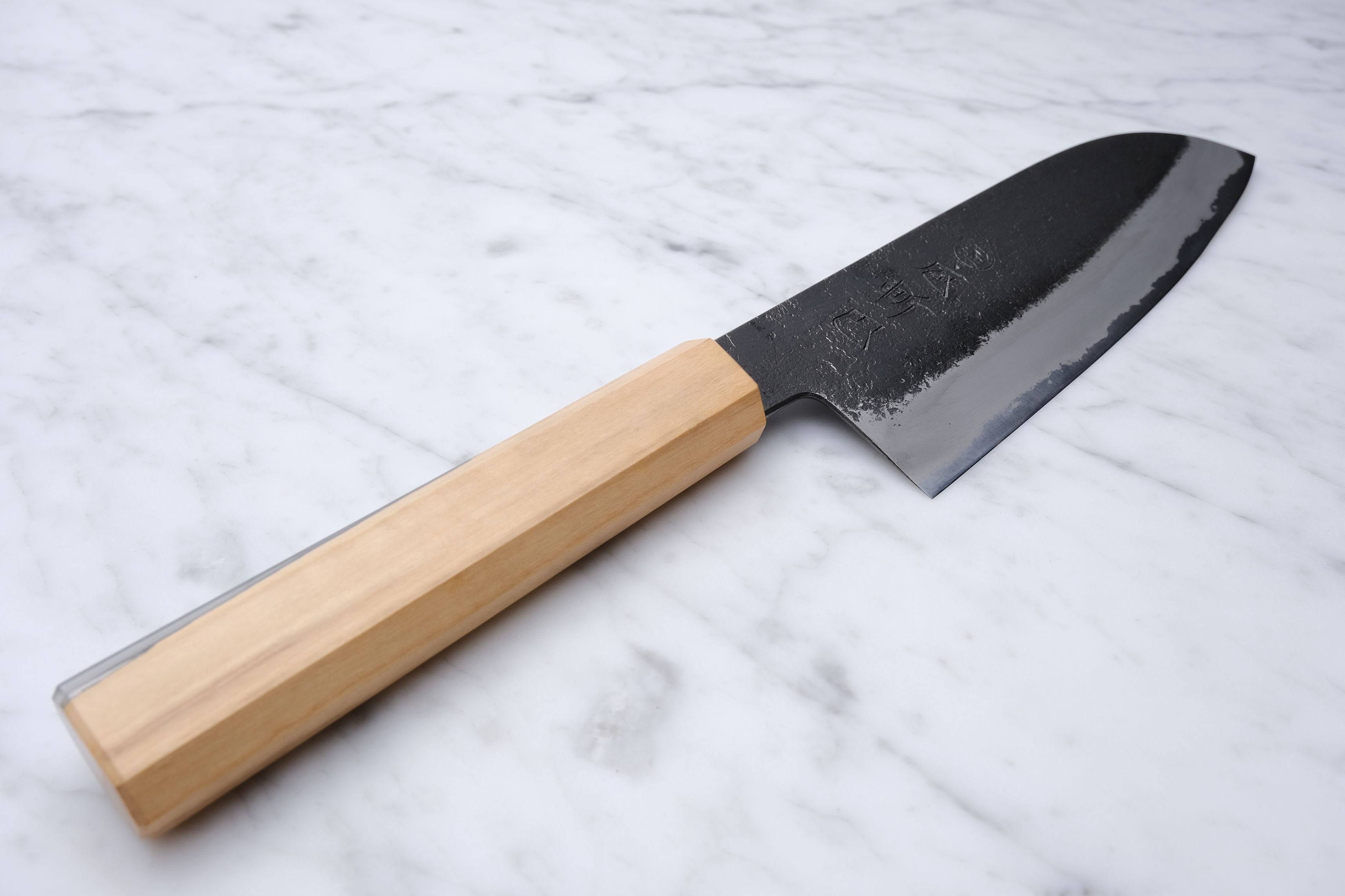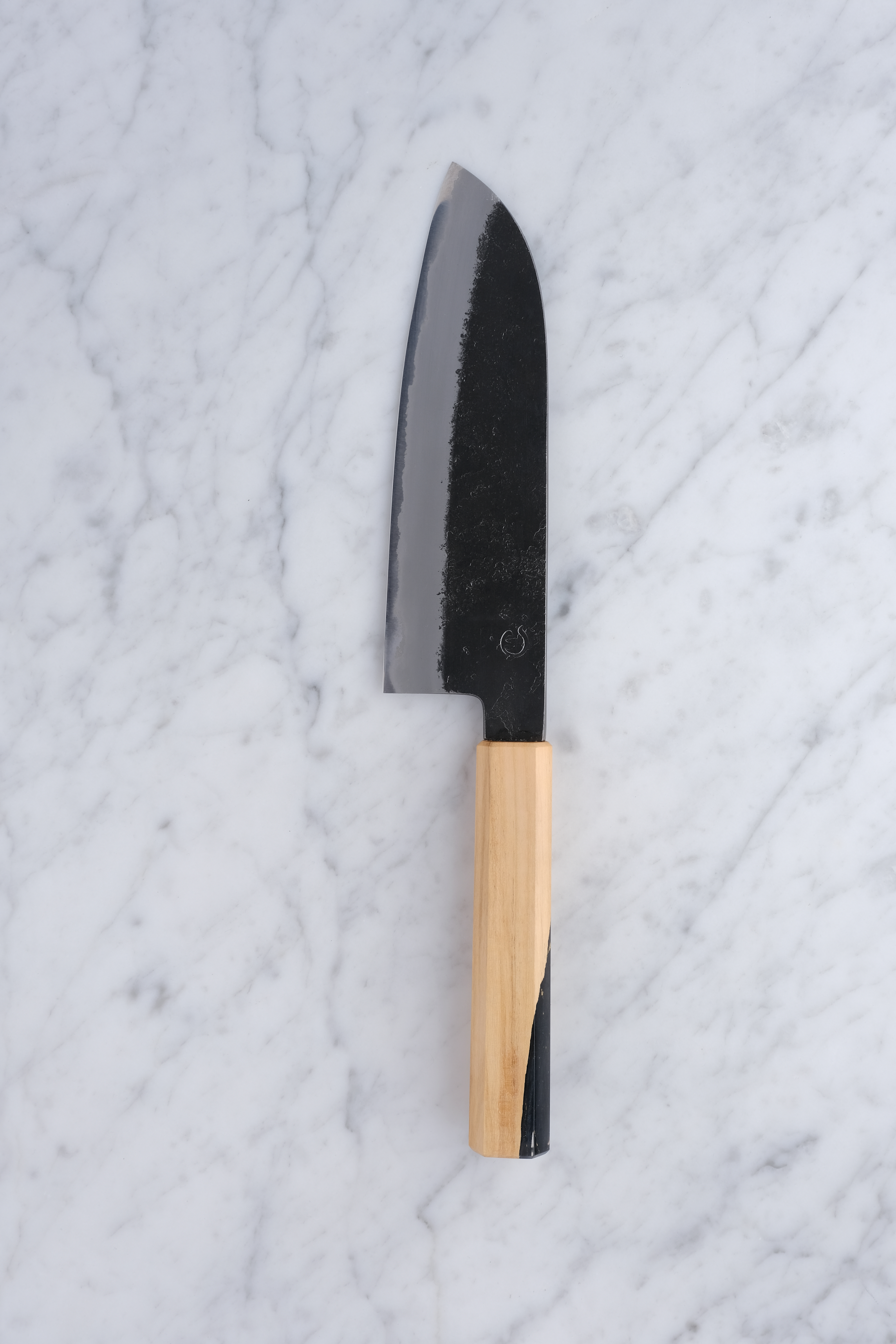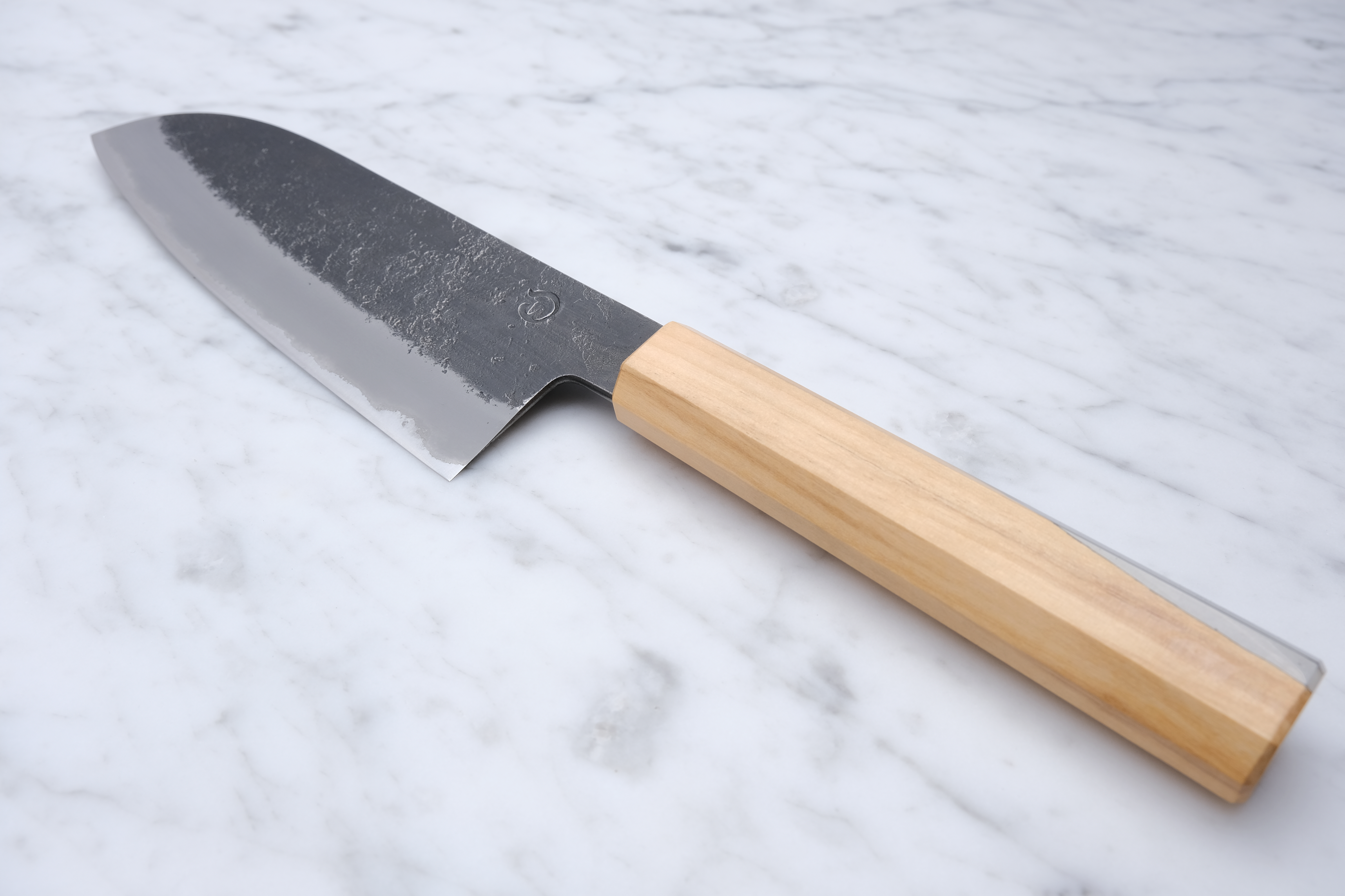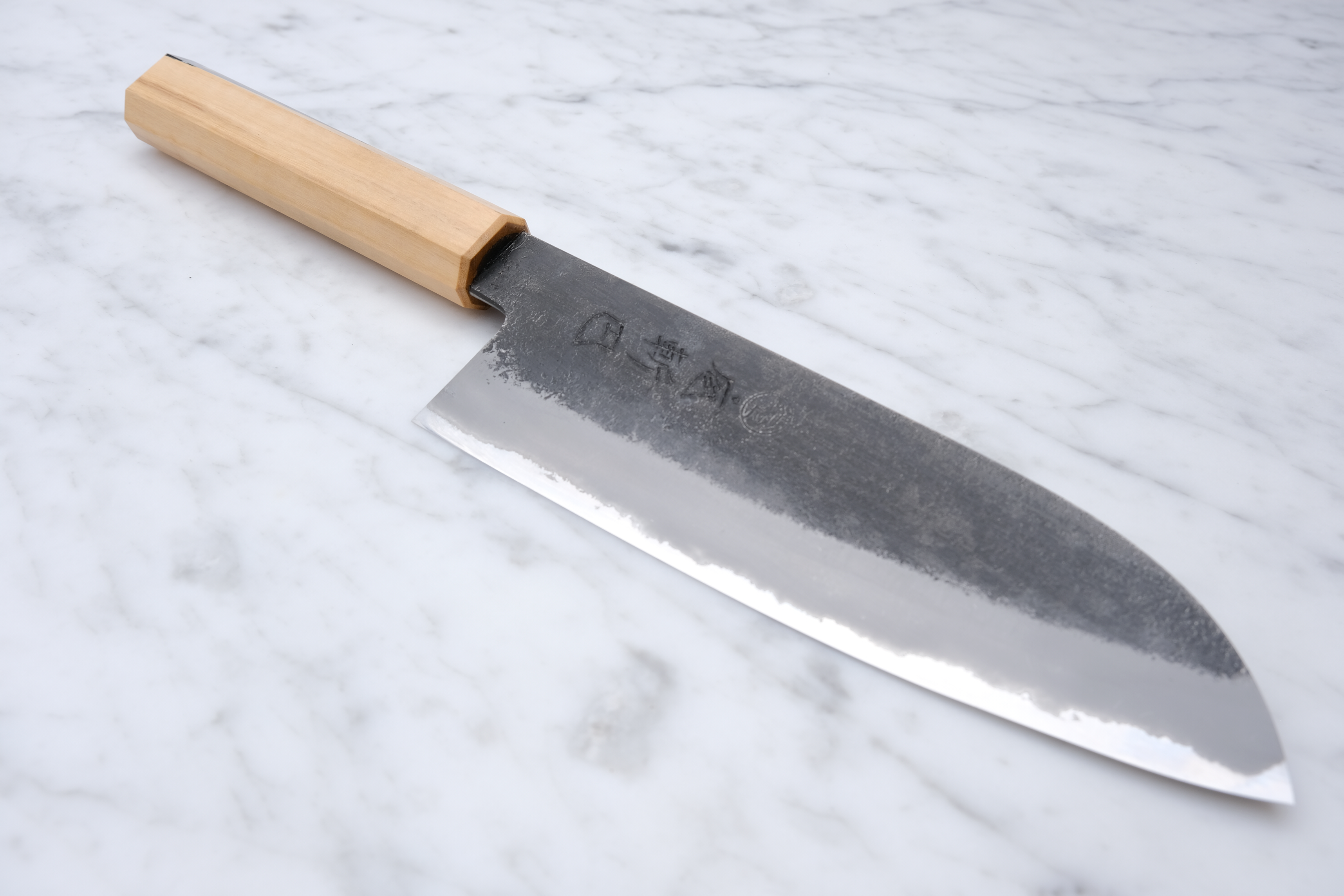 The knives are made of shirogami (white steel) 2 in the core, surrounded by soft iron. The knives are finished with a rustic kurouchi finish, as well as a kasumi finish from the shinogi. Fit & Finish is also well executed, with rounded spine and choil.