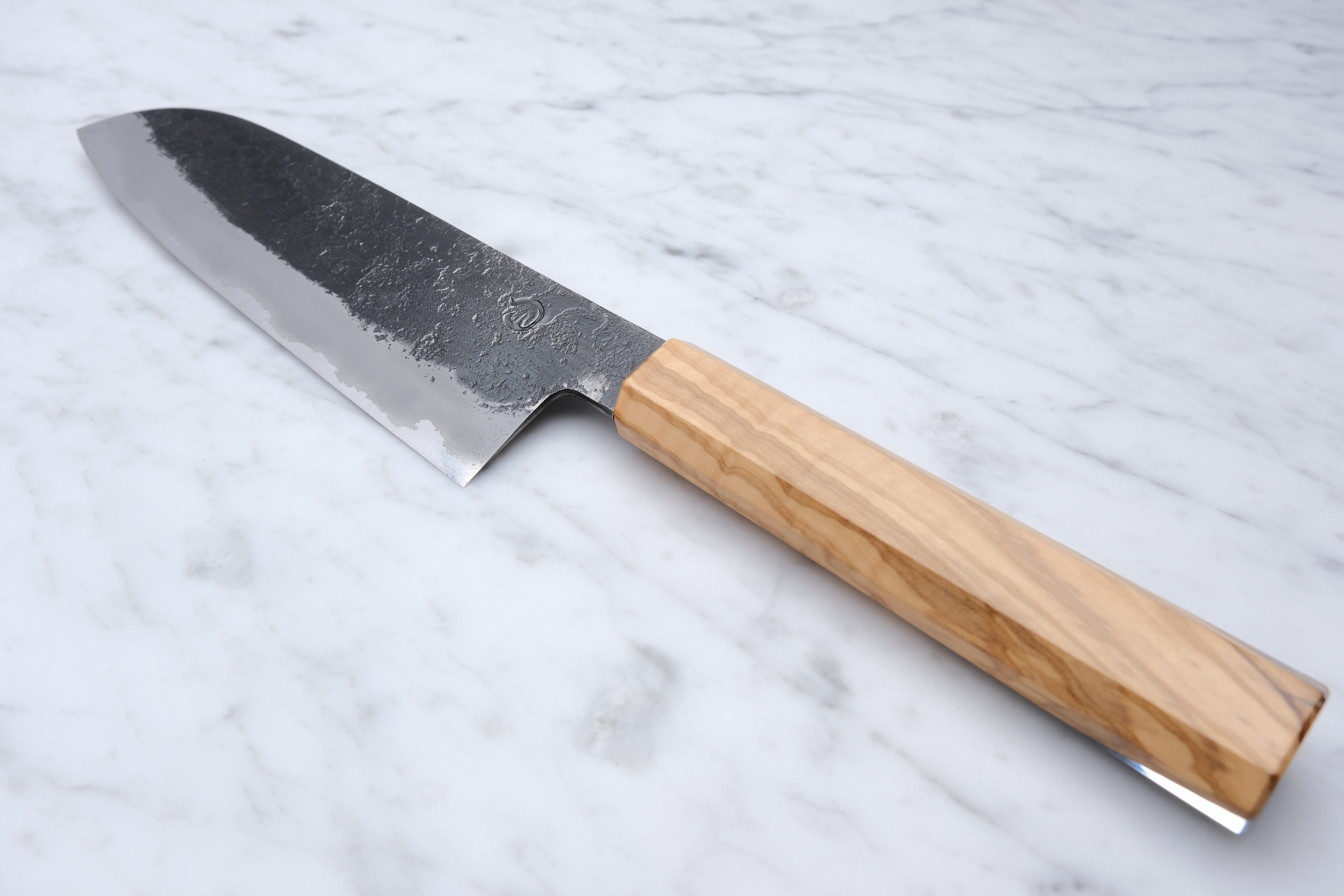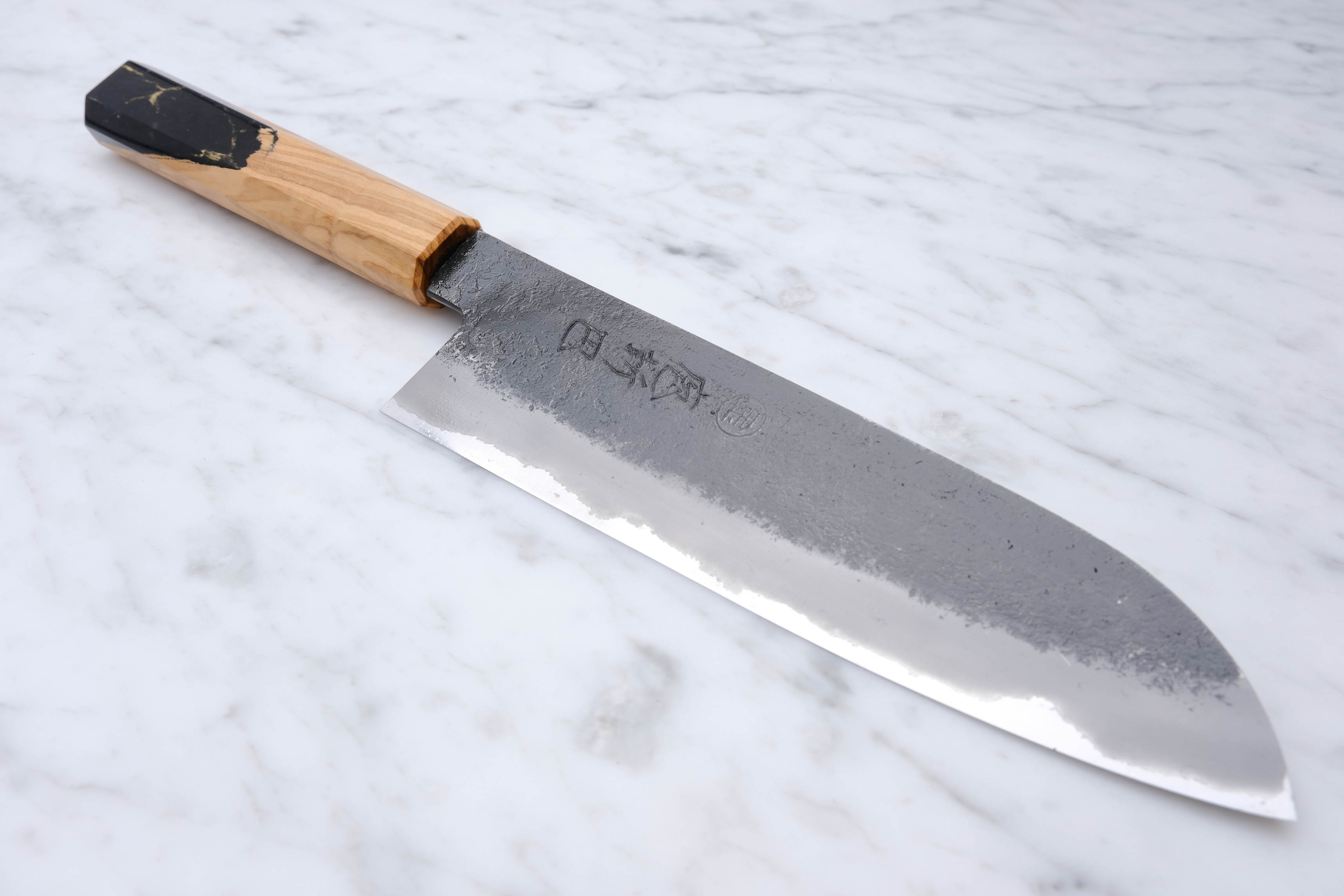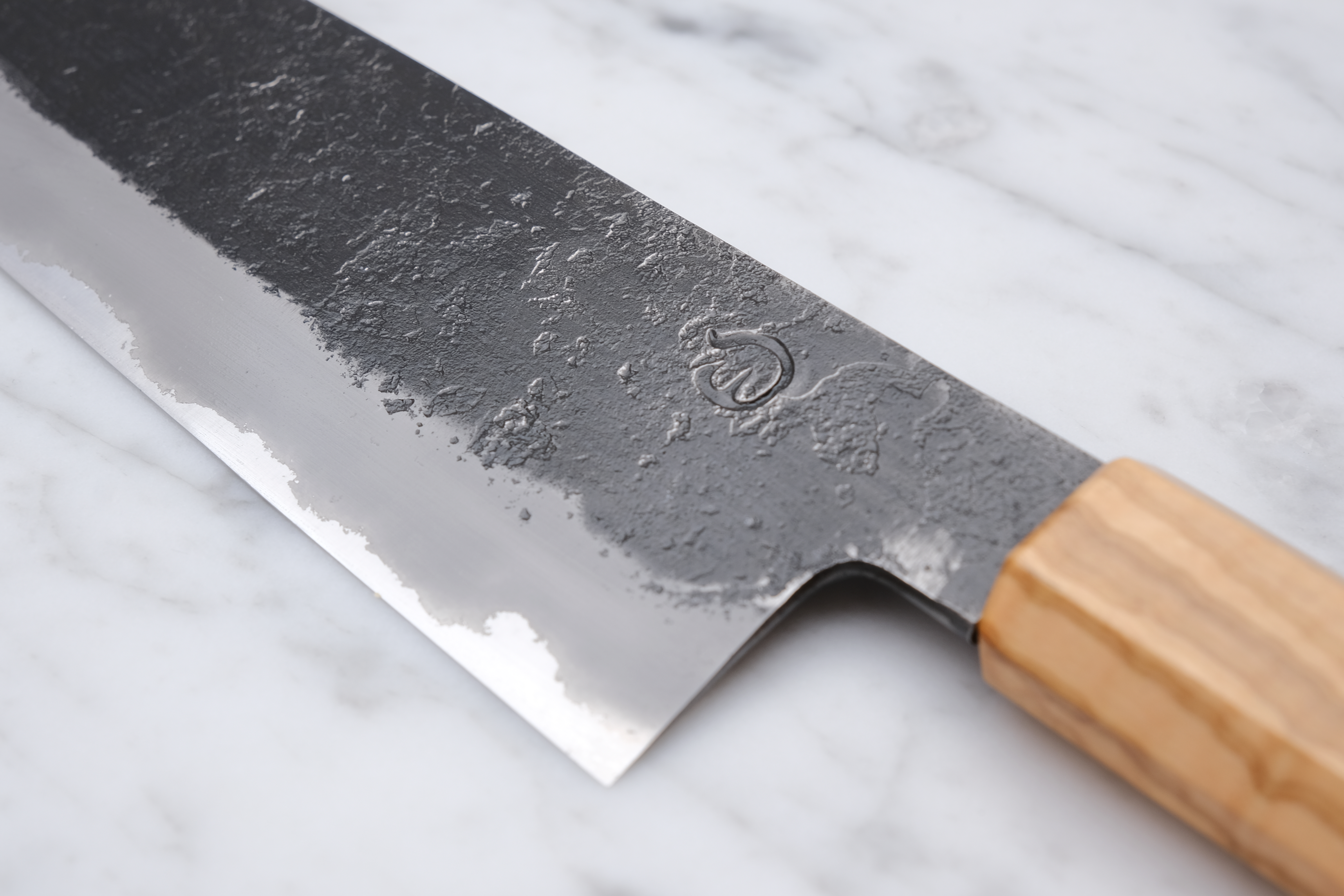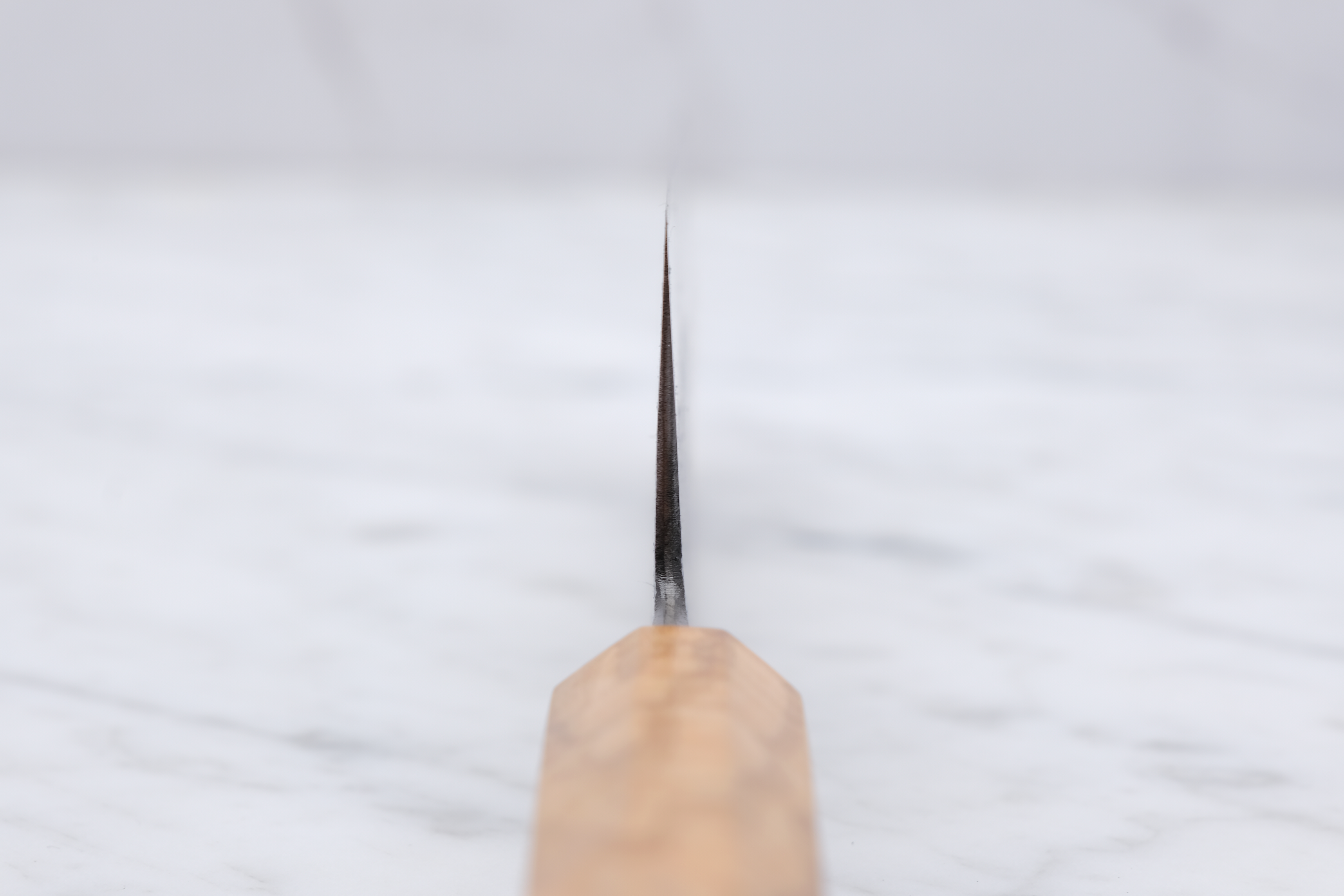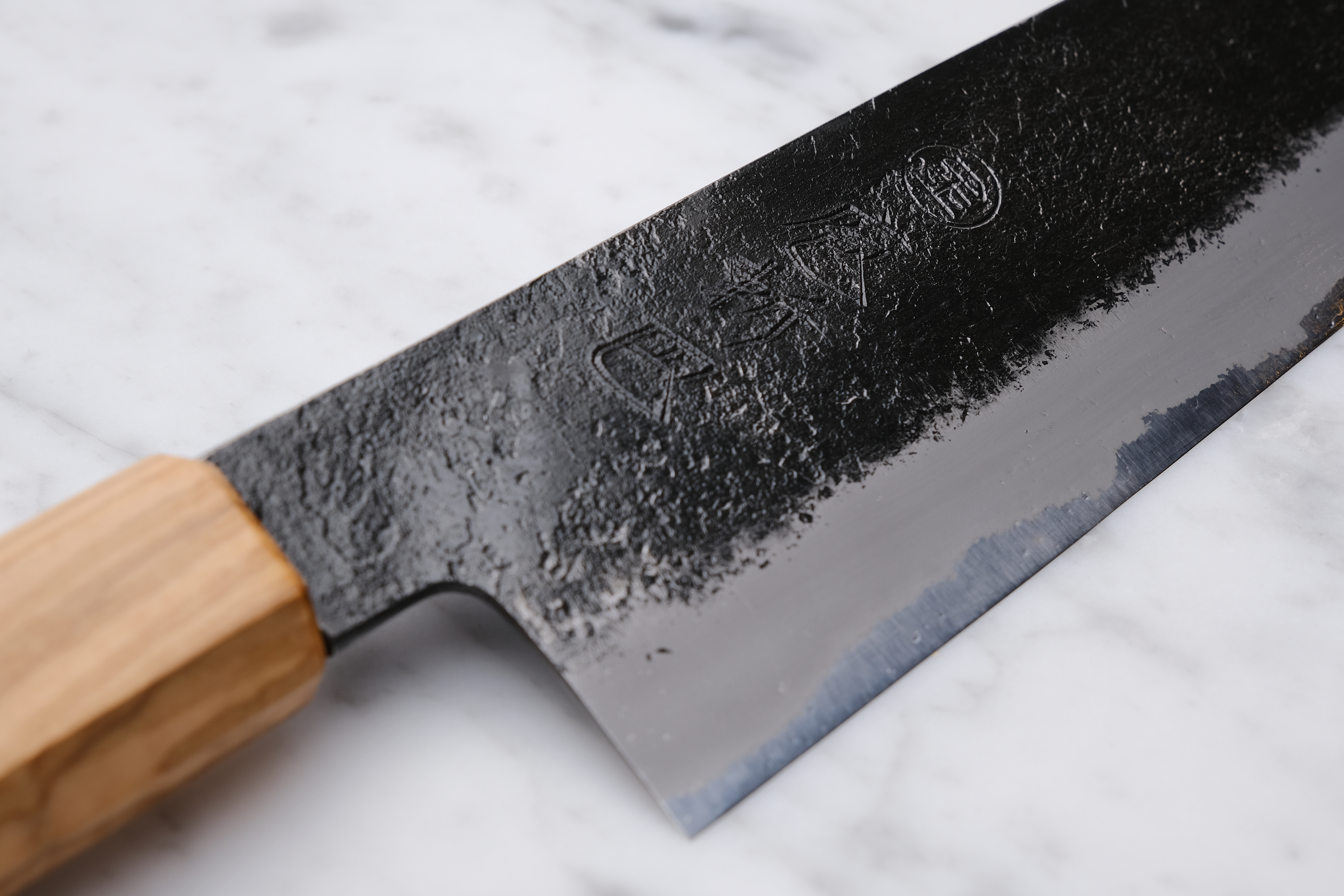 The knives are made of shirogami (white steel) 2 in the core, surrounded by soft iron. The knives are finished with a rustic kurouchi finish, as well as a kasumi finish from the shinogi. Fit & Finish is also well executed, with rounded spine and choil.