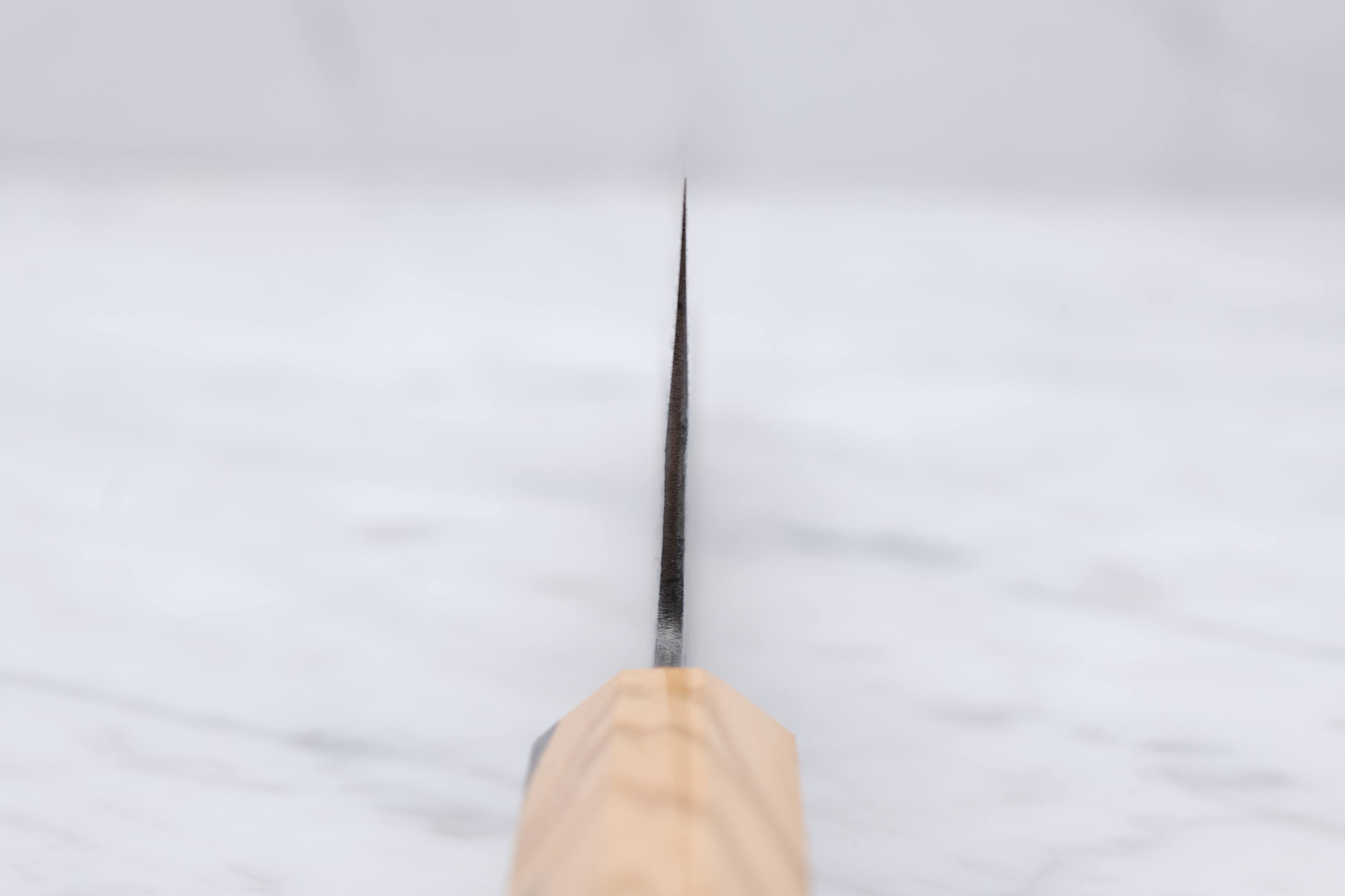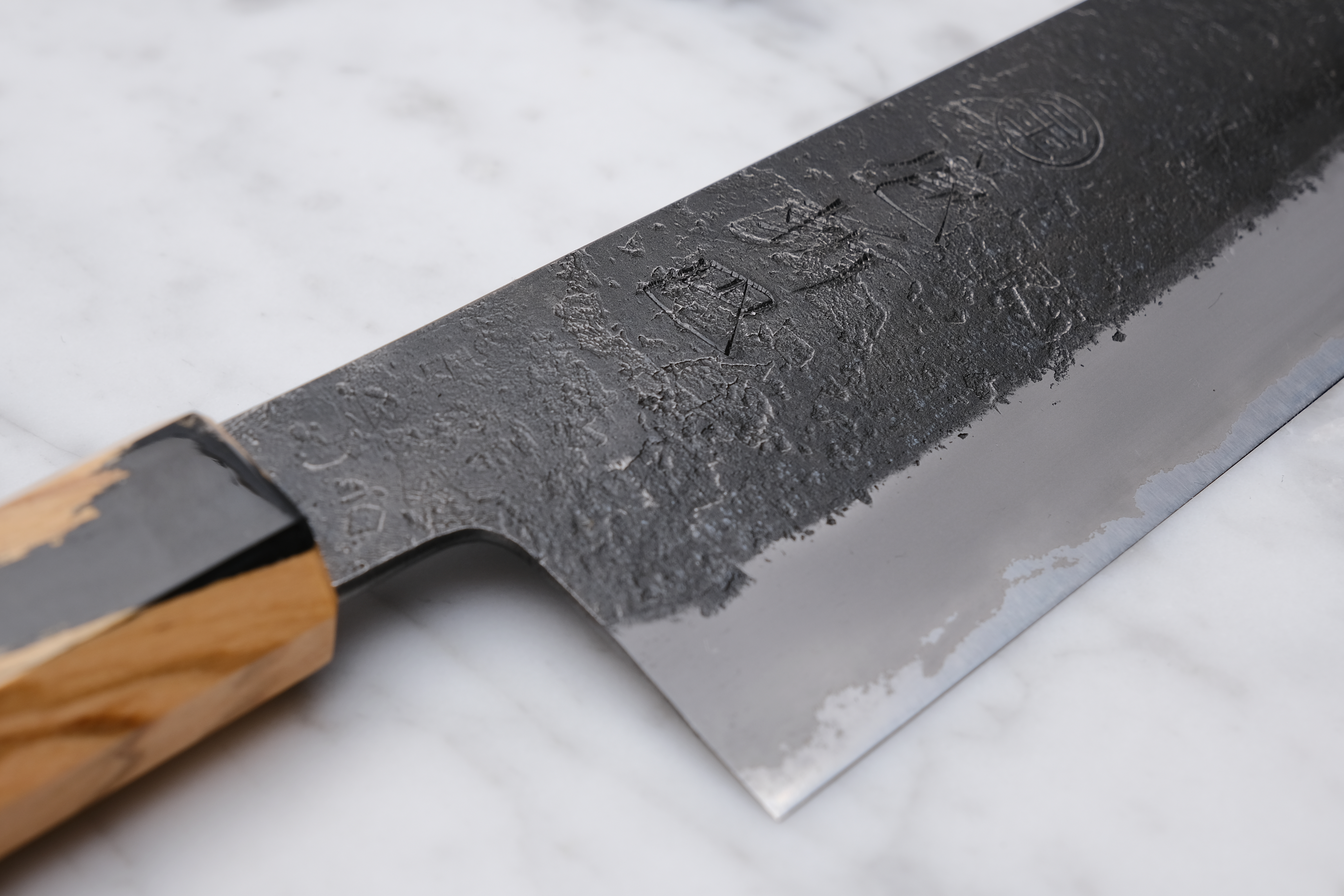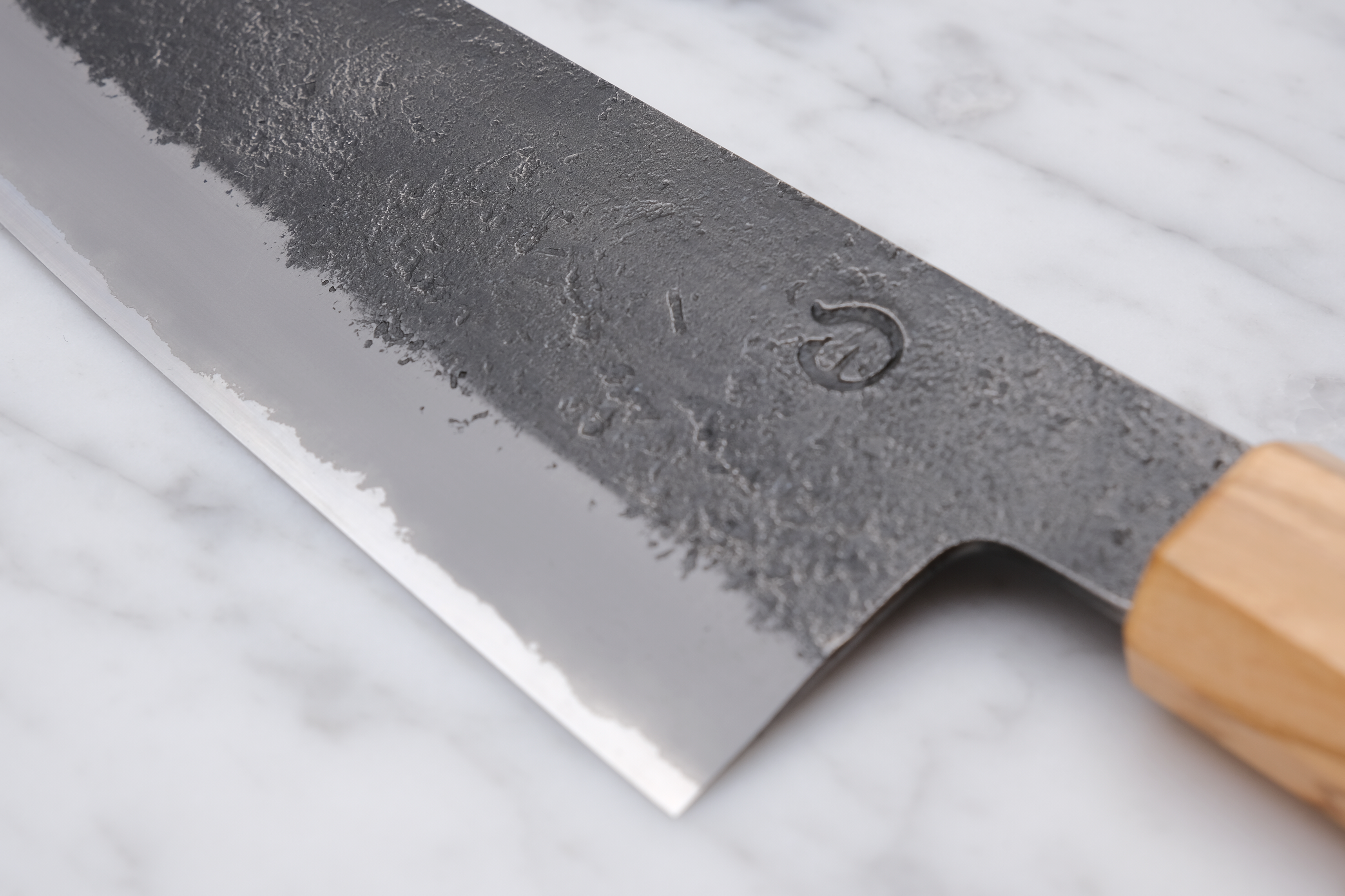 The knives are made of shirogami (white steel) 2 in the core, surrounded by soft iron. The knives are finished with a rustic kurouchi finish, as well as a kasumi finish from the shinogi. Fit & Finish is also well executed, with rounded spine and choil.