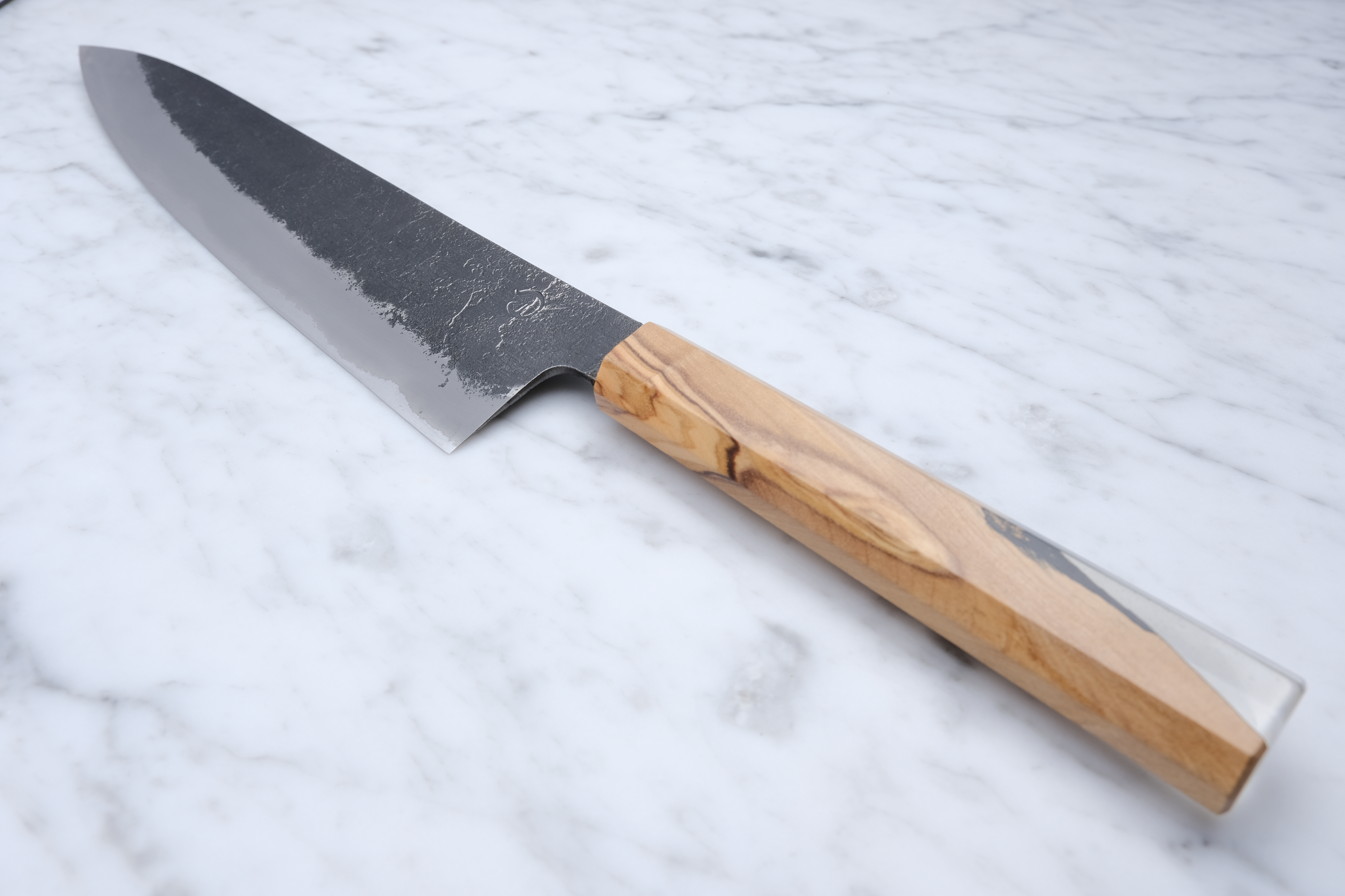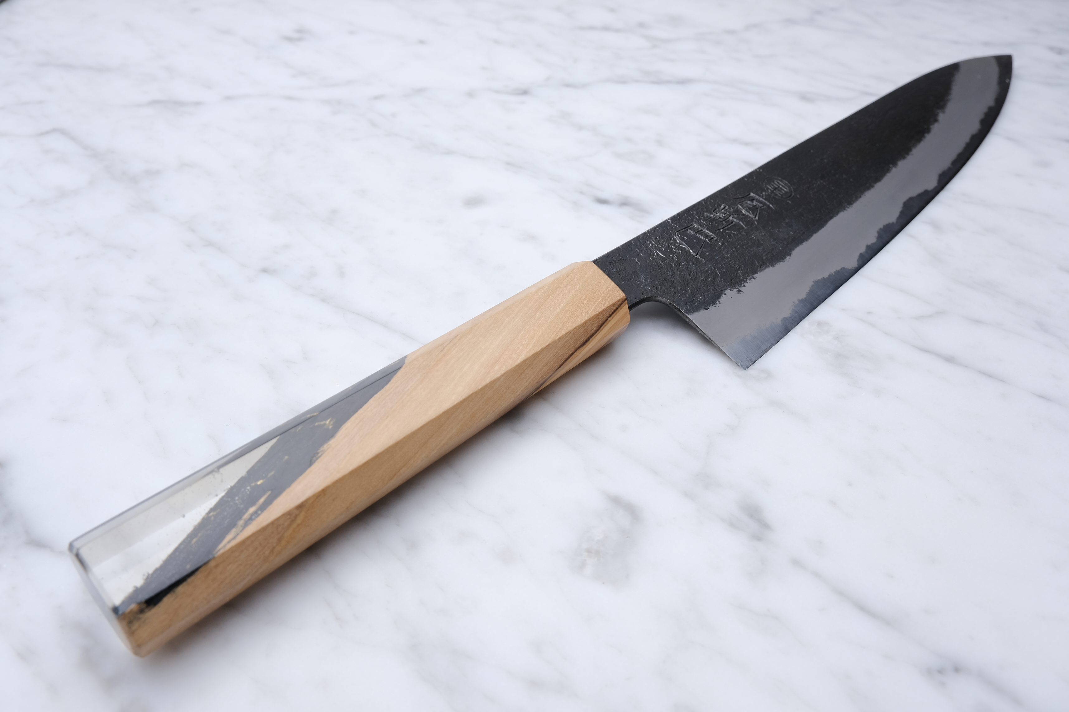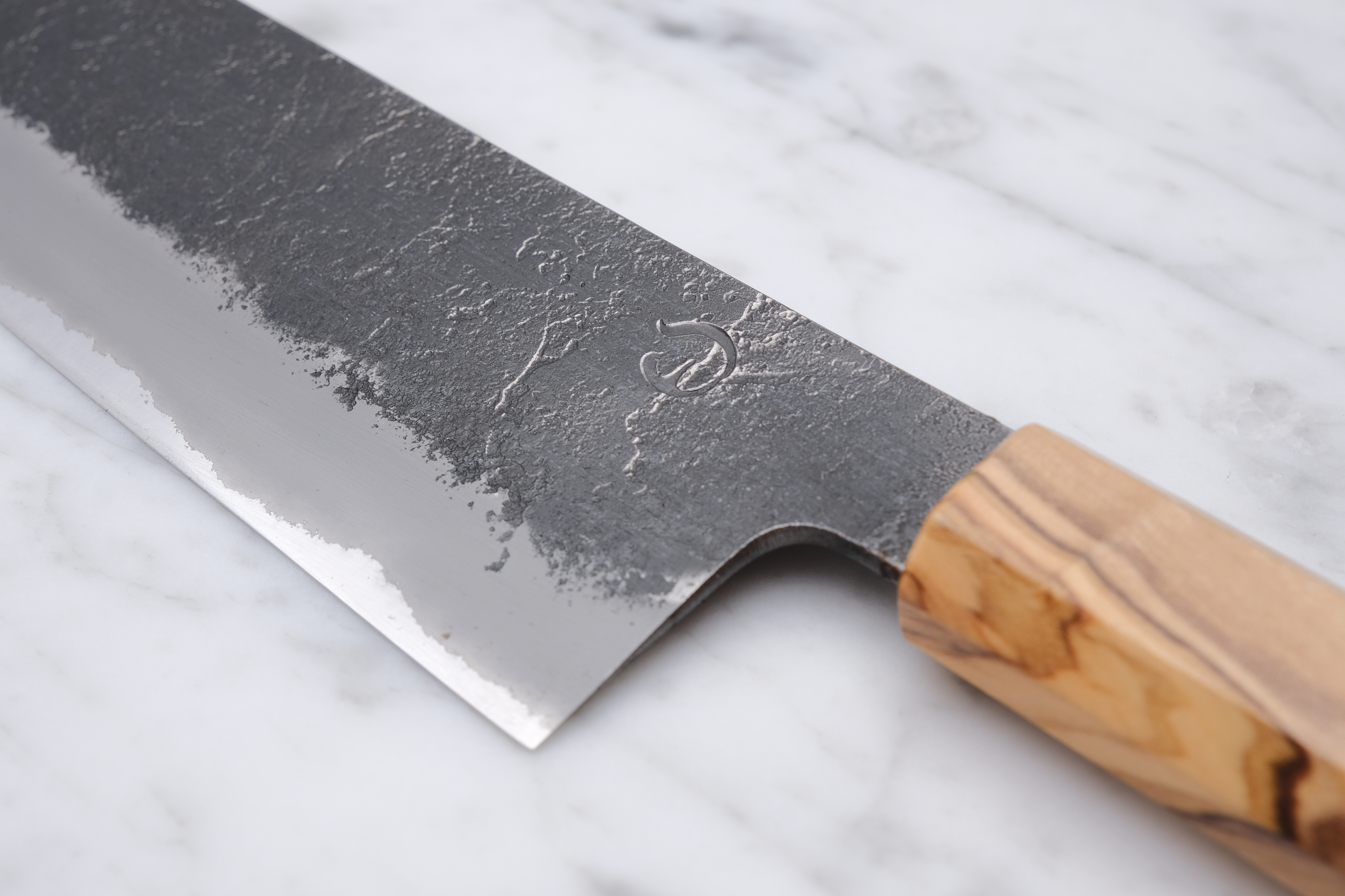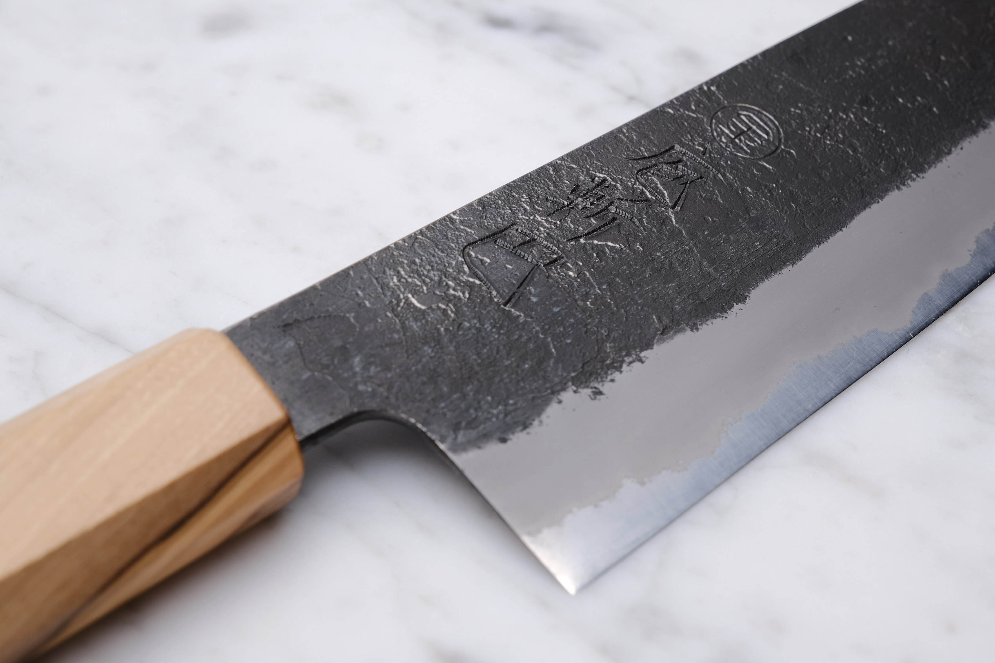 The knives are made of shirogami (white steel) 2 in the core, surrounded by soft iron. The knives are finished with a rustic kurouchi finish, as well as a kasumi finish from the shinogi. Fit & Finish is also well executed, with rounded spine and choil.