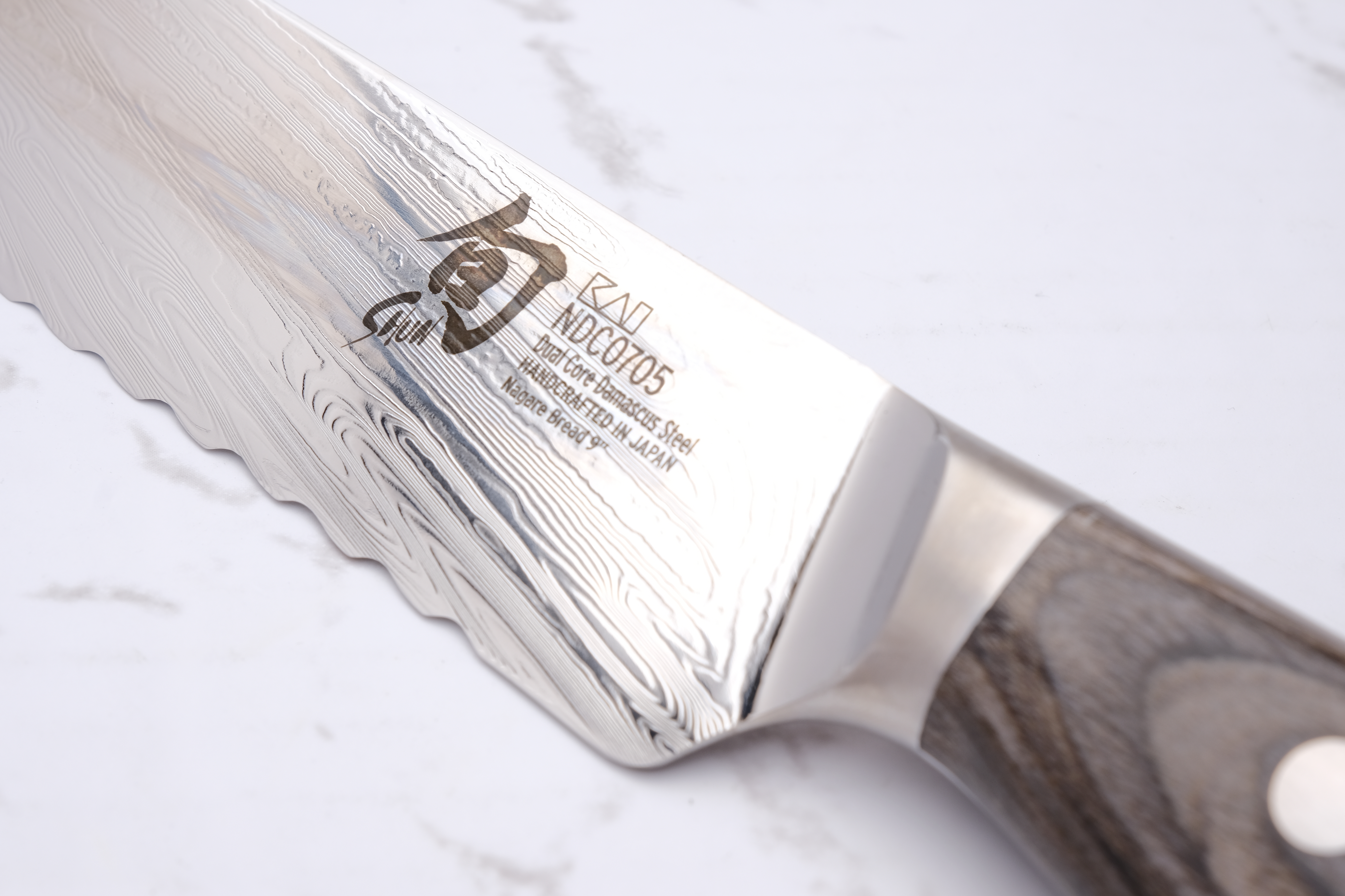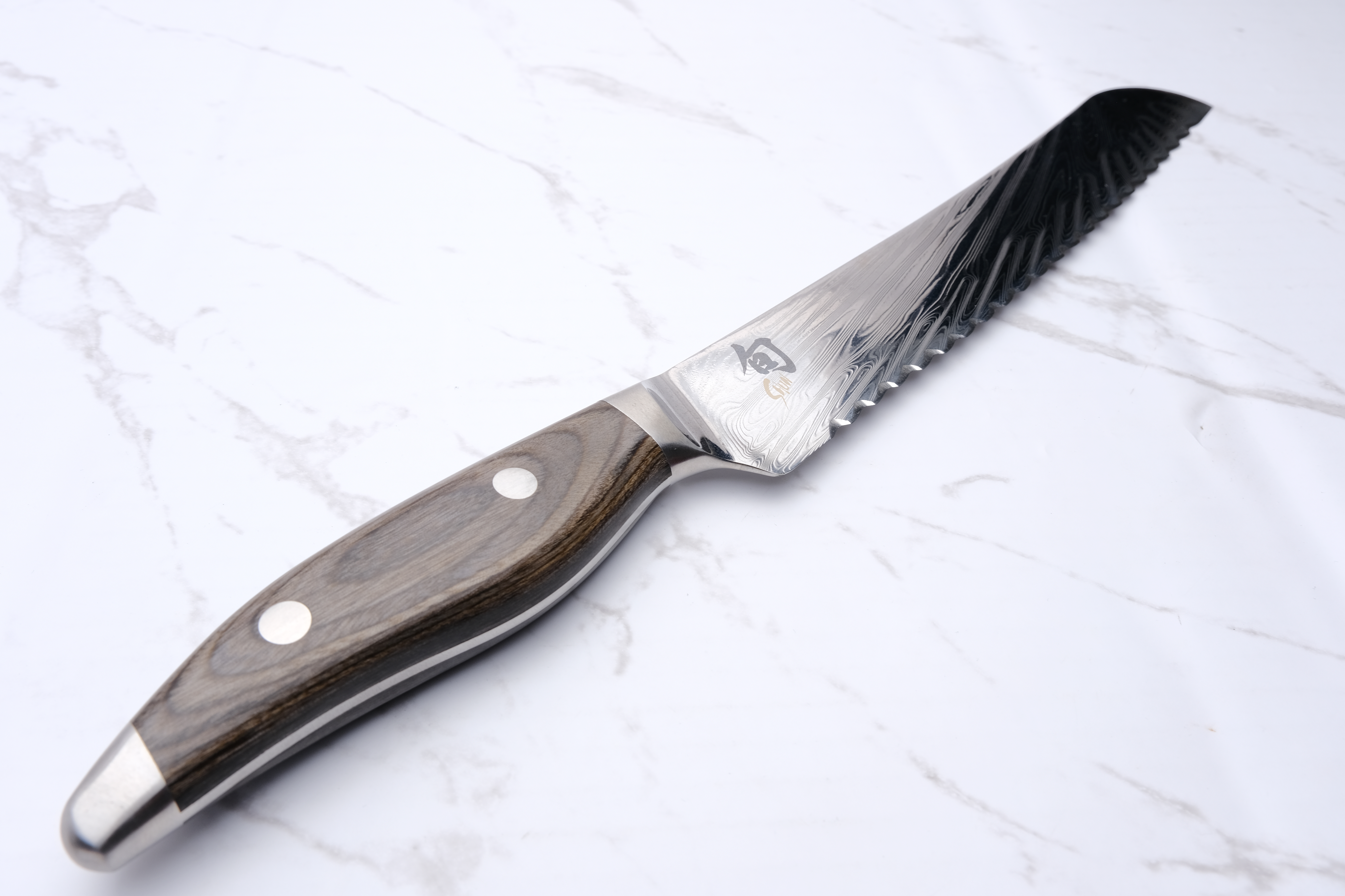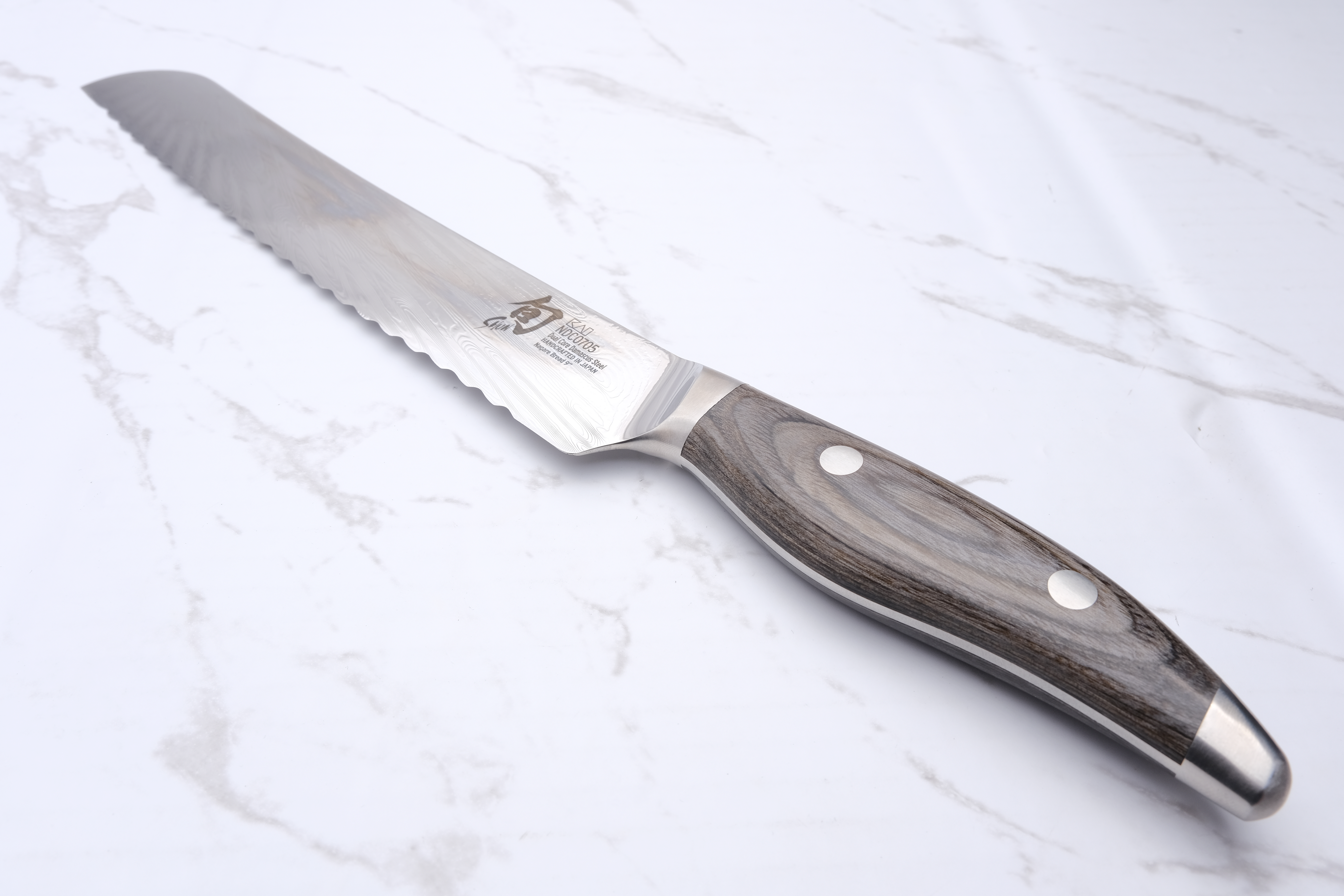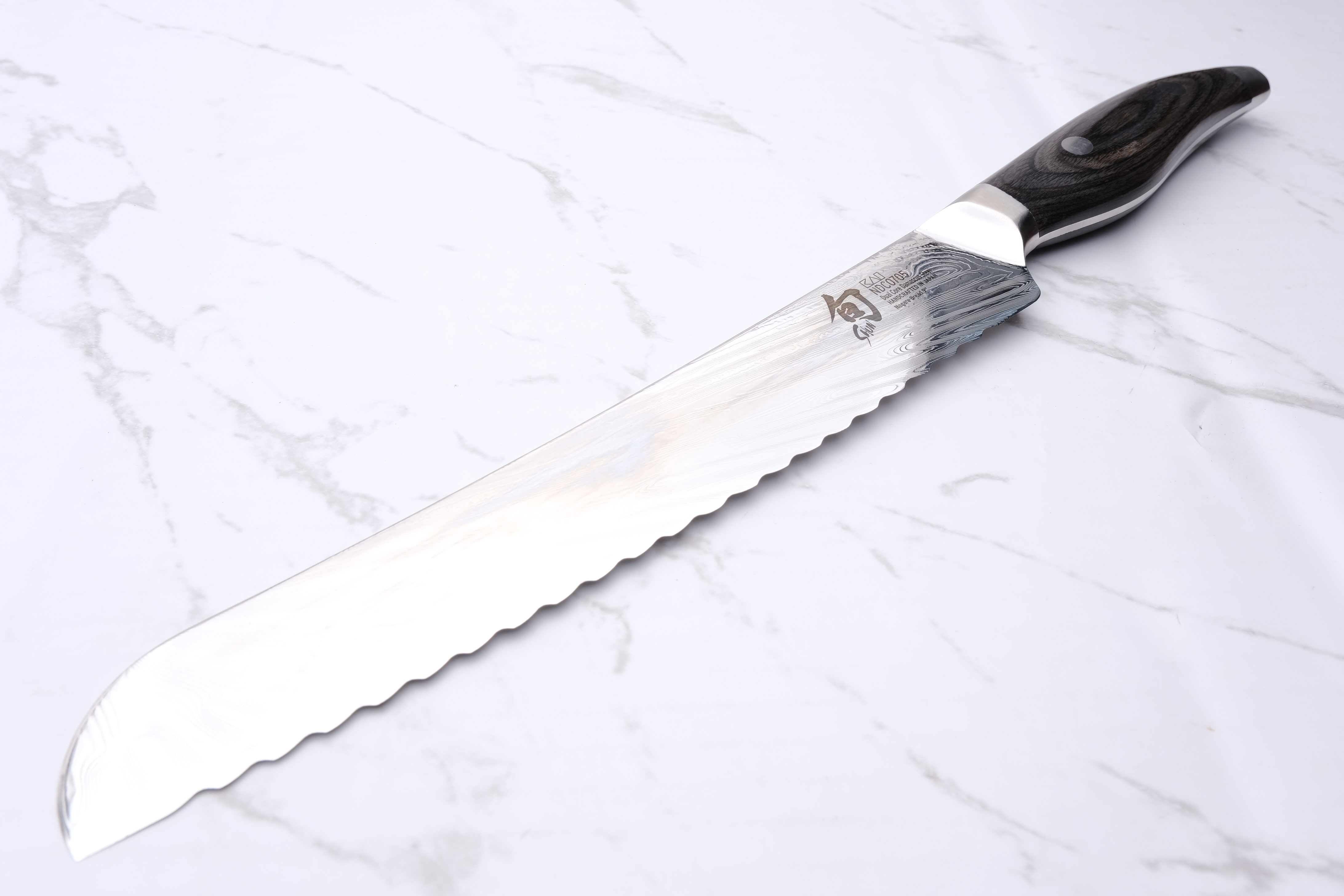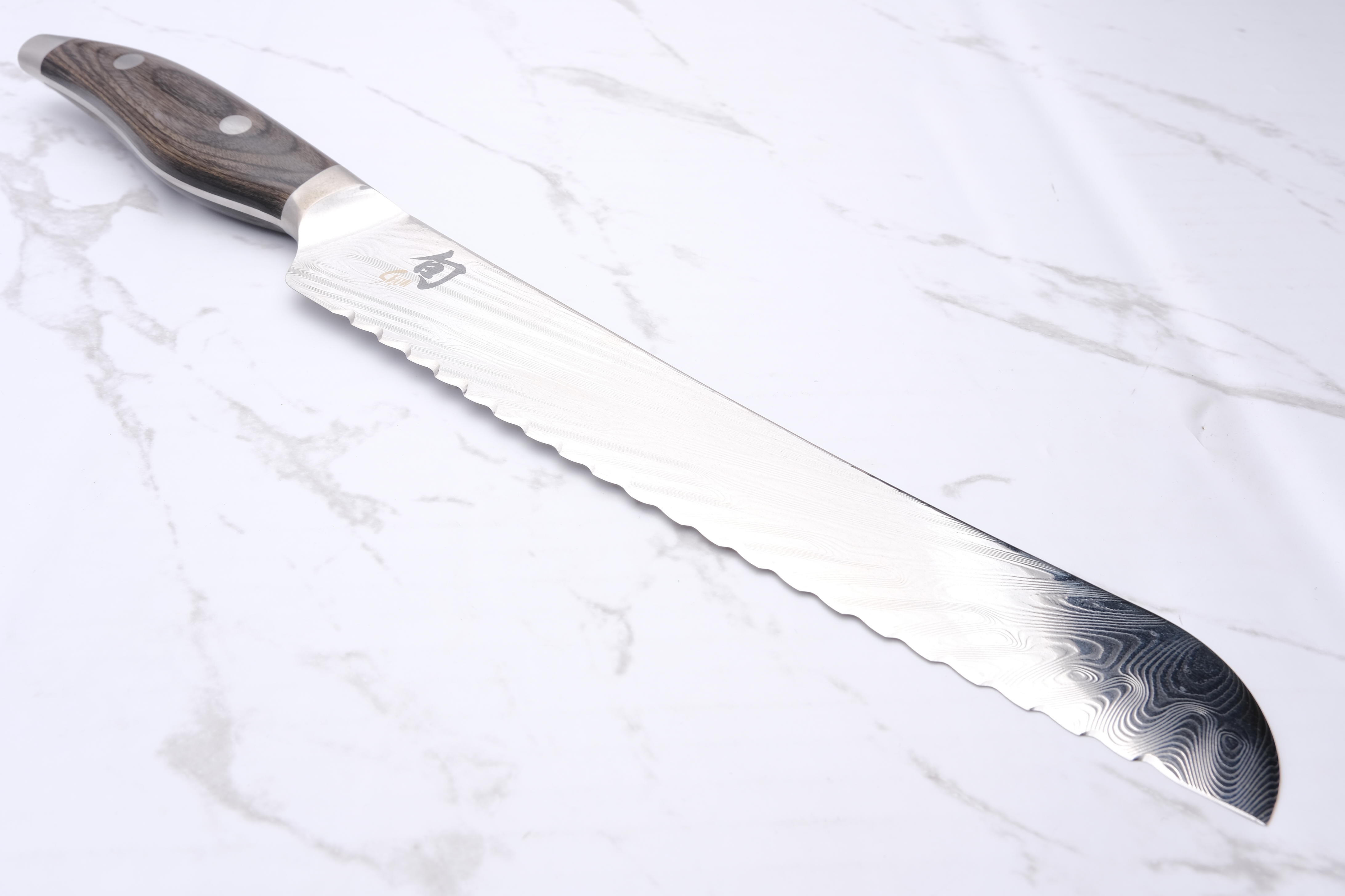 The bread knives from KAI Shun have the unique genius that the wave edge changes direction halfway along the blade. This makes the serrations more robust against "chipping" than if they were classically sharpened, and that the knife cuts both when it works forwards and backwards.