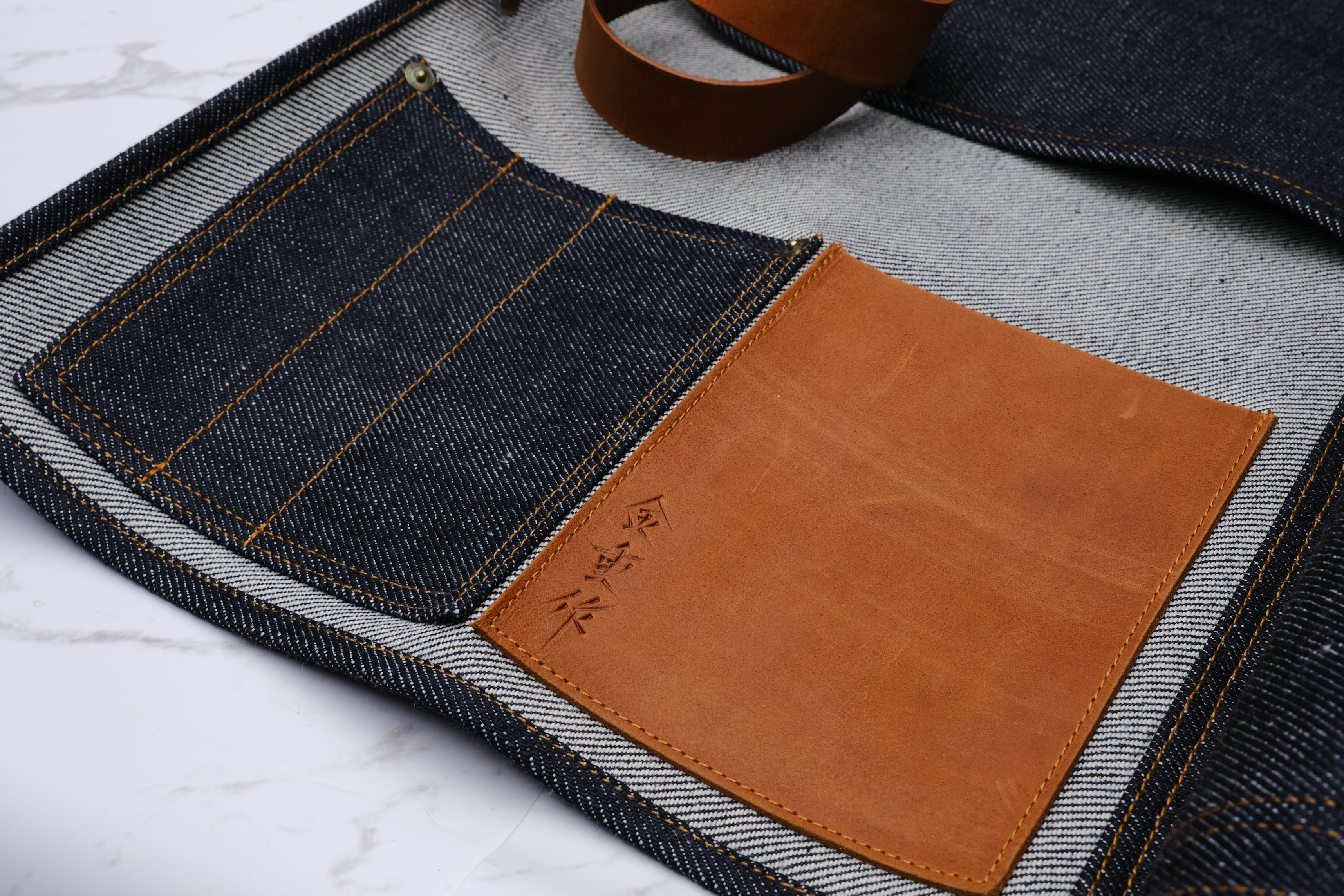 Delicious hand-sewn knife roll from Japan in selvedge denim and leather with 5 large pockets for knives and 4 smaller pockets for e.g. tweezers, spatulas, and ballpoint pens.