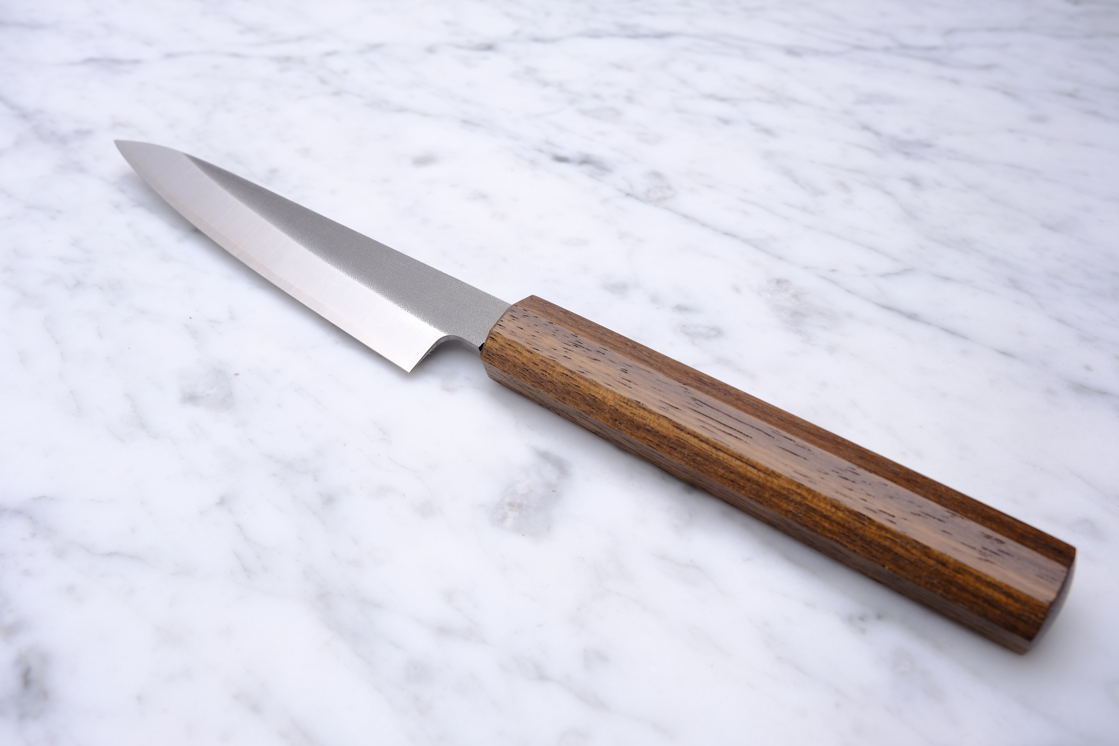 The blade is made of three layers of steel - a core of SLD, which is a high-quality semi-stainless alloy, surrounded by one layer of softer stainless steel on each side. It is a relatively thin blade that has absolutely fantastic cutting properties - meaning that it feels very effortless to cut through items such as onions and carrots, and that you get a very neat cut.