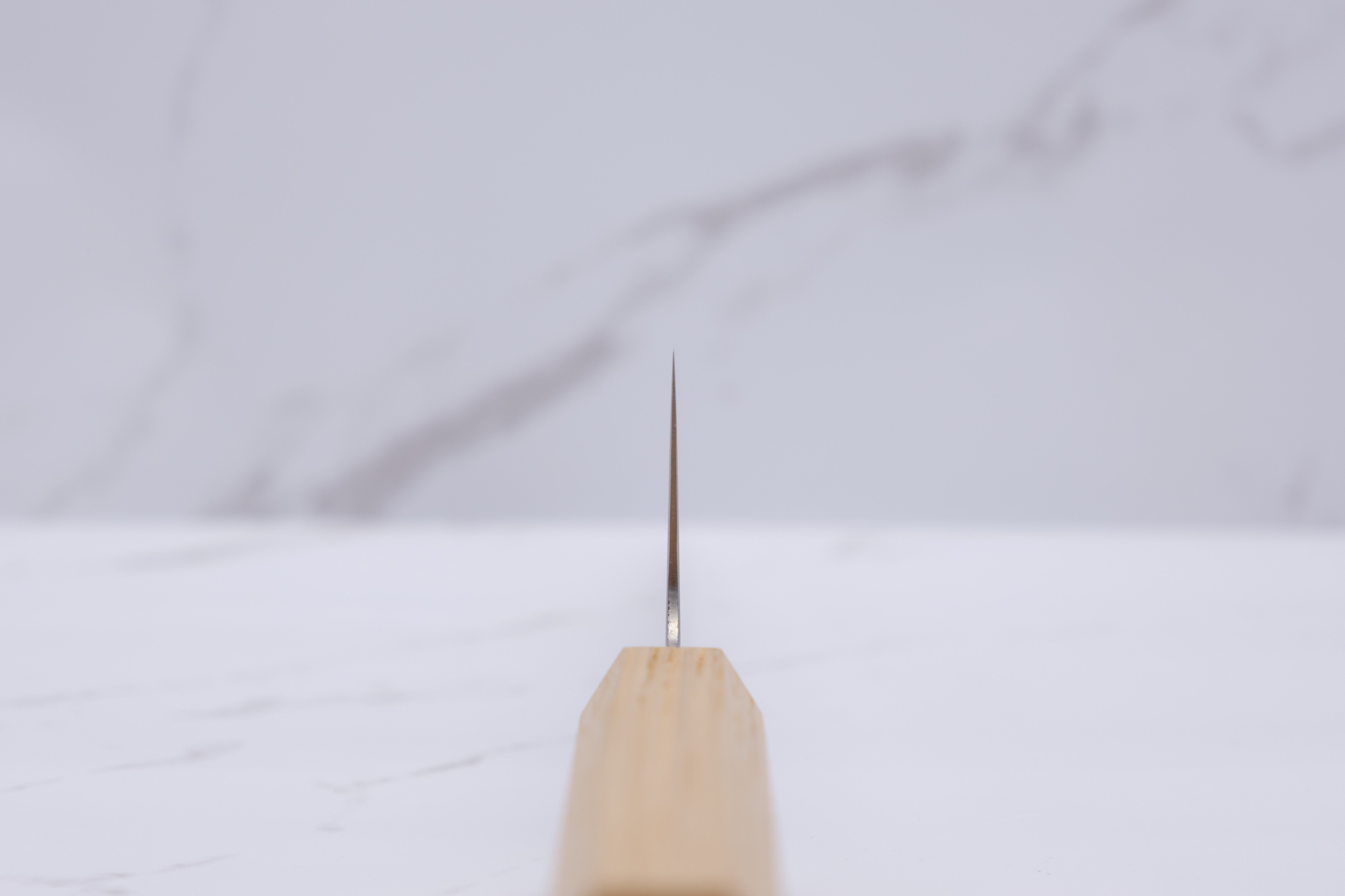 One aspect of knife forging that Konosuke masters particularly well is the ability to make the blades wedge-shaped all the way from the heel to the tip. This makes the blade very thin, which combined with the sharpness makes the knife slide easily when cutting.