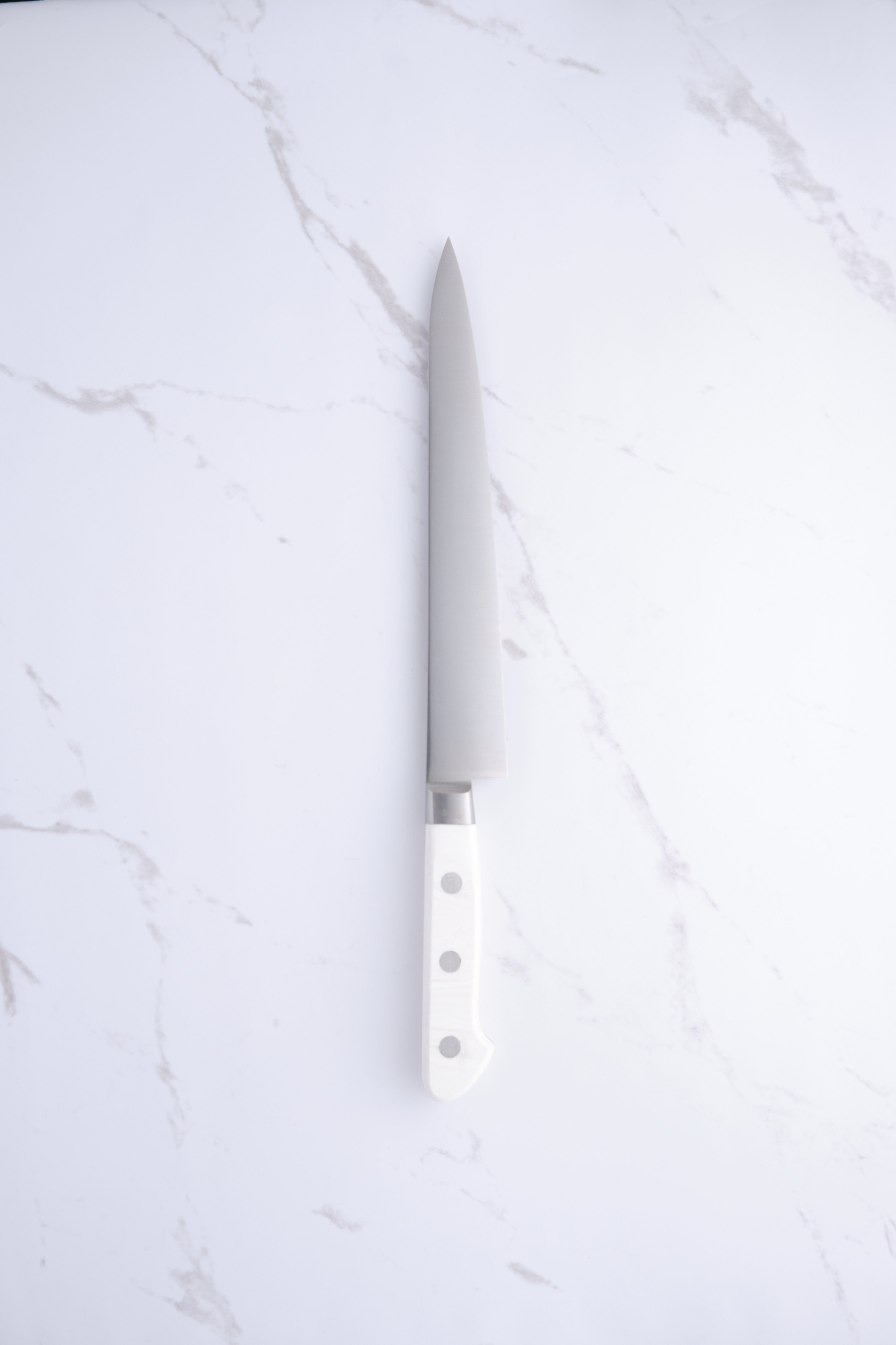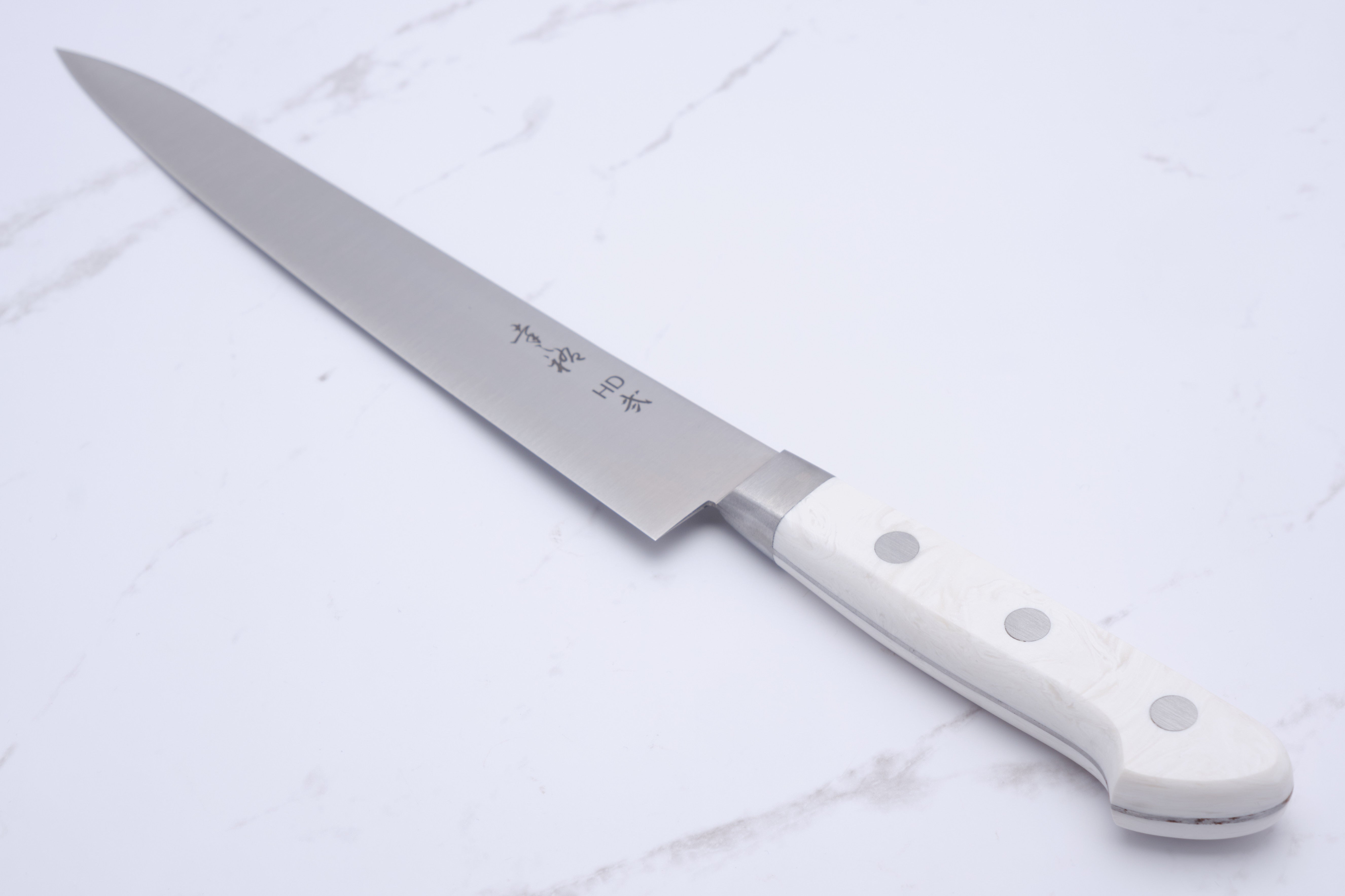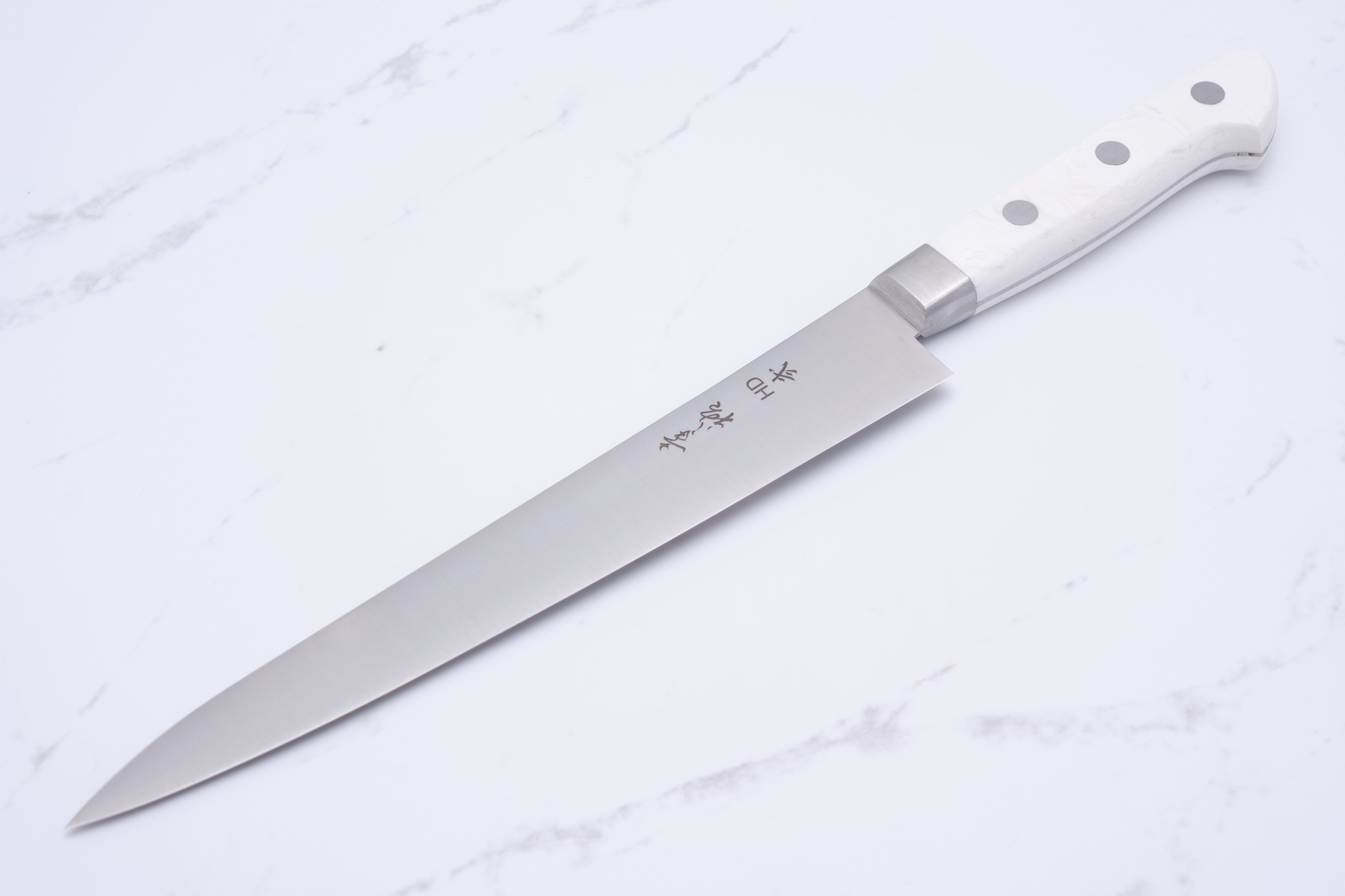 From Konosuke in Sakai, we have here something of a rarity: an HD2 Sujihiki with western-style handle in white corian.