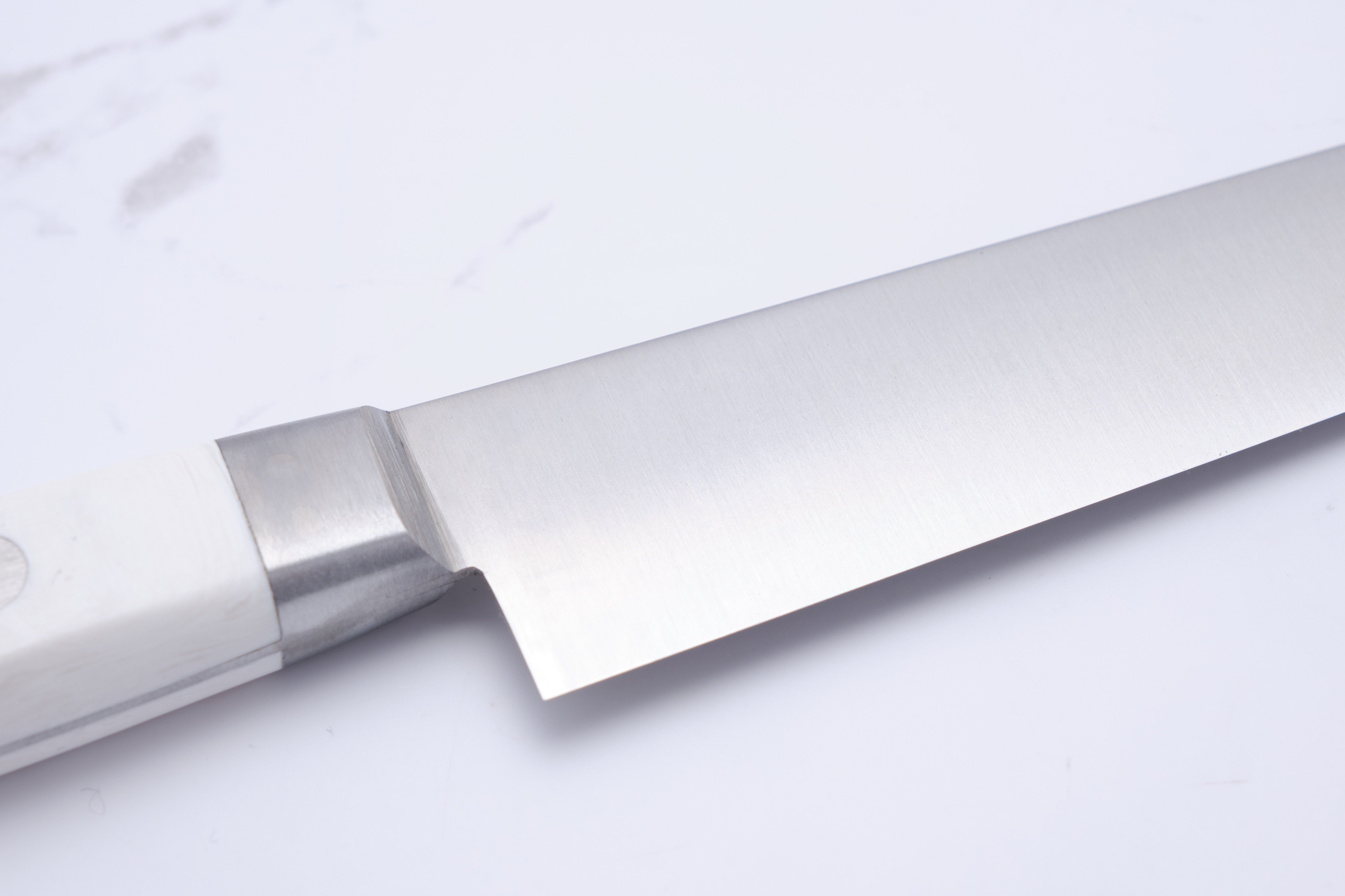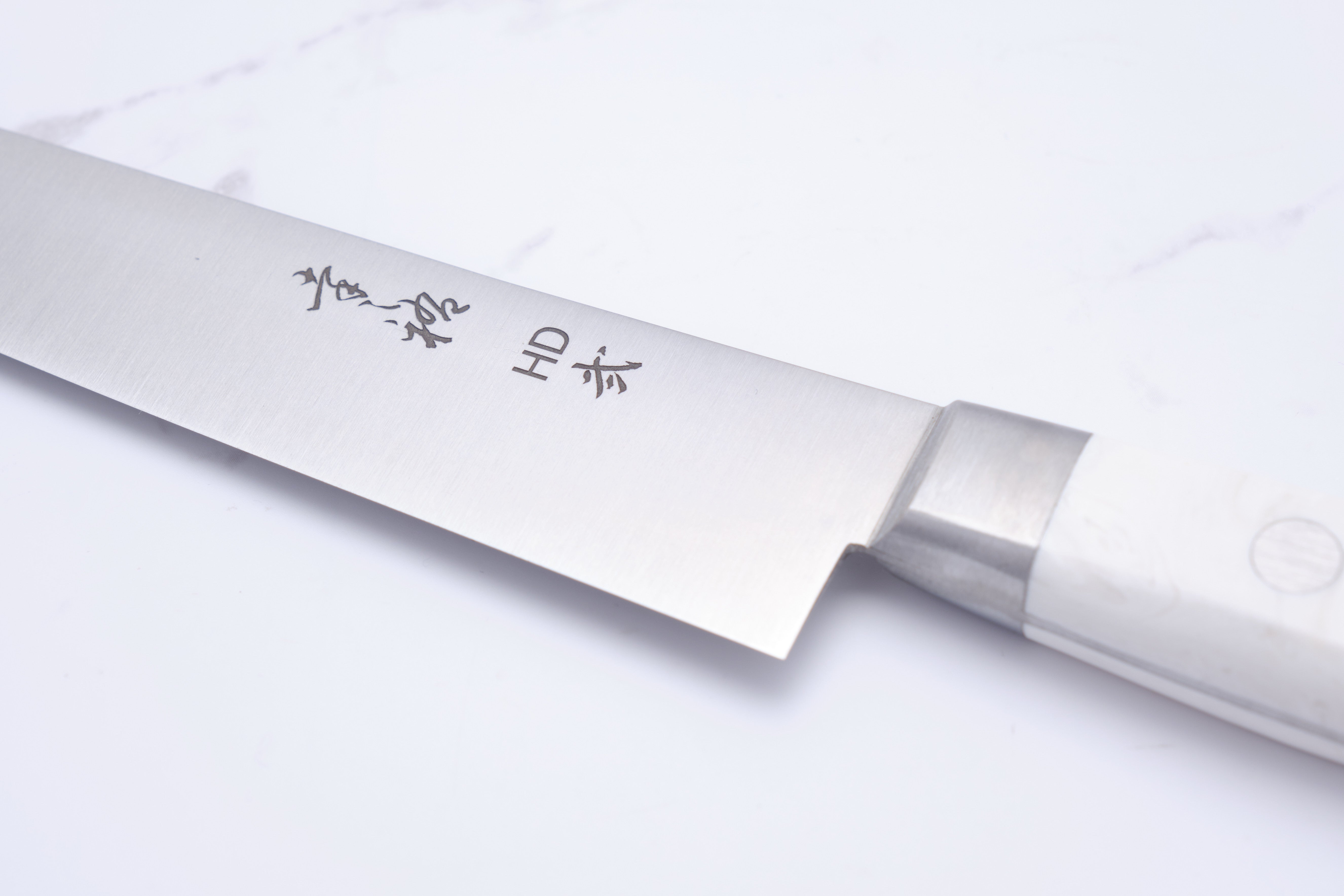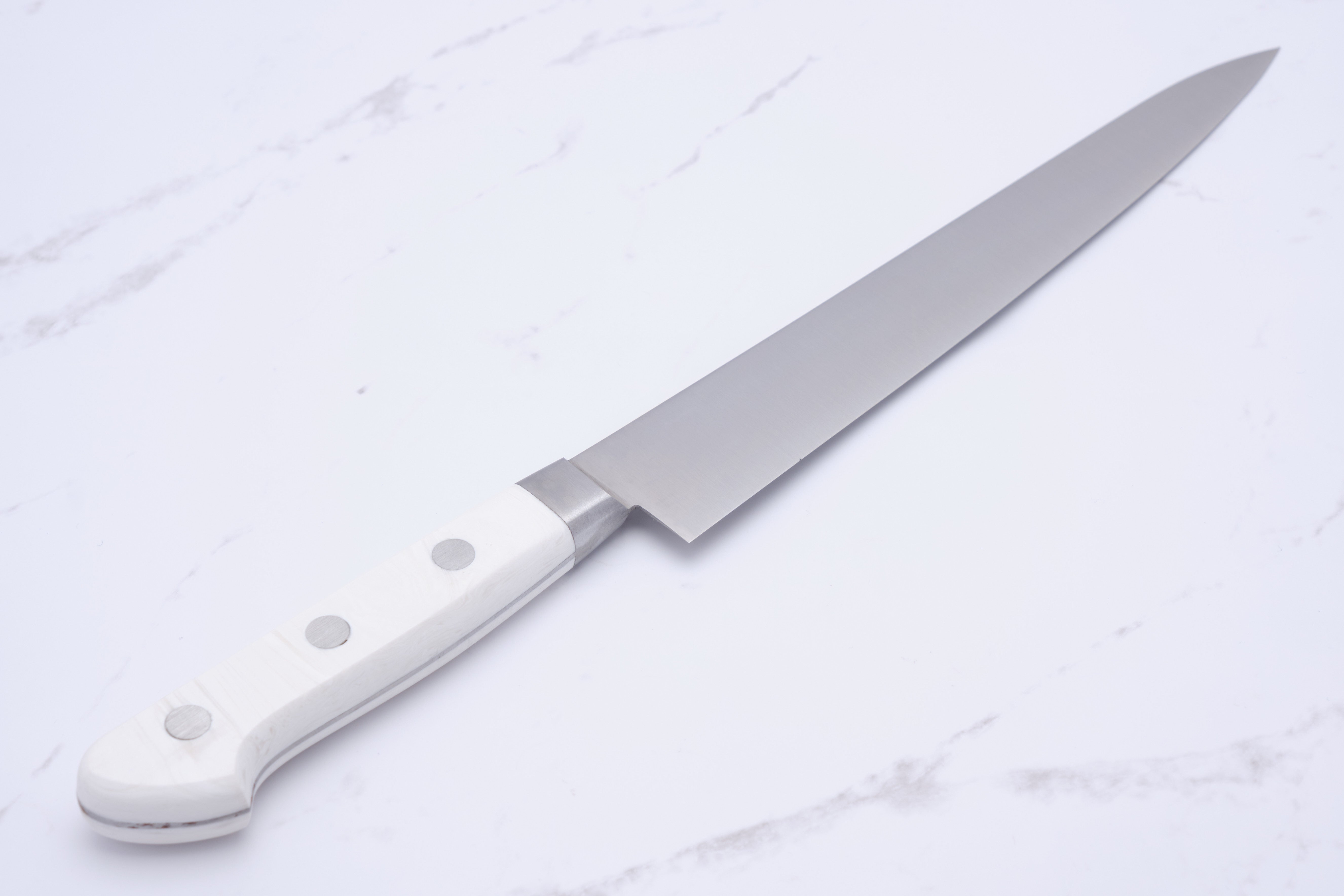 From Konosuke in Sakai, we have here something of a rarity: an HD2 Sujihiki with western-style handle in white corian.
