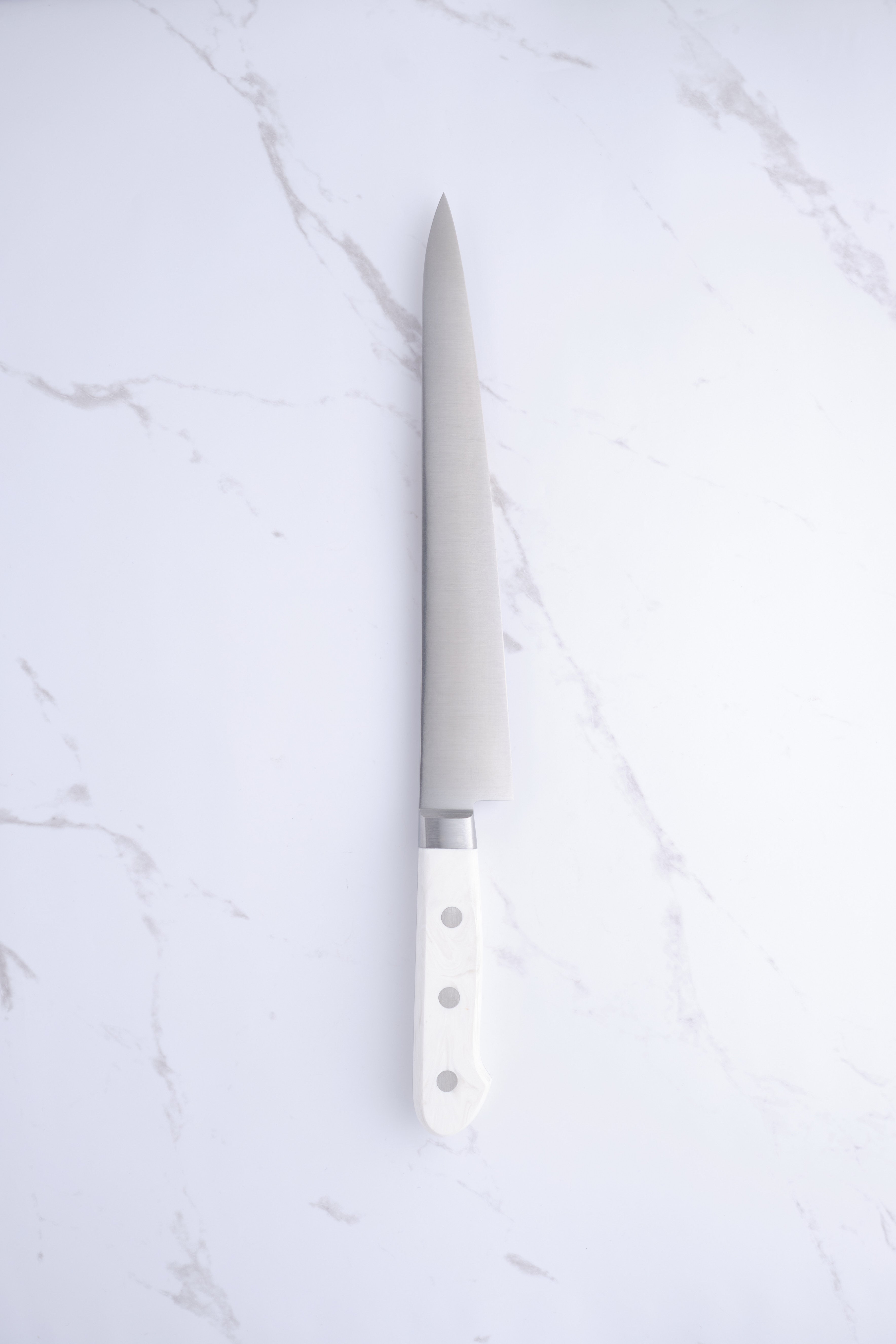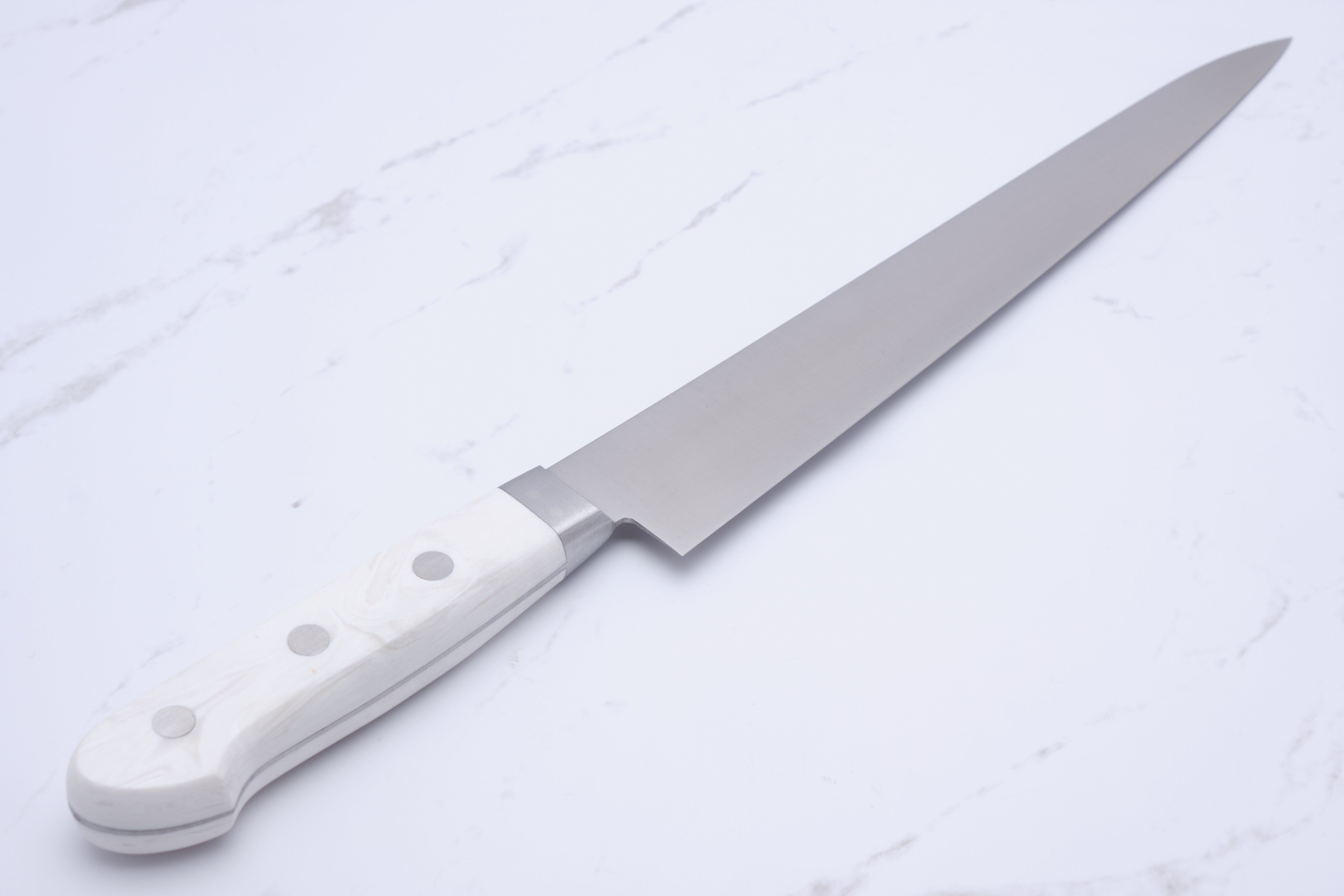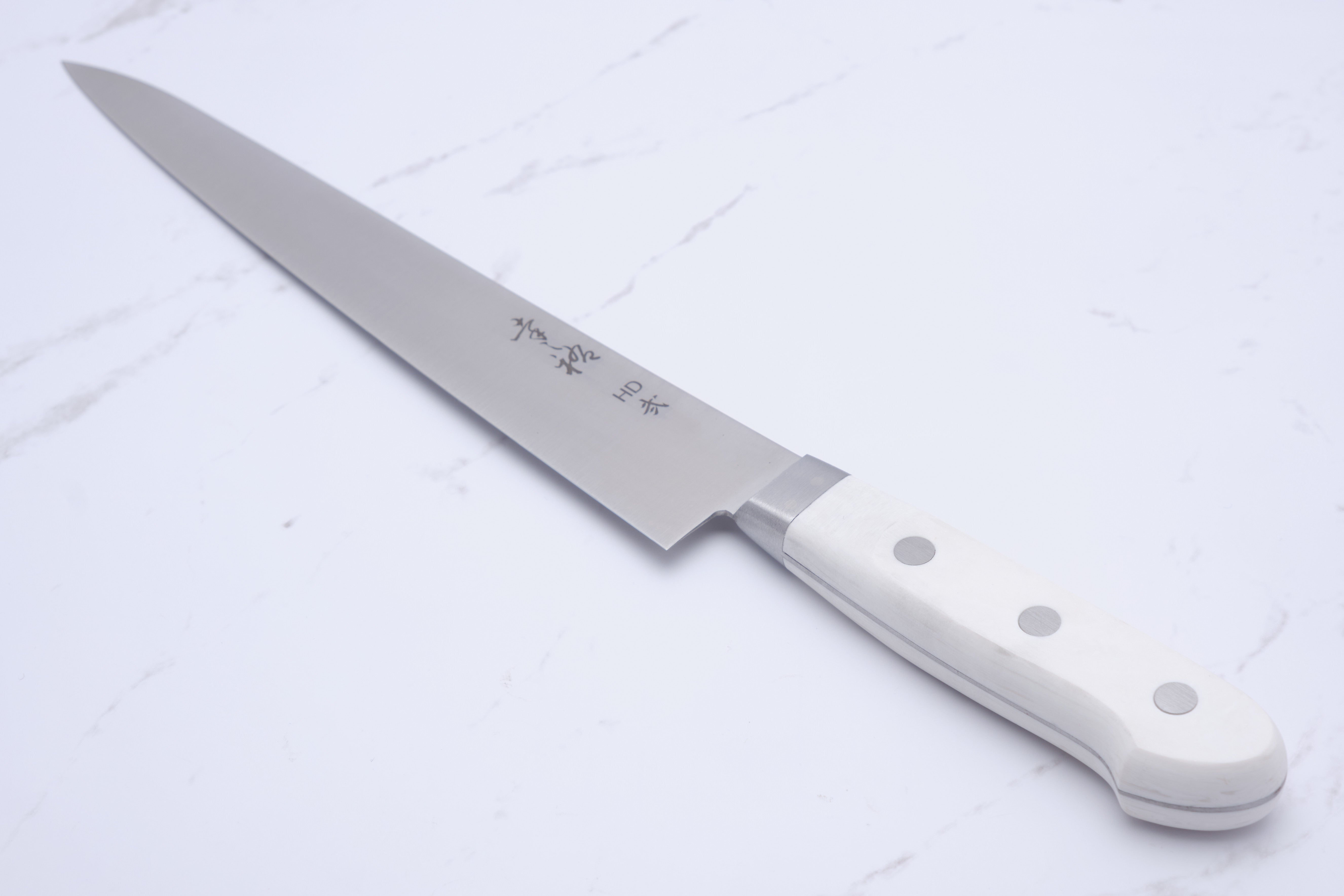 From Konosuke in Sakai, we have here something of a rarity: an HD2 Sujihiki with western-style handle in white corian.