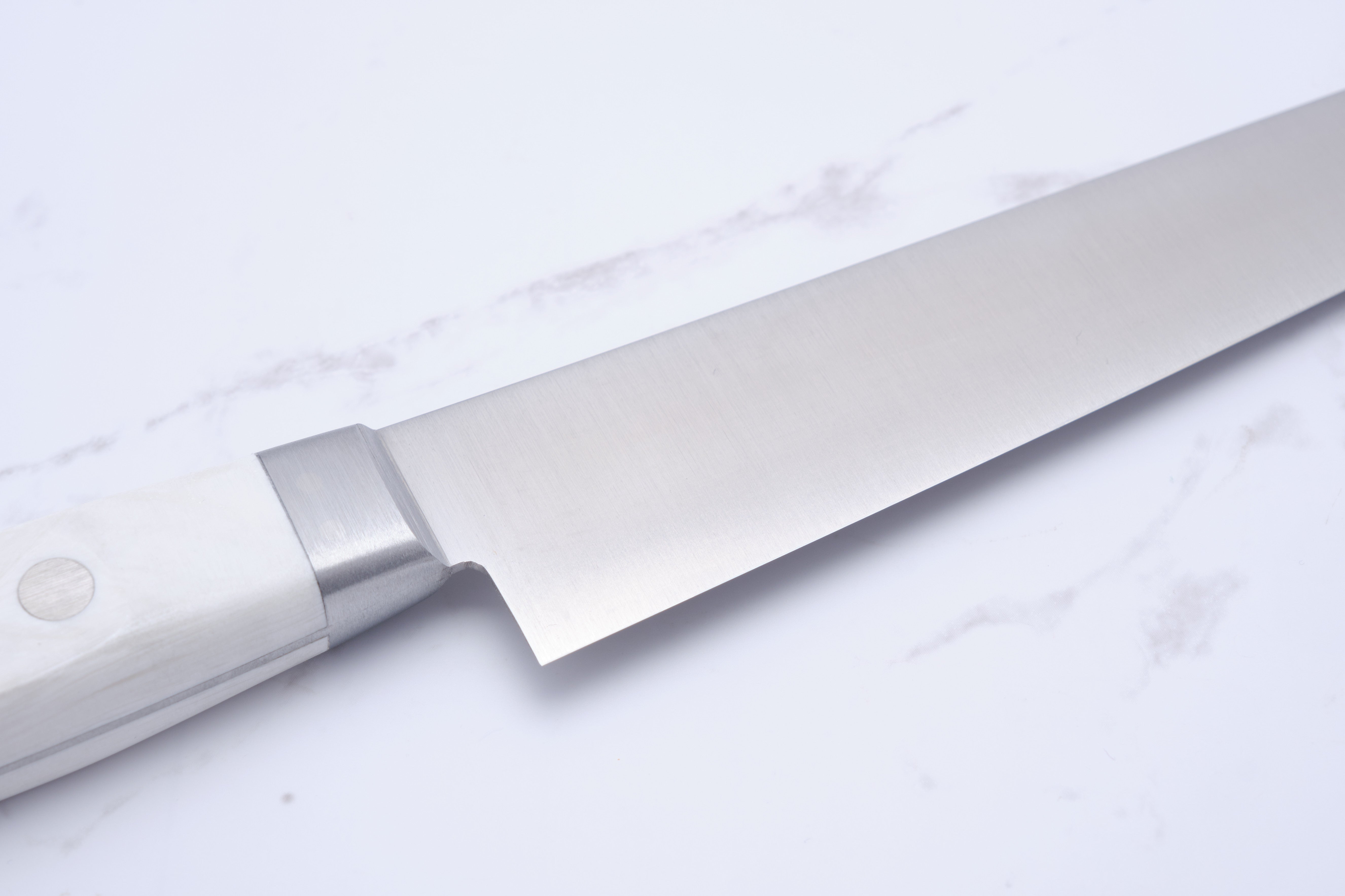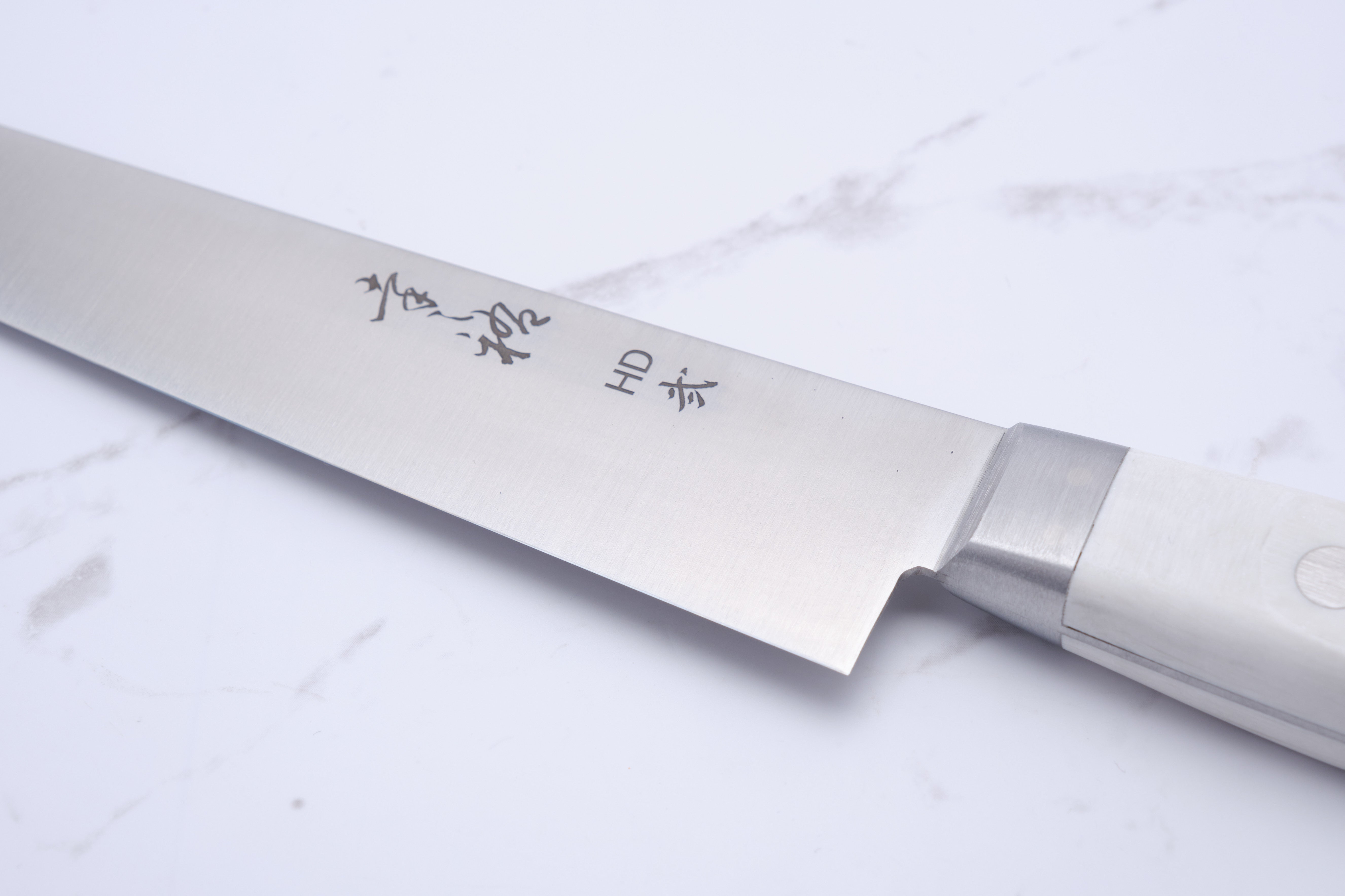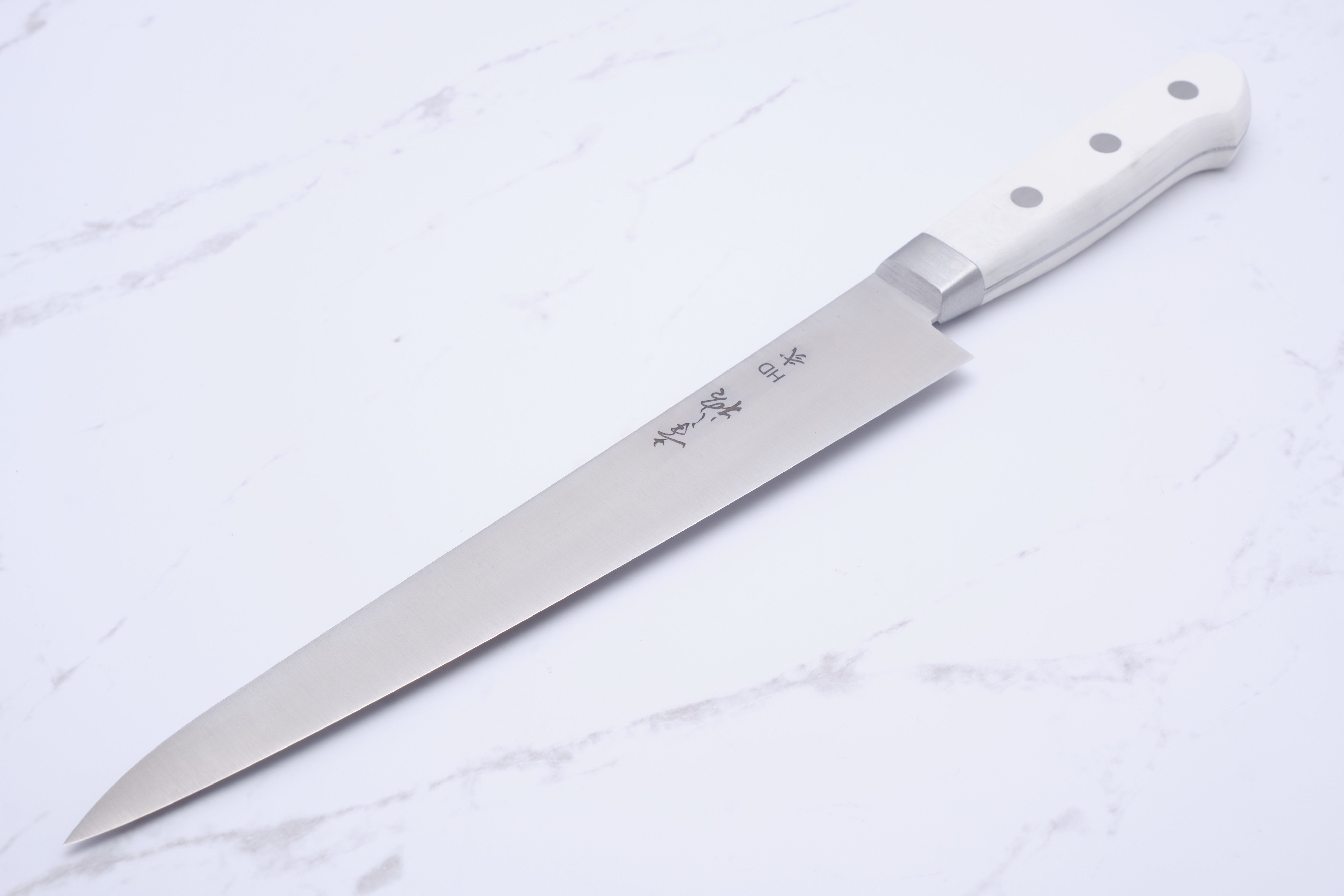 From Konosuke in Sakai, we have here something of a rarity: an HD2 Sujihiki with western-style handle in white corian.
