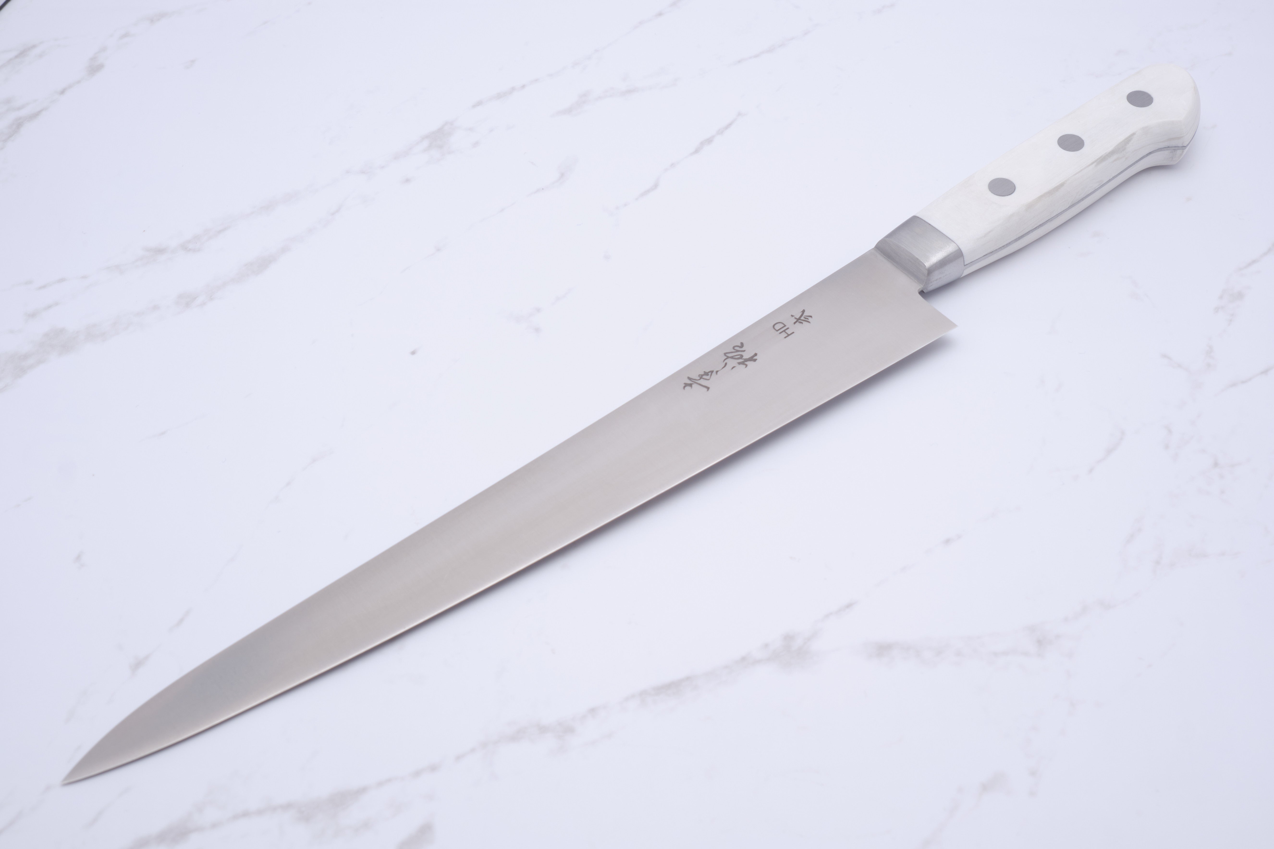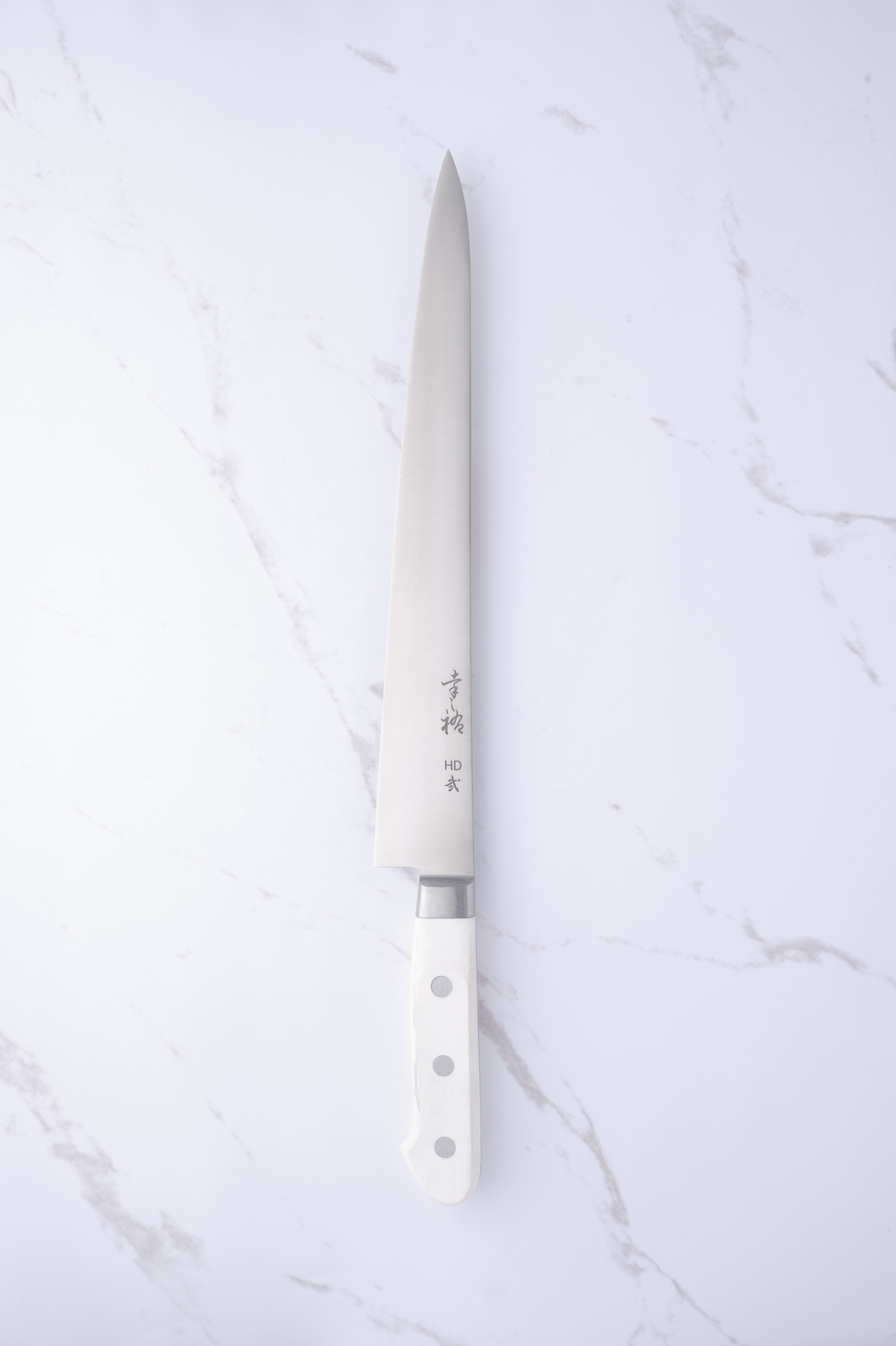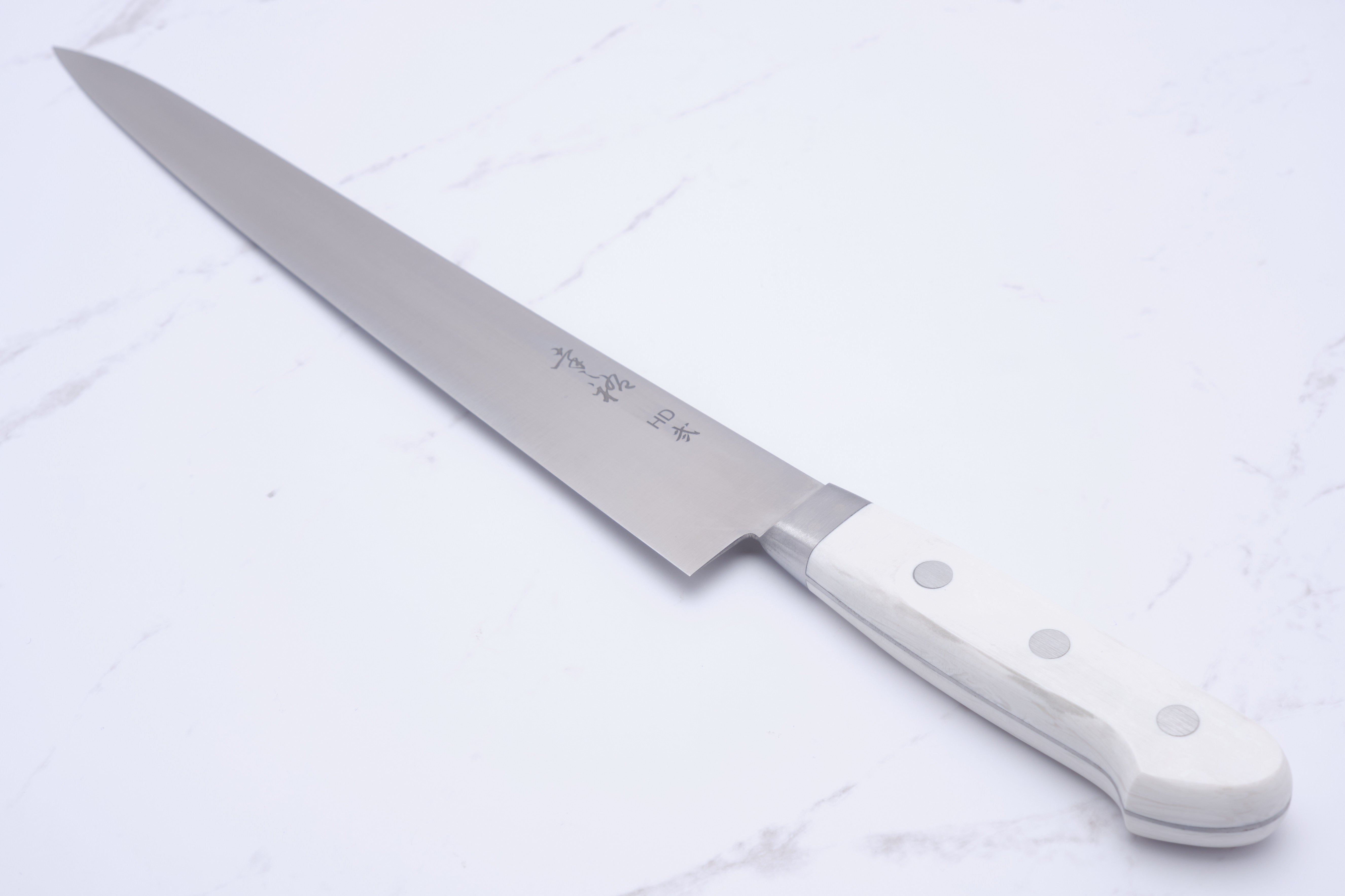 From Konosuke in Sakai, we have here something of a rarity: an HD2 Sujihiki with western-style handle in white corian.