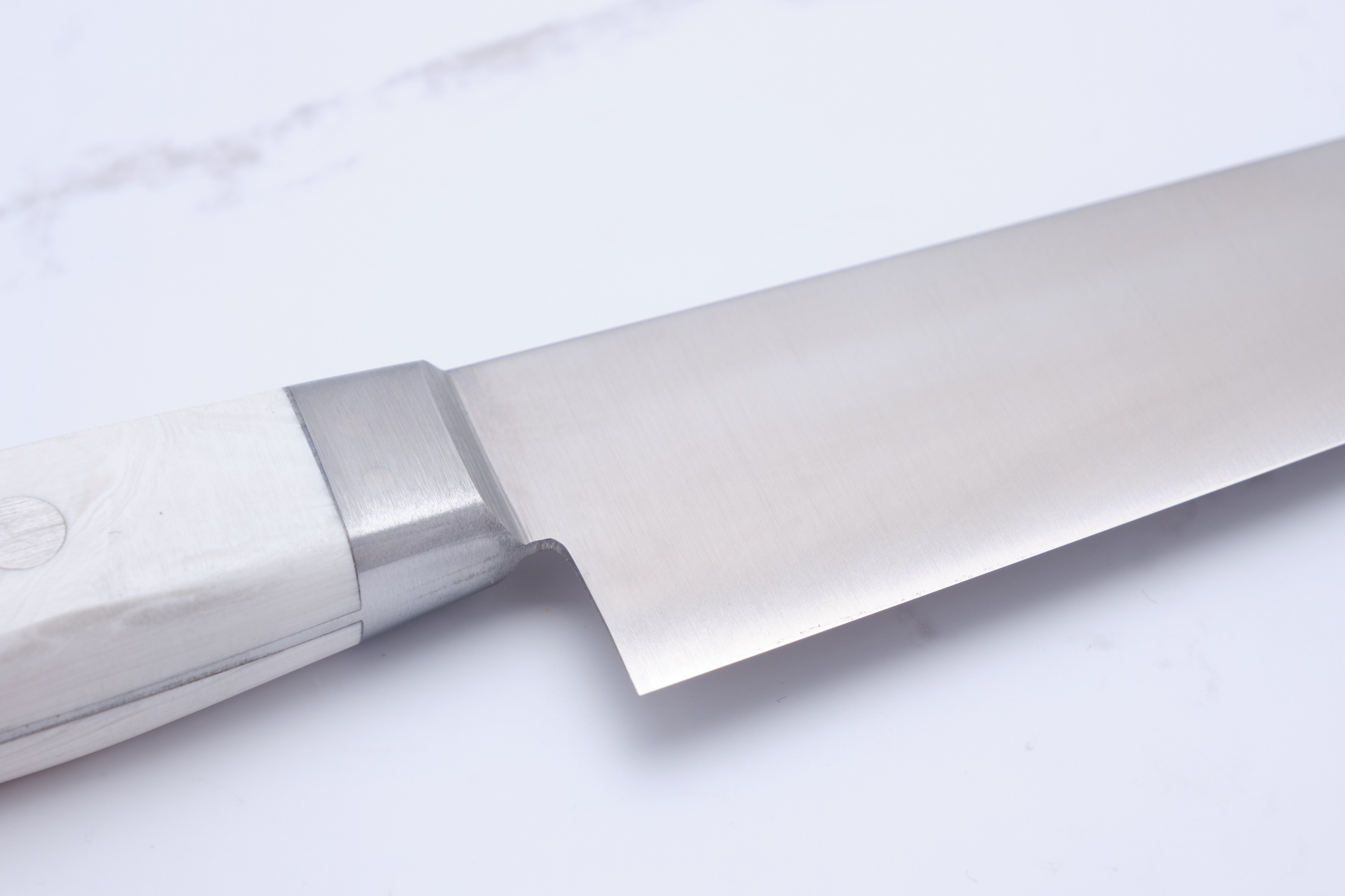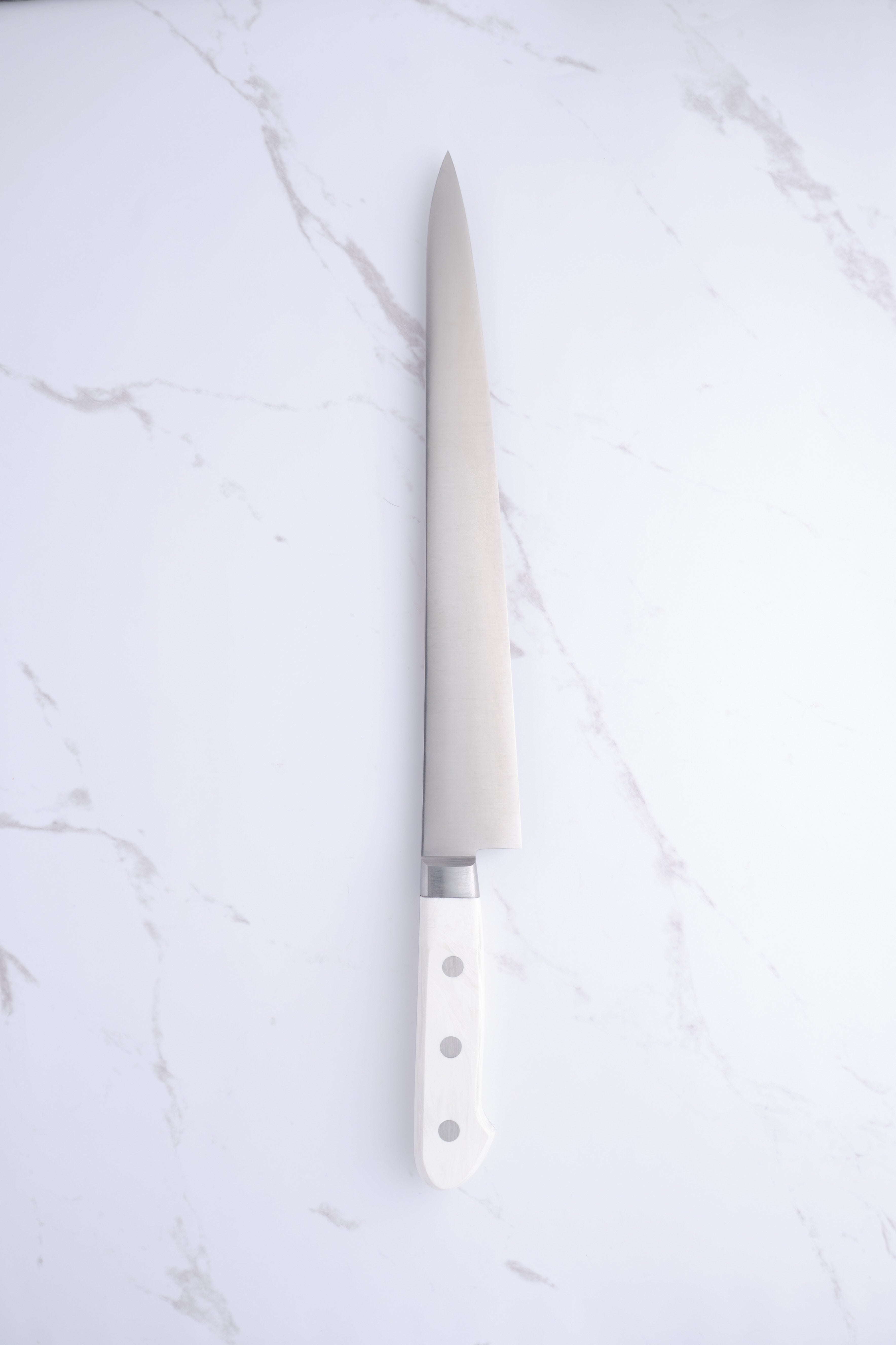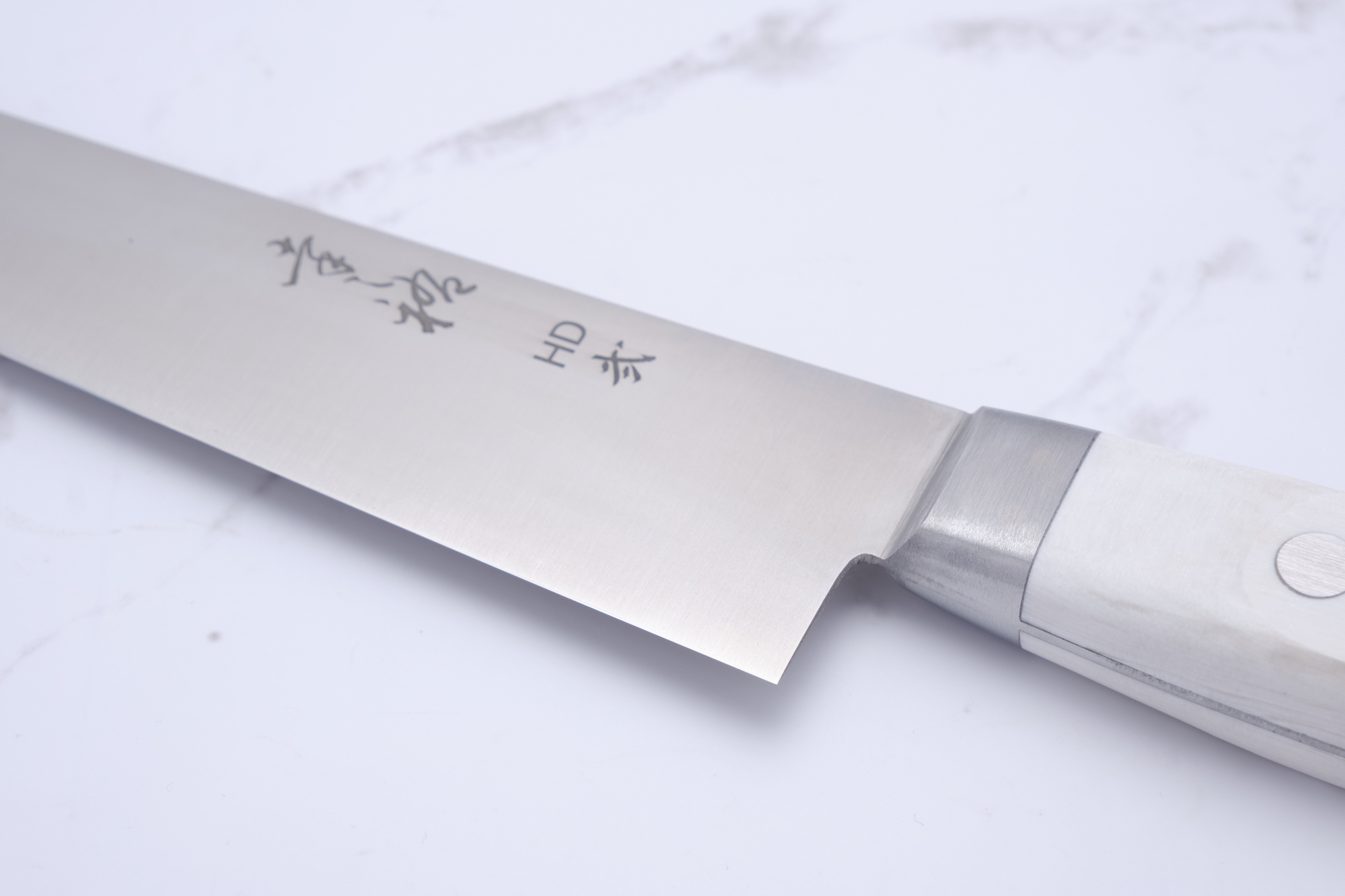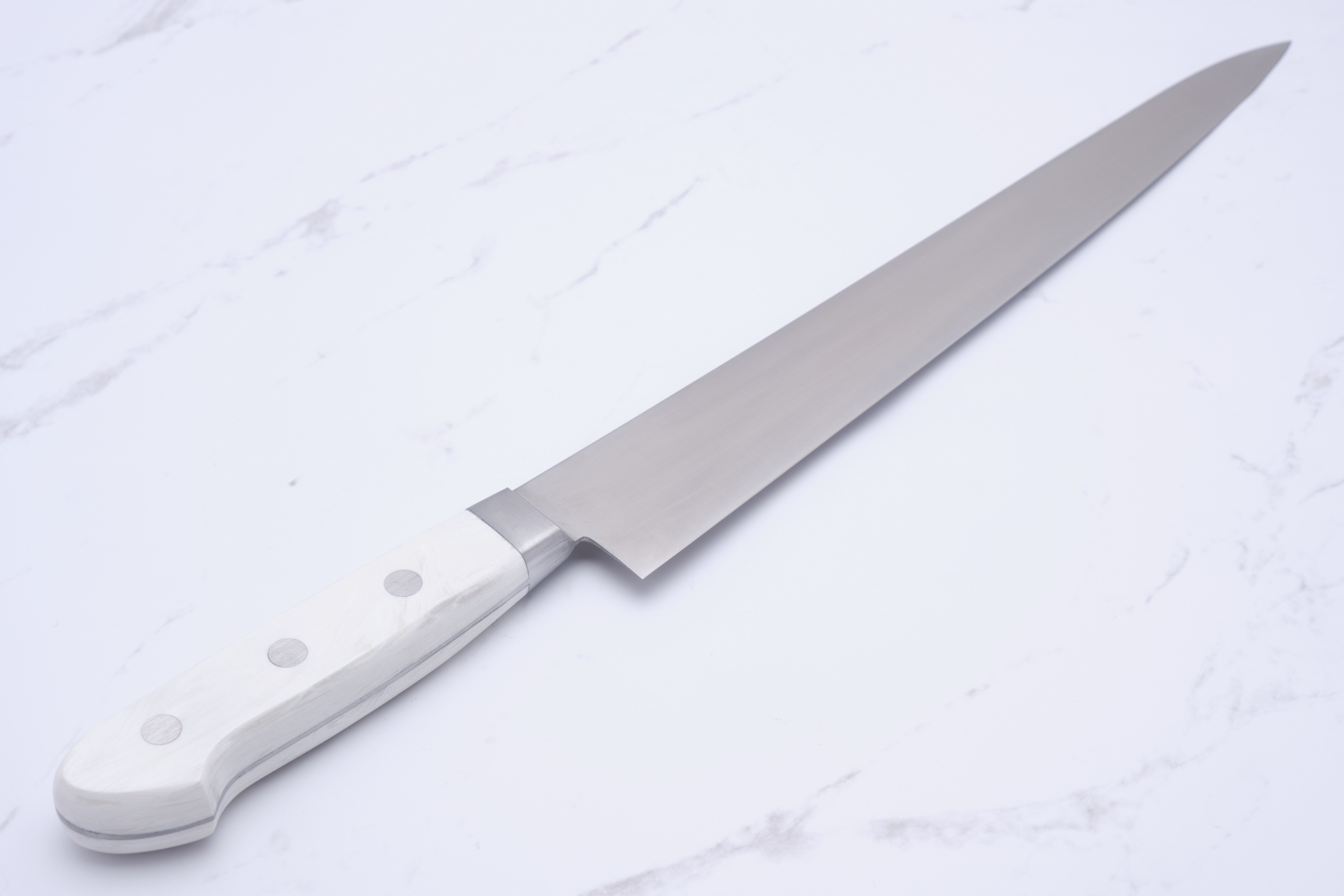 From Konosuke in Sakai, we have here something of a rarity: an HD2 Sujihiki with western-style handle in white corian.