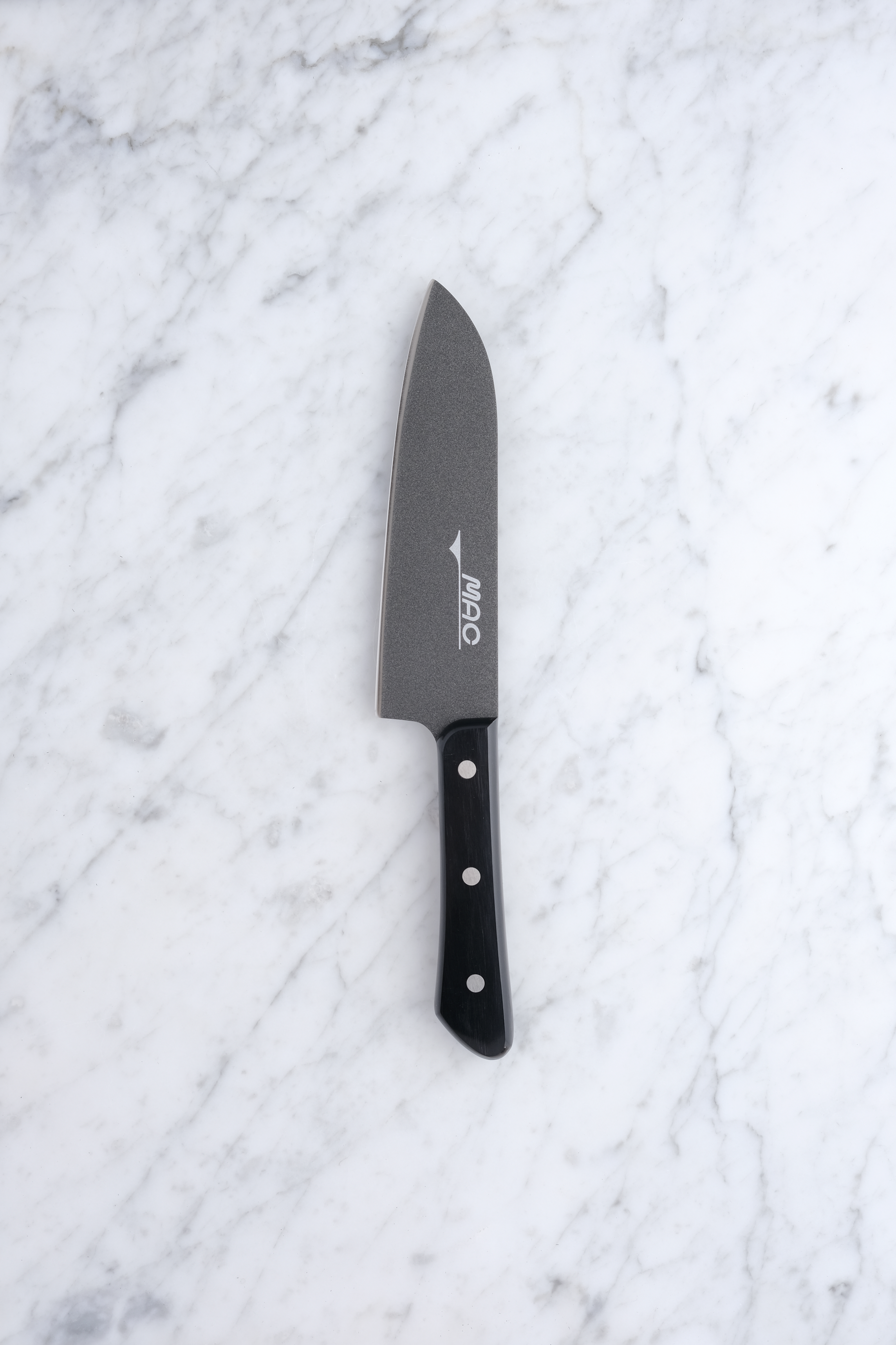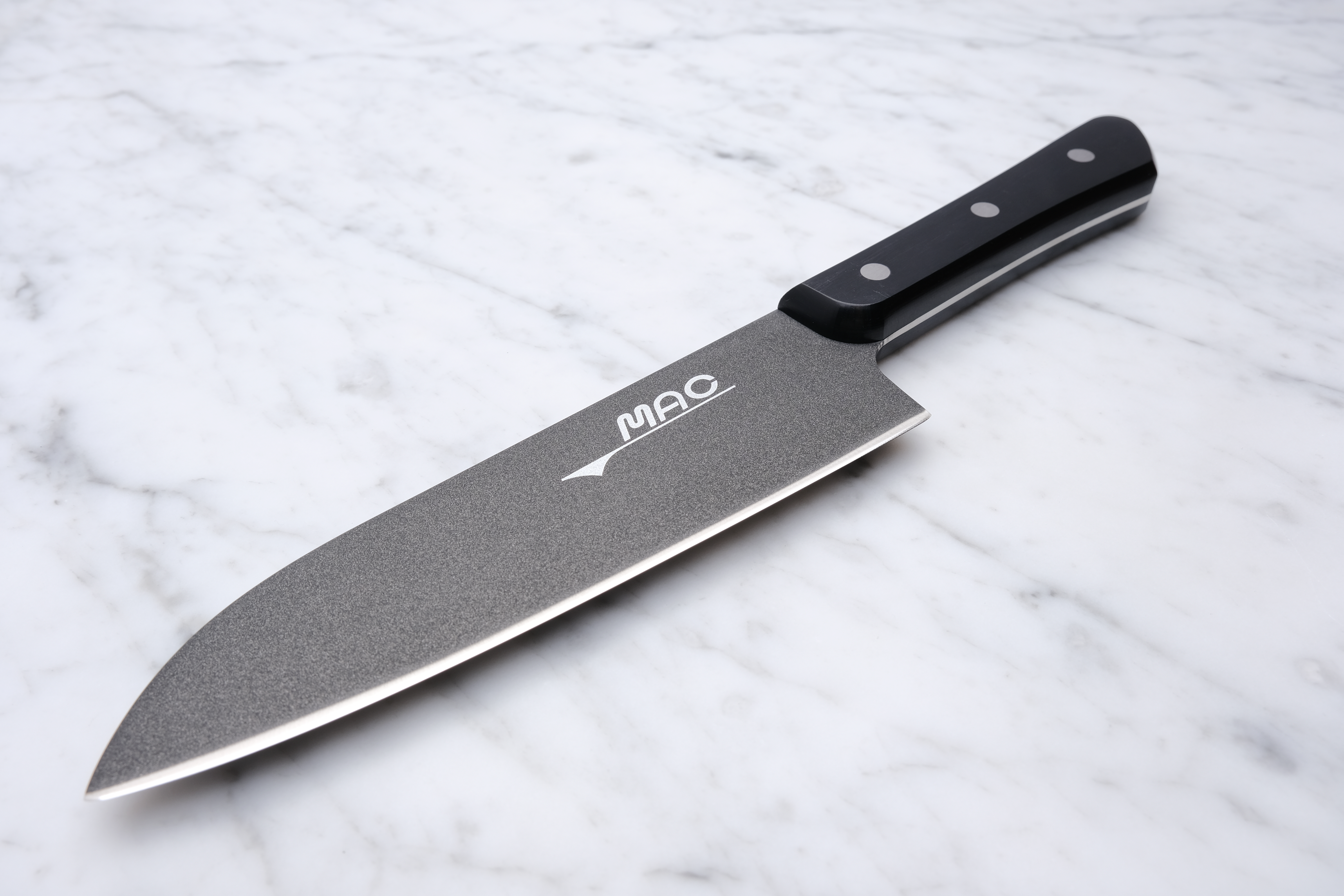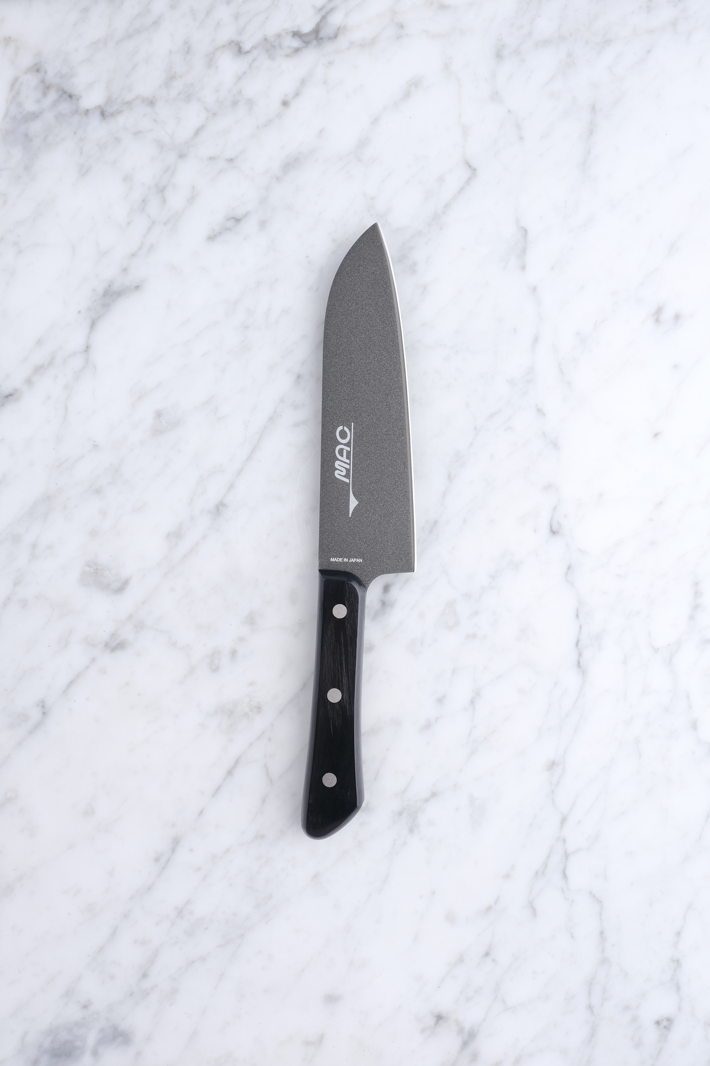 Super good knife series from Japanese MAC. They started making this series for sushi chefs because the rice stuck to the blade and the Teflon coating could help. Since then, a whole series has been made, as it helps with most tasks in the kitchen. The Santoku is a super good knife for virtually all tasks, and is the Japanese version of the classic chef's knife.