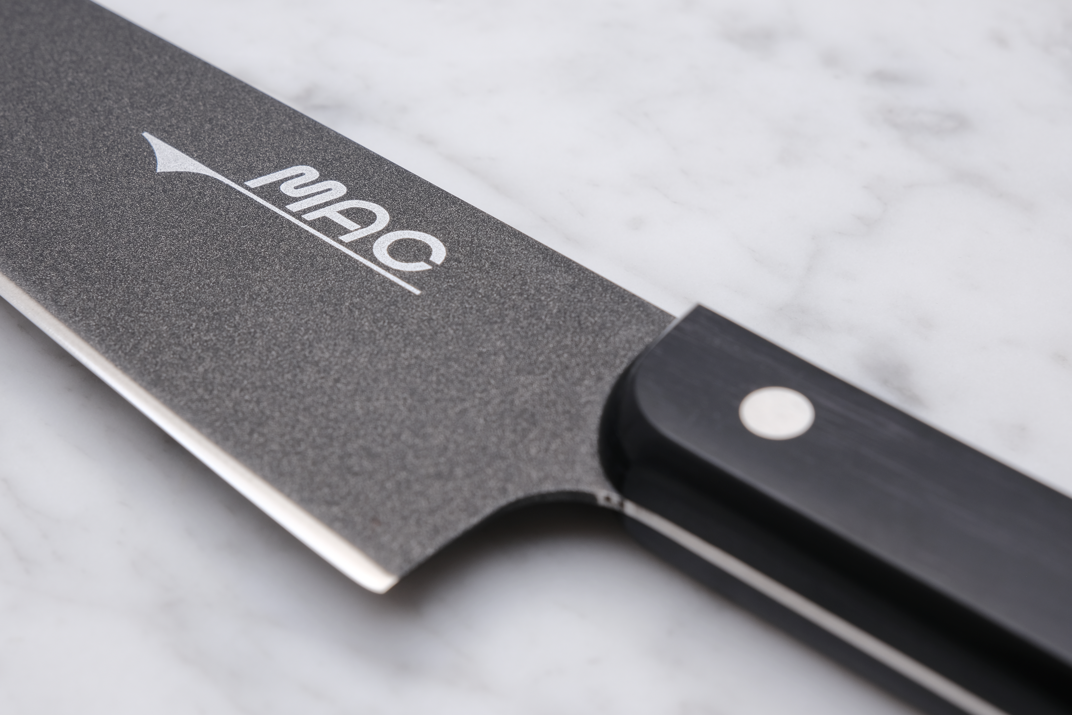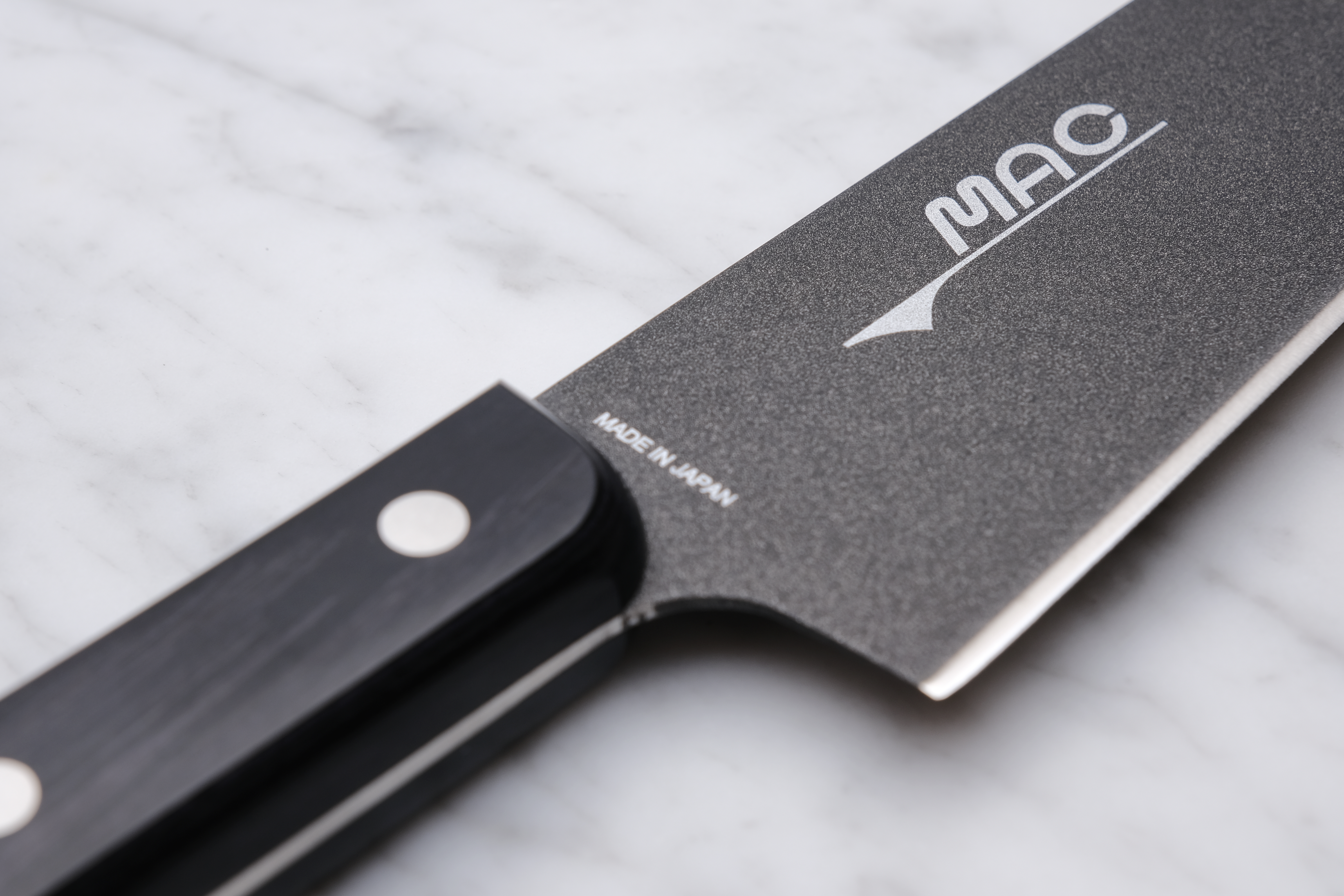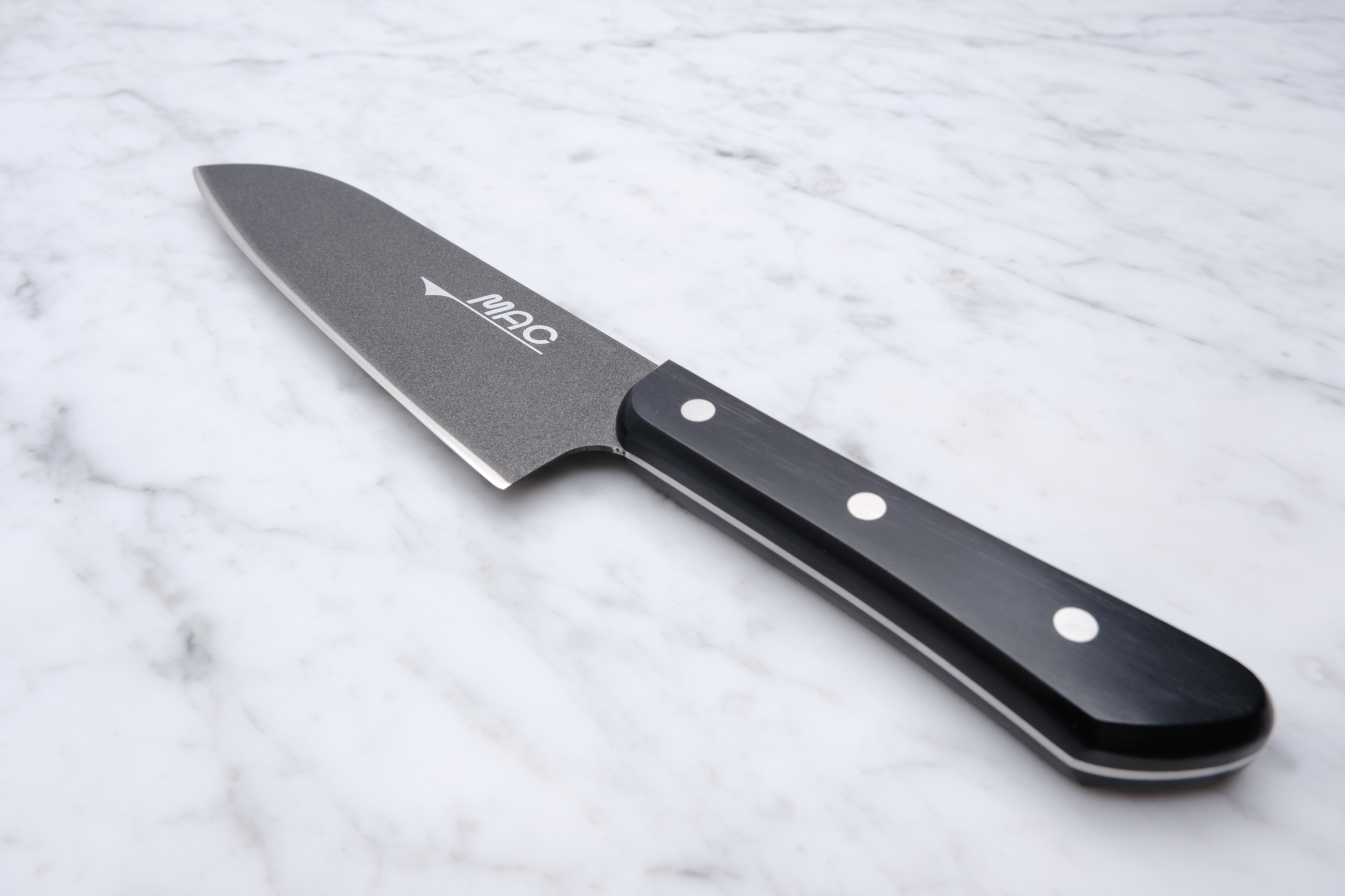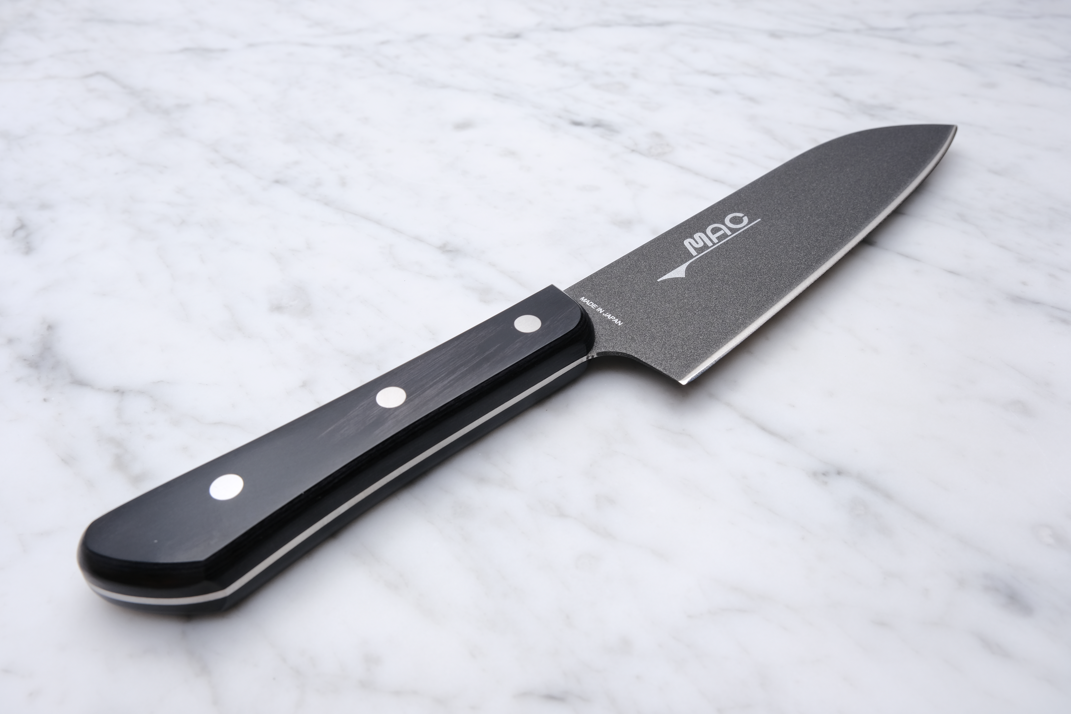 Super good knife series from Japanese MAC. They started making this series for sushi chefs because the rice stuck to the blade and the Teflon coating could help. Since then, a whole series has been made, as it helps with most tasks in the kitchen. The Santoku is a super good knife for virtually all tasks, and is the Japanese version of the classic chef's knife.
