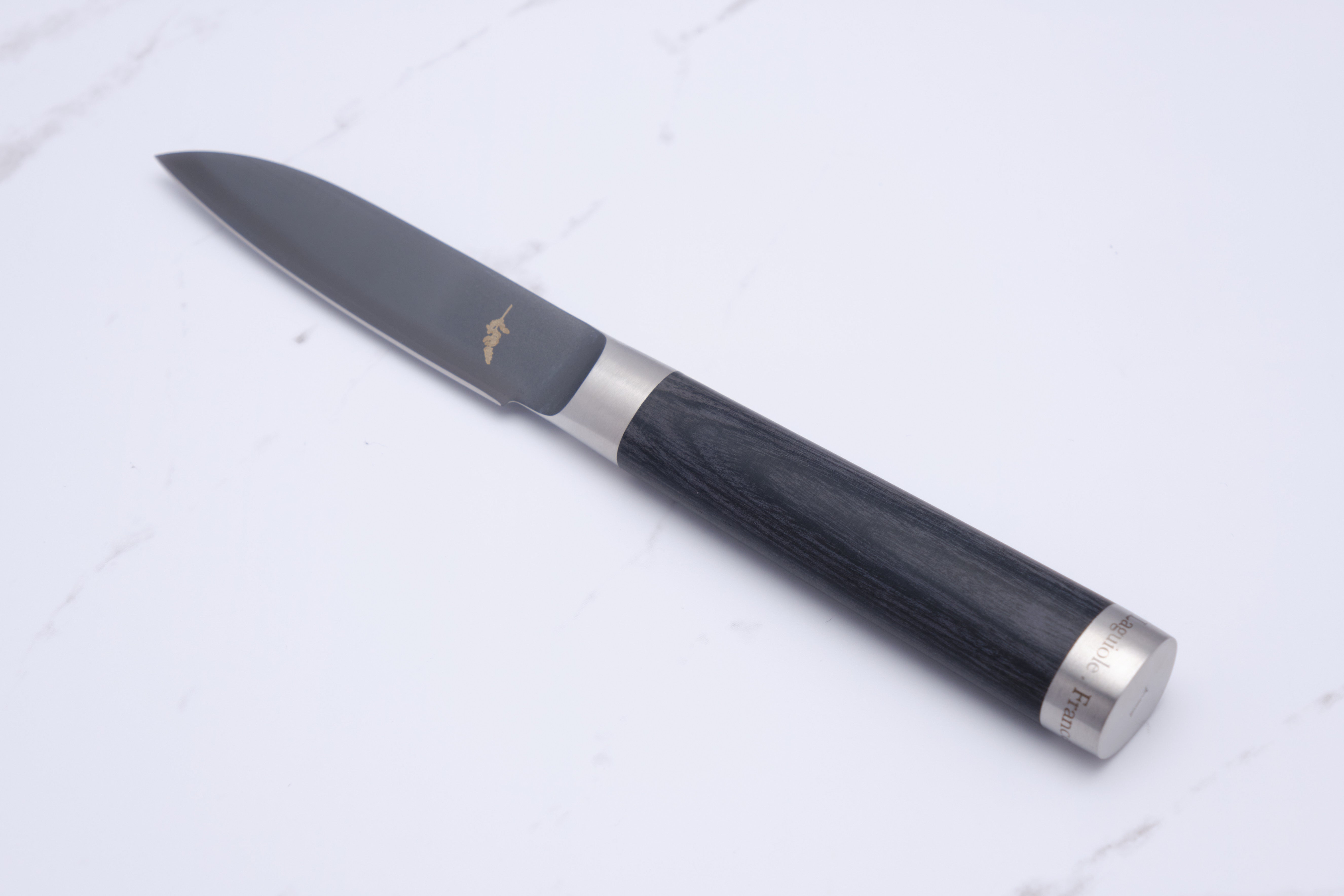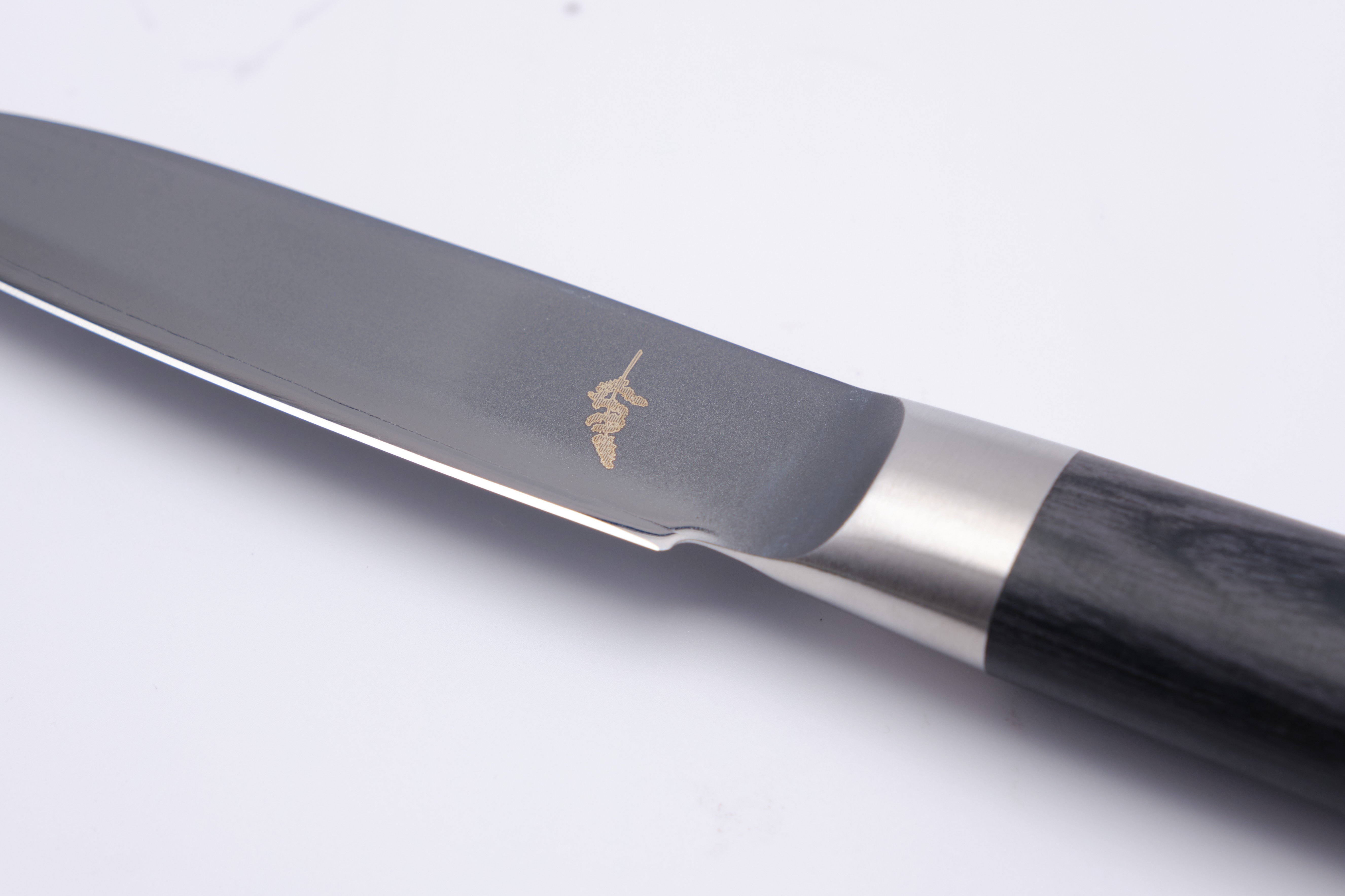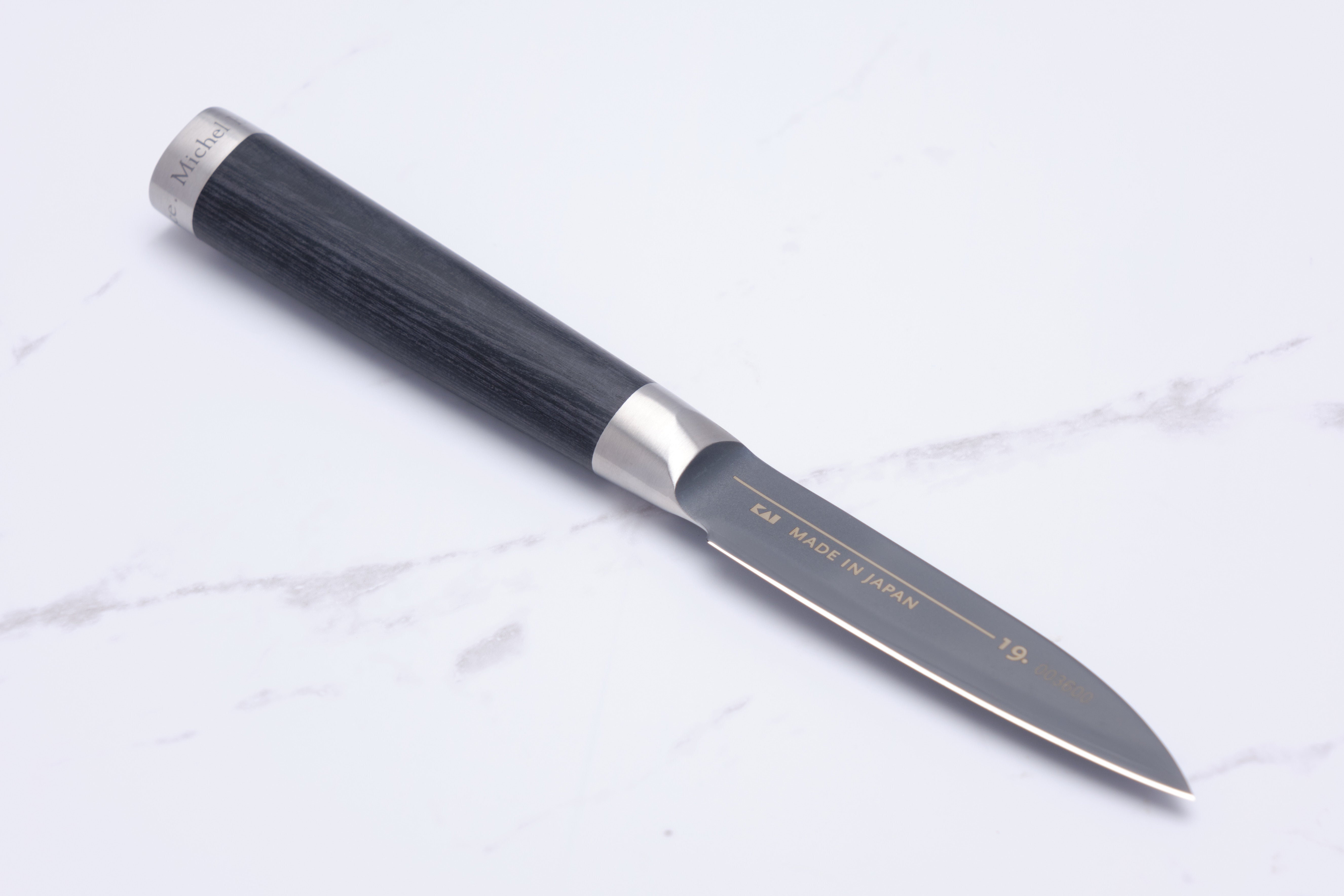 The Michel Bras 80 mm Herb Knife #1 from KAI is an exceptional herb knife, designed in collaboration with renowned French chef Michel Bras. This knife combines traditional Japanese craftsmanship with modern design, resulting in a perfect balance and precision for all your herb needs. With a core of VG-10 steel and a titanium coating, the knife offers both durability and sharpness. The included numbered magnetic sheath ensures that your knife is always protected and ready to use. Each knife comes wrapped in handmade Japanese paper, making it an ideal gift for professional chefs and food enthusiasts alike.
