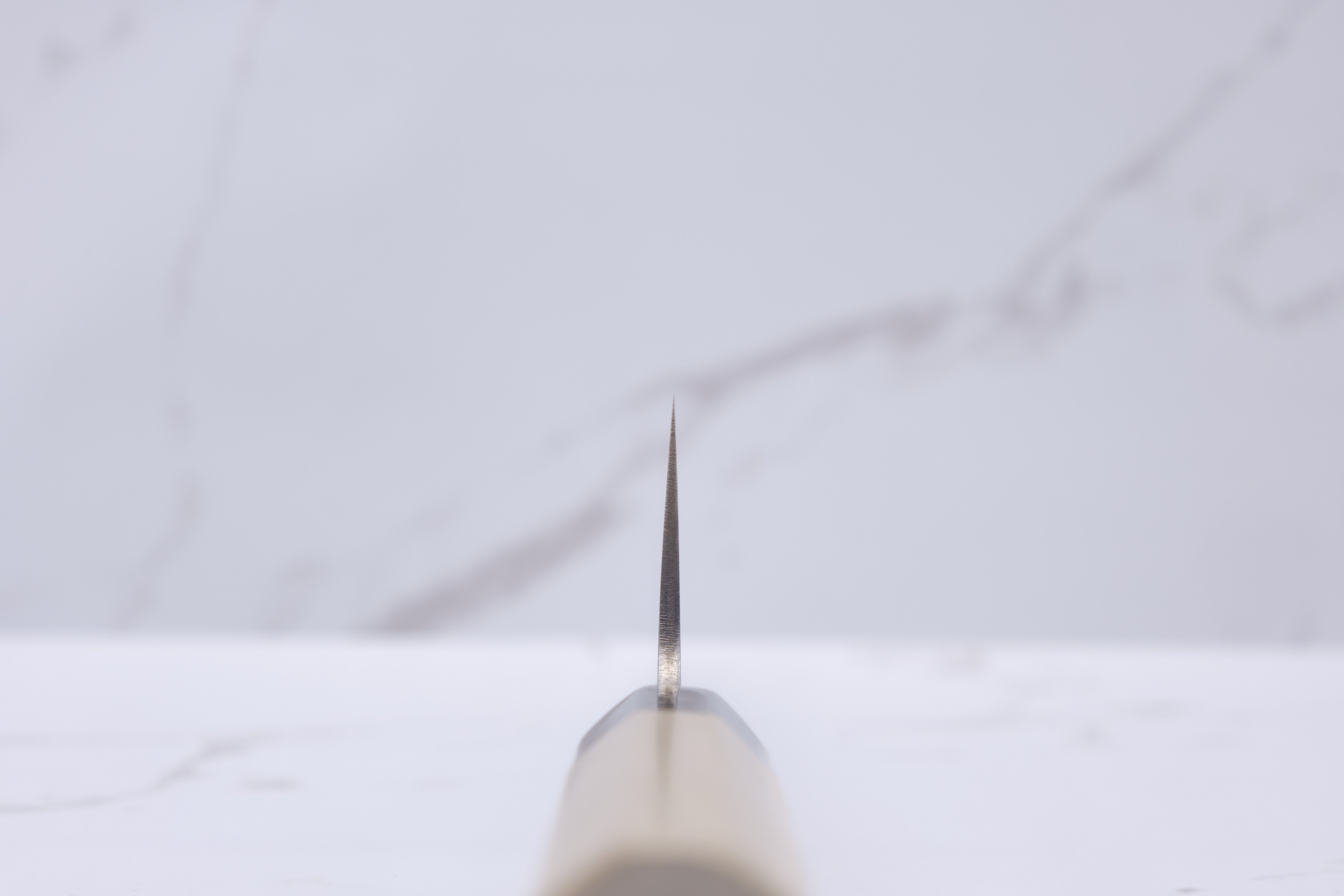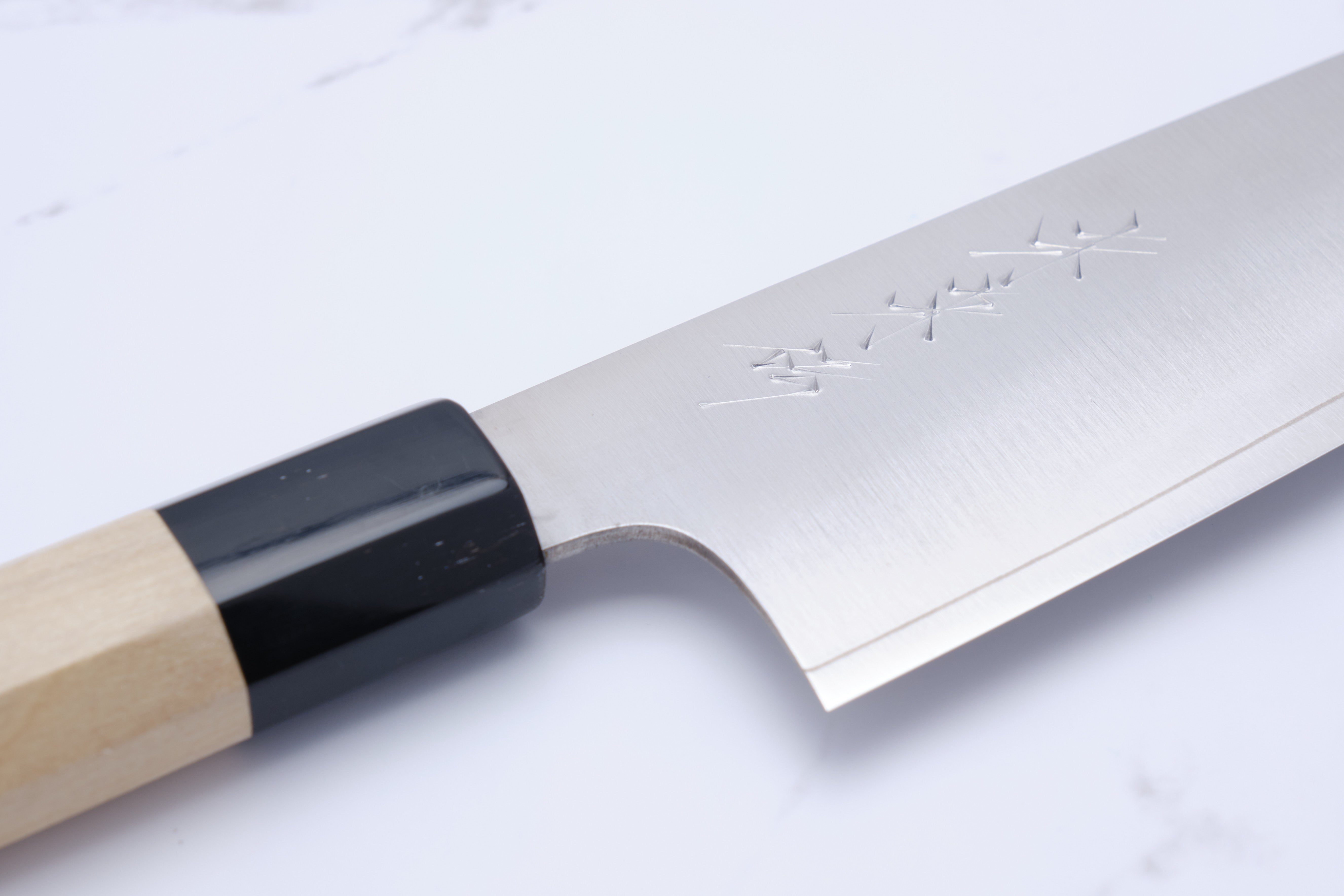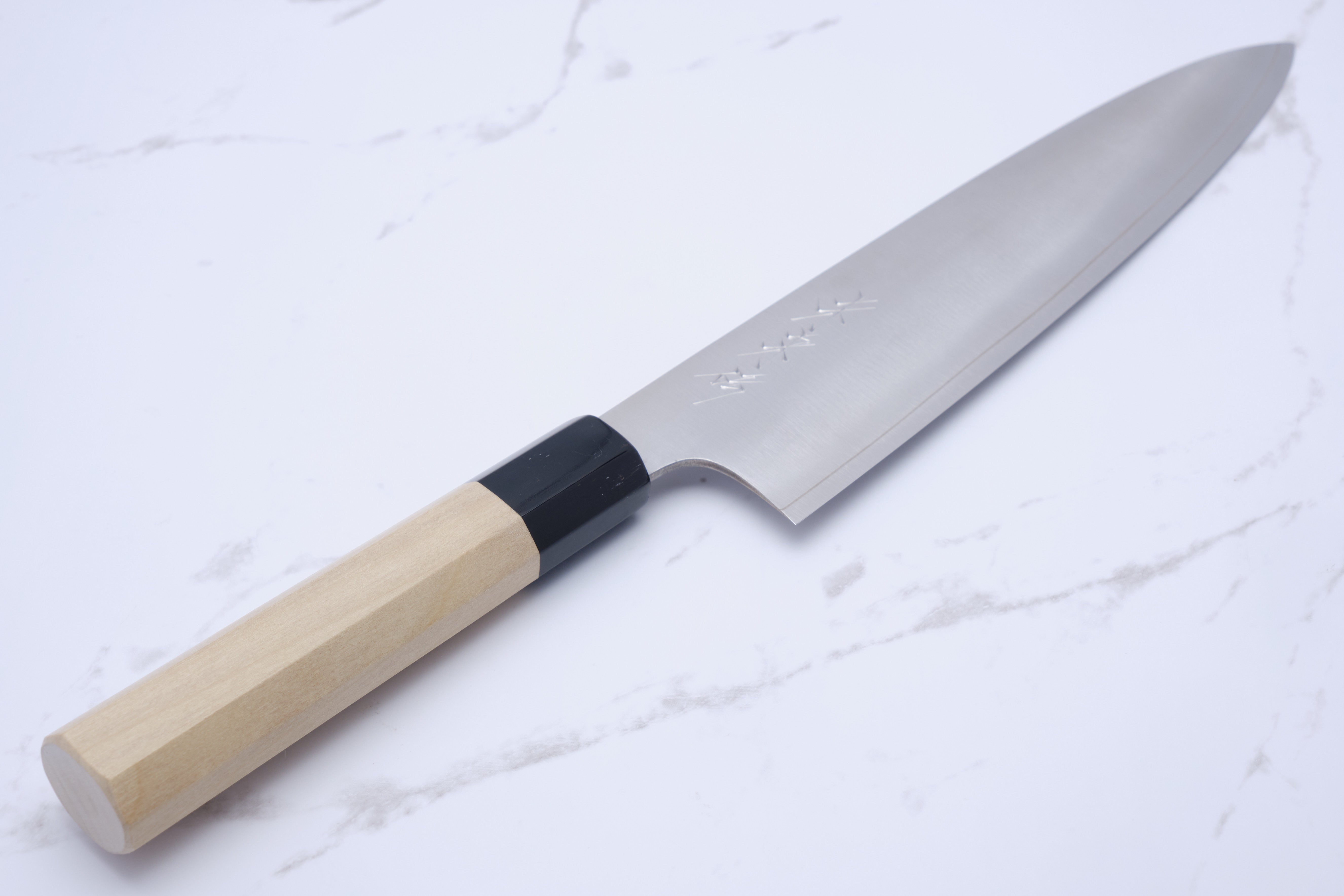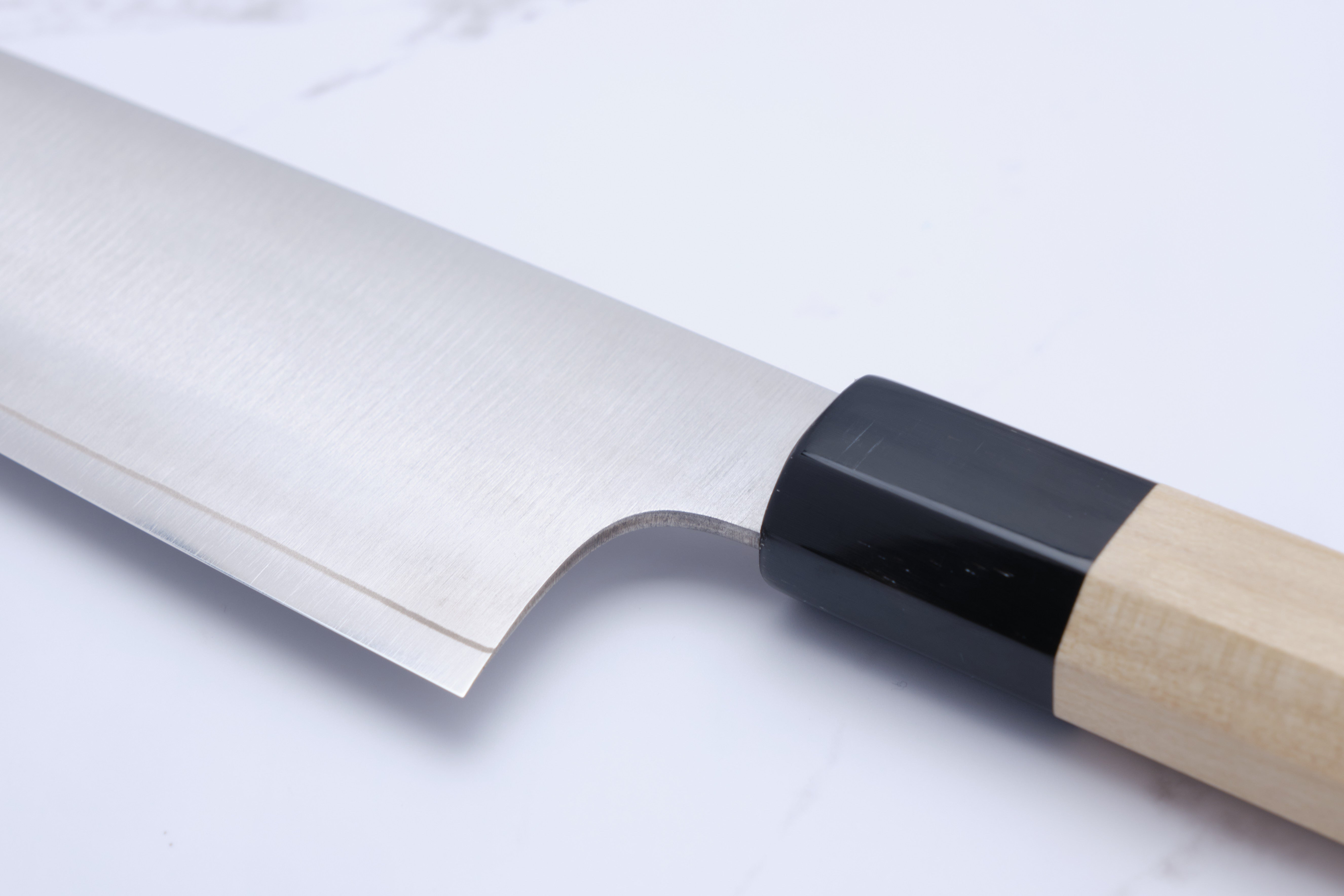 The handle is a classic Japanese octagonal WA handle made of magnolia wood with a buffalo horn ferrule.