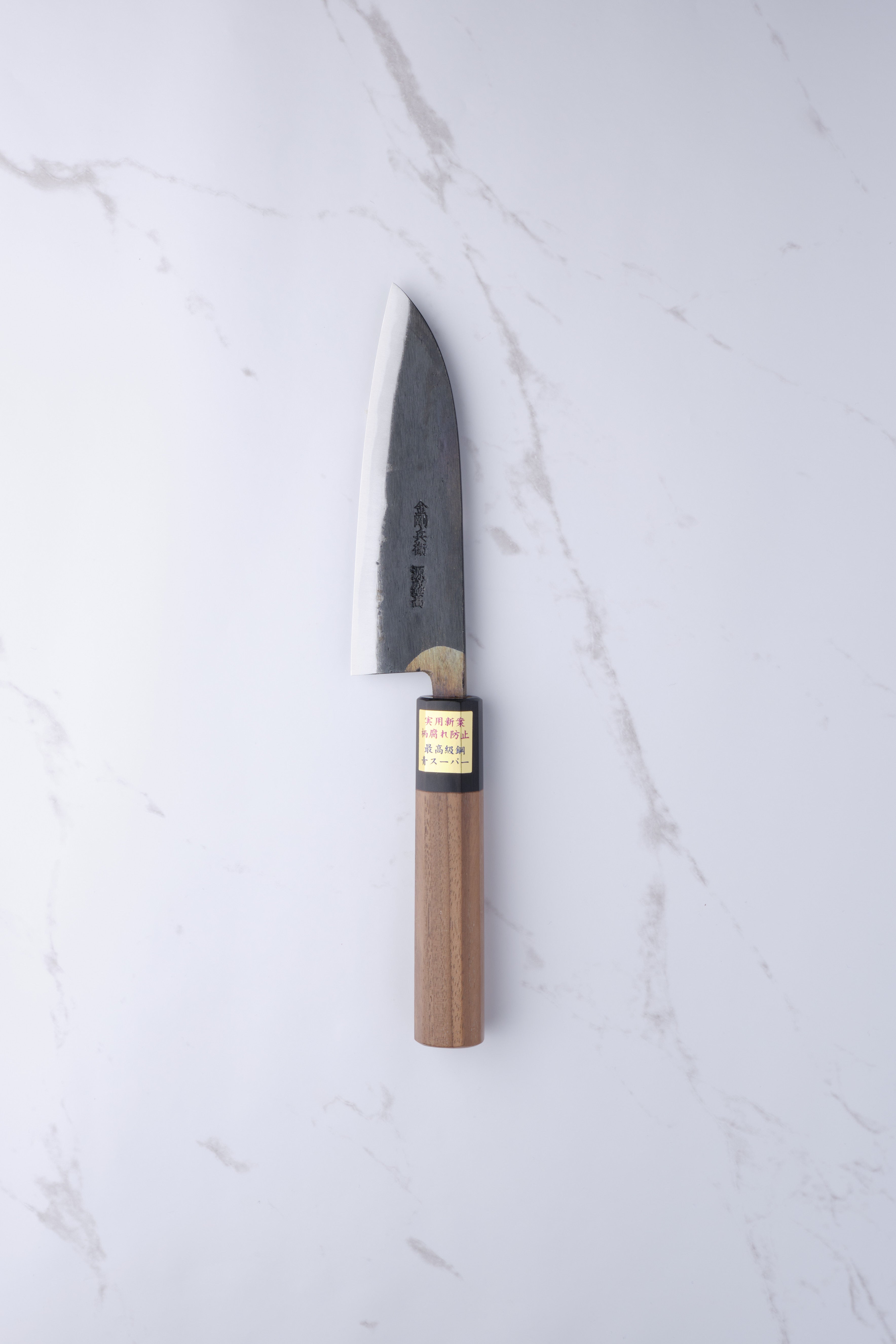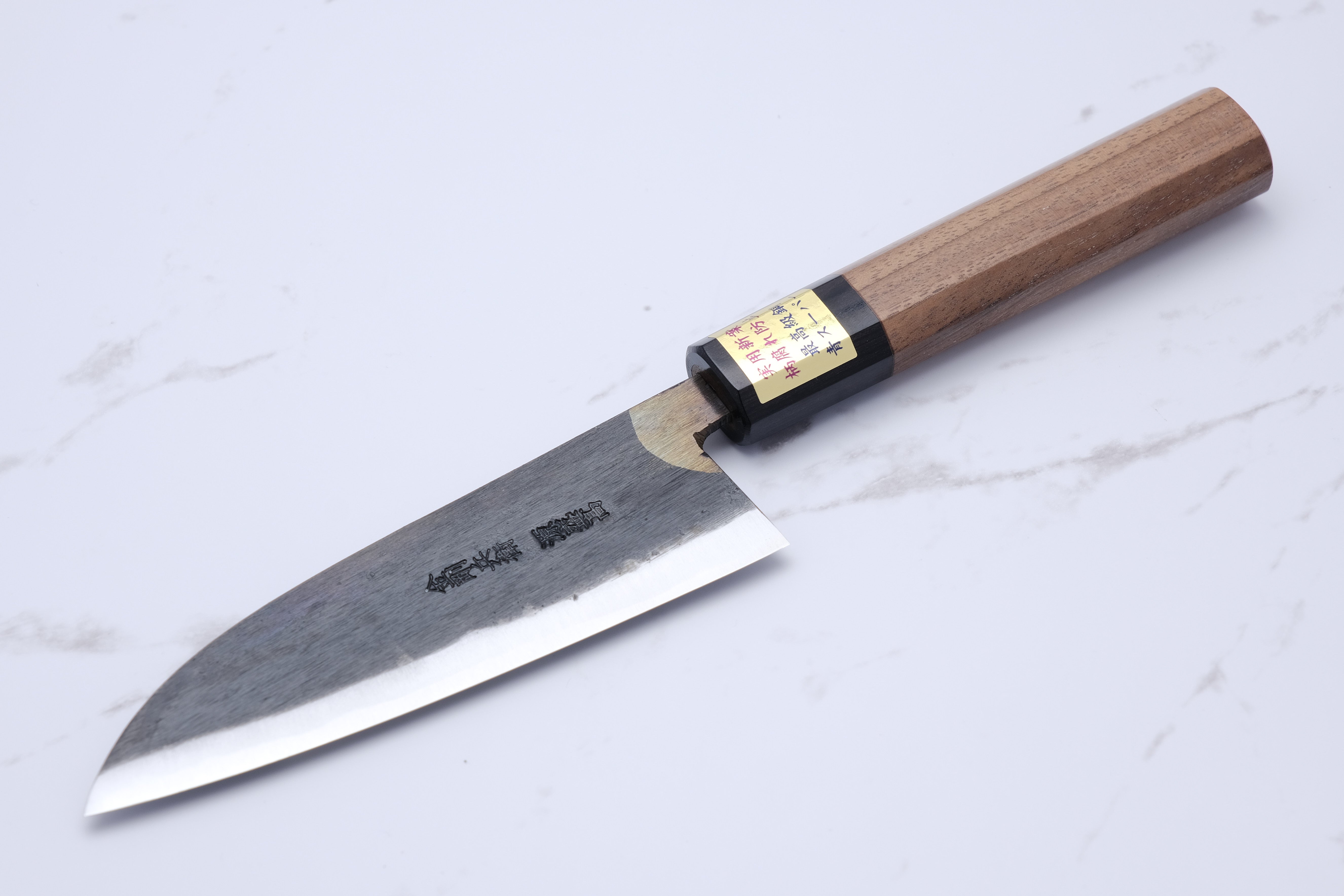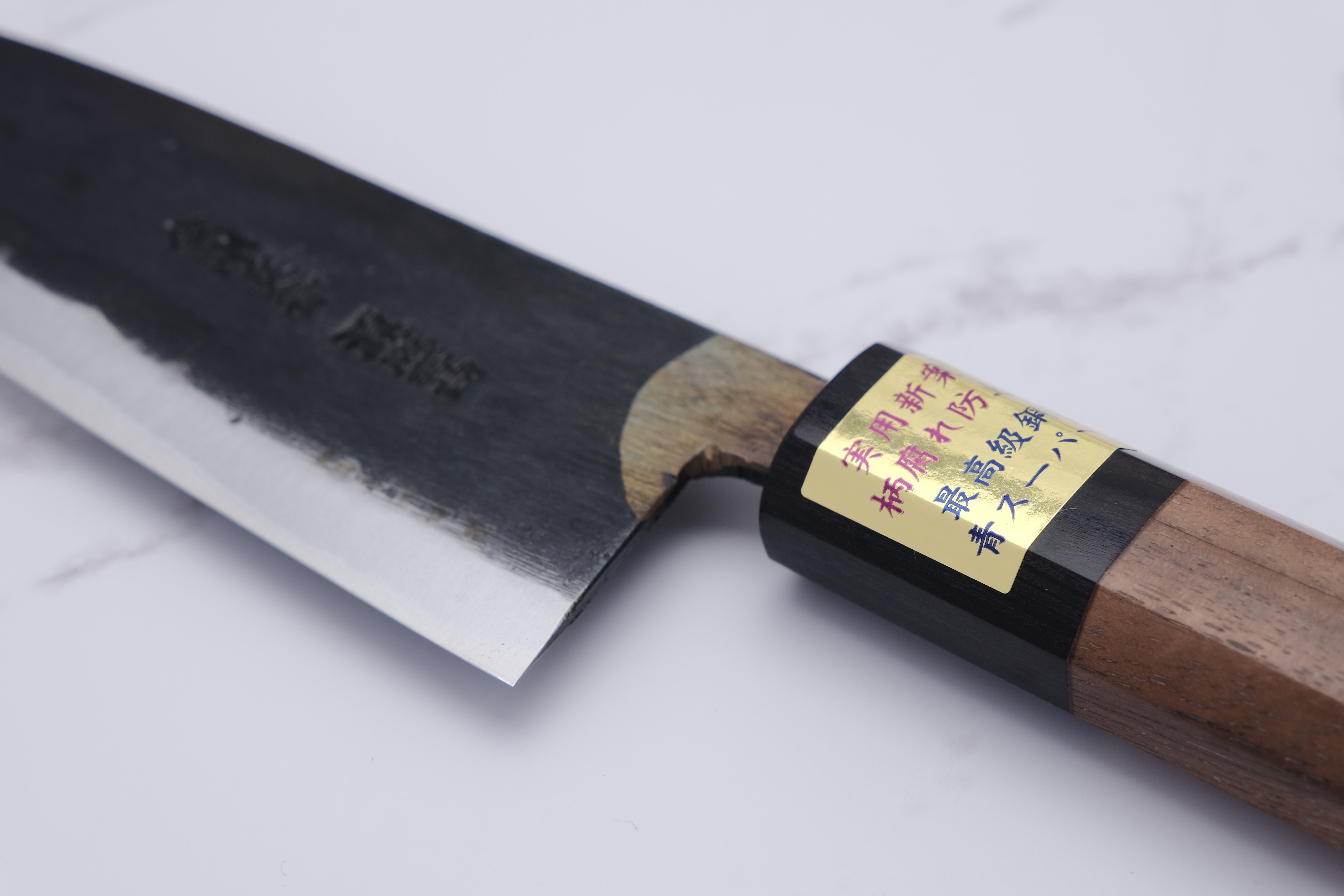 The core steel is, as mentioned, aogami-super. Aogami is the category of so-called blue steel, and "Super" is the hardest of these alloys. For the same reason, it is not a knife that you should take chances with by cutting into excessively hard objects. Bones, cartilage, frozen objects, etc. are of course forbidden.