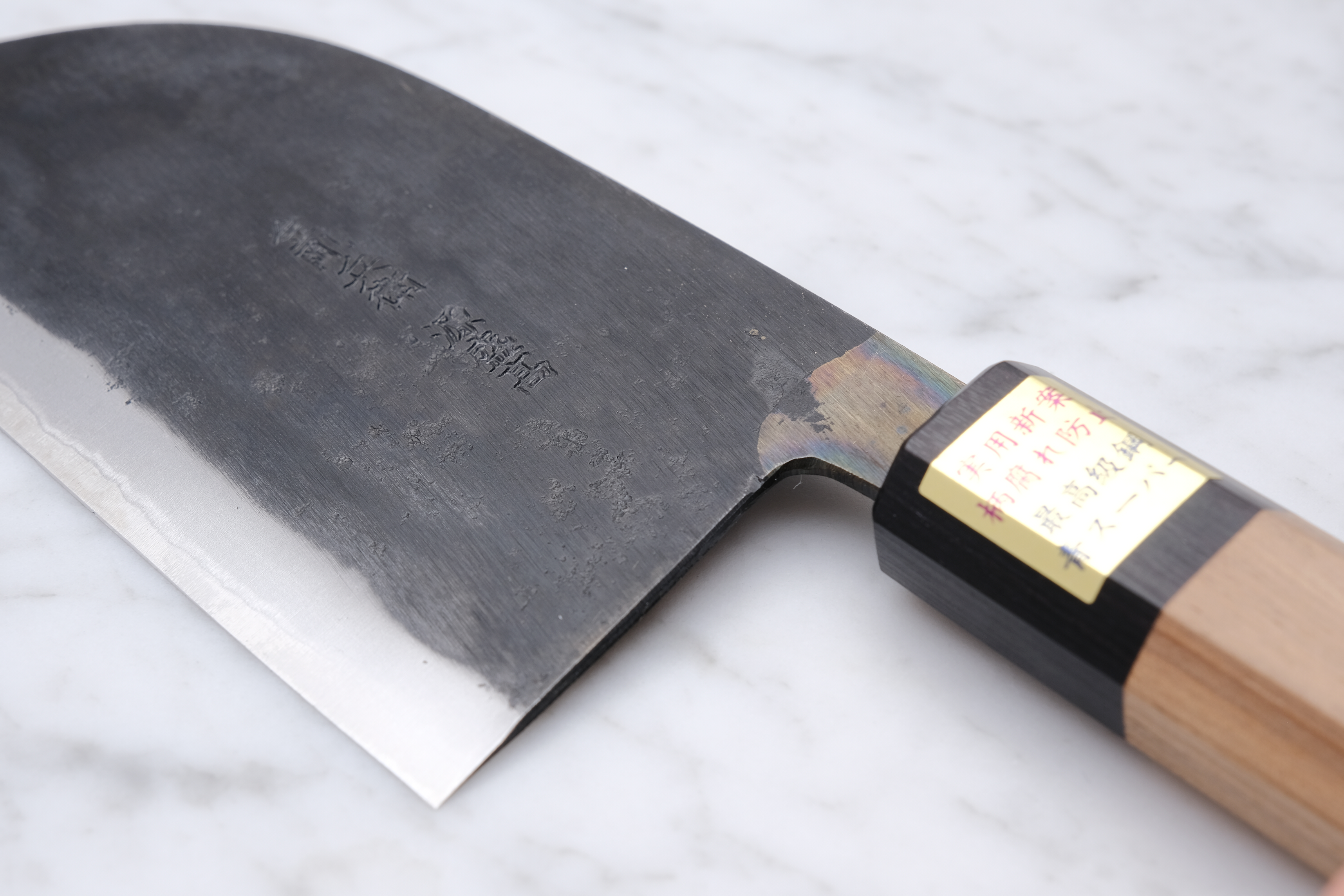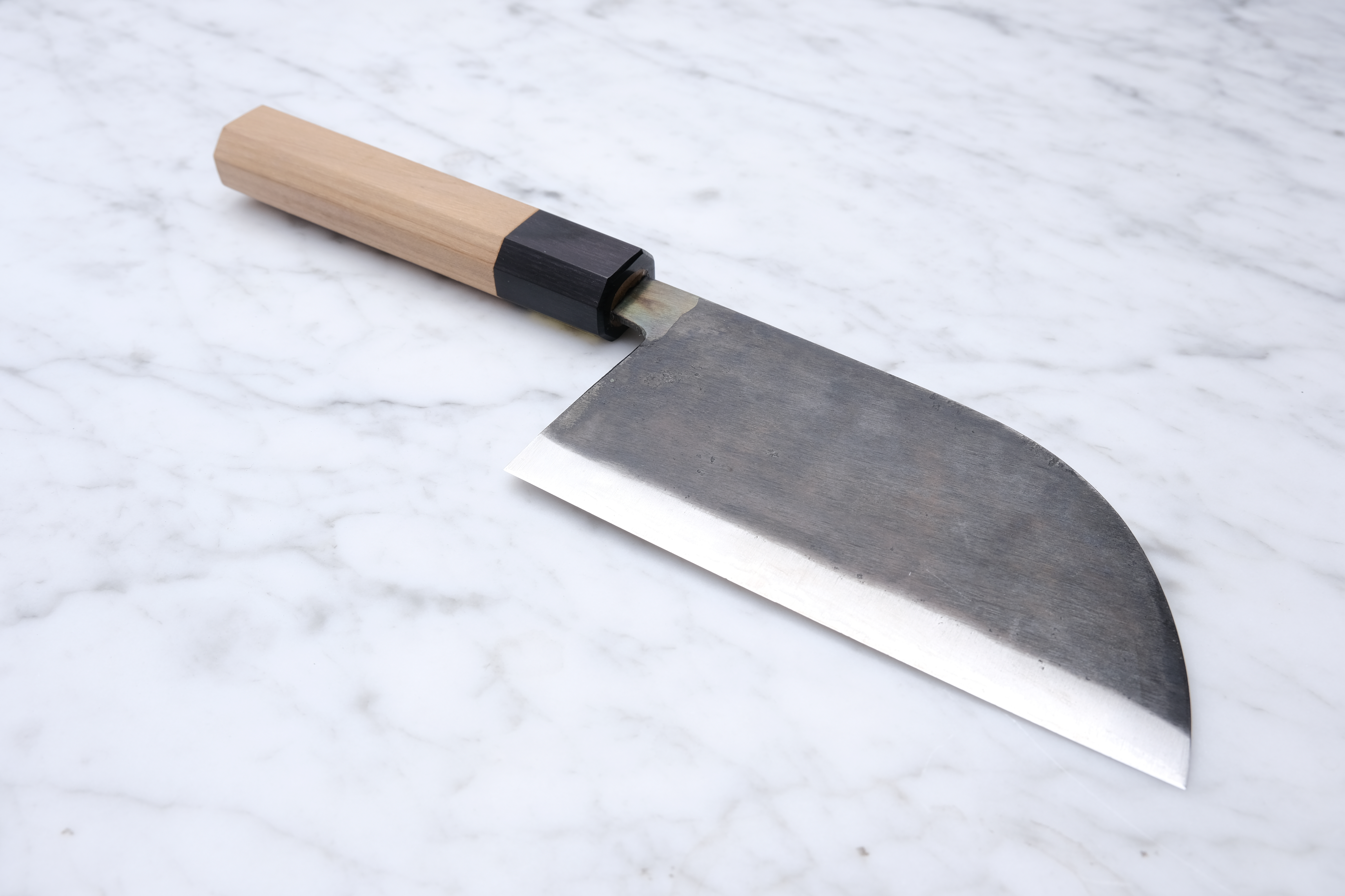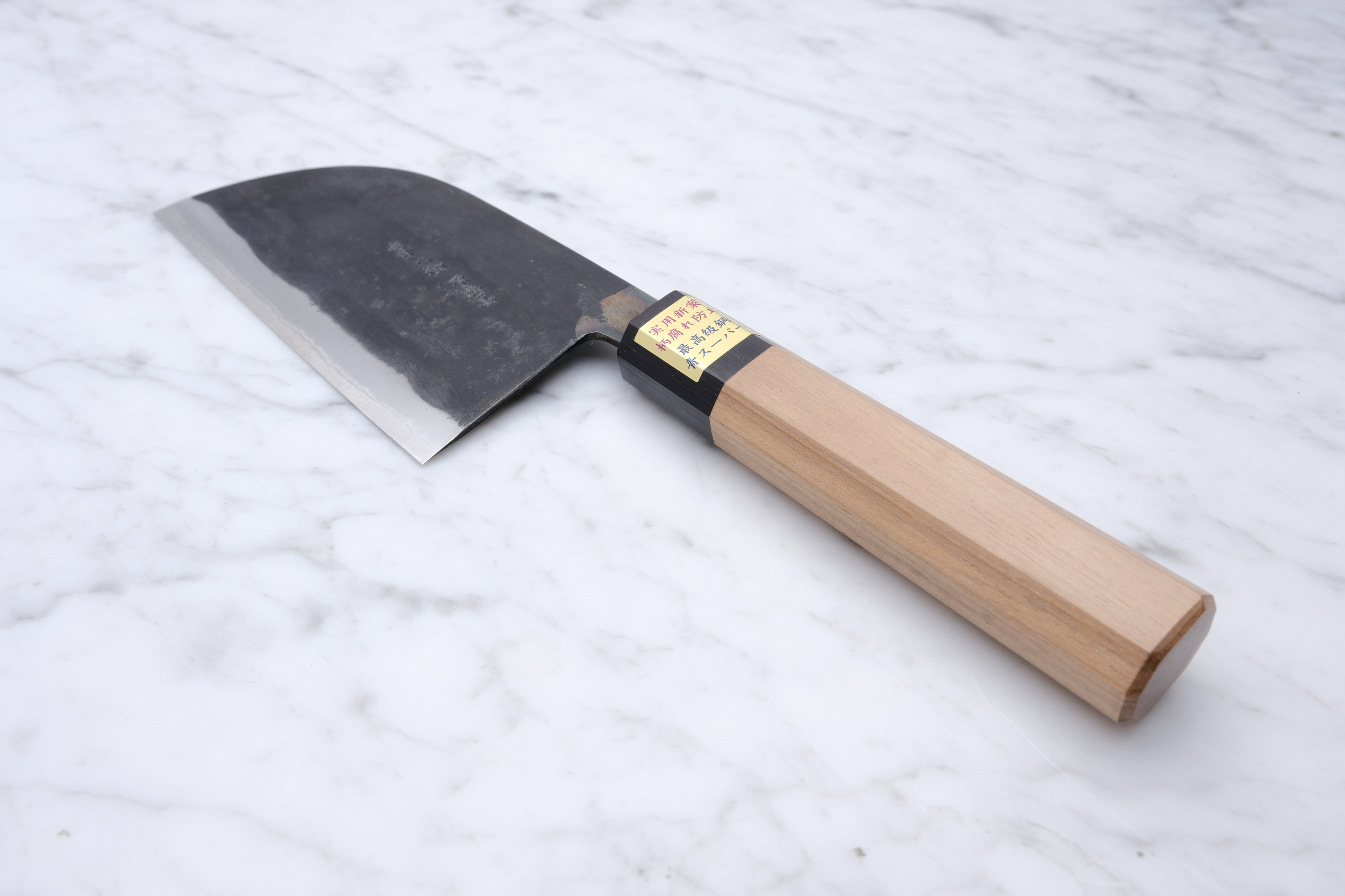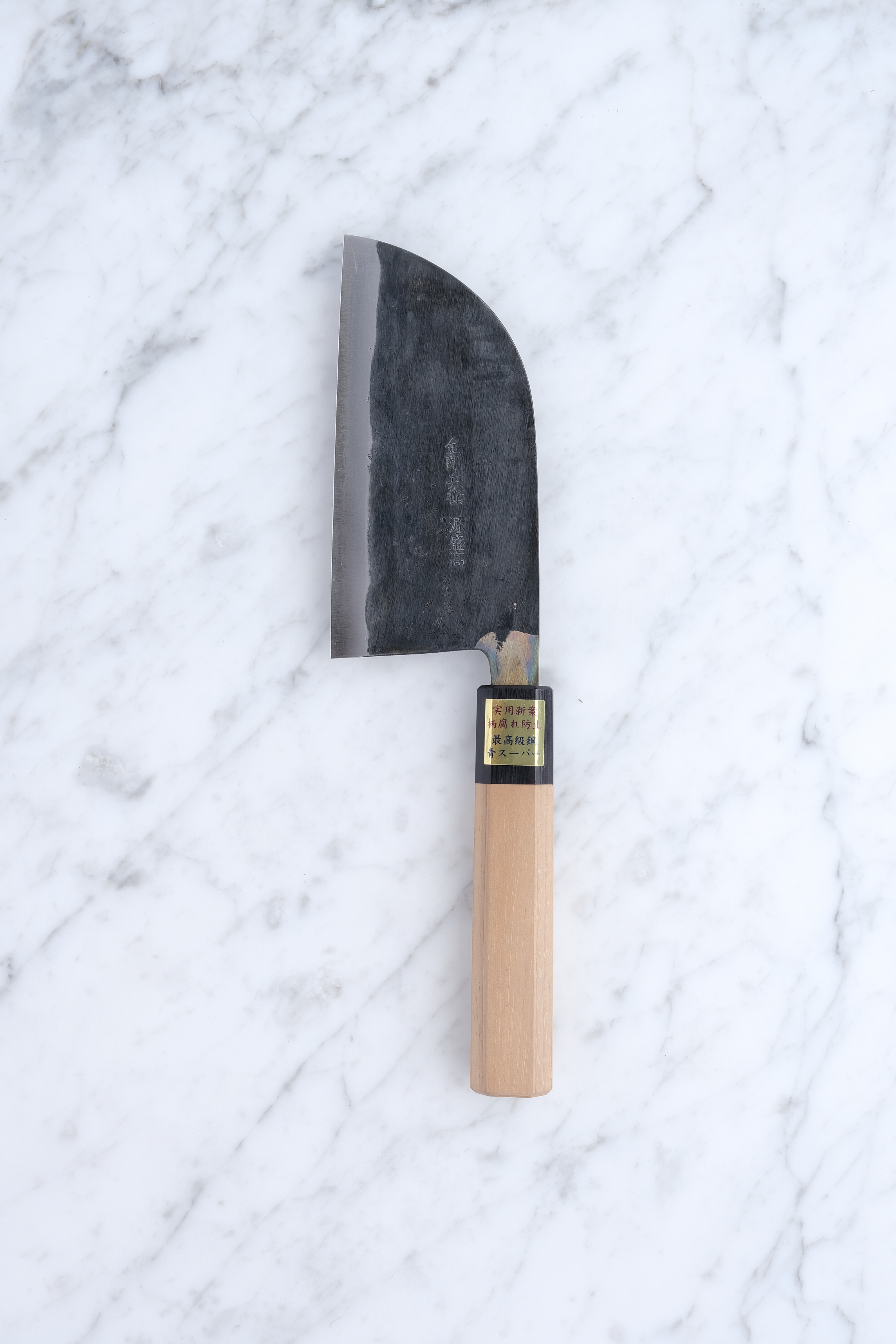The core steel is, as mentioned, aogami-super. Aogami is the category of so-called blue steel, and "Super" is the hardest of these alloys. For this reason, it is not a knife to take chances with by cutting into overly hard materials. Bones, cartilage, frozen items, etc. are of course prohibited.