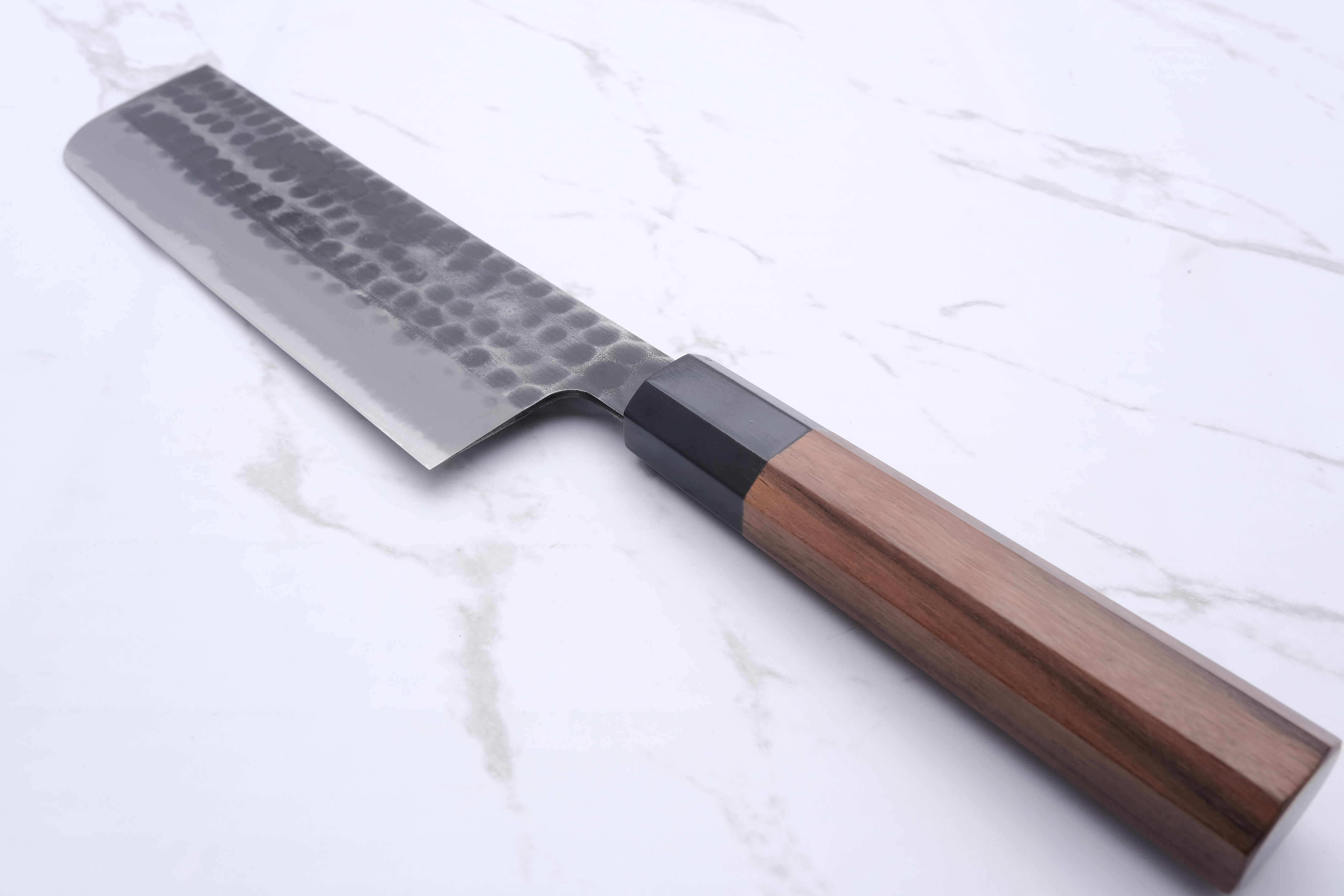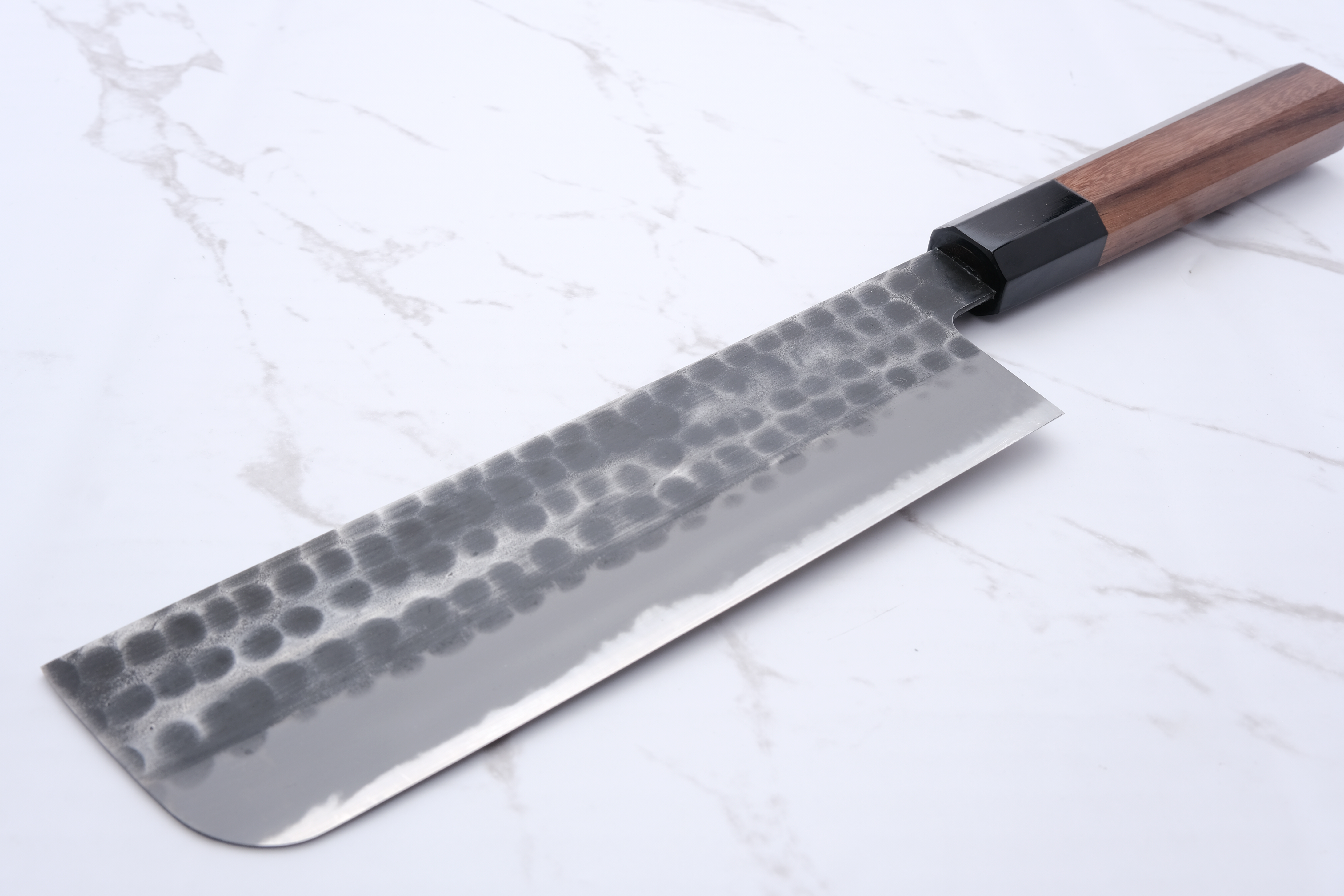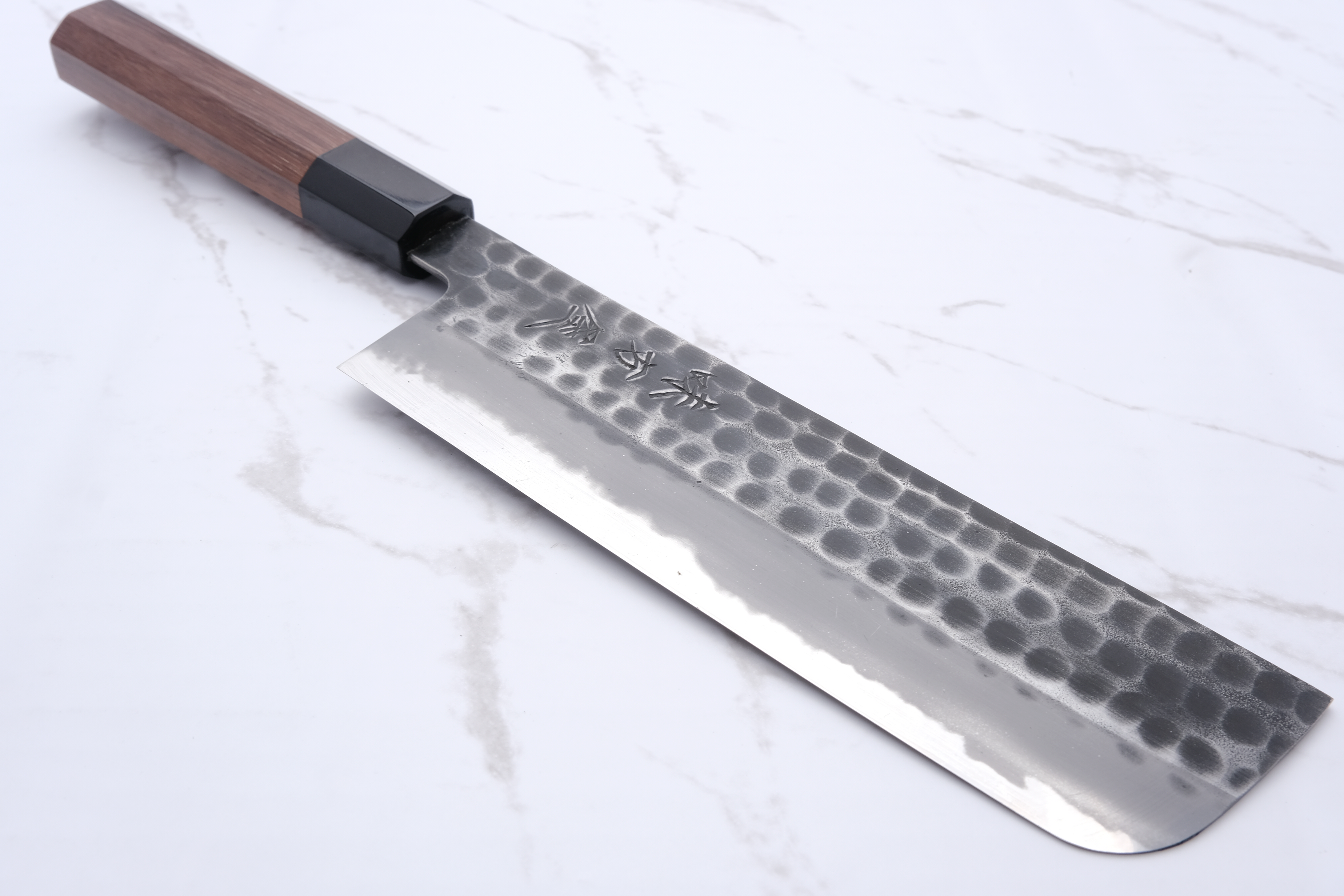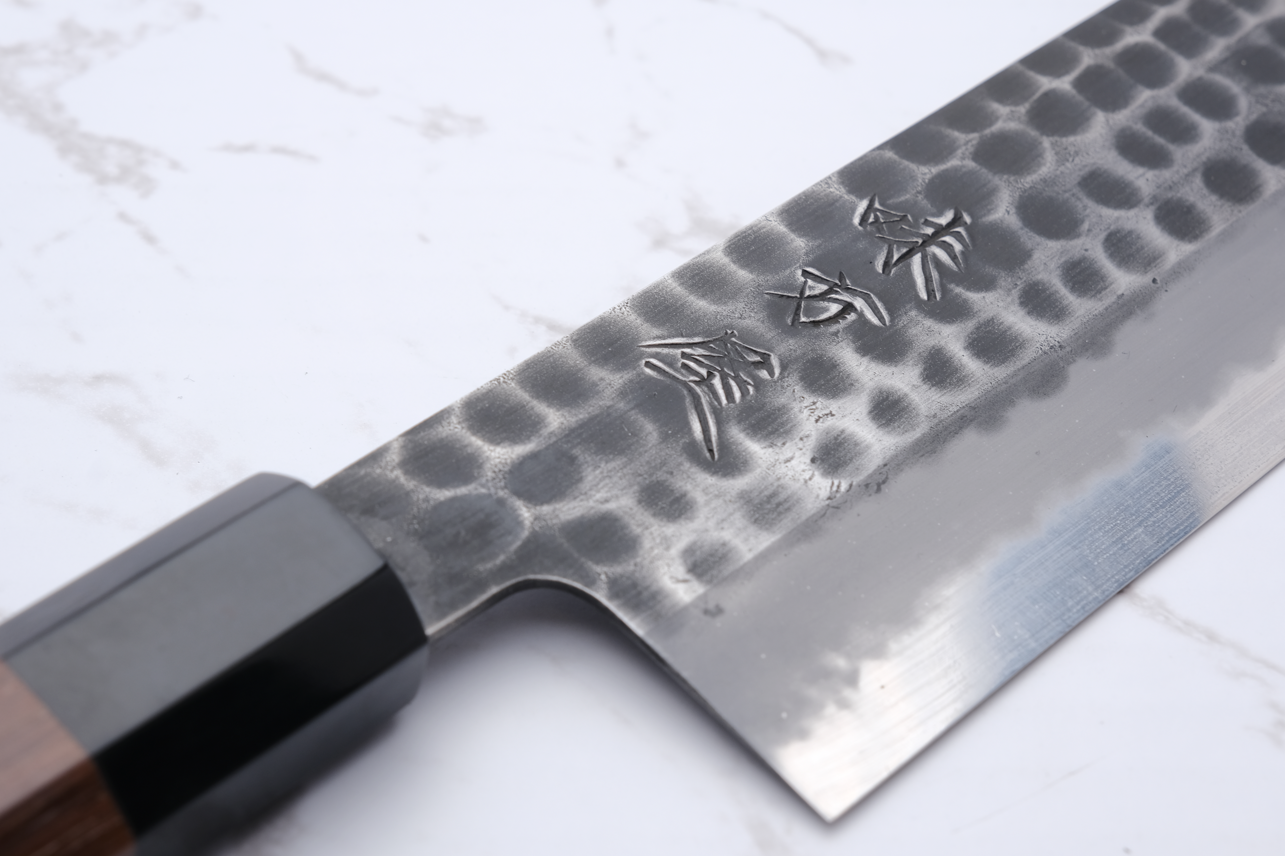 Knives from this series are made of shirogami #2 with soft iron. This makes them incredibly easy to sharpen, and they can become very sharp. With their good tapering and thinness behind the edge, they also cut like a dream.
