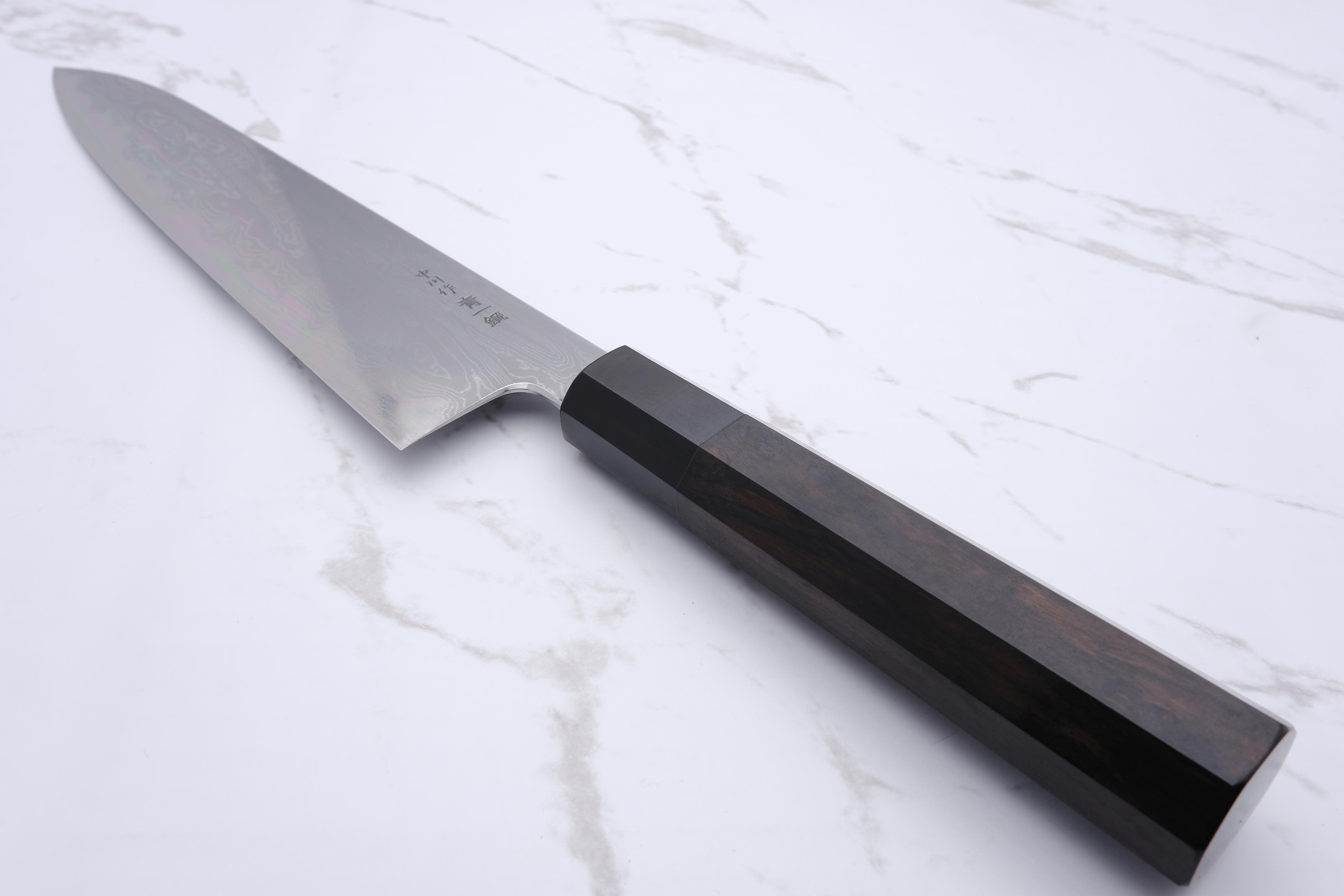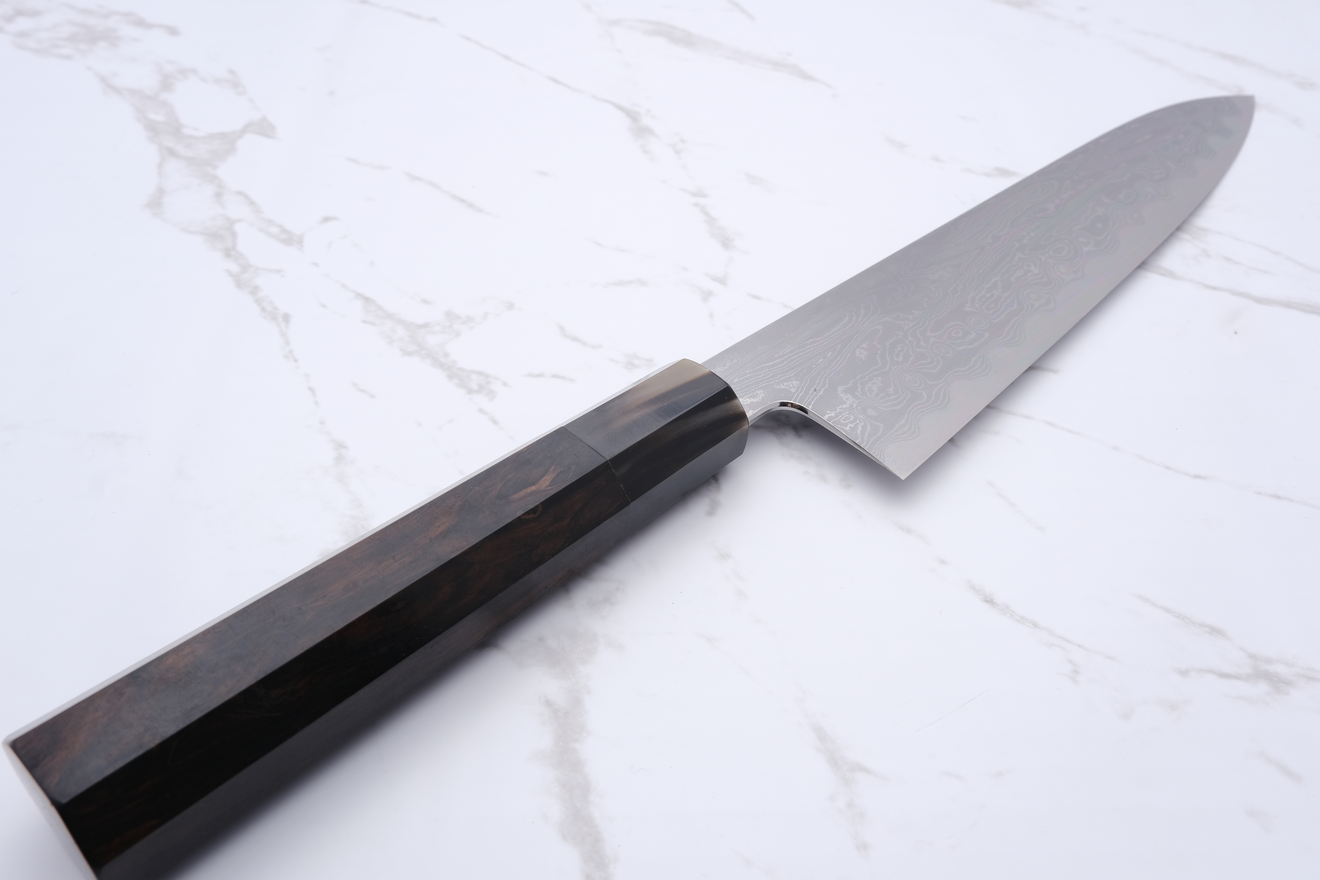 The knife has a classic octagonal WA handle and ferrule of light buffalo horn. It cannot be washed in a dishwasher, and you should also expect the steel to patina after use - but that is also the charm of knives with soft iron sheaths.