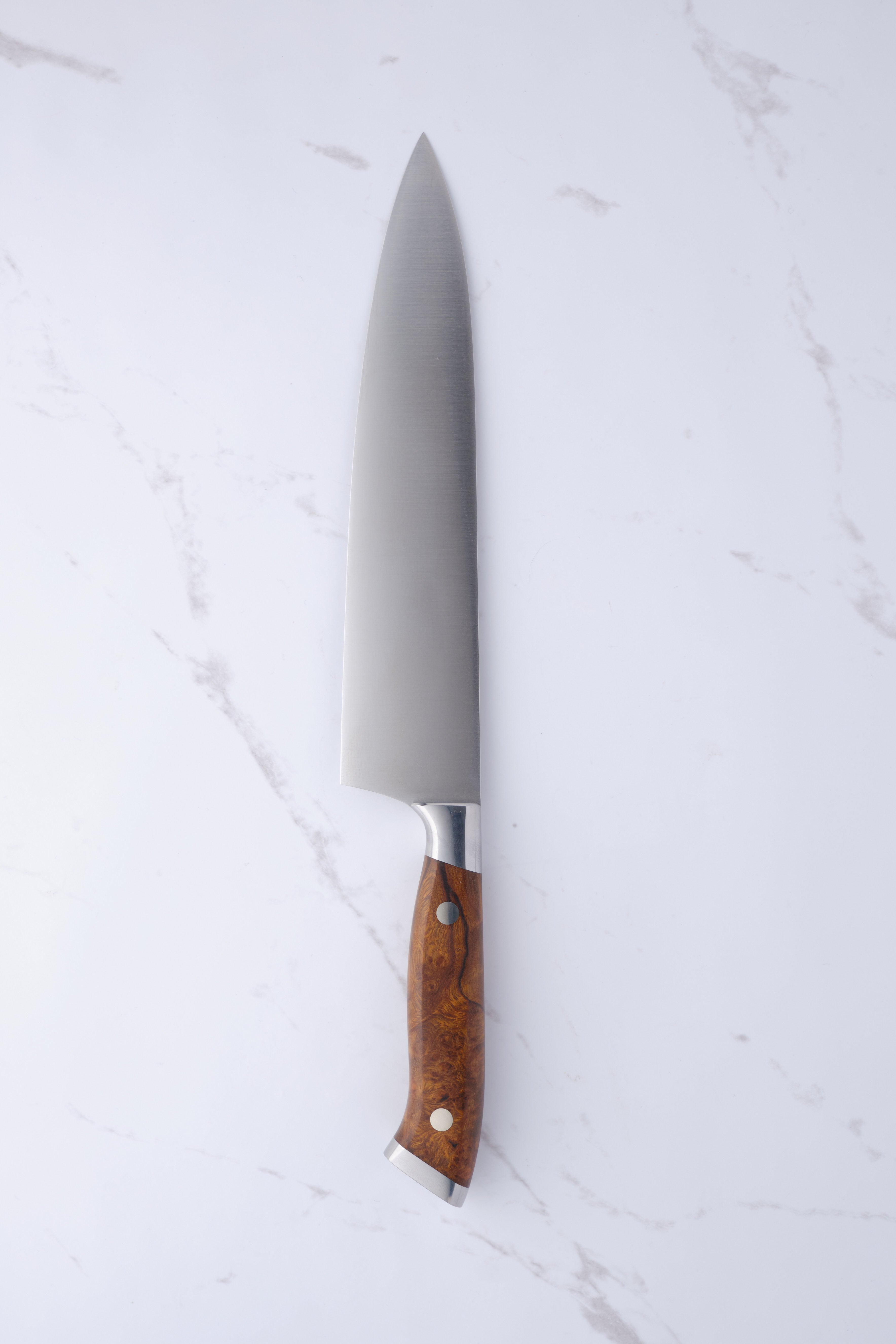 Among the most exclusive knife manufacturers in the world we find Nenox from Tokyo. The knife here is a 21 cm Western-style chef's knife with a fabulous edge and a beautiful handle in one of the absolute most expensive types of wood there is - Desert Ironwood knotwood from Arizona.