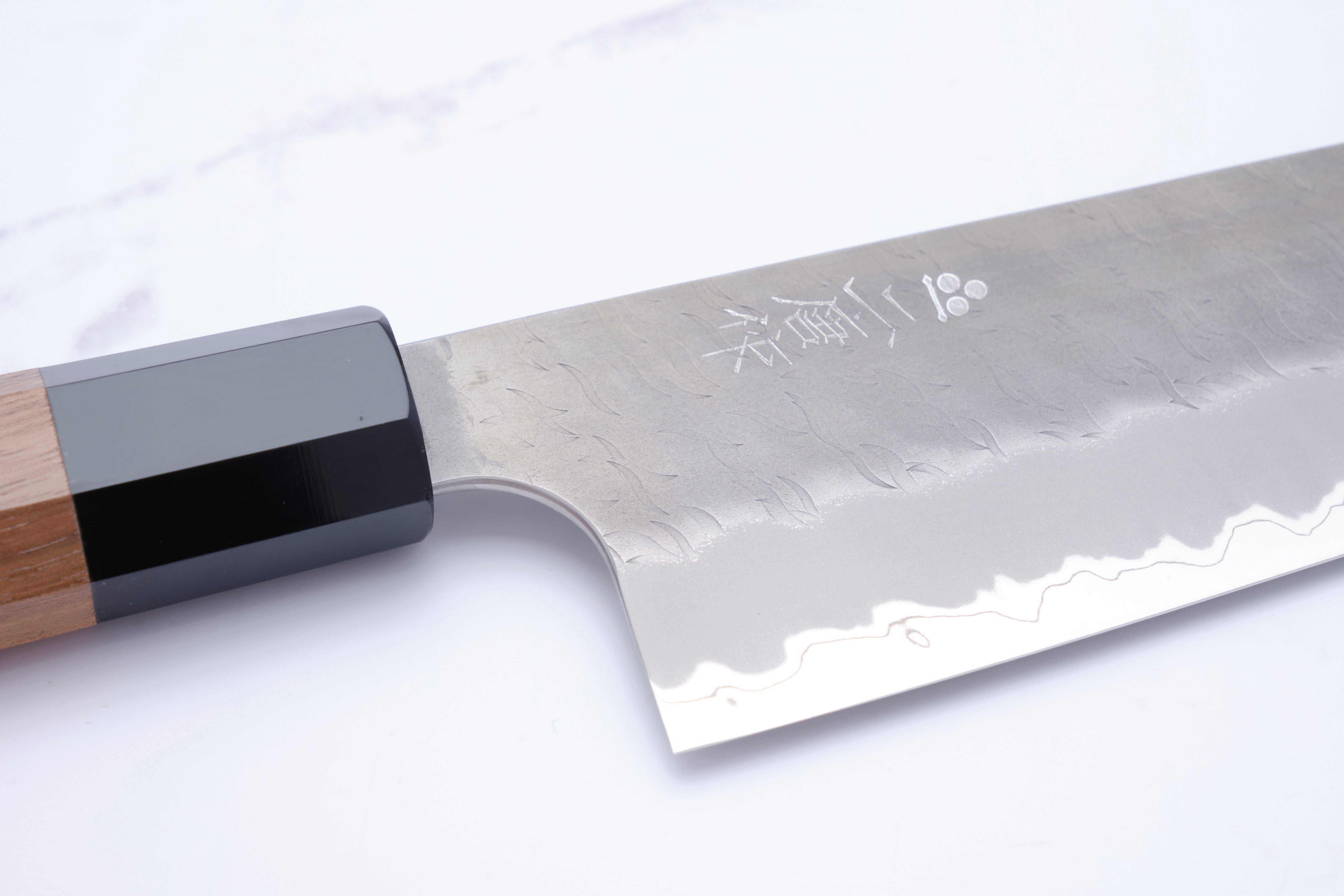 These knives are a little more 'simple' than the ones mentioned above. They are made with Aogami Super (blue super) in the core, which is hardened to 63-64 HRC surrounded by a stainless cladding. Although the finish is not as complex as some of their other products, it is still definitely something to notice. They are finished with a relatively dark migaki and very eye-catching tsuchime at the top of the blade, which meets a super nice kasumi further down towards the egg.