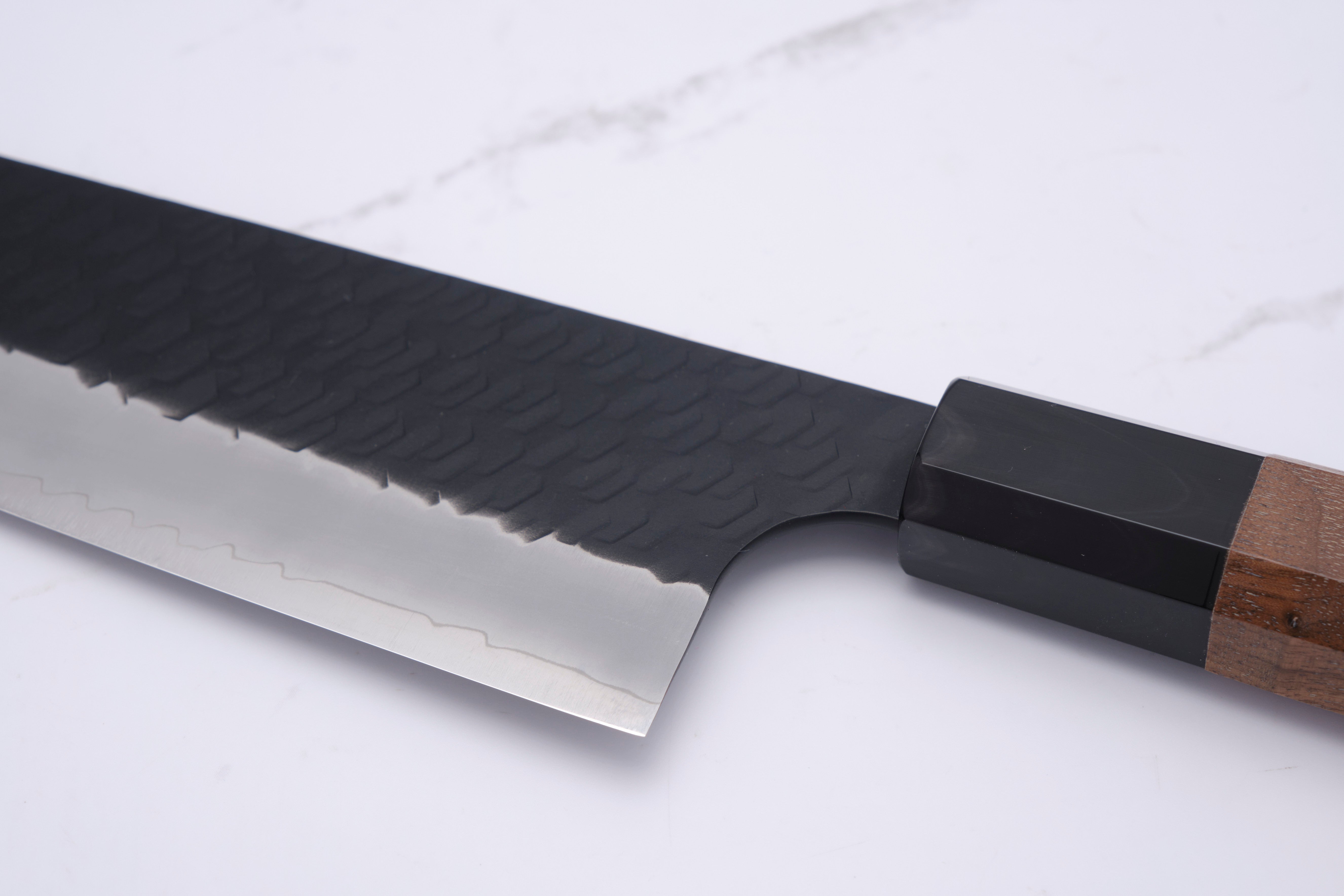 Nigara Hamono, a renowned smithy from the Aomori region of Japan, proudly presents the K-Tip Nakiri 180mm SG2. This knife is the result of master smith Go Yoshizawa's innovative approach to craftsmanship, where he constantly explores new methods. The K-Tip Nakiri is designed to be a versatile all-rounder in the kitchen, perfect for cutting, chopping and preparing meat, fish and vegetables alike. With a core of SG2 steel hardened to 63-64 HRC and a stainless cladding, this knife offers both durability and sharpness. The unique kurouchi finish and eye-catching tsuchime on the blade add an aesthetic element that makes it a feast for the eyes.