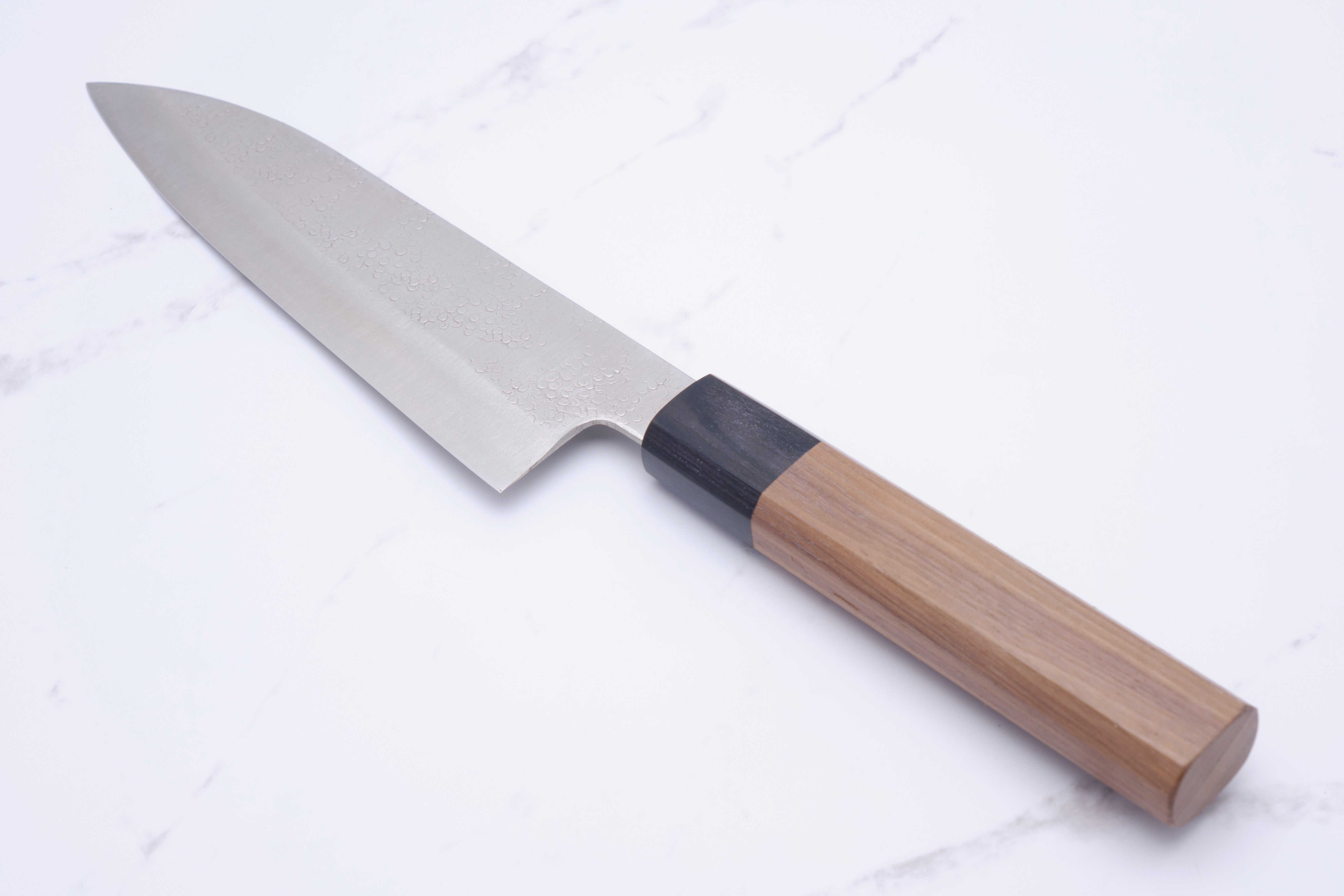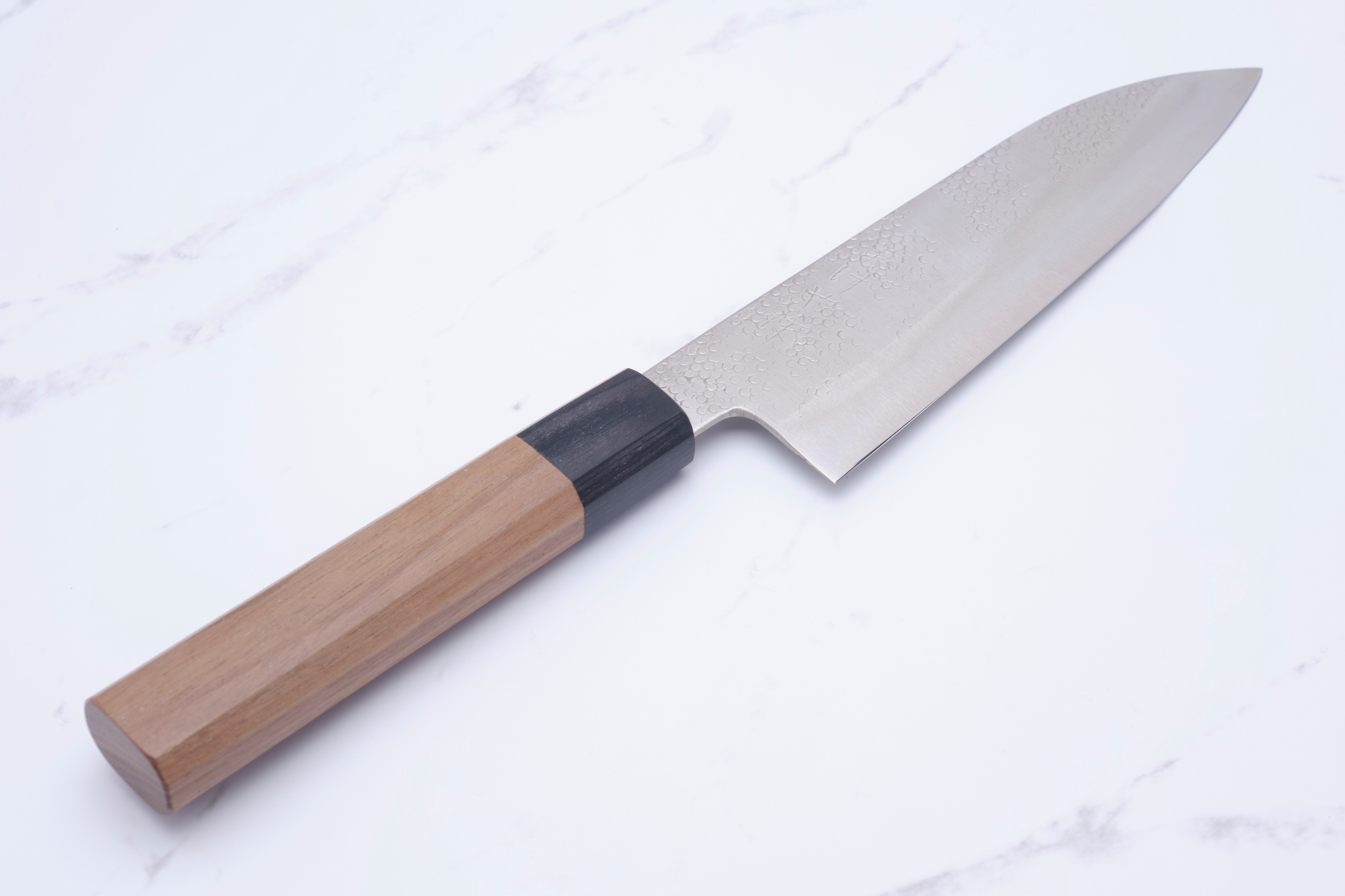 These knives are built in 3 layers with Gin-3 as core steel, surrounded by a stainless cladding. They are then finished with a beautiful tsuchime finish (hammer blow) on the top of the blade, which meets a nice wide bevel grind that tapers nicely, down towards the egg