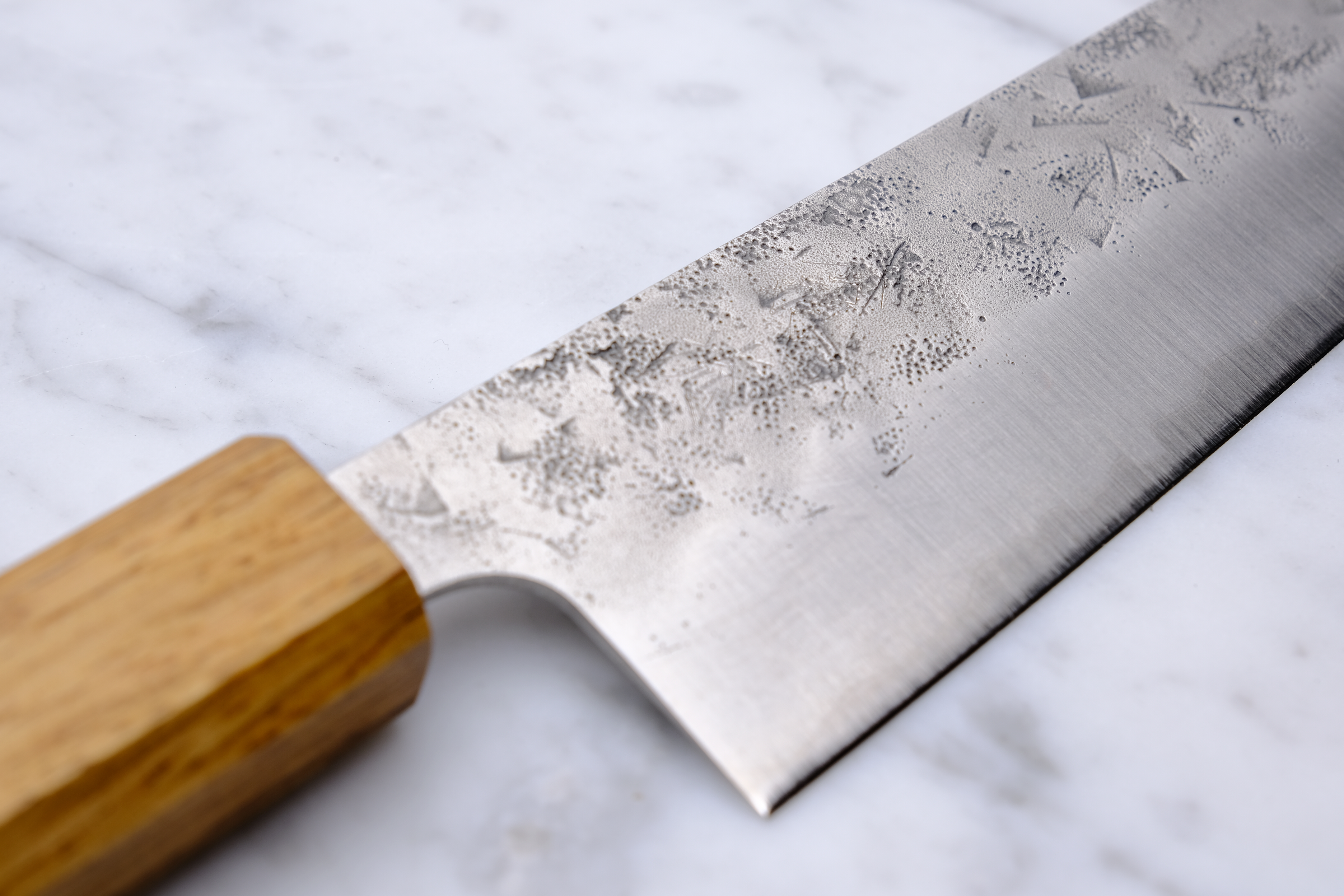 The knife here is made of three layers of steel with a core of SLD. It is thus a fairly hard blade with high potential for sharpness, and is a semi-stainless alloy. This means that the edge may get a little patina, but is difficult to rust. The 2 outer layers are stainless.