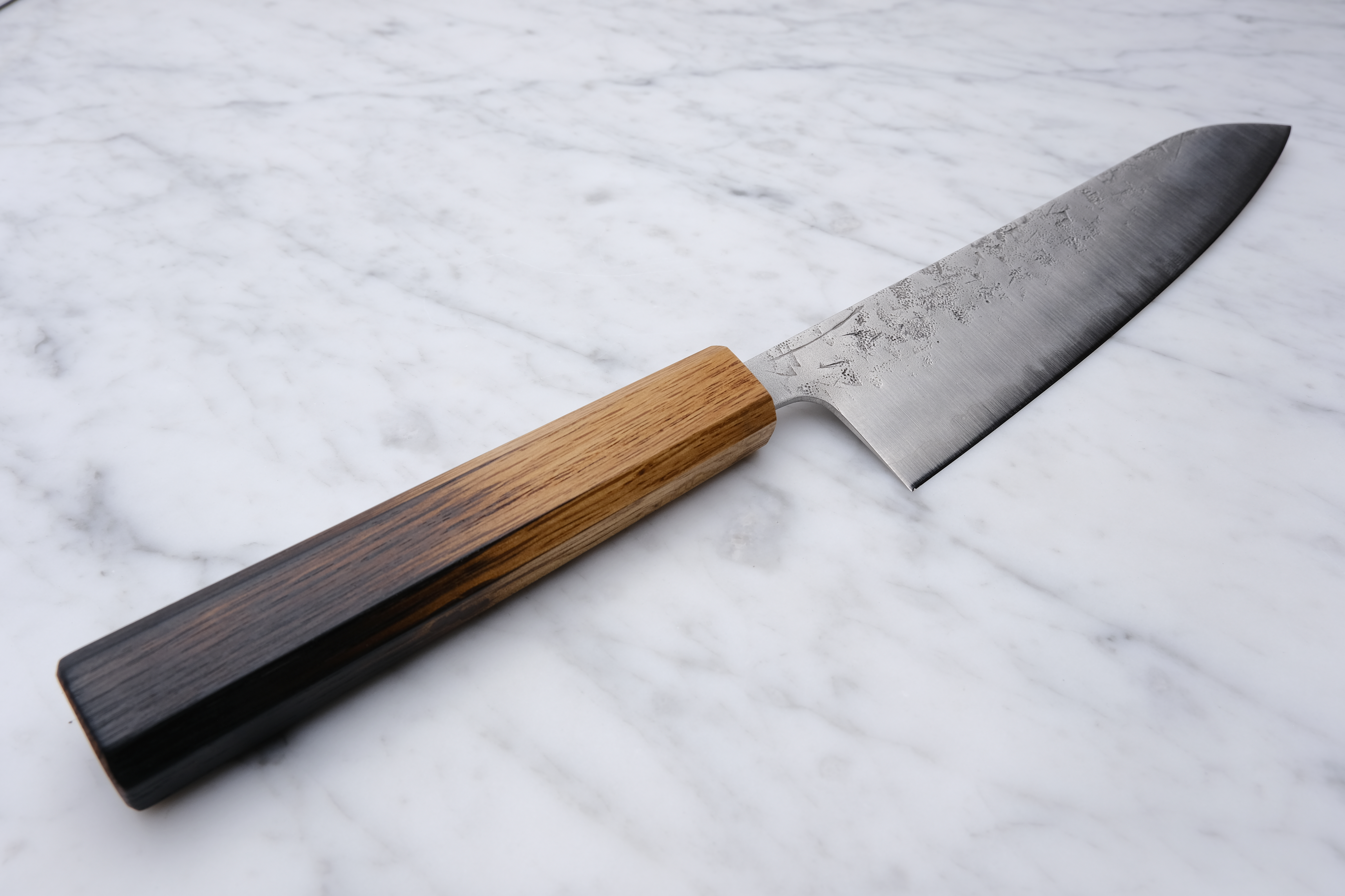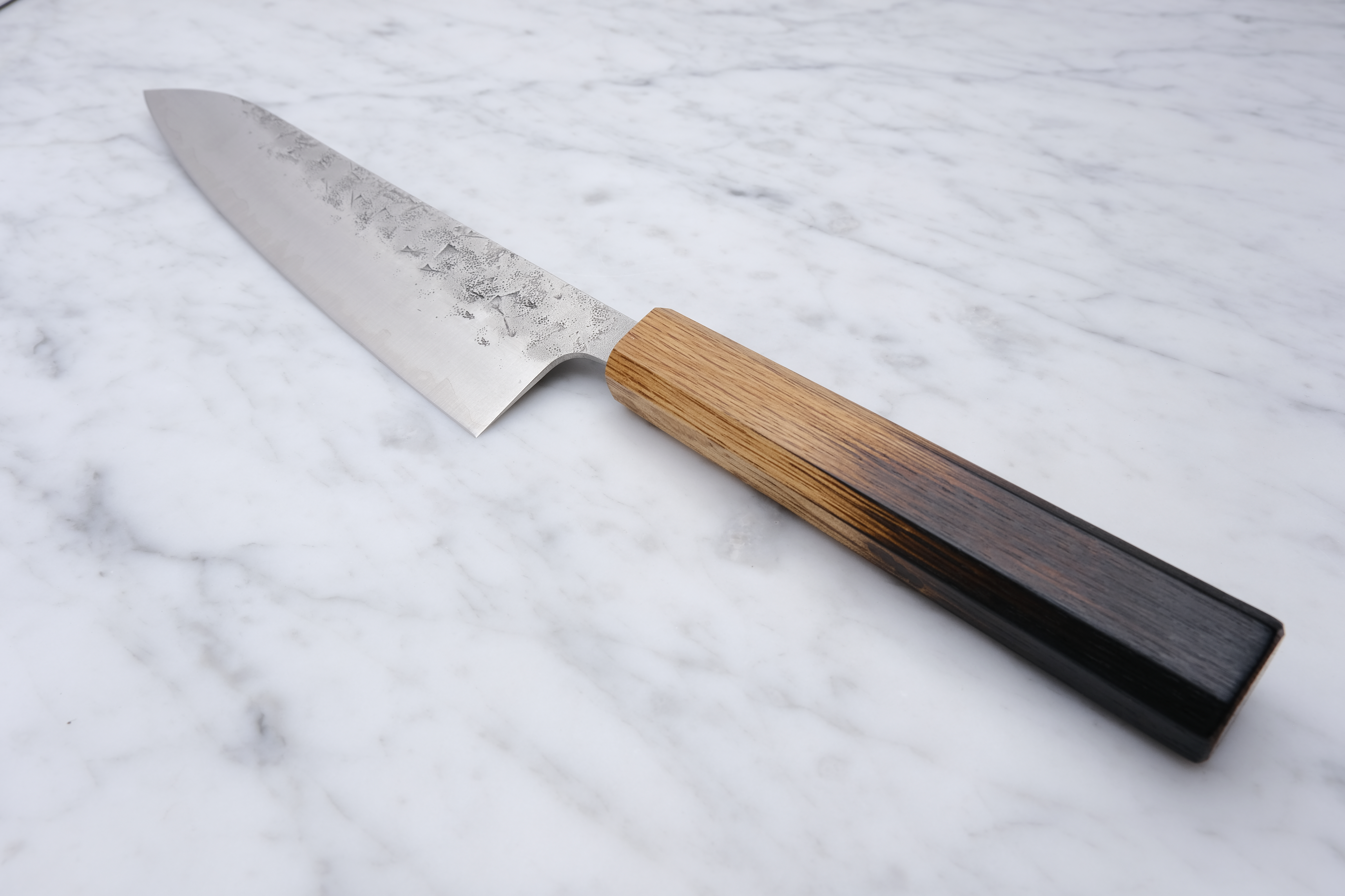 The OUL Sakai Nashiji 210 mm Gyuto - SLD is an exceptional chef's knife that combines traditional craftsmanship with modern technology. This knife is made with a core of SLD steel, which provides impressive hardness and sharpness, making it ideal for precision cutting. The three layers of steel ensure durability and a semi-stainless surface that resists rust, while also developing a beautiful patina over time. With a Japanese WA handle in burnt oak, this knife offers both comfort and style, making it a must-have for any food enthusiast.