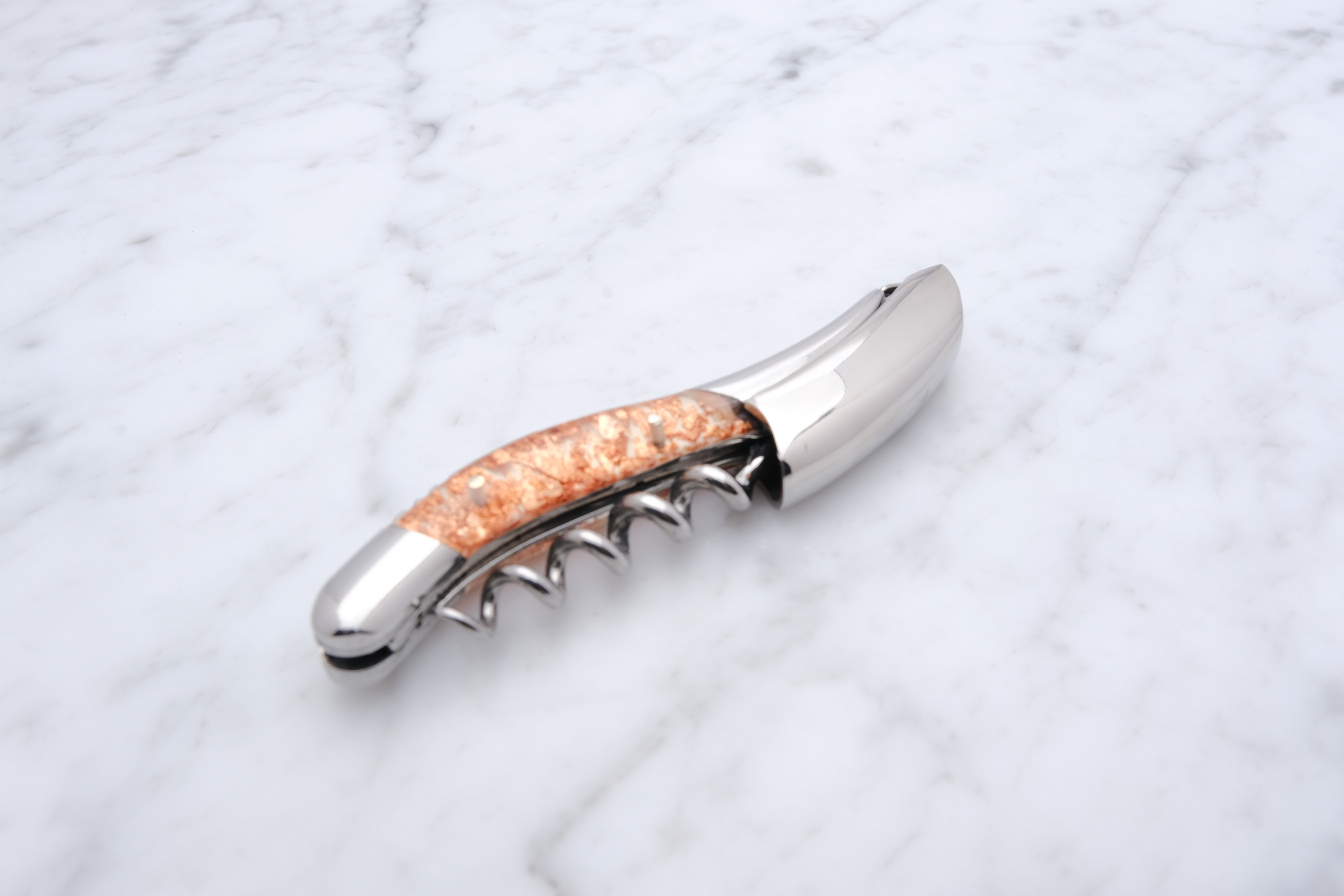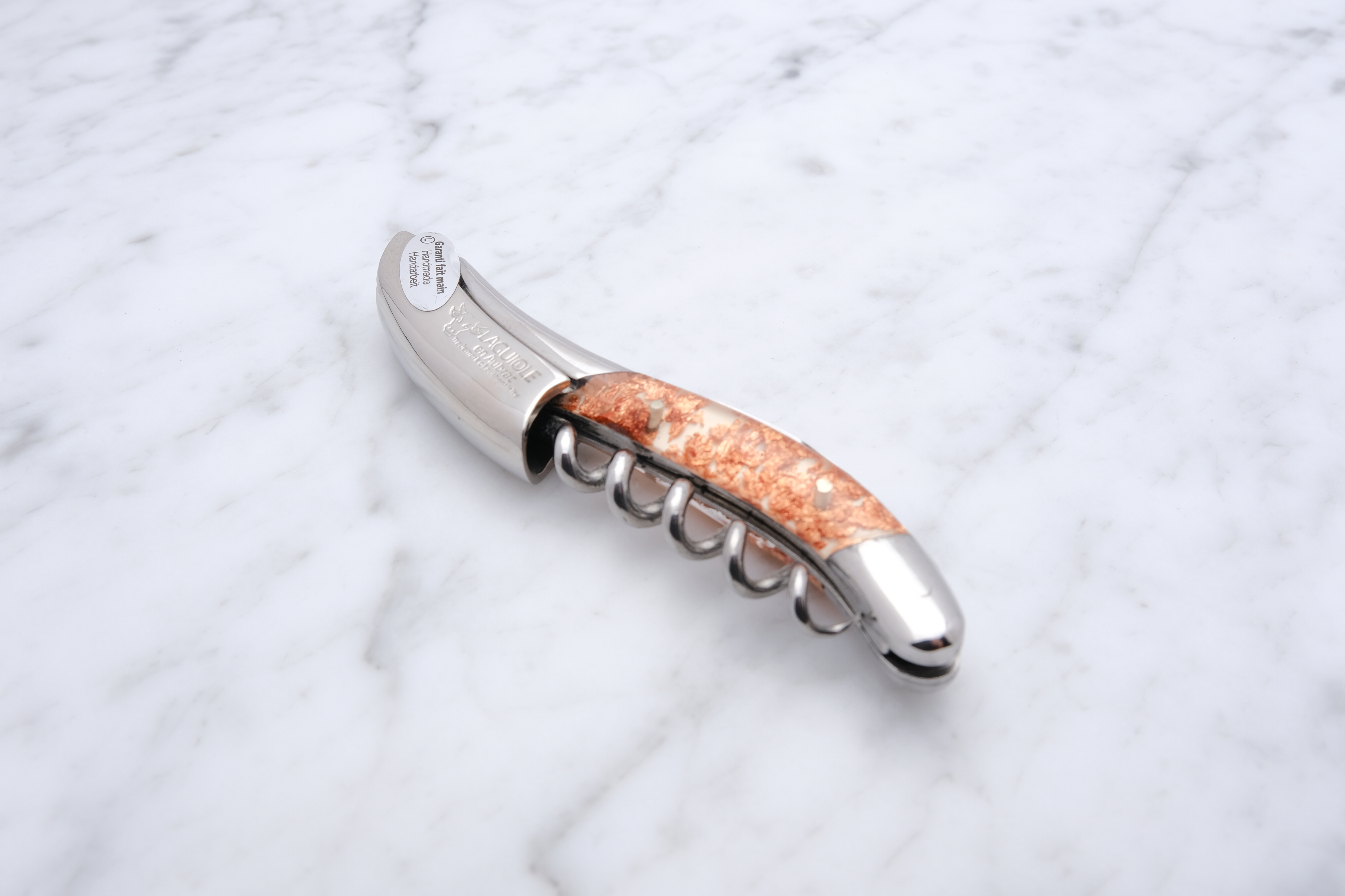 Corkscrew - Pailette Copper from Laguiole En Aubrac is a must-have tool for wine lovers. This sommelier corkscrew combines traditional craftsmanship with modern design, making it both functional and stylish. Since 1829, Laguiole En Aubrac has been synonymous with quality, and their corkscrews are no exception. The conical screw ensures smooth penetration into the cork, making opening wine bottles a breeze. The molded cap prevents it from loosening over time, guaranteeing durability and reliability. With its highly polished steel finish and copper details, this corkscrew is not only practical, but also an elegant accessory for any wine experience.