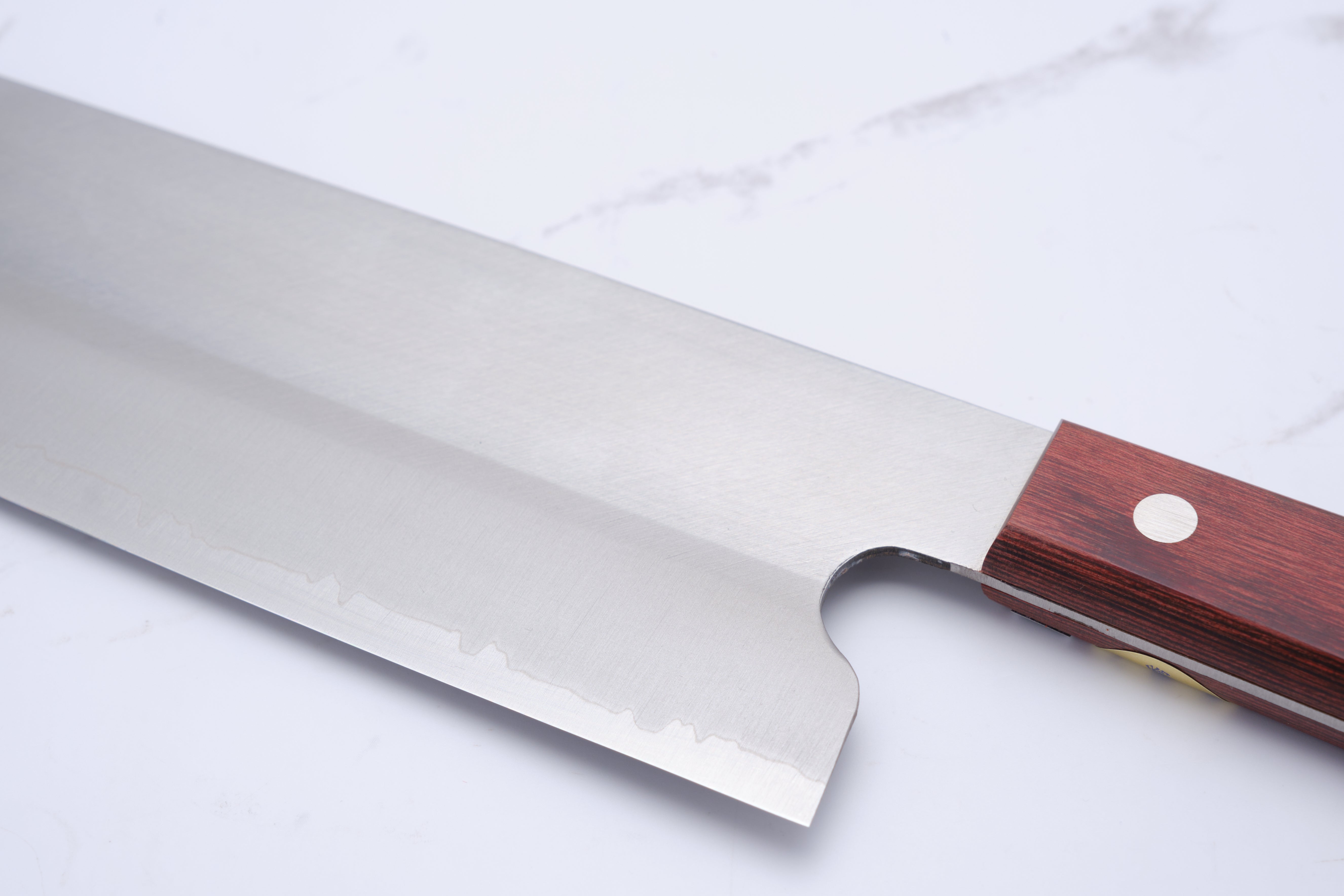 This series is built in 3 layers with Aogami 2 as core steel, surrounded by stainless cladding. The handle is western style, and made of red pakka wood.