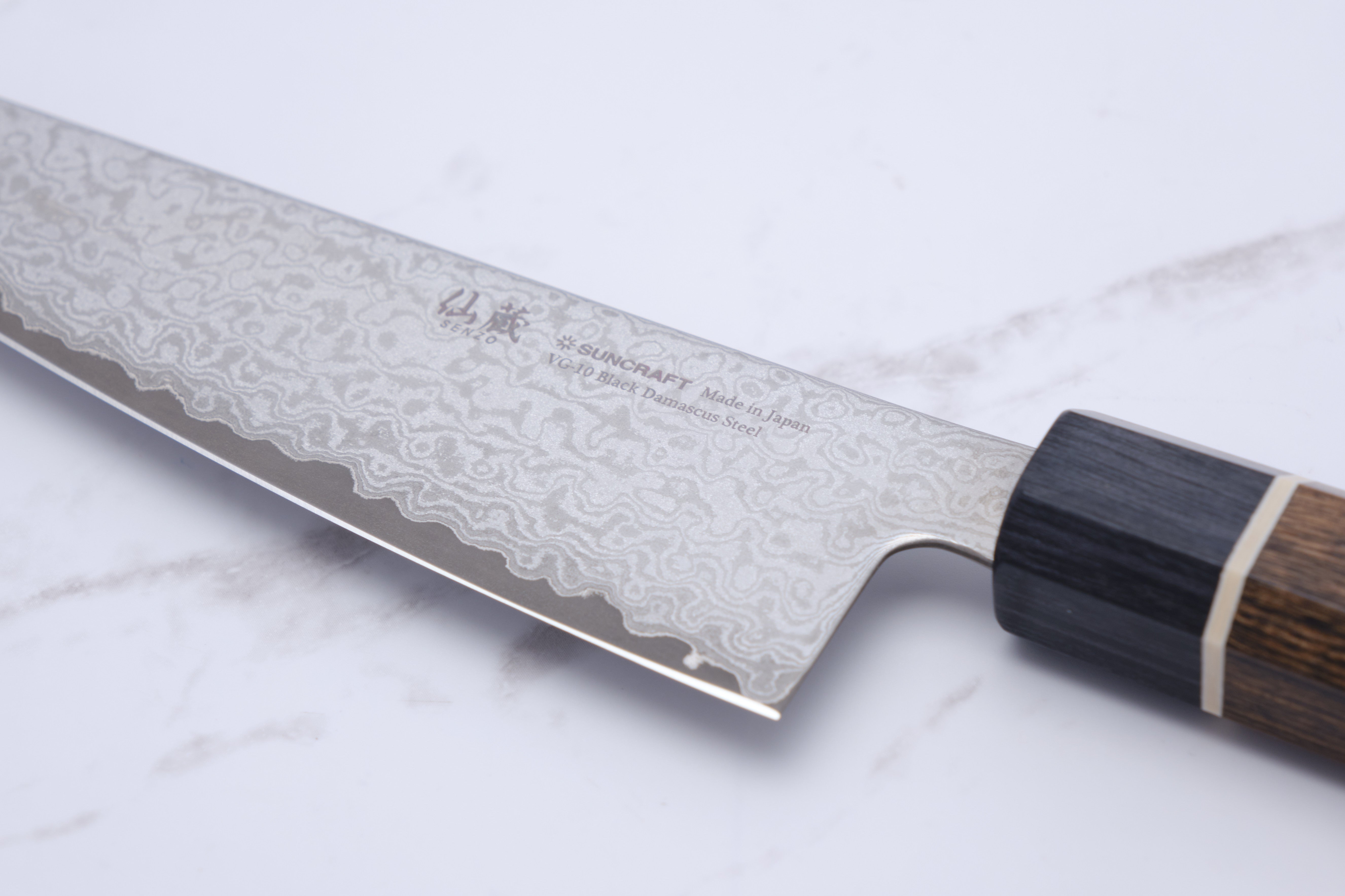 This series, Black, is built from 33 layers of damascus steel which is glass blown so that it gets the matte surface. The core steel is VG-10 which is not hardened crazy hard, so it is easier to deal with.