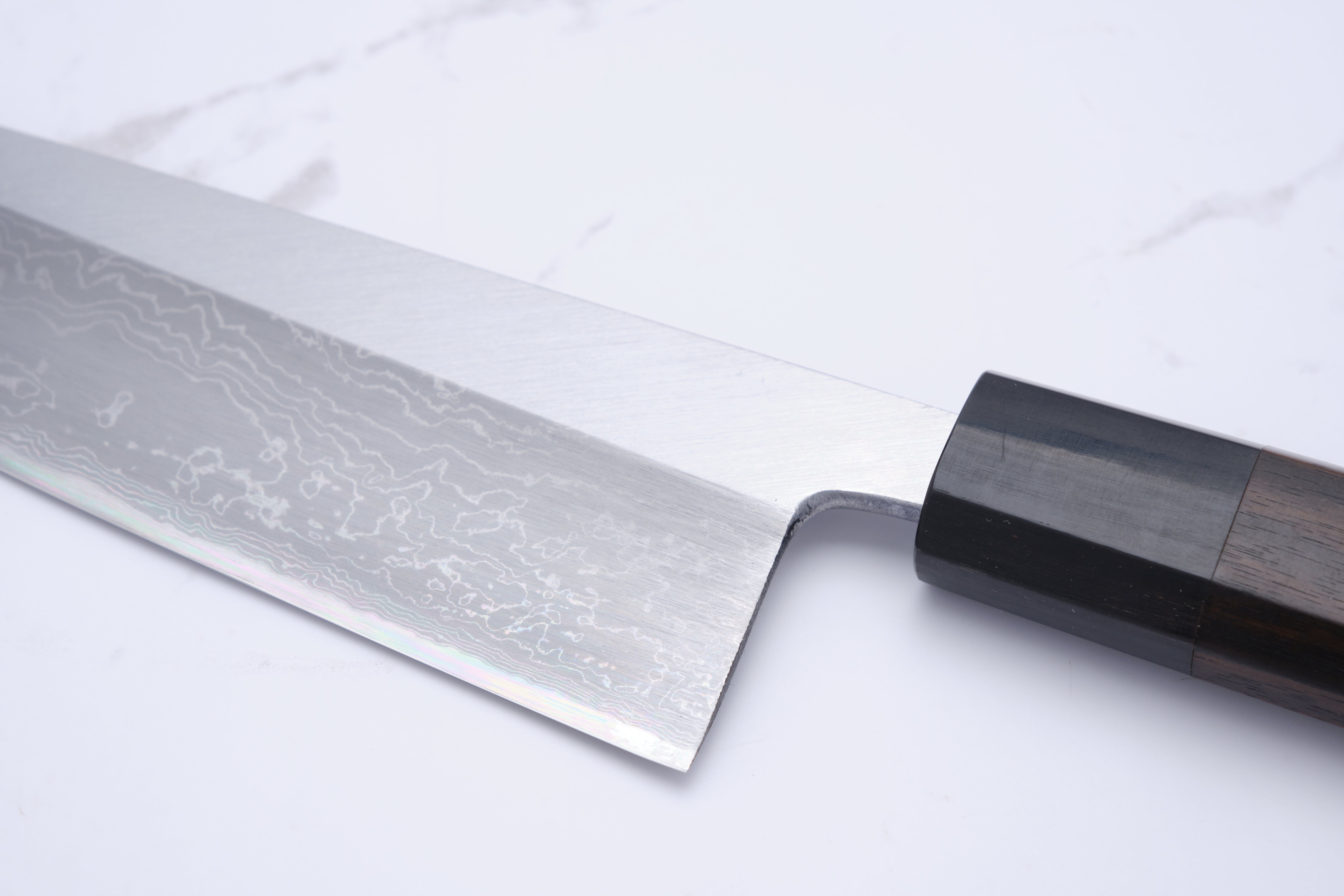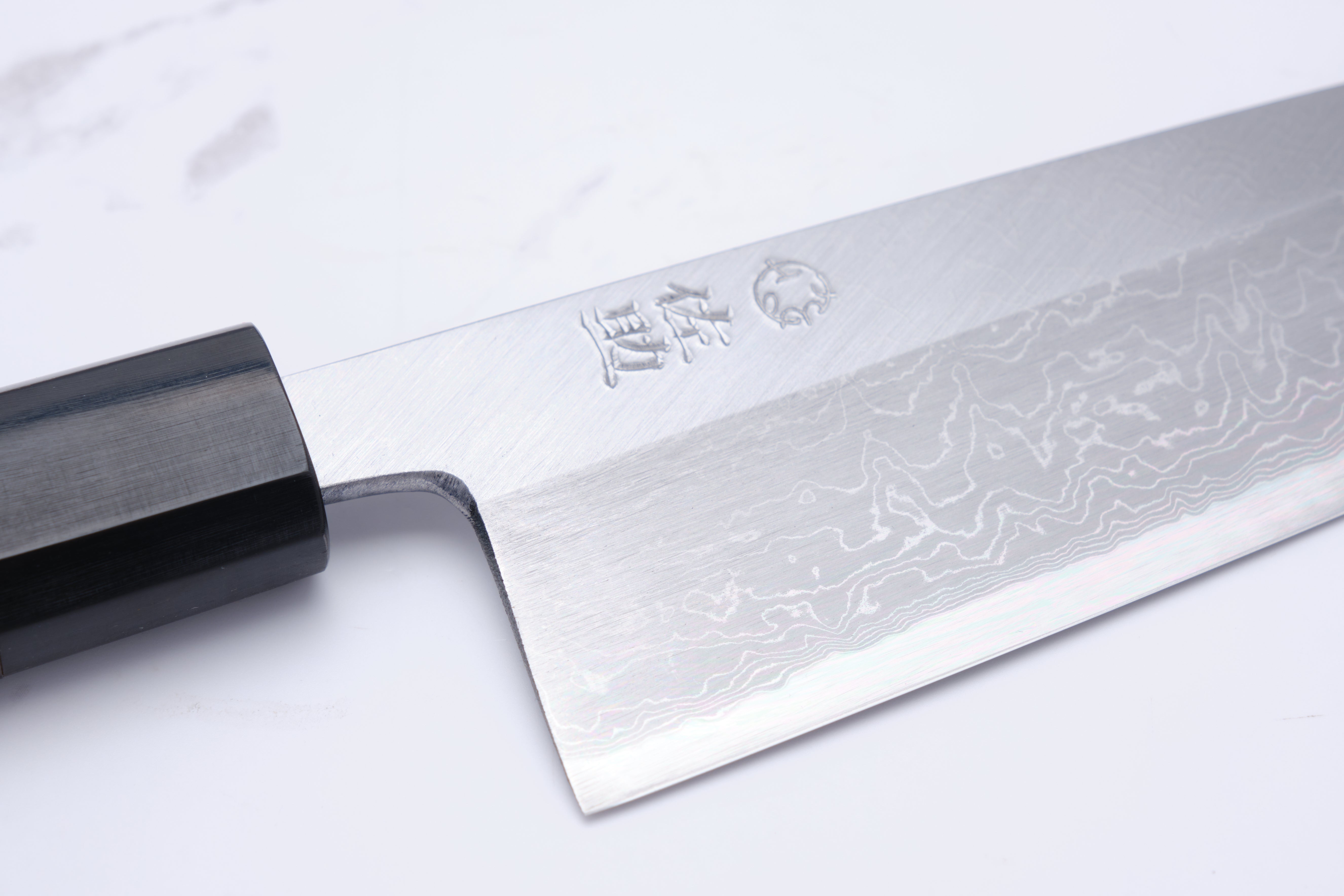 Sasuke's knives are built in 3 layers with Shirogami 2 as core steel, surrounded by soft damascus. They are finished with a migaki finish on the top of the blade, and a beautiful kasumi finish on the kireha. The handle is a Japanese handle made of ebony and buffalo horn.