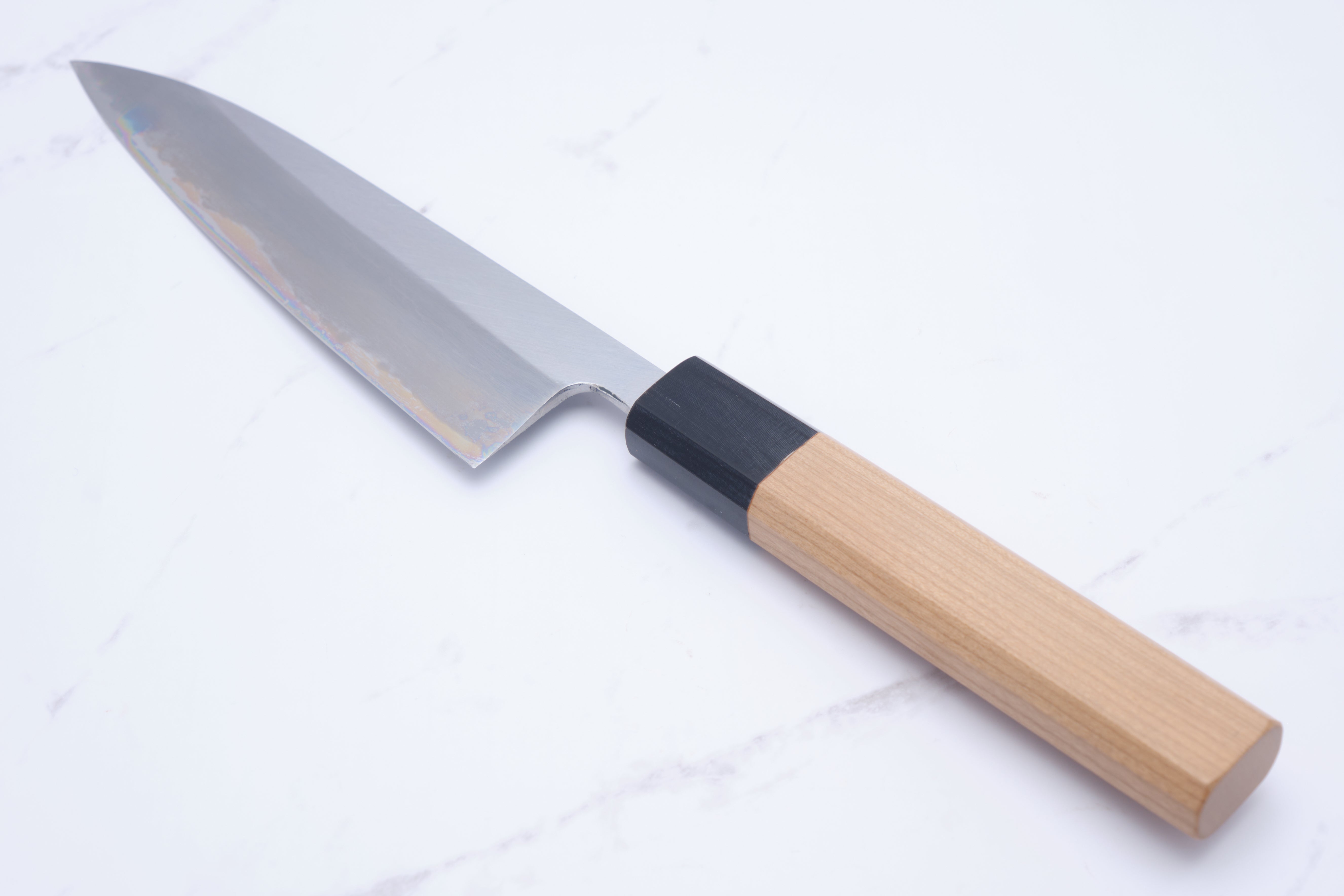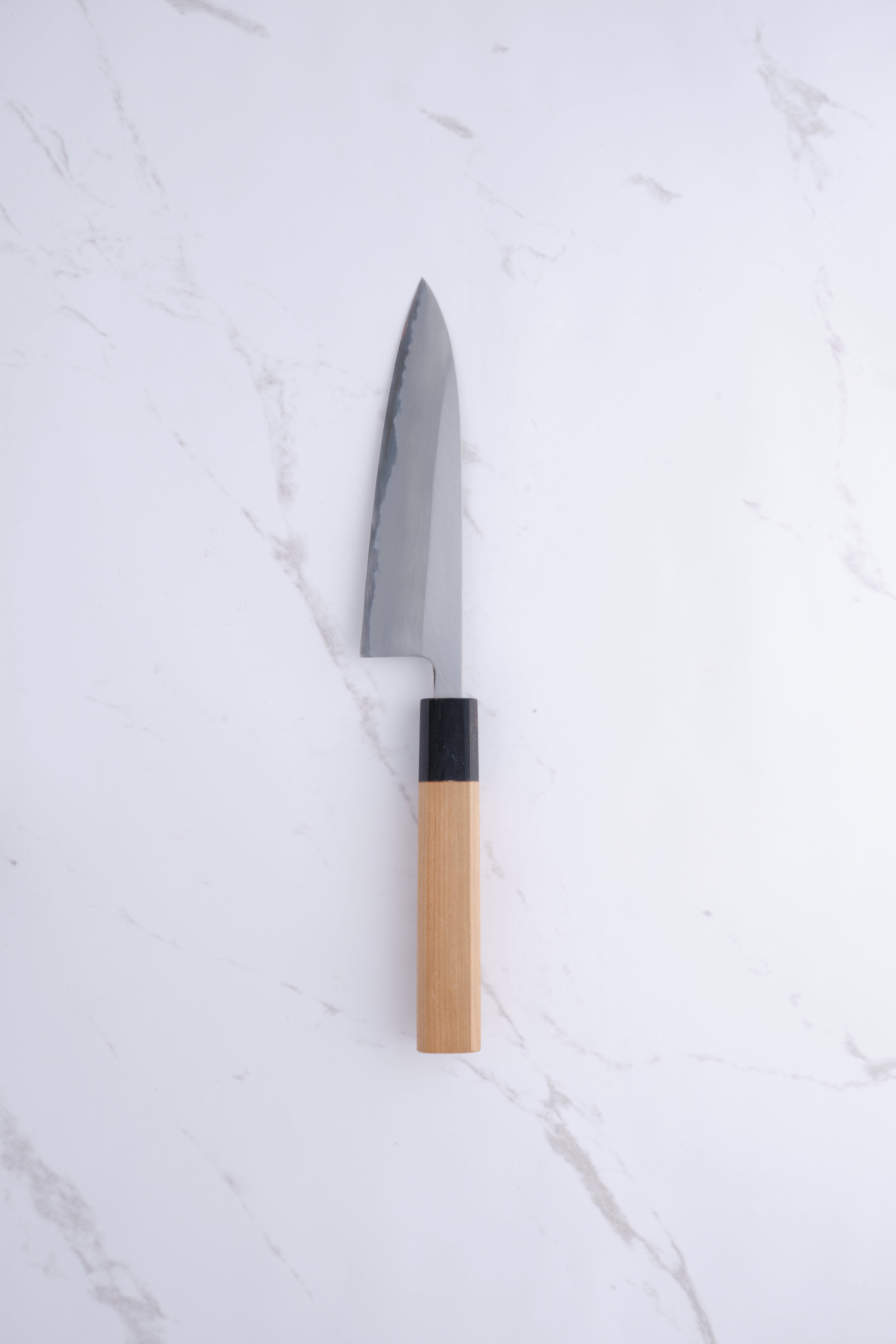 The Sasuke 140mm Santoku Shirogami 2 is a remarkable knife that combines traditional craftsmanship with modern design. Each knife has been meticulously handcrafted in Sakai, Japan, since 1867, ensuring exceptional quality and precision. With a core of Shirogami 2 steel, known for its ability to become extremely sharp and easy to sharpen, this knife offers unparalleled cutting ability. The unique taper, reminiscent of a samurai sword, provides optimal balance and control during use. The handle, made of walnut and buffalo horn, adds both beauty and comfort, making this knife a must-have for any food enthusiast.