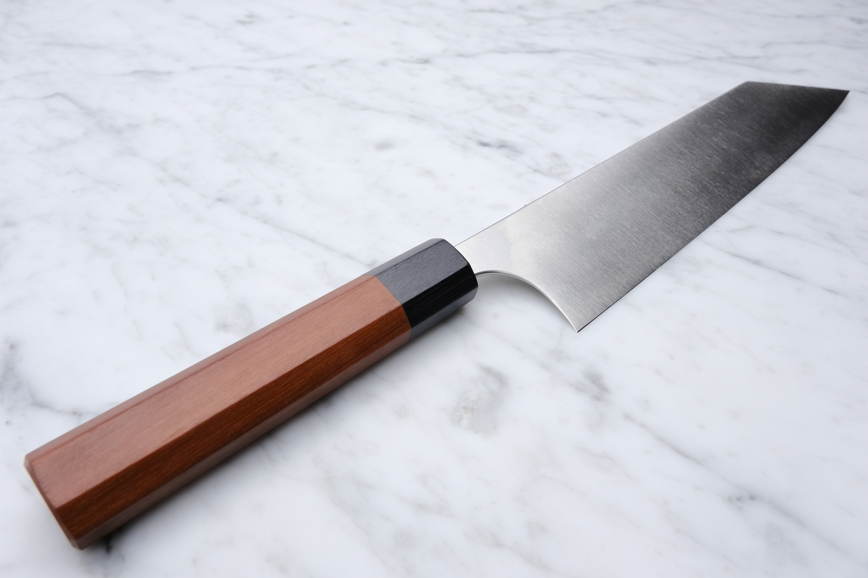 Takayuki Shibata is a renowned sharpener from Fukuyama City in Hiroshima, Japan. On his unique knives, performance is often the focus, as he grinds them extremely thin, allowing them to almost melt through the material being cut.