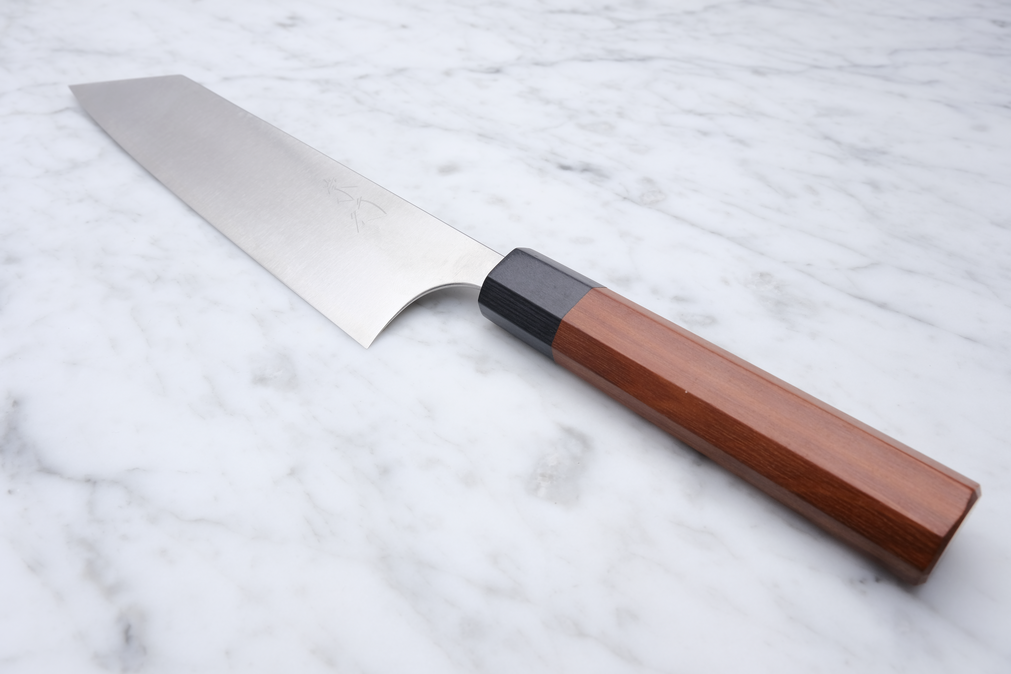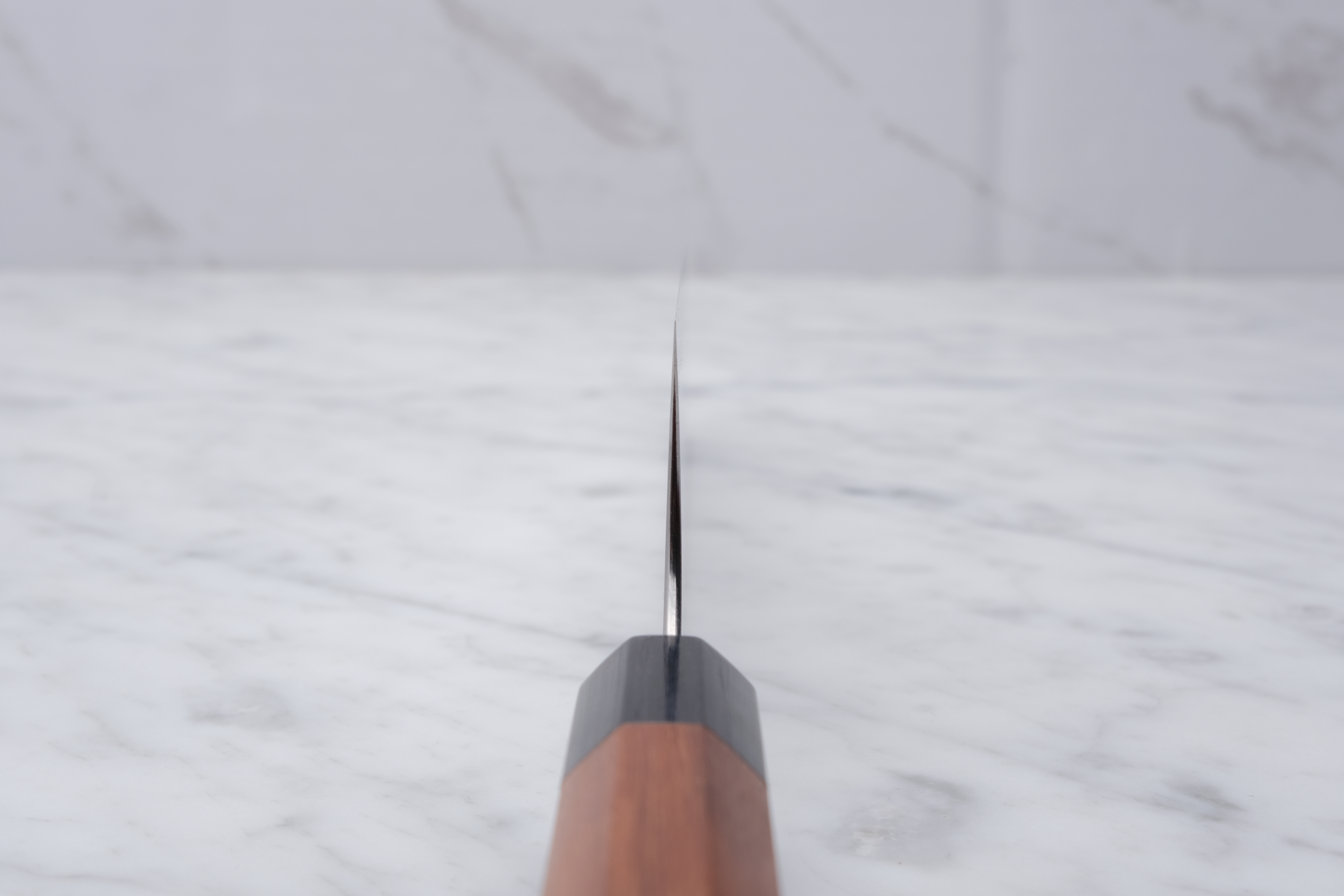 Forged by the incredibly skilled Ikeda-san in 3 layers with SG2 at the core, which Shibata-san has ground to be as thin as possible. This means that the edge of the knife will last long due to the hard core steel, and it will cut fantastically because of the top-notch sharpening, but it also means that the knife becomes quite fragile, so one should think twice before cutting into overly hard materials.