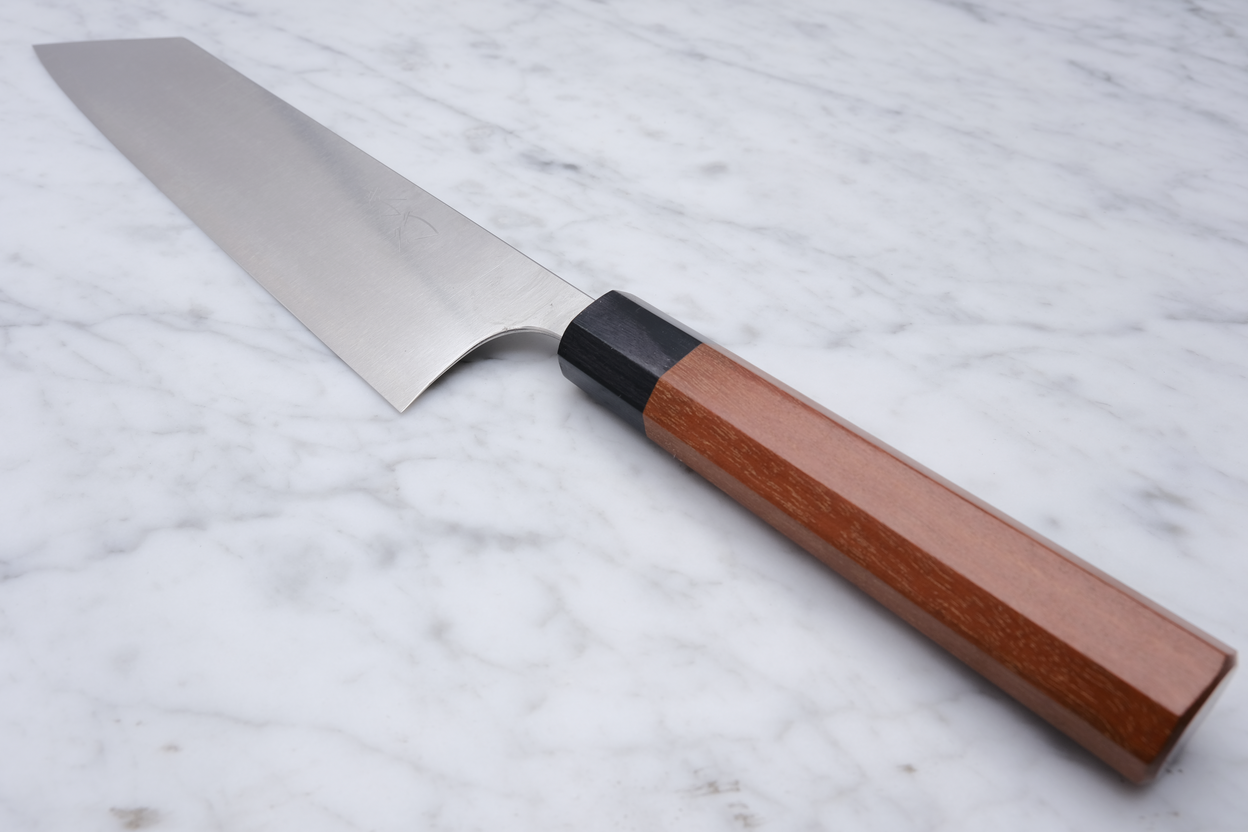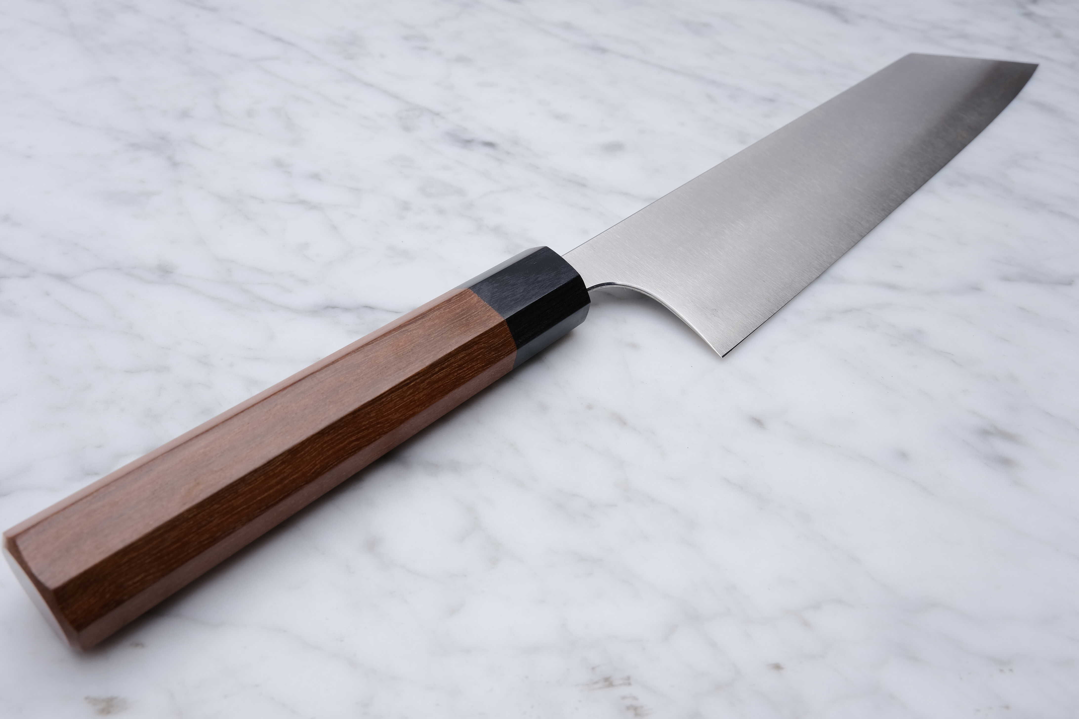 Forged by the incredibly talented Ikeda-san in 3 layers with SG2 at the core which Shibata-san has ground almost as thin as it can be. This means that the edge on the knife will last a long time due to the hard core steel, and that it will cut fantastically due to the excellent sharpening, but it also means that the knife will therefore be quite fragile, so you have to think twice before you start cutting in far too hard subjects.