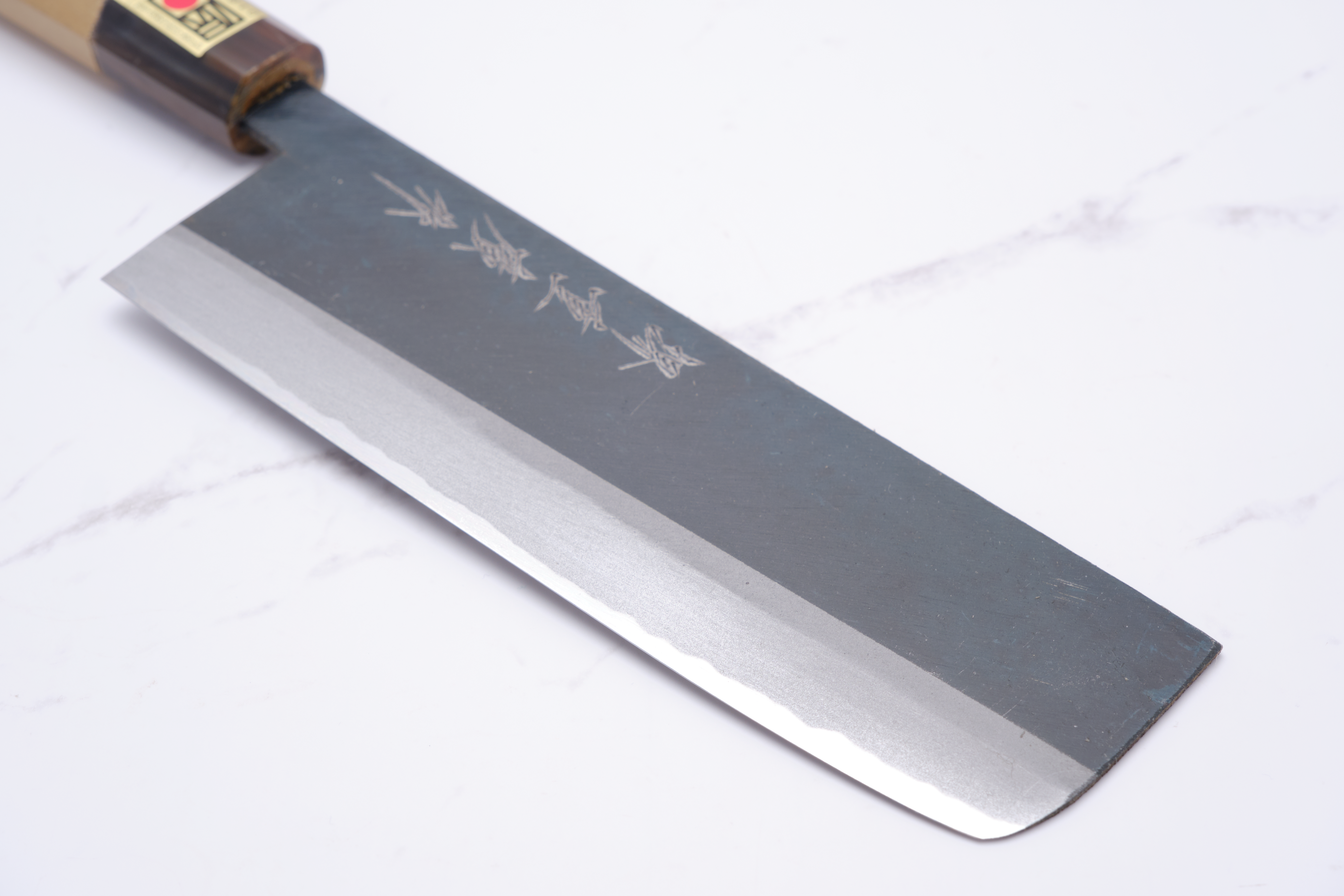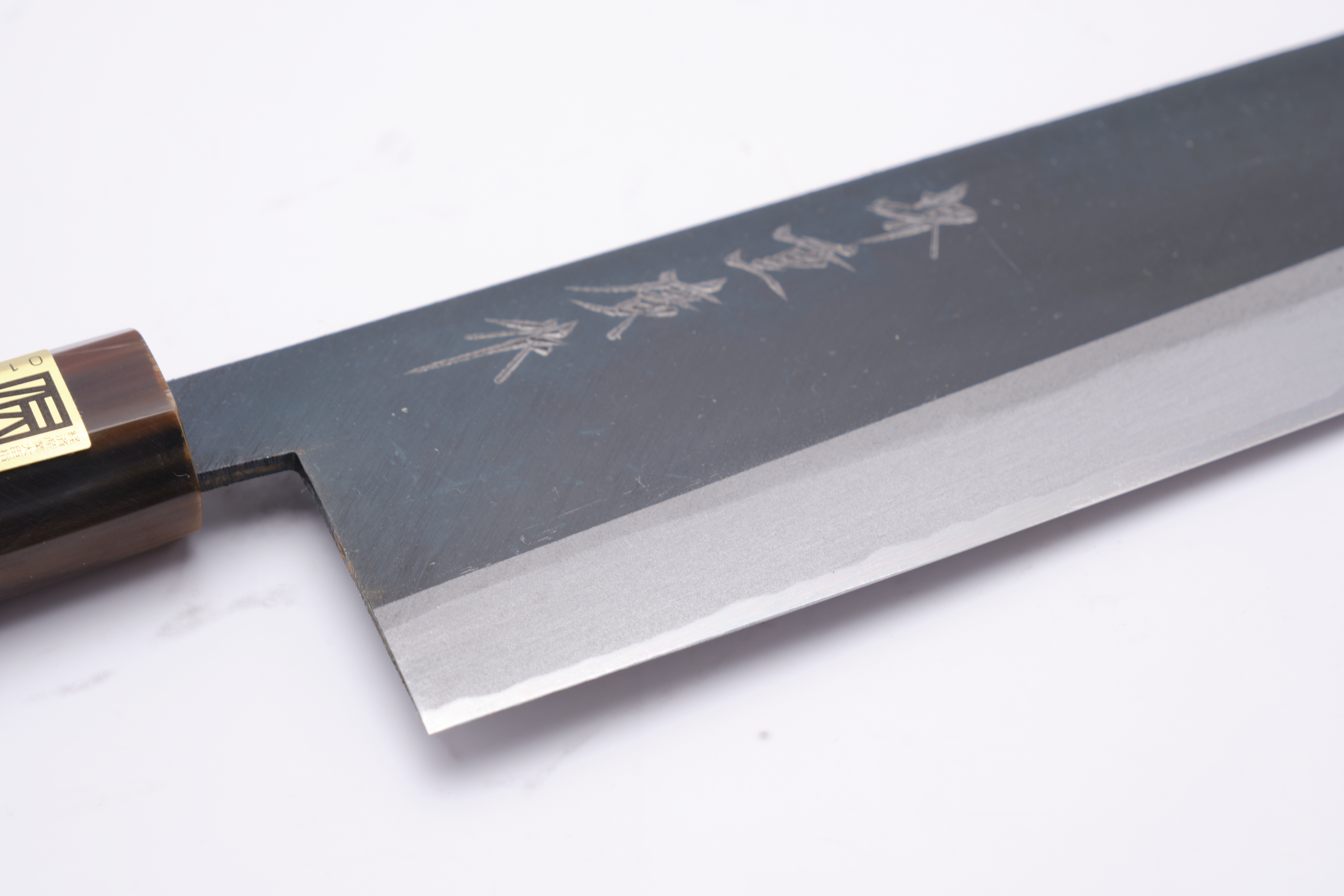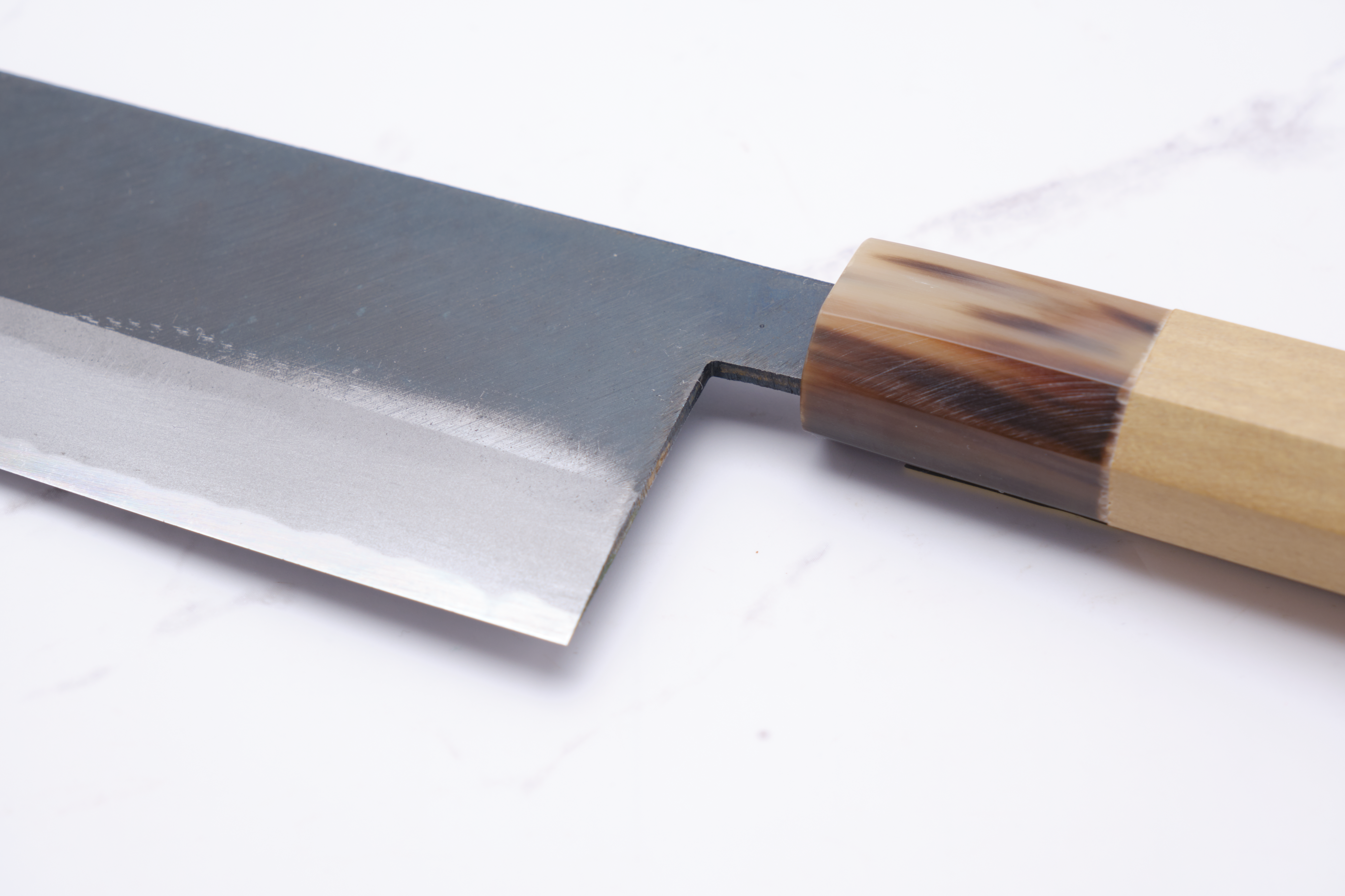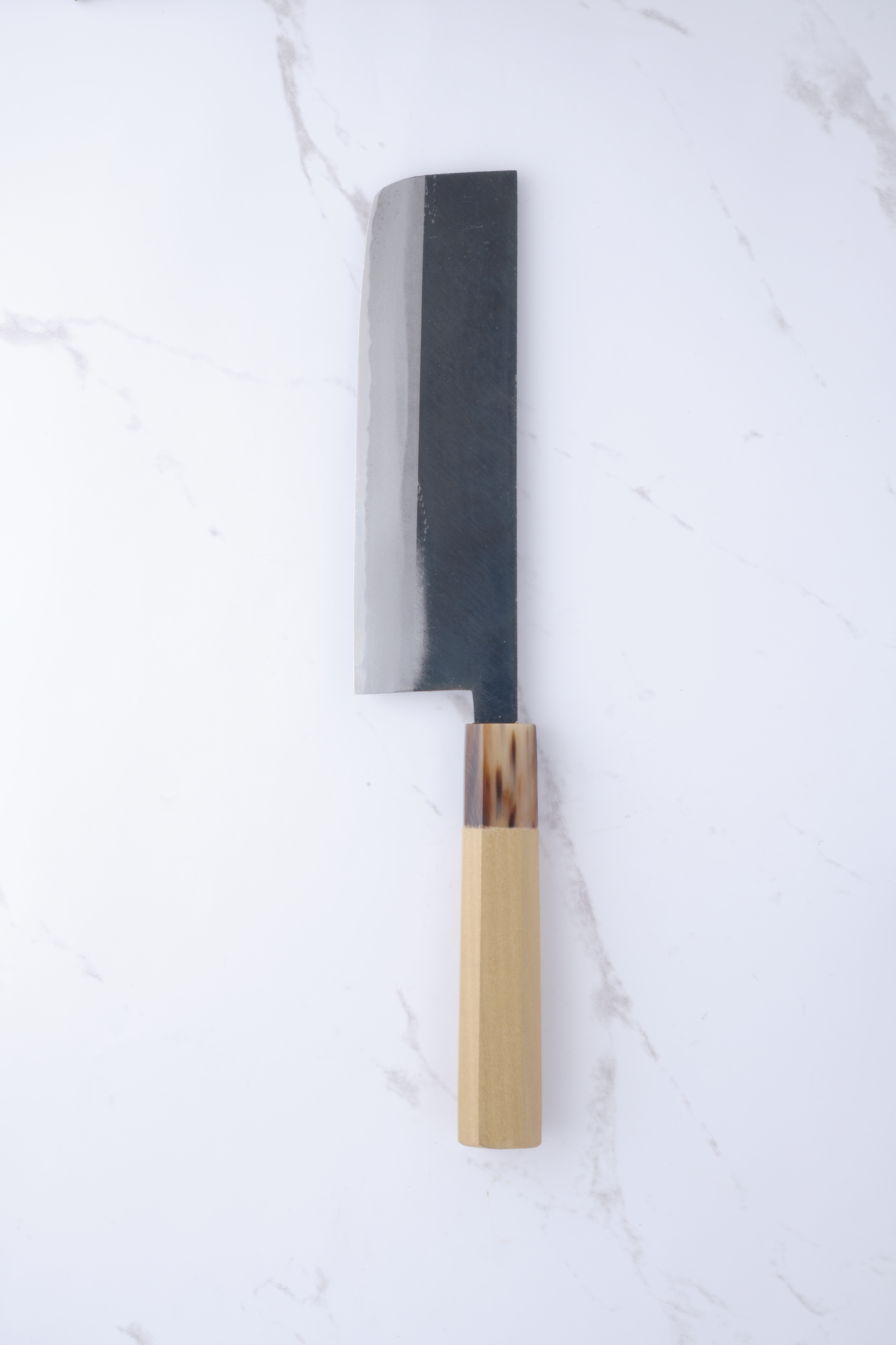 The knives are forged by Yoshikazu Ikeda and have a core of shirogami-2 - what we also call white steel. White steel is a so-called carbon steel, so it will rust if you do not care for the knife correctly. In practice, it applies to wipe your knife immediately after use, and to lubricate the knife blade in oil - e.g. camellia oil as it will also protect against oxidation. The advantage of the white steel, on the other hand, is that it can be ground very finely, and finer than blue steel and stainless alloys.