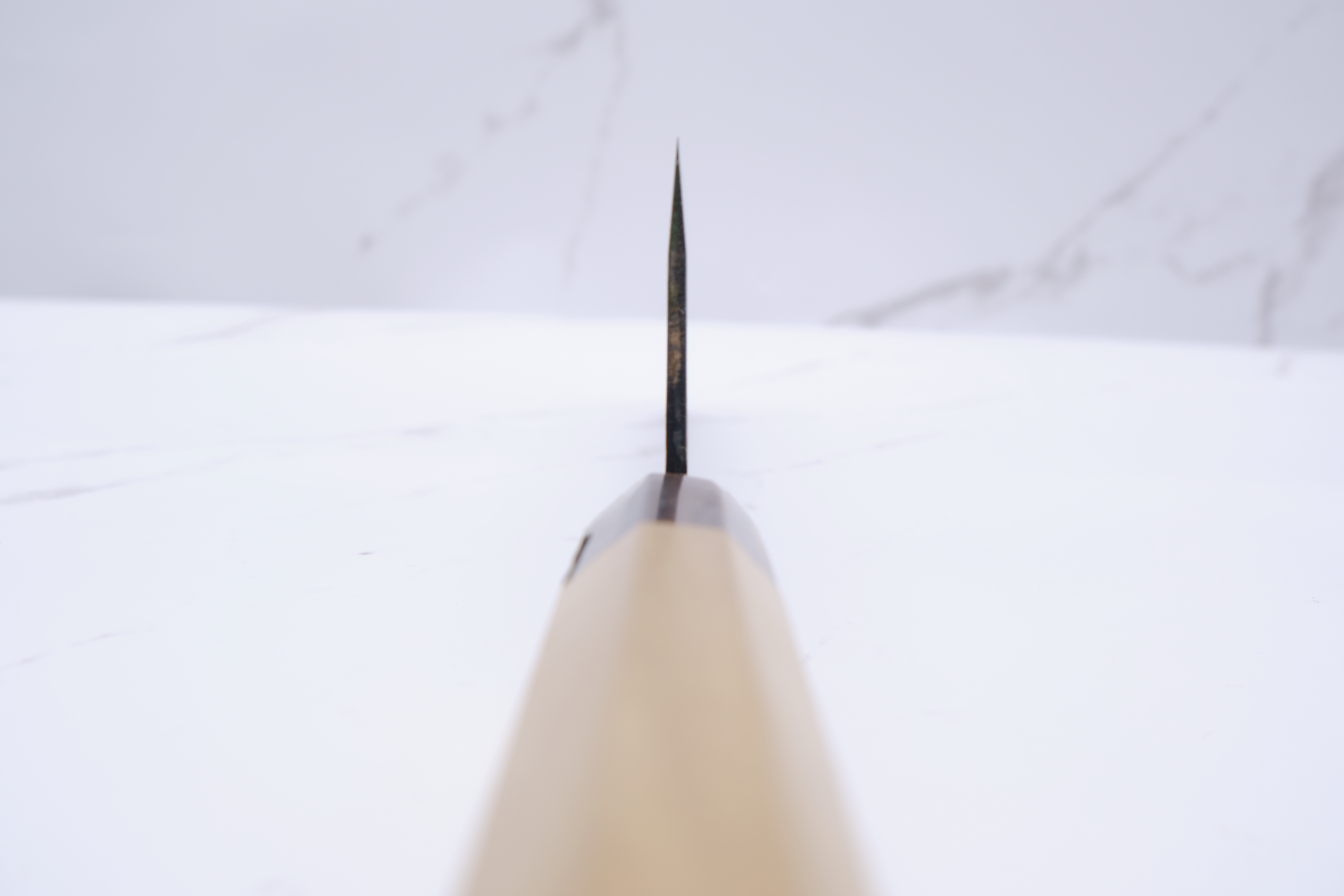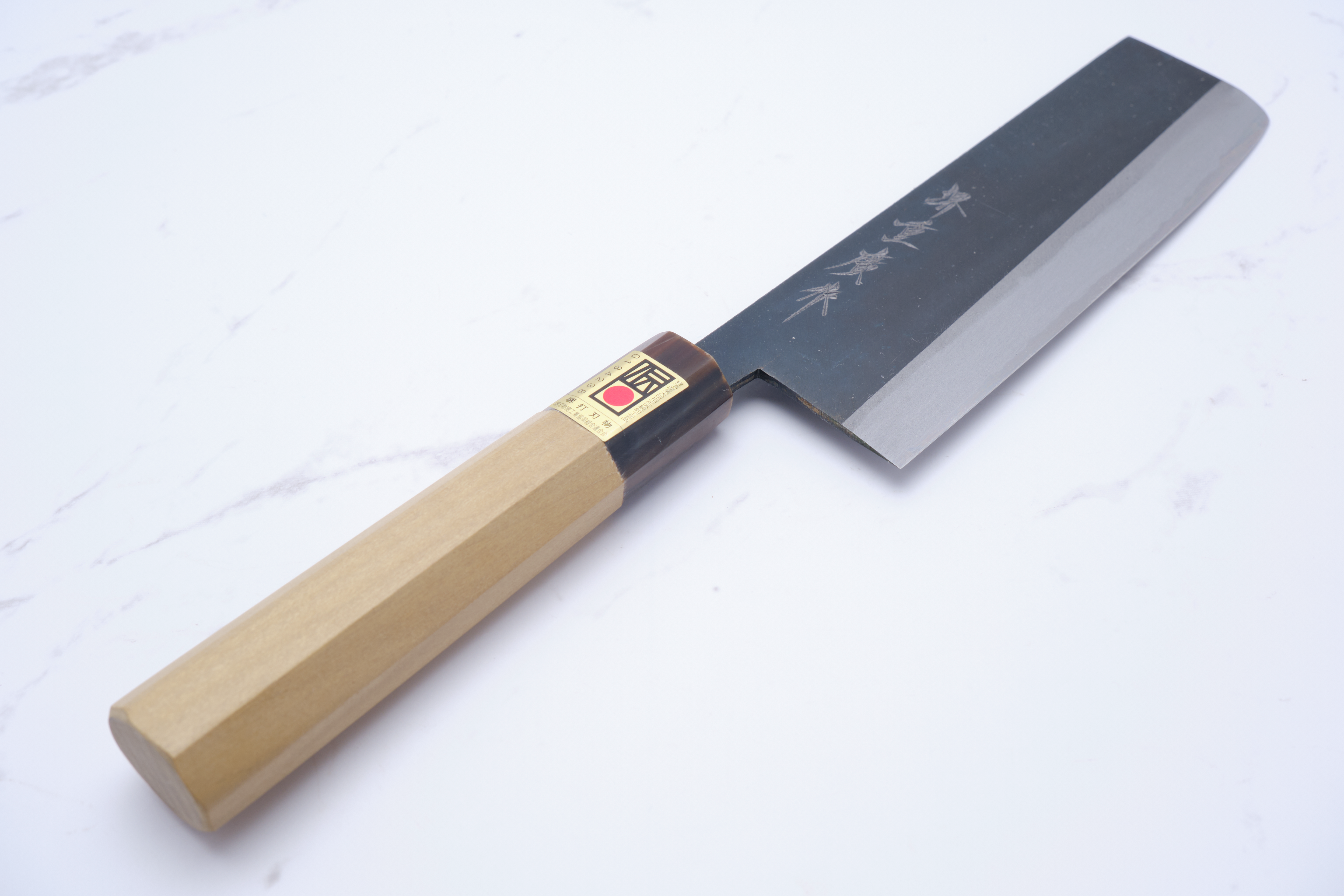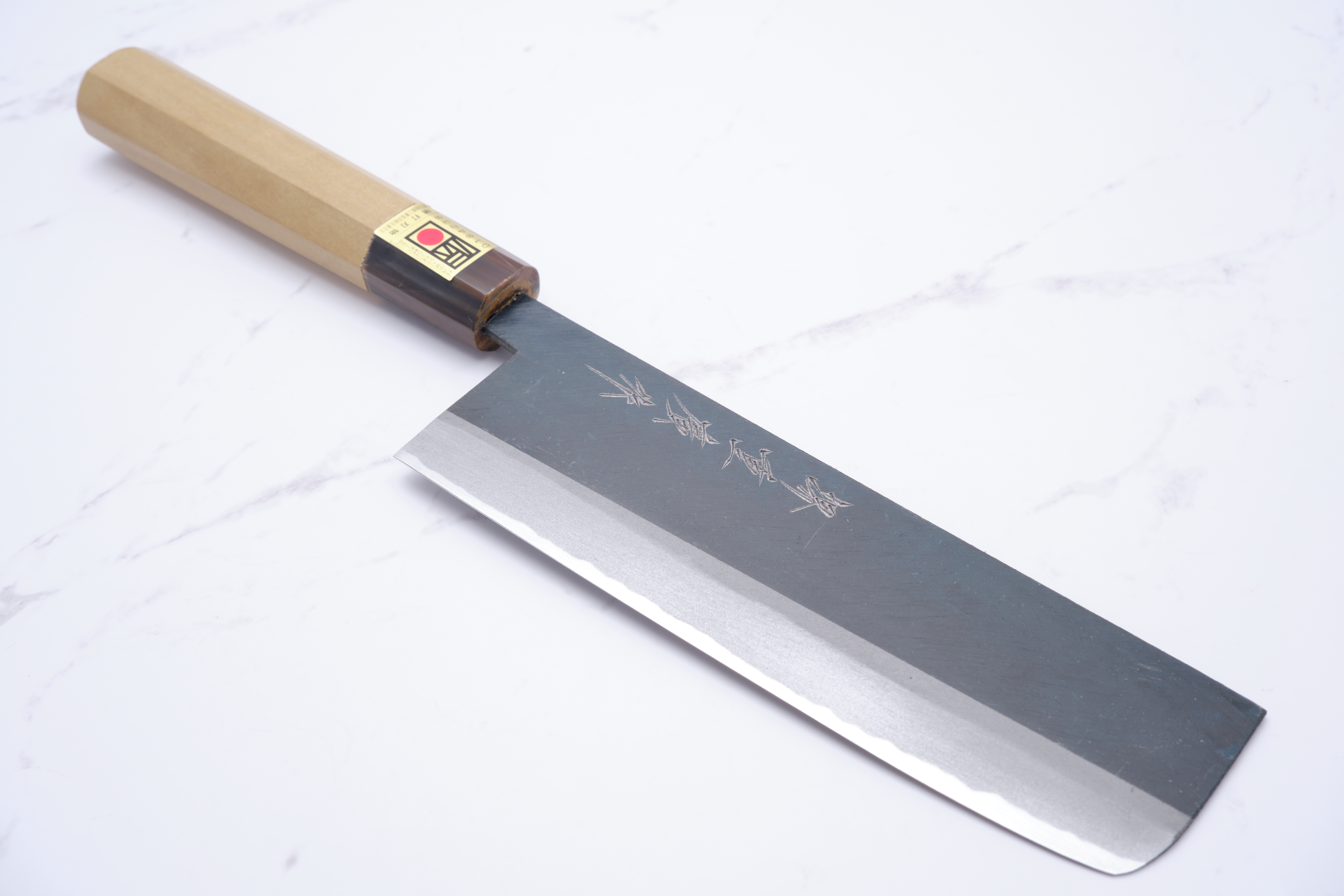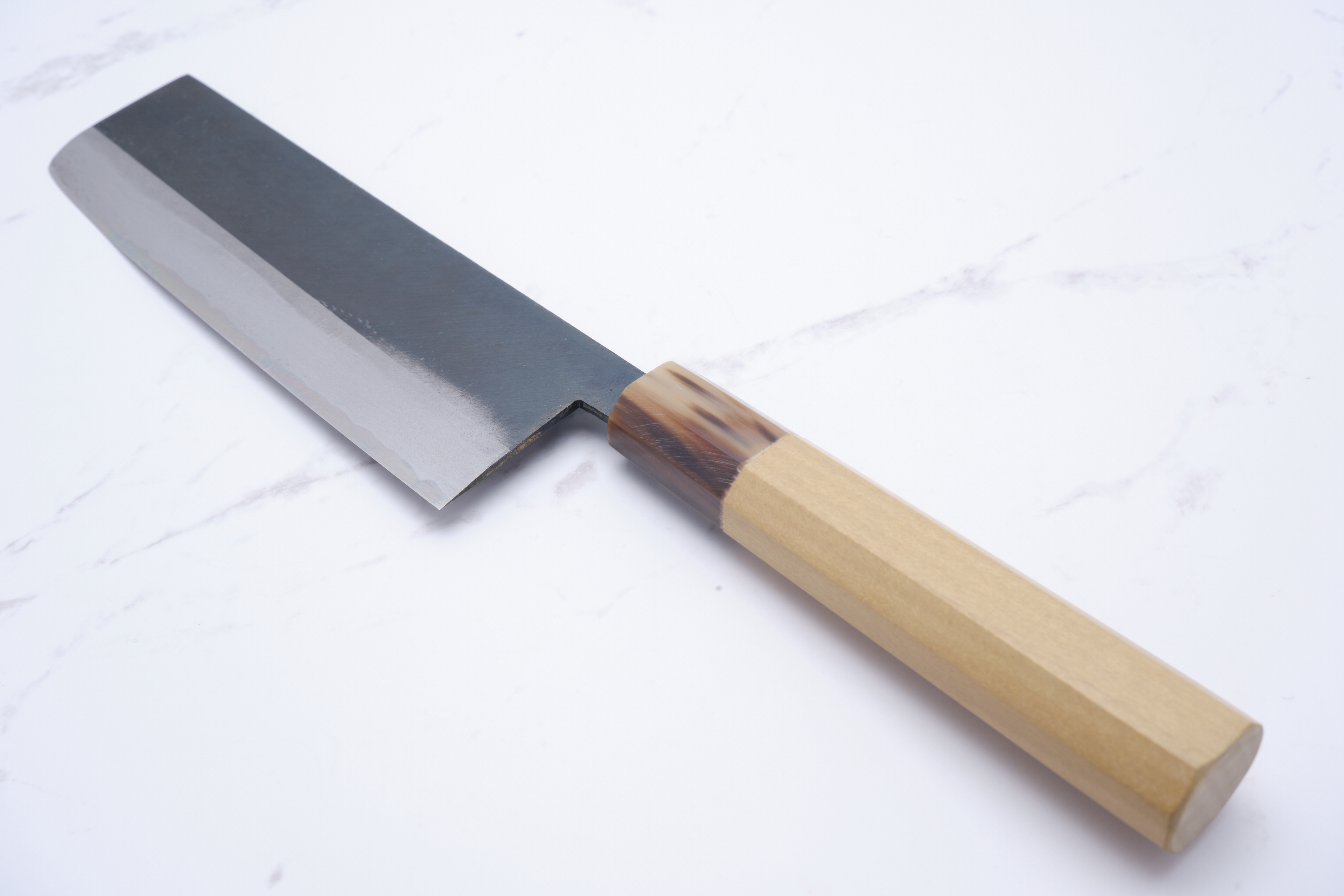 The knives are forged by Yoshikazu Ikeda and have a core of shirogami-2 - what we also call white steel. White steel is a so-called carbon steel, so it will rust if you do not care for the knife correctly. In practice, it applies to wipe your knife immediately after use, and to lubricate the knife blade in oil - e.g. camellia oil as it will also protect against oxidation. The advantage of the white steel, on the other hand, is that it can be ground very finely, and finer than blue steel and stainless alloys.