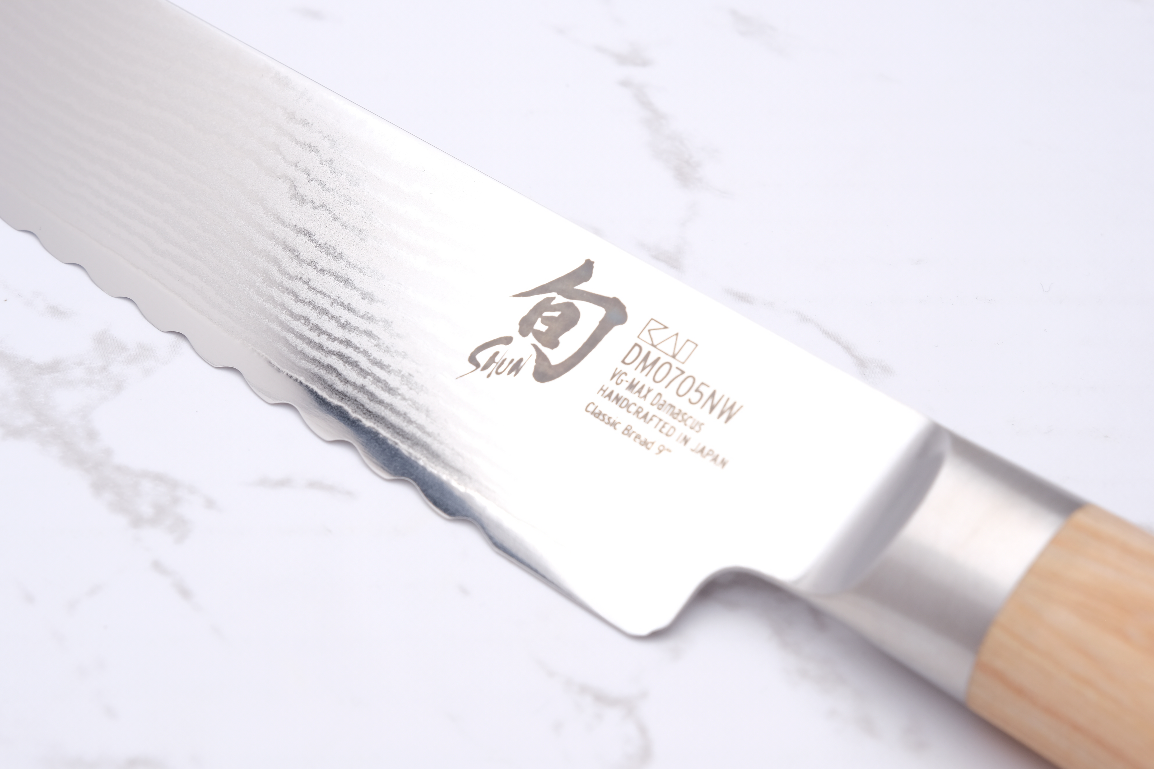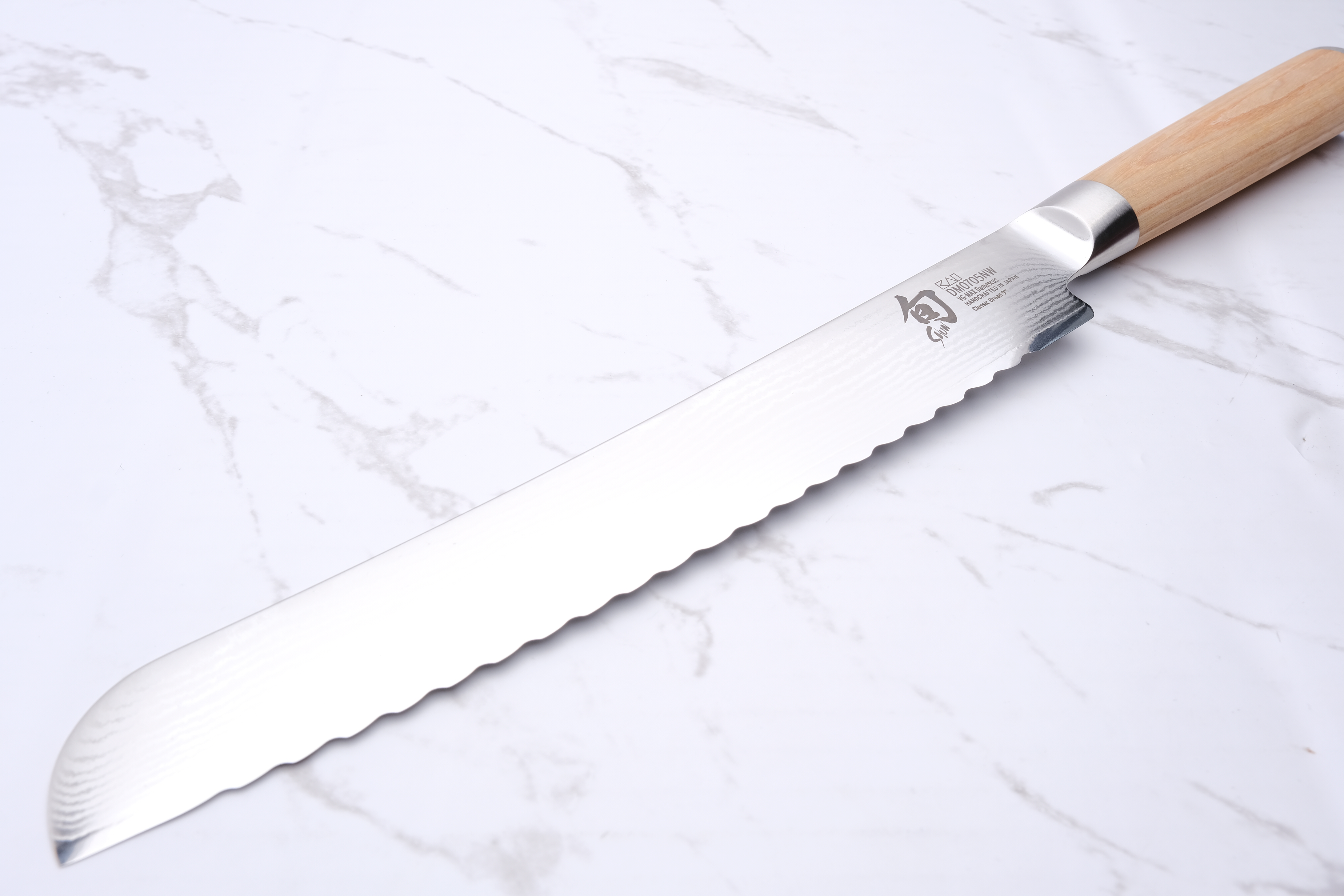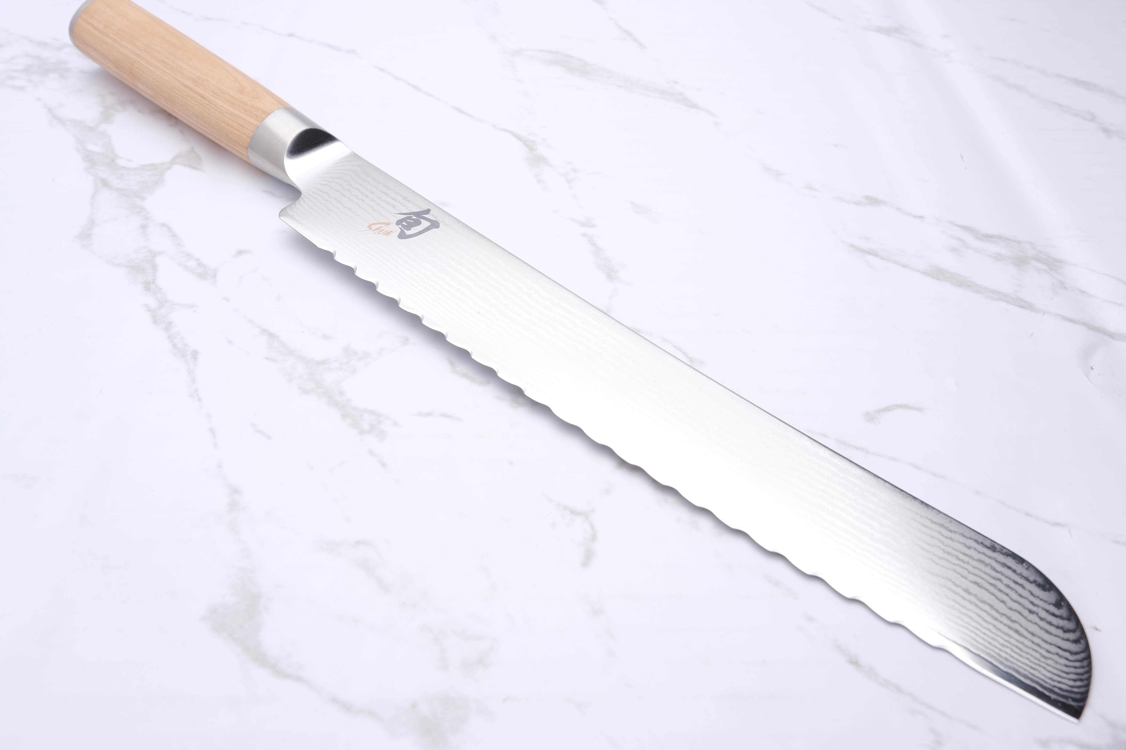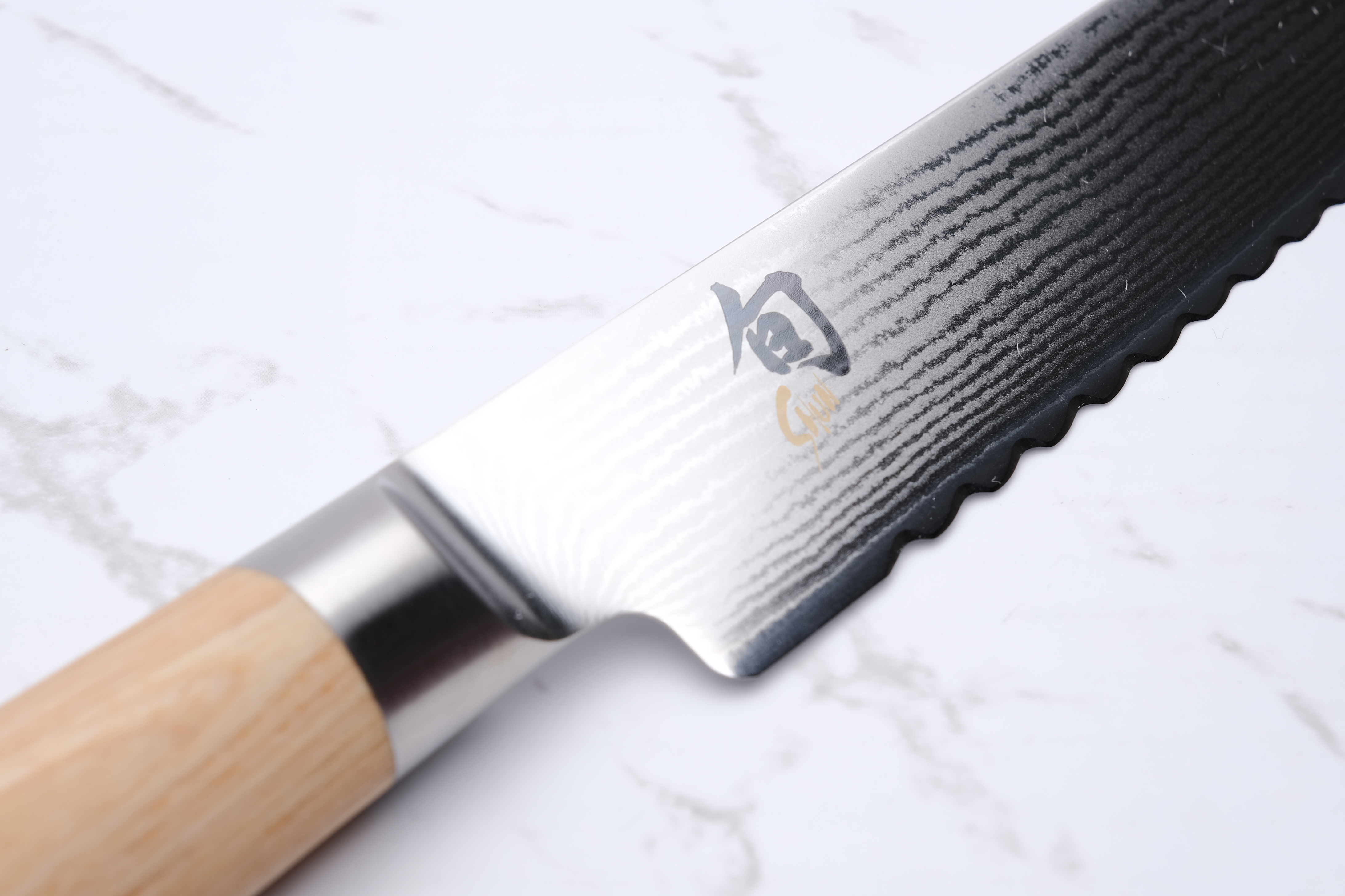 The bread knives from KAI Shun have the unique feature that the wavy edge changes direction halfway along the blade. (See picture 2) This makes the serrations more robust against "chipping" than if they were classically sharpened, and that the knife cuts both when it works forwards and backwards.