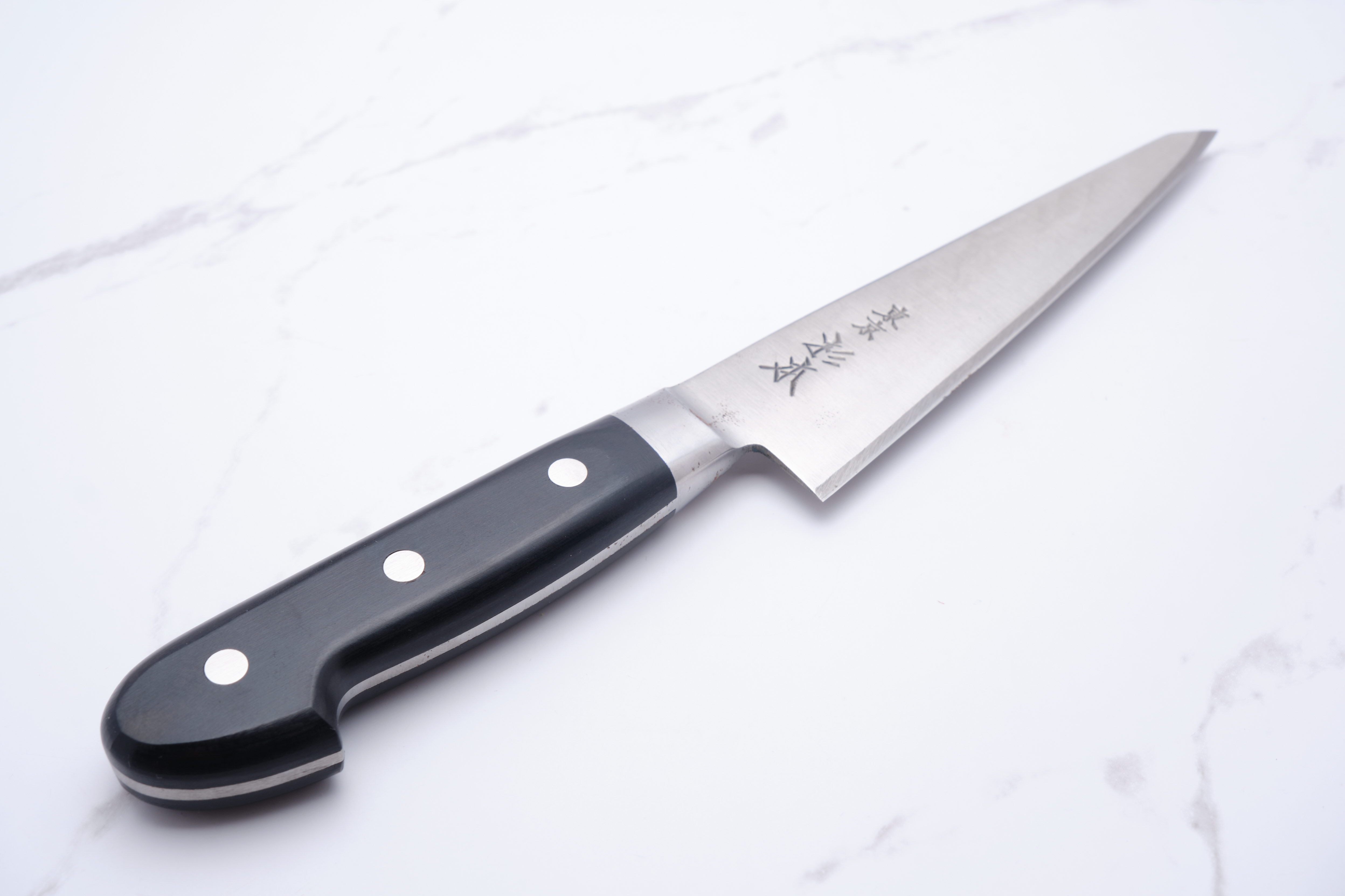 With its HM series, Sugimoto Hamono from Tokyo has united the classic Western design with traditional Japanese carbon steel and a pure right-hand grind. In the pictures of the knife here, you can clearly see the high egg on the right side, and we must therefore emphasize for the sake of clarity that this knife is only suitable for right-handed people.