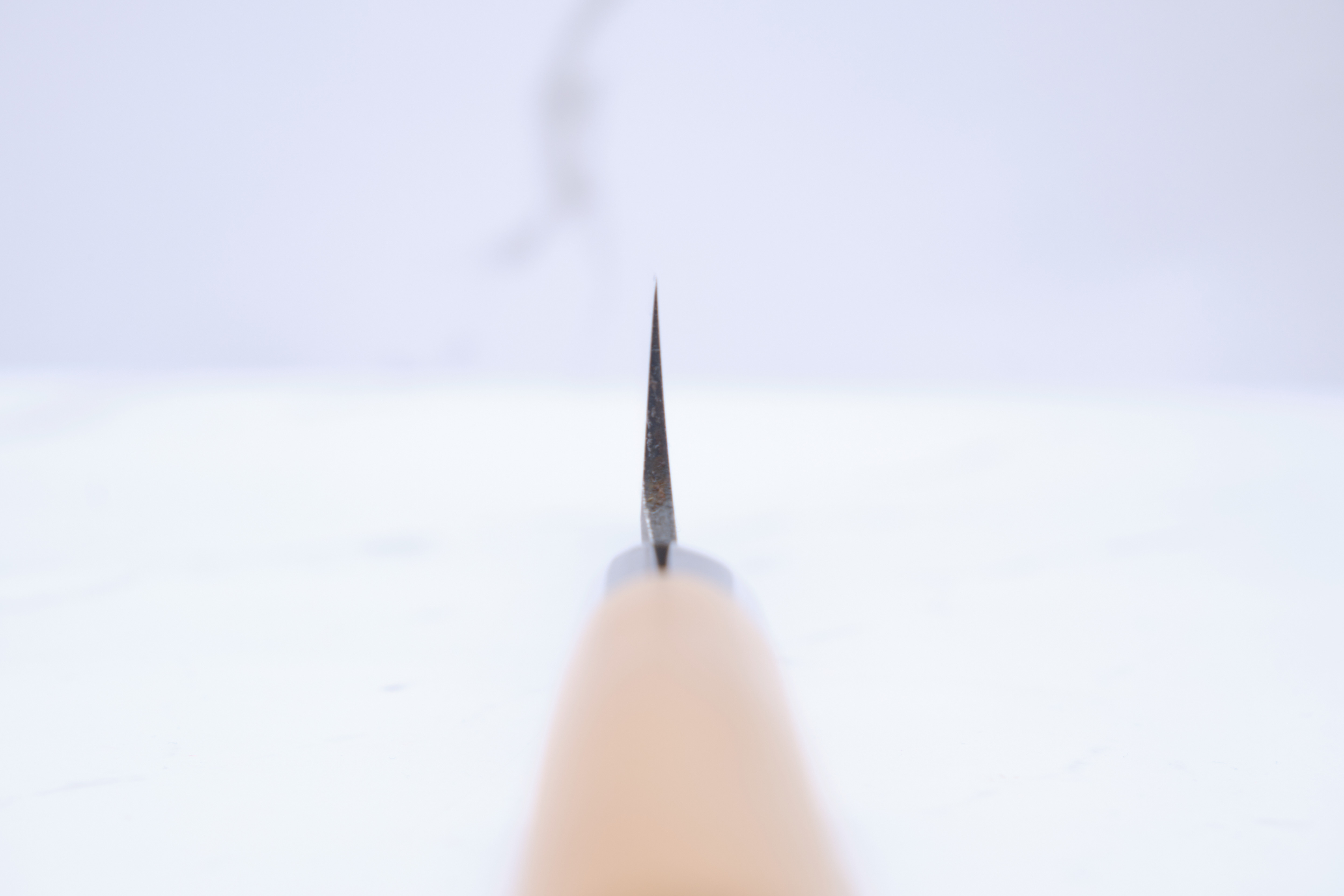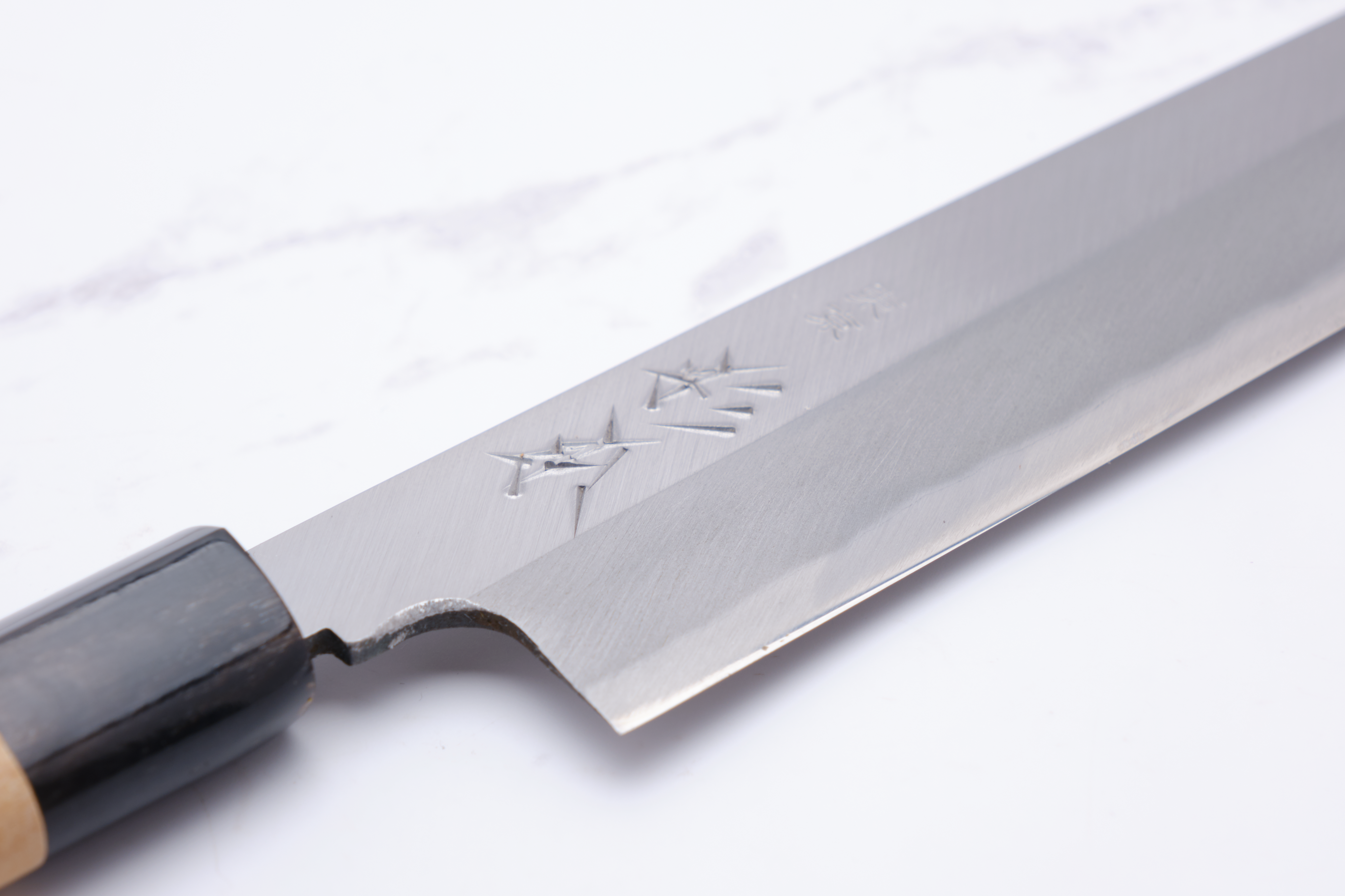 Sugimoto does not state the specific type of steel on this series, but describes the steel as being of high purity and the consequent risk of rust - therefore expect a knife that behaves like that of the shirogami. It is delicate and will patina very easily.