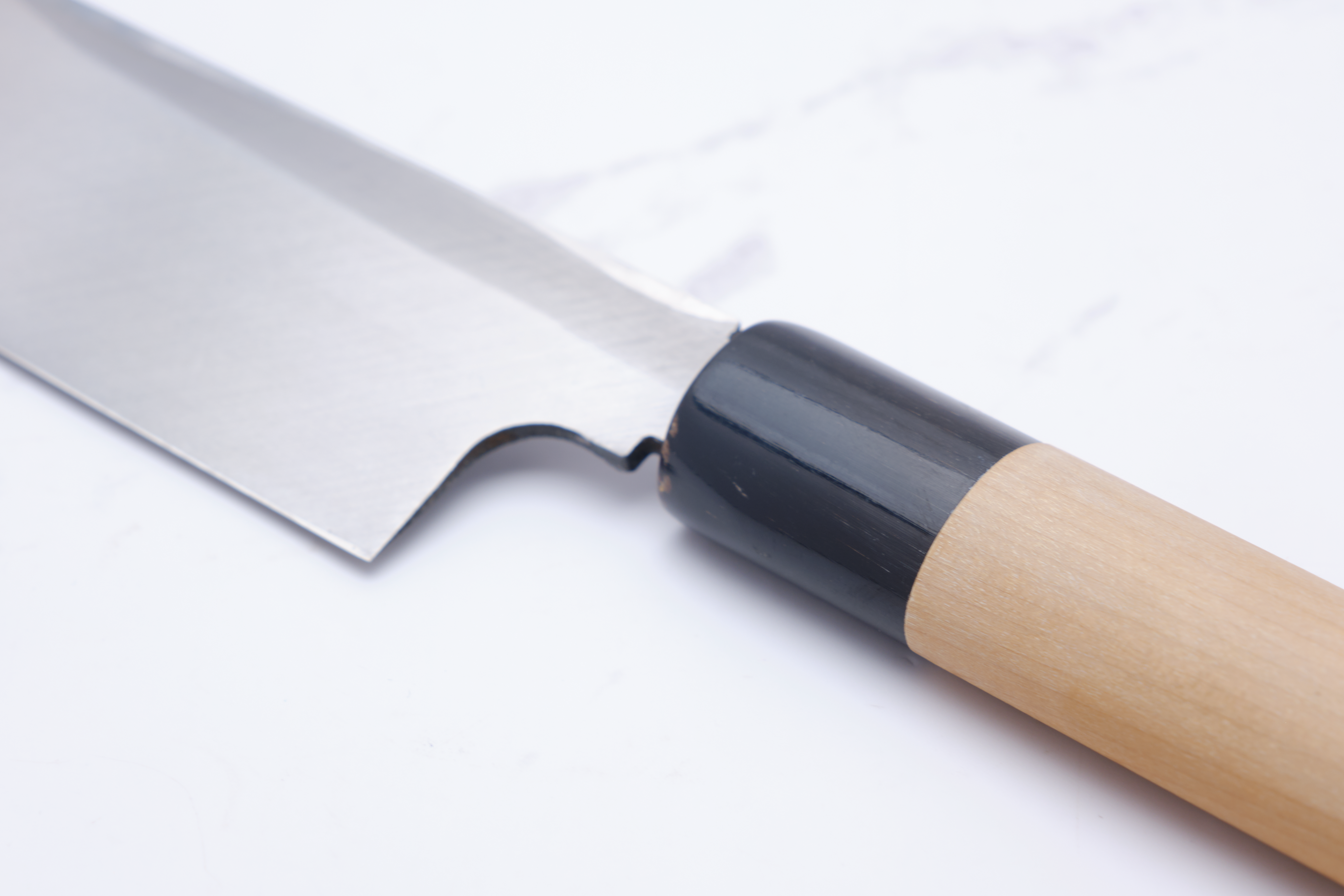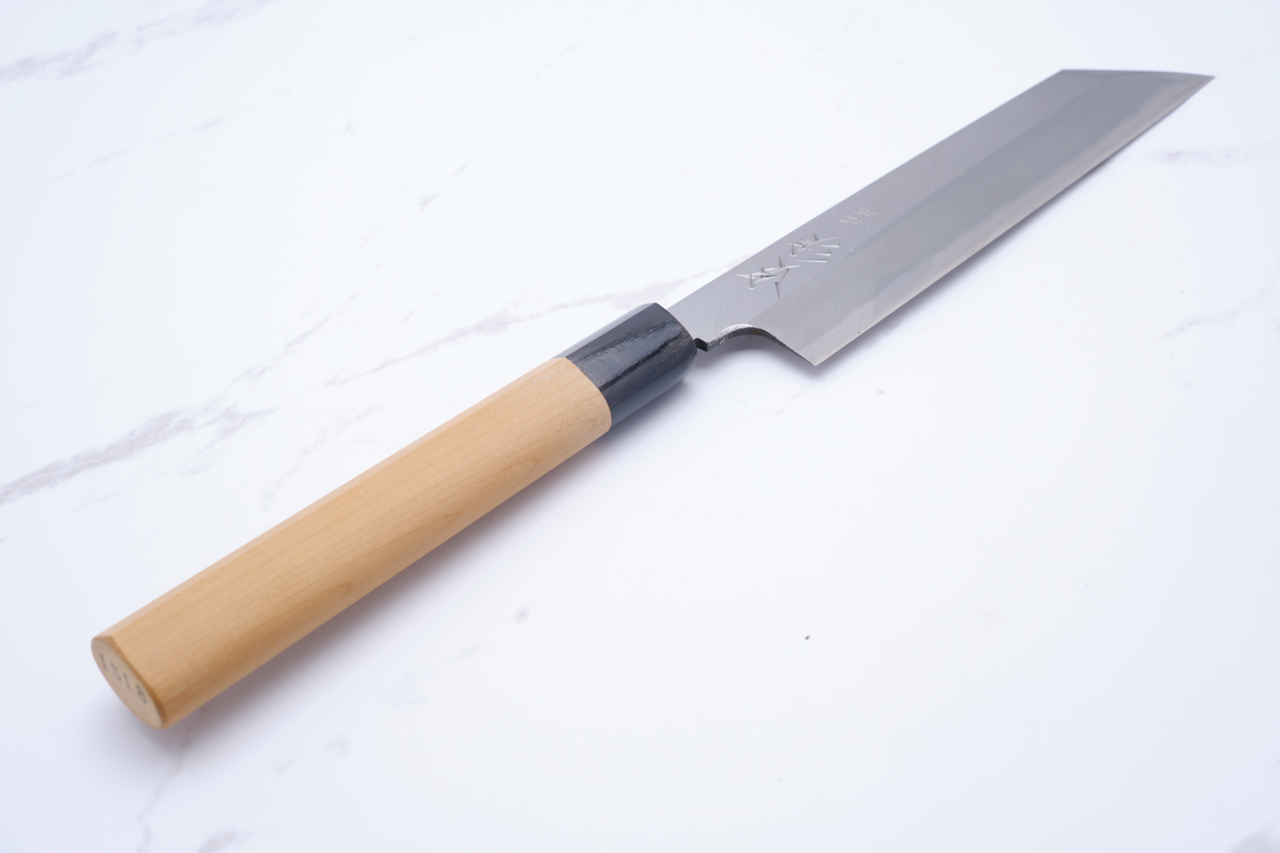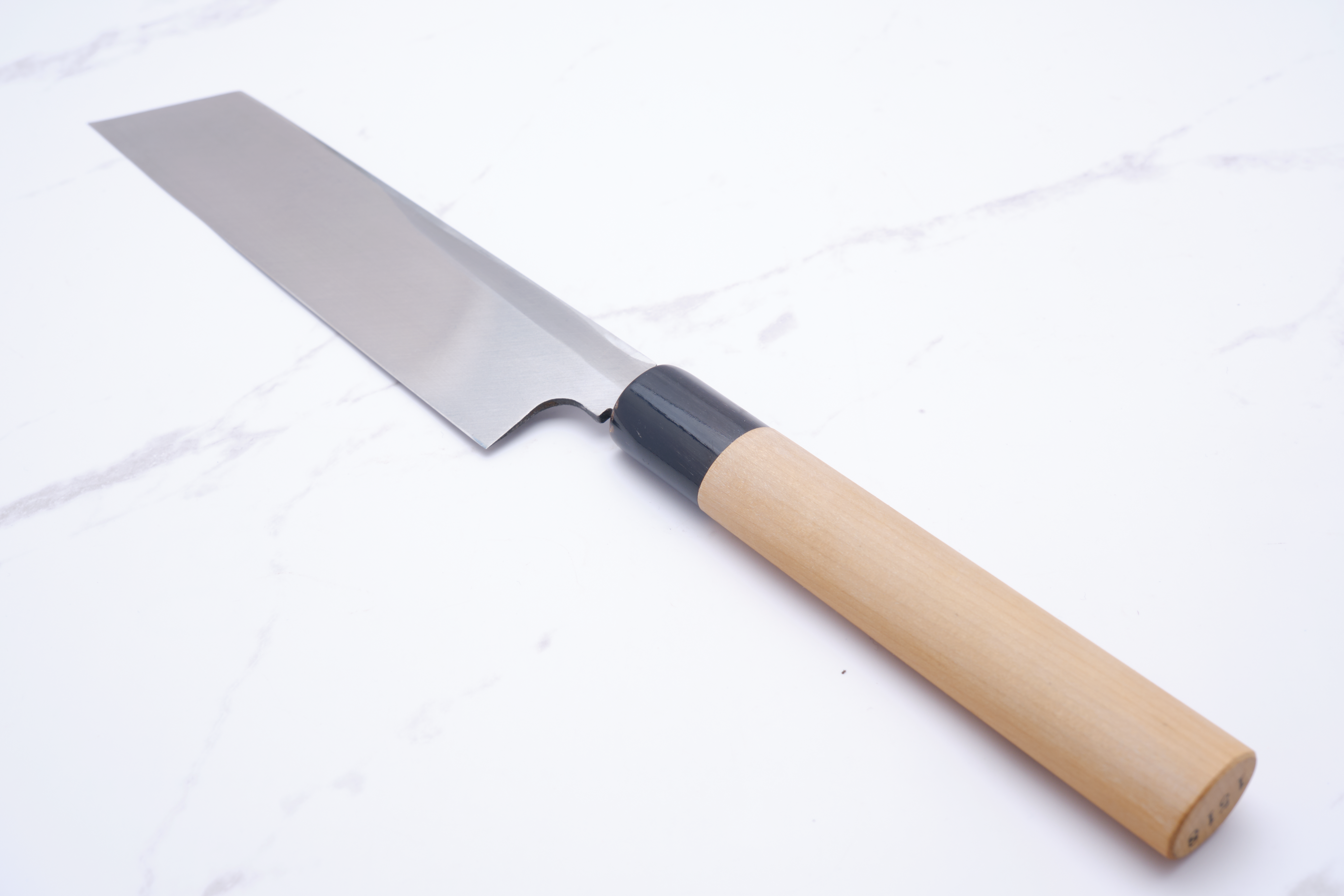 A Mukimono is a traditional Japanese vegetable knife used for the Japanese art form called 'Mukimono' which is decorative carvings of fruit and vegetables, but is also used as an Usuba which is used to cut vegetables and fruit. The distinctive egg on the right side means that the very fine egg slides right through the raw materials and can cut extremely thinly. The grinding also makes the egg quite delicate, and should not be used for harder vegetables such as butternut squash, pumpkin, etc.