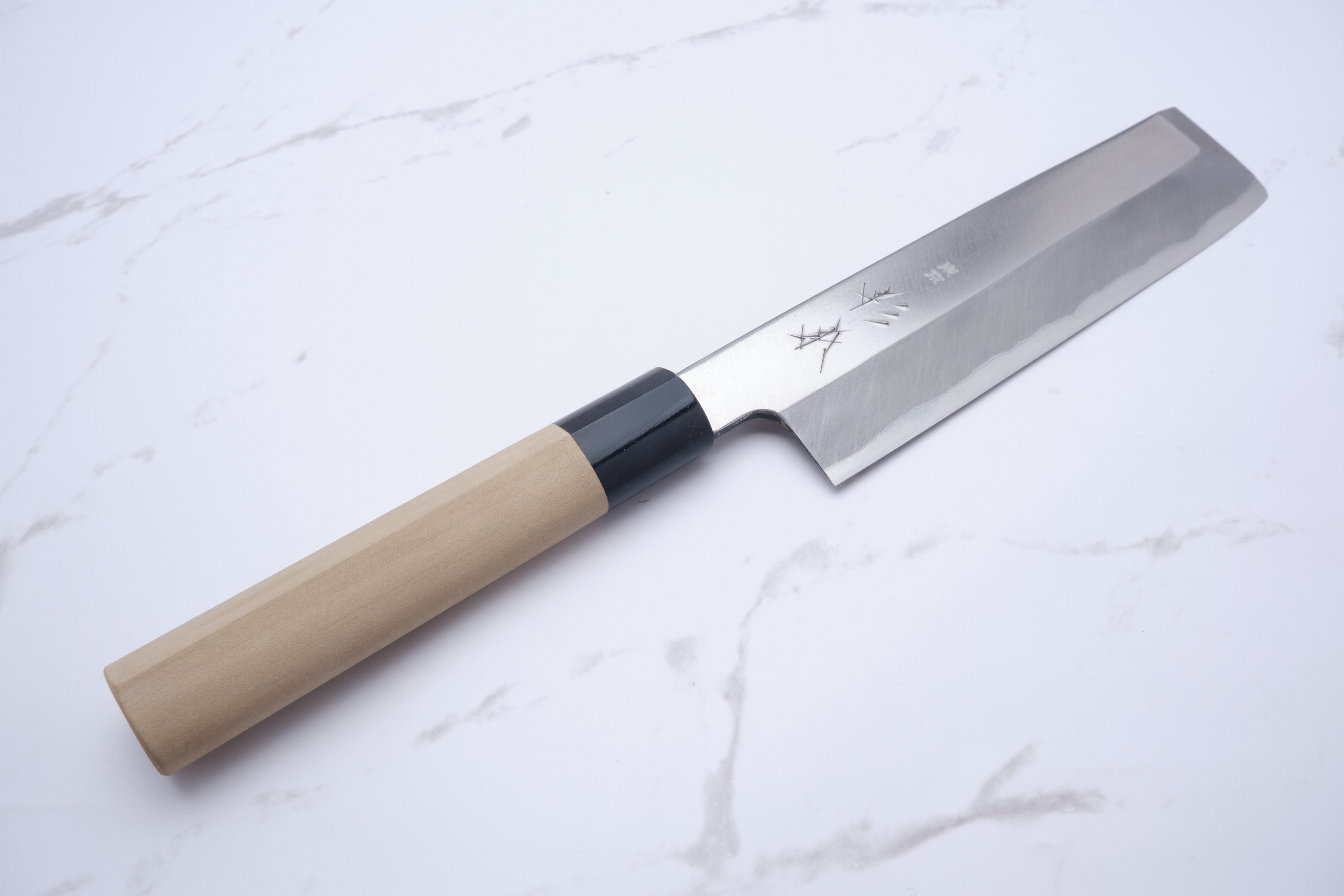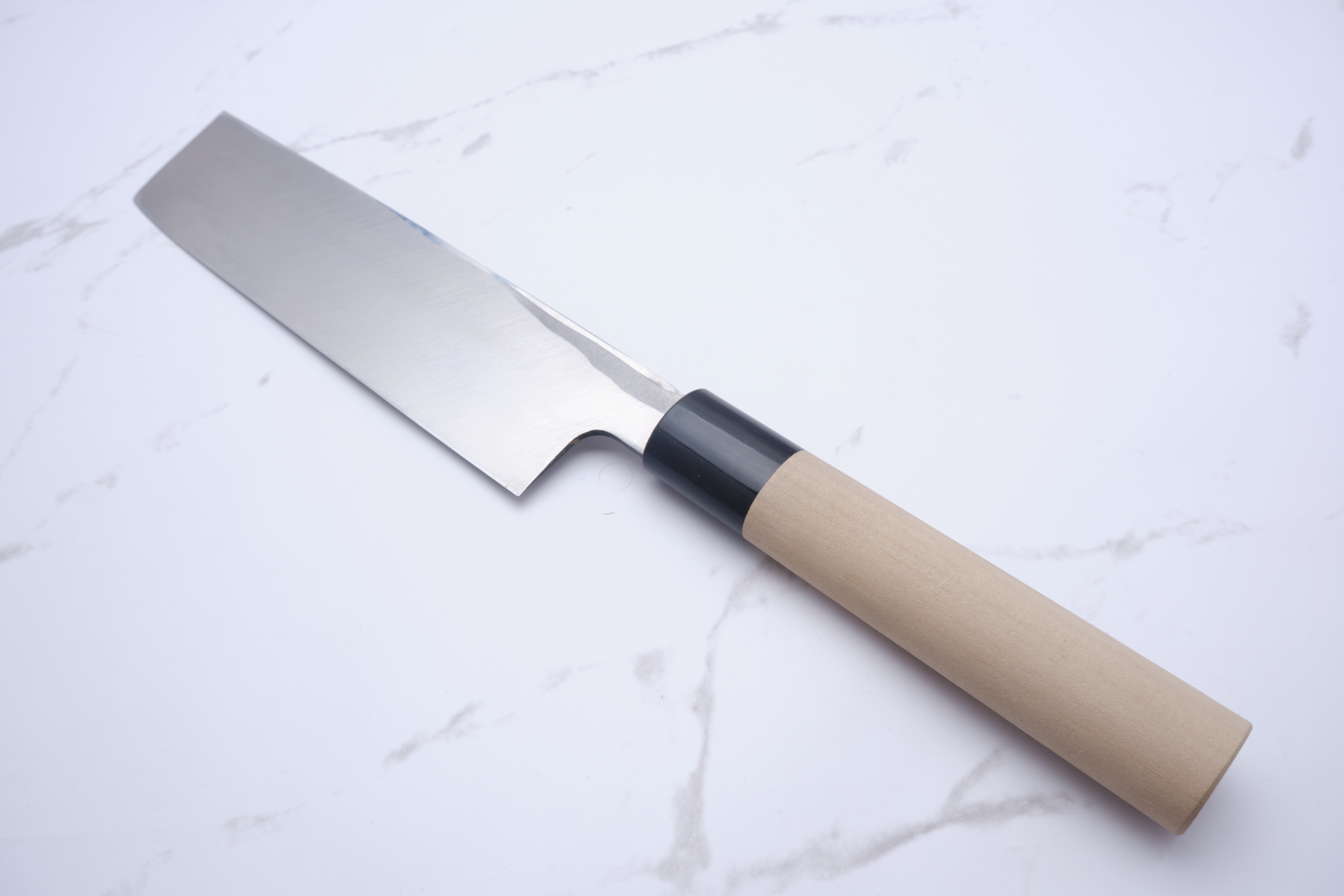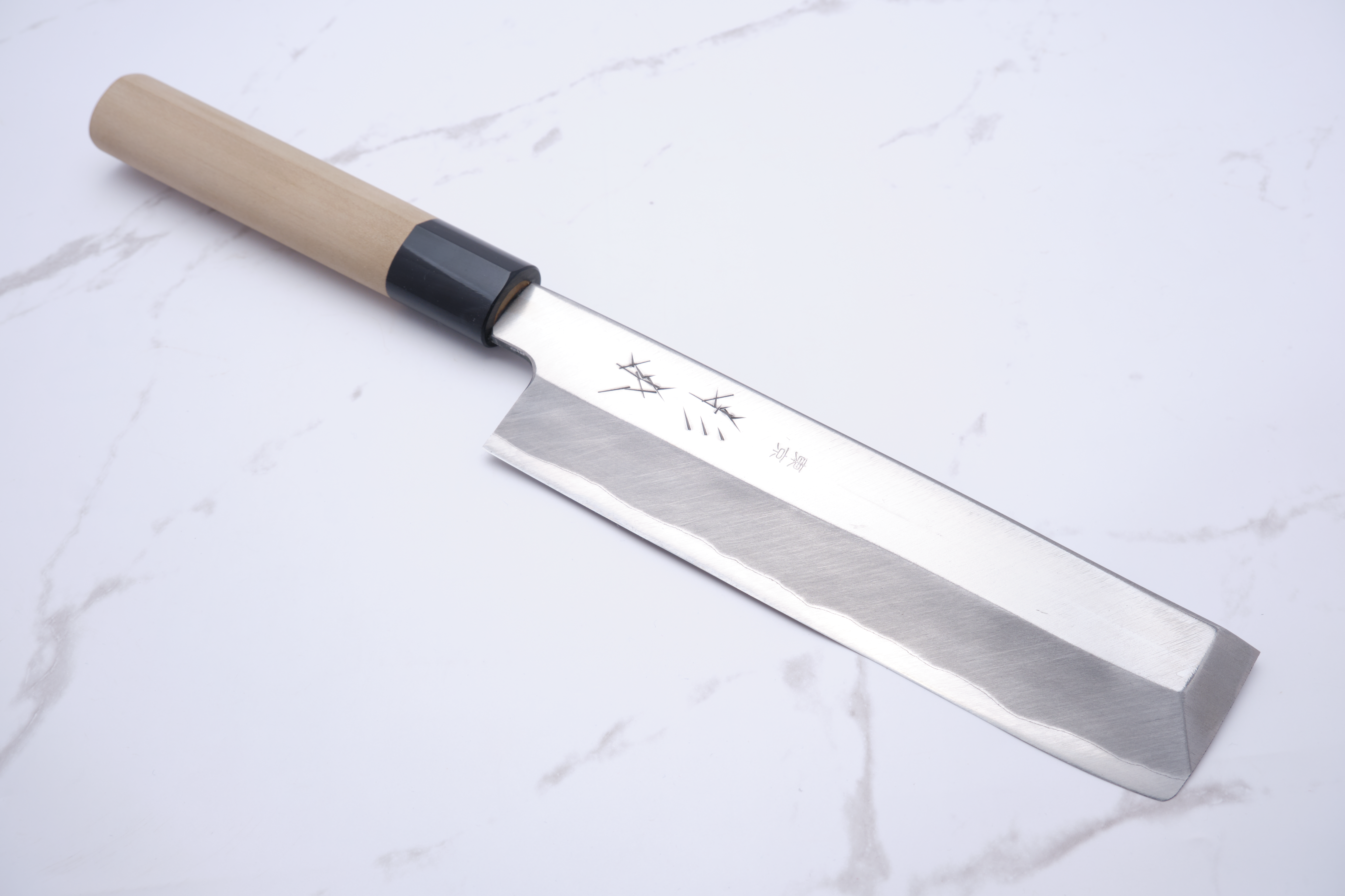 An Usuba is a traditional Japanese vegetable knife used to cut vegetables and fruit. The distinctive egg on the right side means that the very fine egg slides right through the raw materials and can cut extremely thinly. The grinding also makes the egg quite delicate, and should not be used for harder vegetables such as butternut squash, pumpkin, etc.