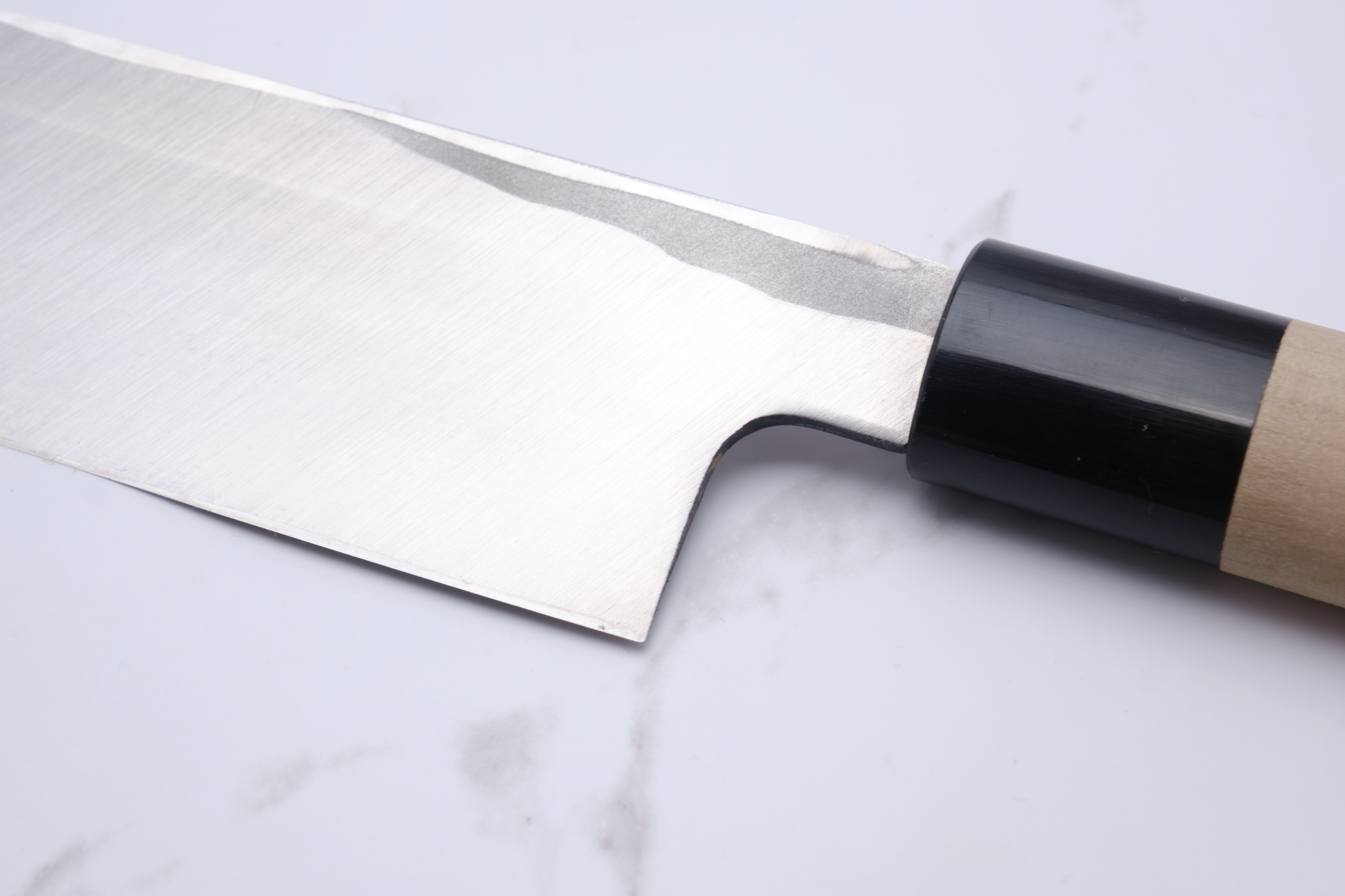 With its traditional knives, Sugimoto Hamono from Tokyo has the classic Japanese design with traditional Japanese carbon steel and a pure right-hand sharpening. In the pictures of the knife here, you can clearly see the high egg on the right side, and we must therefore emphasize for the sake of clarity that this knife is only suitable for right-handed people.