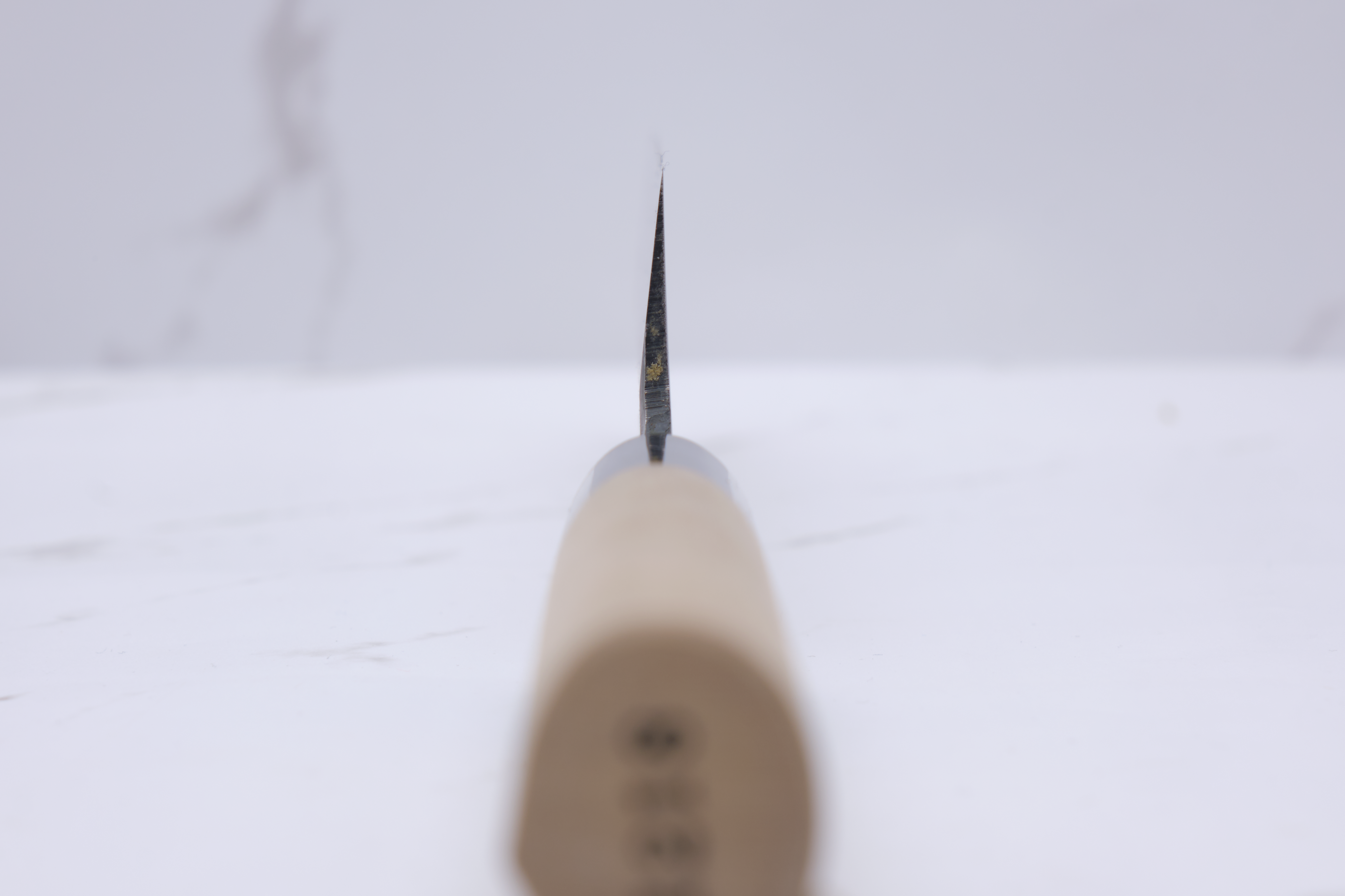 Sugimoto does not state the specific type of steel on this series, but describes the steel as being of high purity and the consequent risk of rust - therefore expect a knife that behaves like that of the shirogami. It is delicate and will patina very easily.
